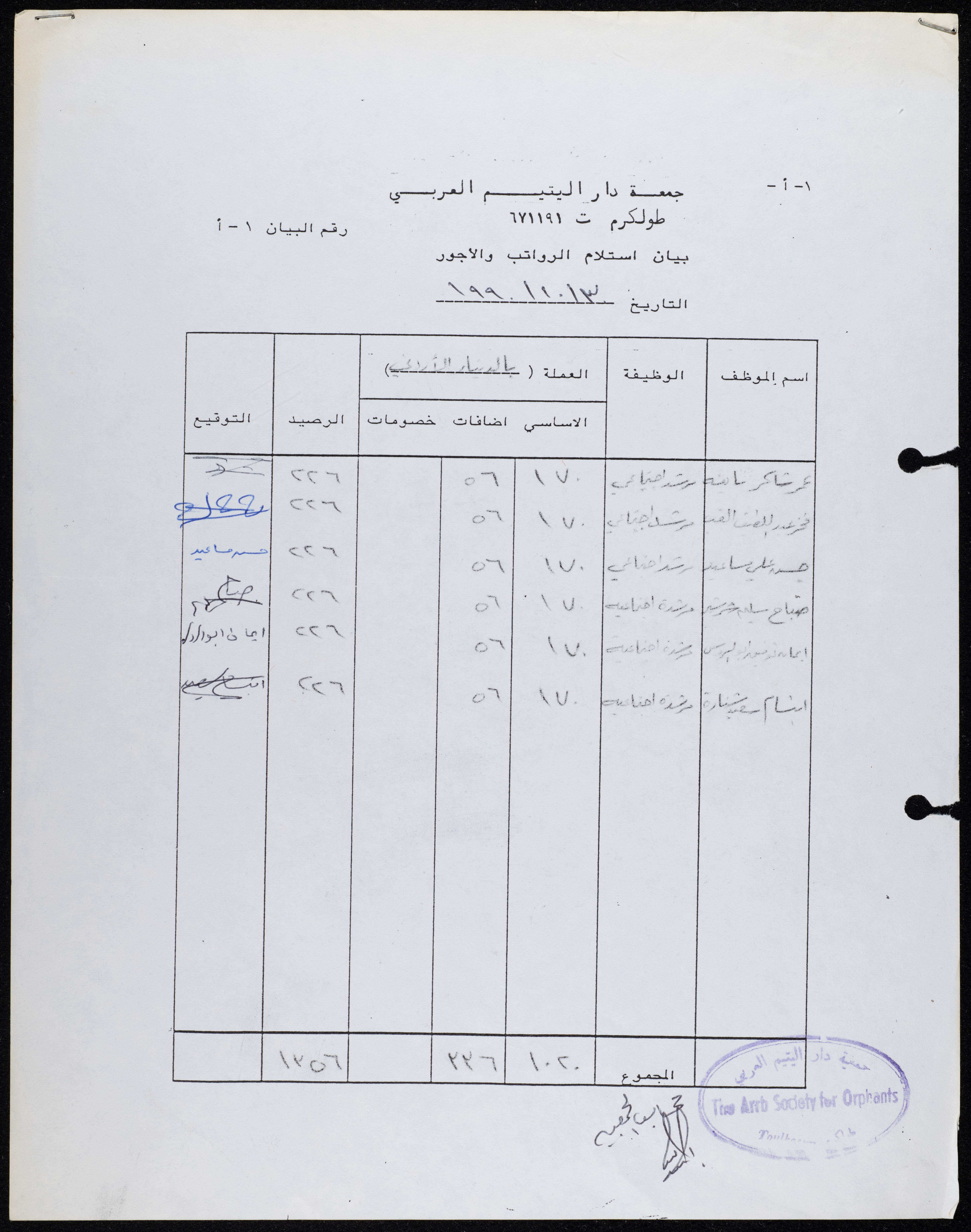 بيان استلام صادر عن محاسب جمعية دار اليتيم العربي في طولكرم بتاريخ 30 تشرين الأول 1990، يظهر فيه رواتب وأجور الأخصائيين الإجتماعيين والنفسيين للجمعية.
