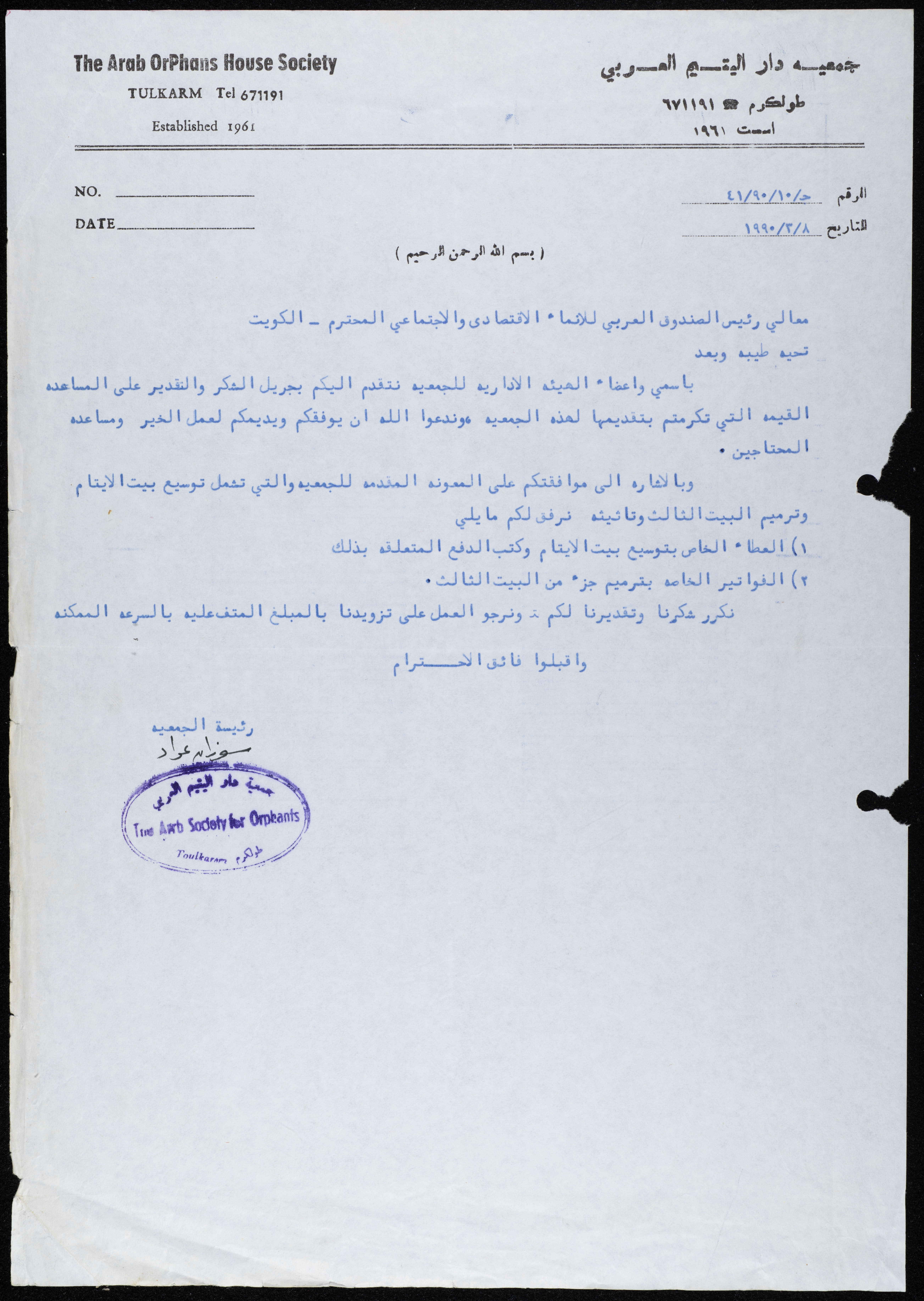 A Letter by the Arab Orphans House Society to the Director of the Arab Fund, Tulkarm, 1990