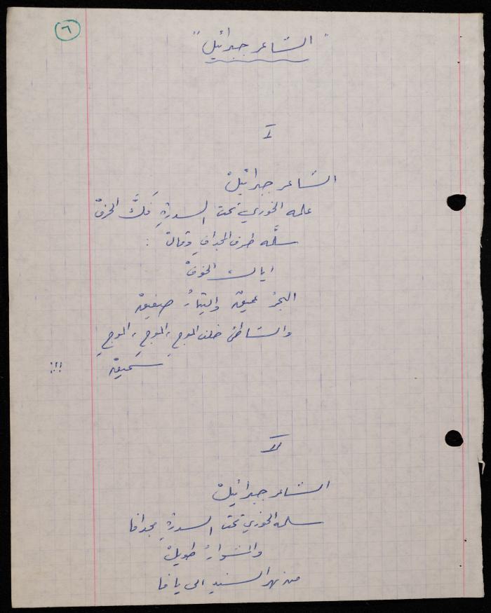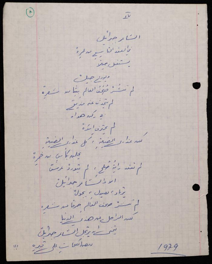 Handwritten in 1979, this 3-page document shows a poem by Shakib Jahshan titled "Ash-Sha'er Jibra'il (The Poet Gabriel)".