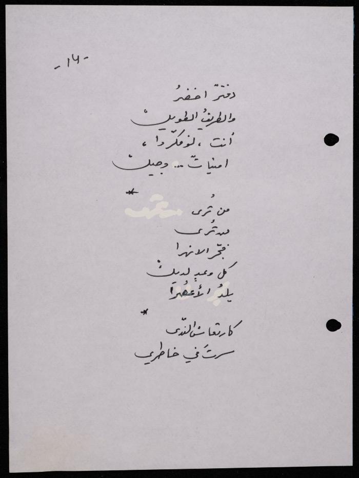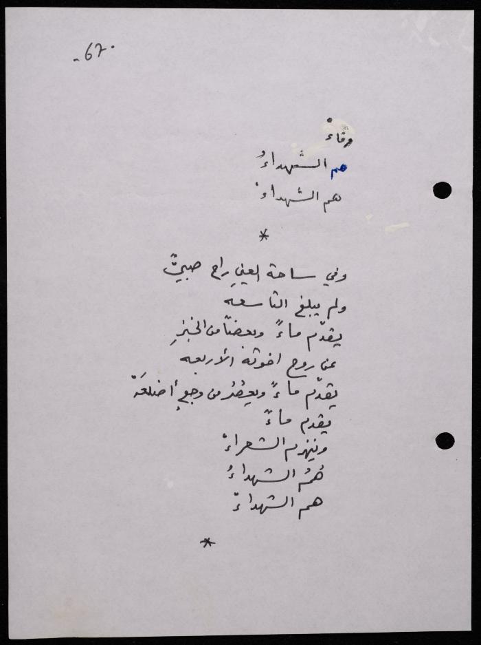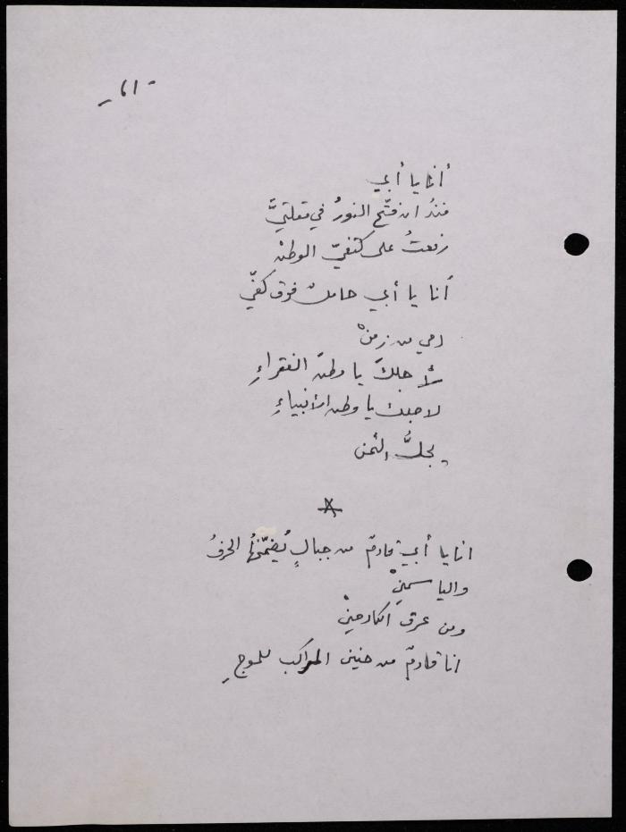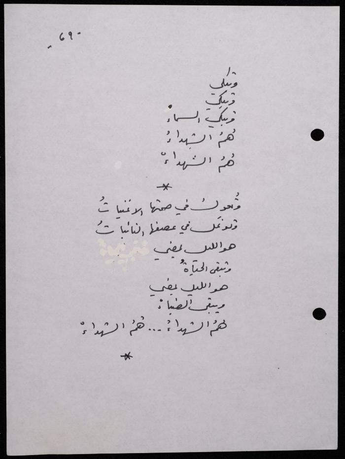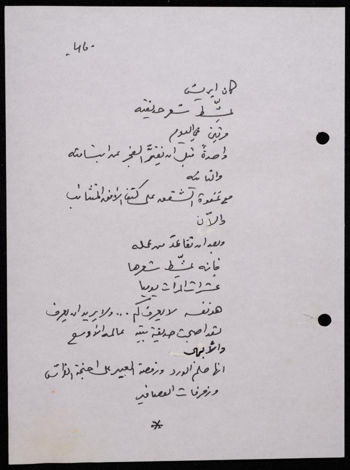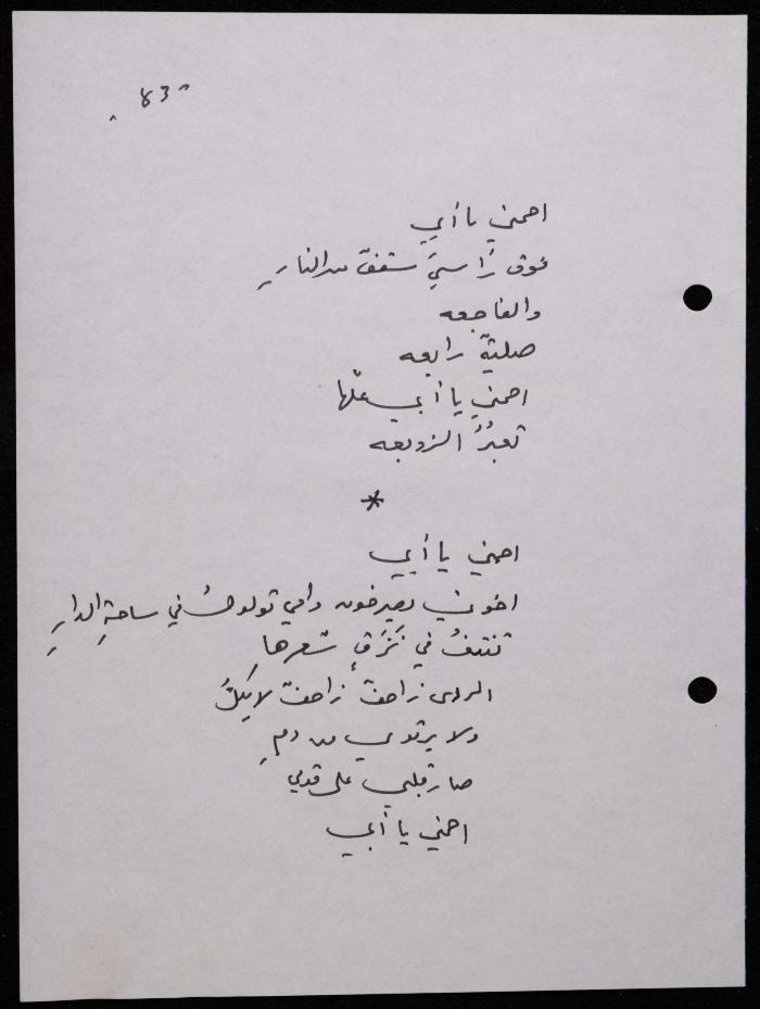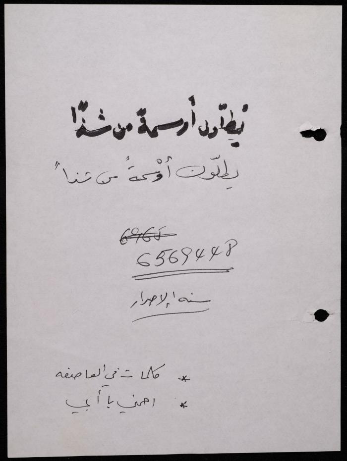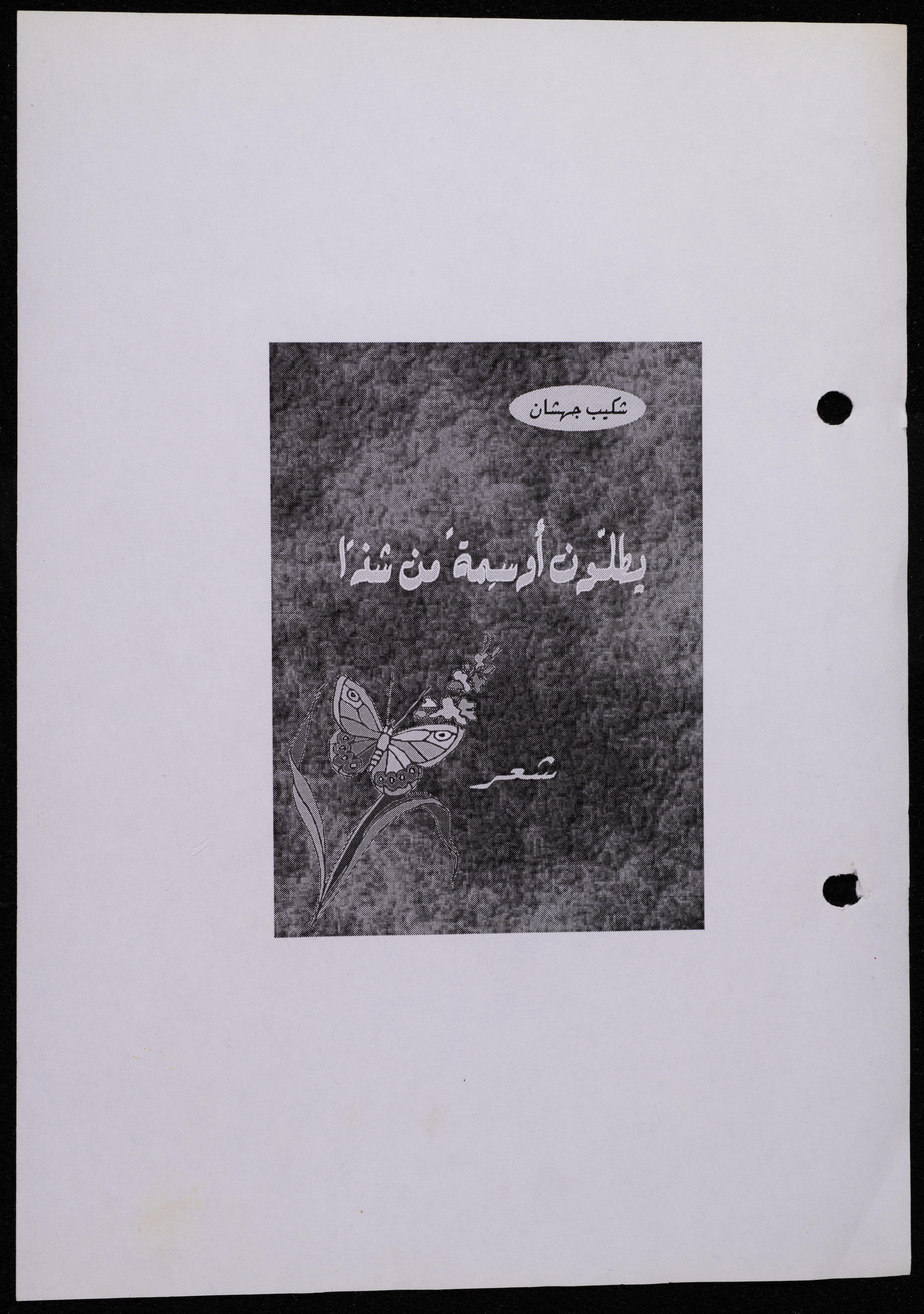 Handwritten, this 188-page archival item documents a poetry collection by Shakib Jahshan titled "Yotteloon Awsematan Min Shatha (They Come as Fragrant Medals)". The first section of the collection is titled "Kalimaton Fil-Asifa (Words In the Storm)", while the second is titled "Ihmeni Ya Abi (Protect Me, Father)".