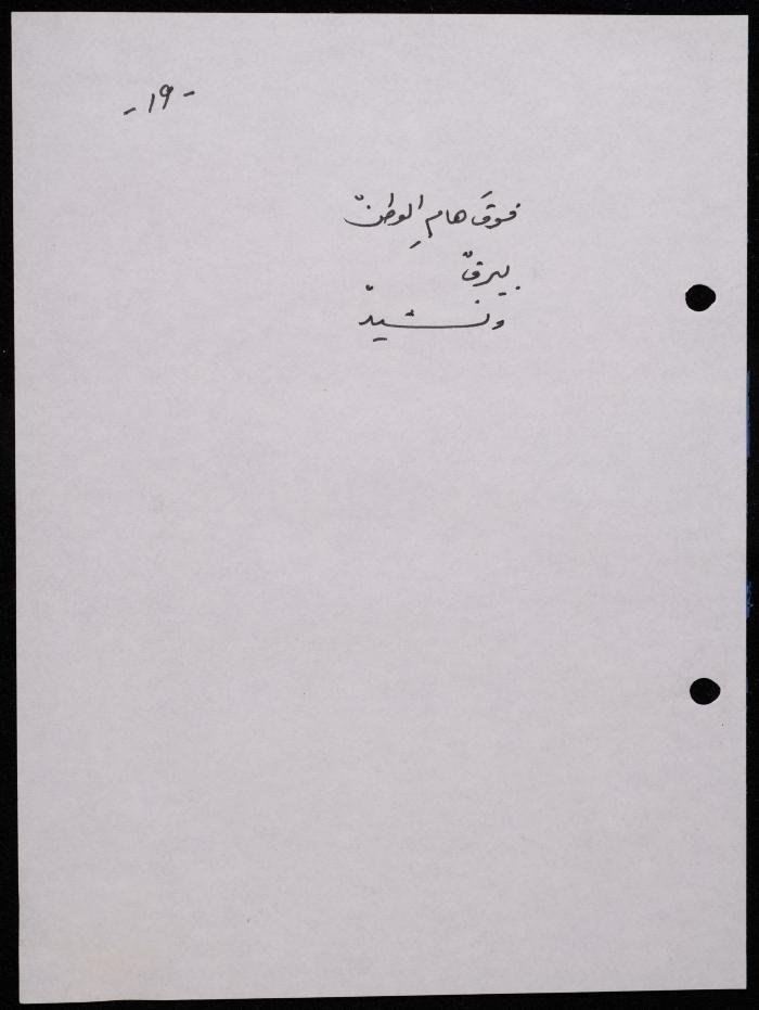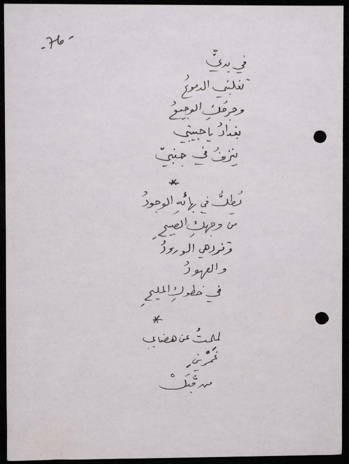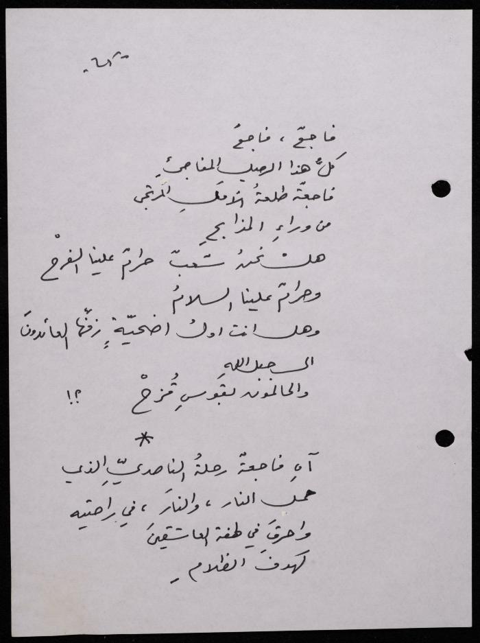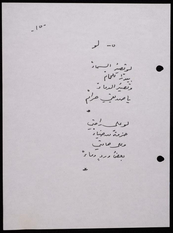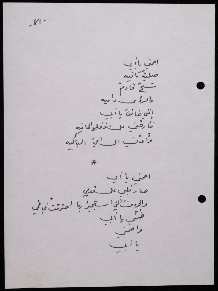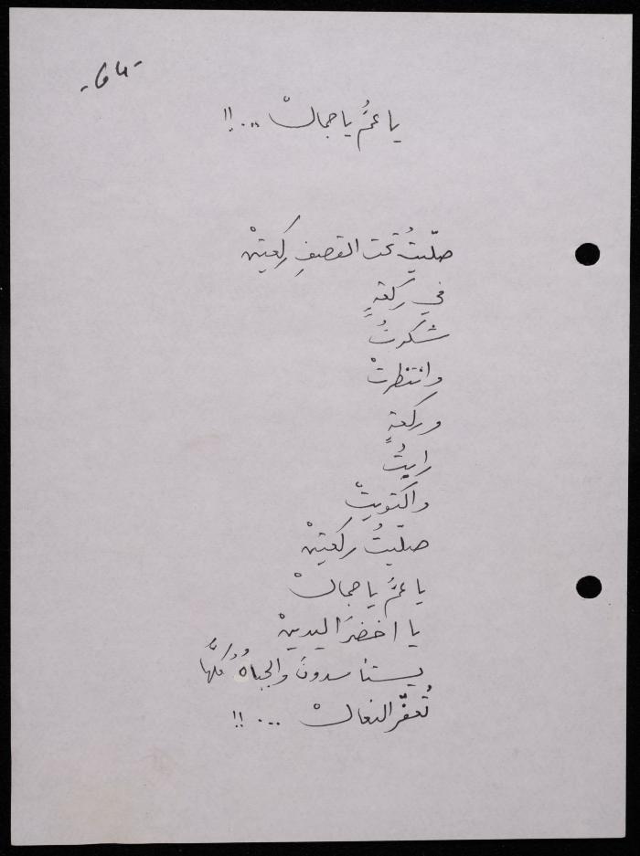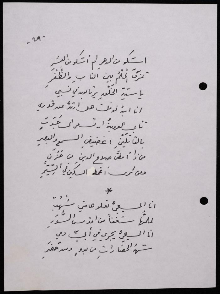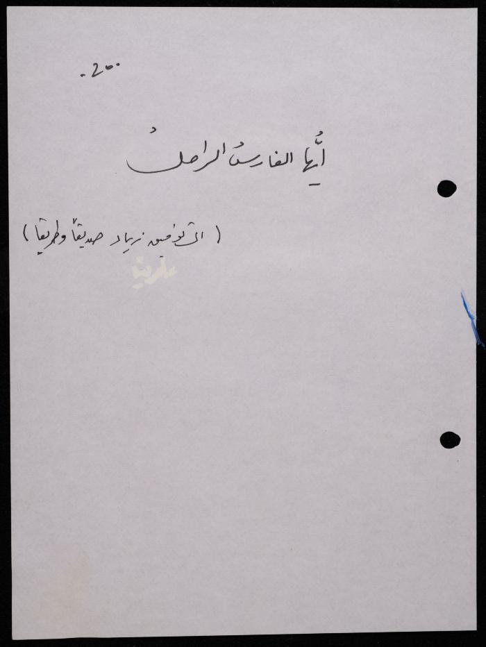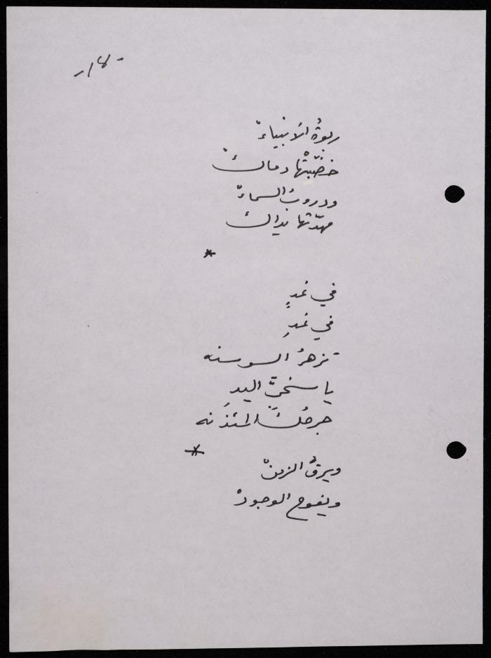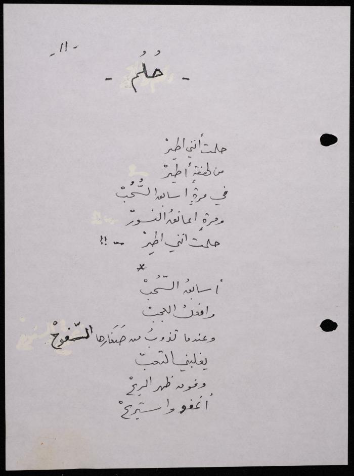 Handwritten, this 188-page archival item documents a poetry collection by Shakib Jahshan titled "Yotteloon Awsematan Min Shatha (They Come as Fragrant Medals)". The first section of the collection is titled "Kalimaton Fil-Asifa (Words In the Storm)", while the second is titled "Ihmeni Ya Abi (Protect Me, Father)".