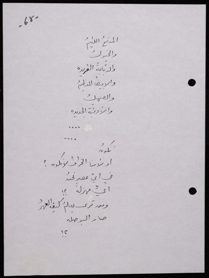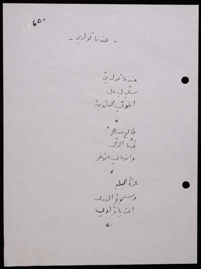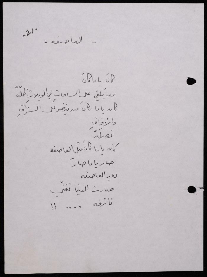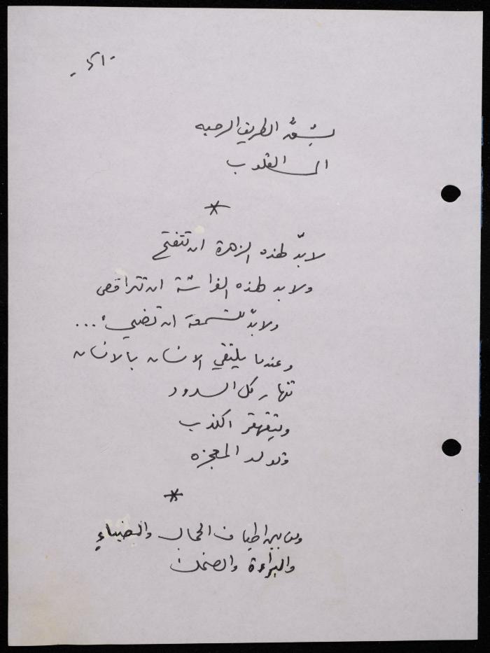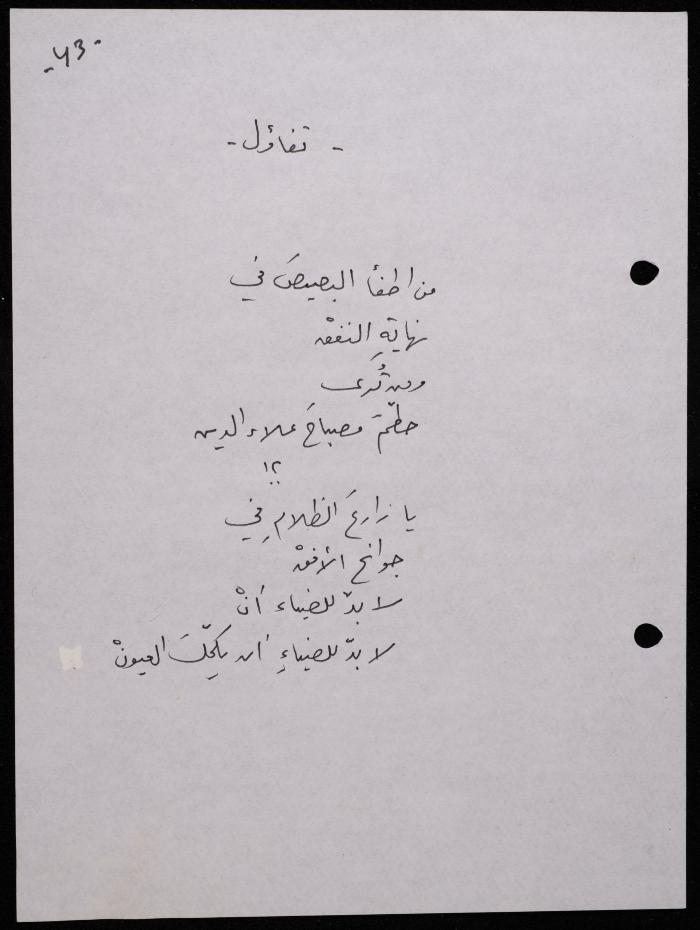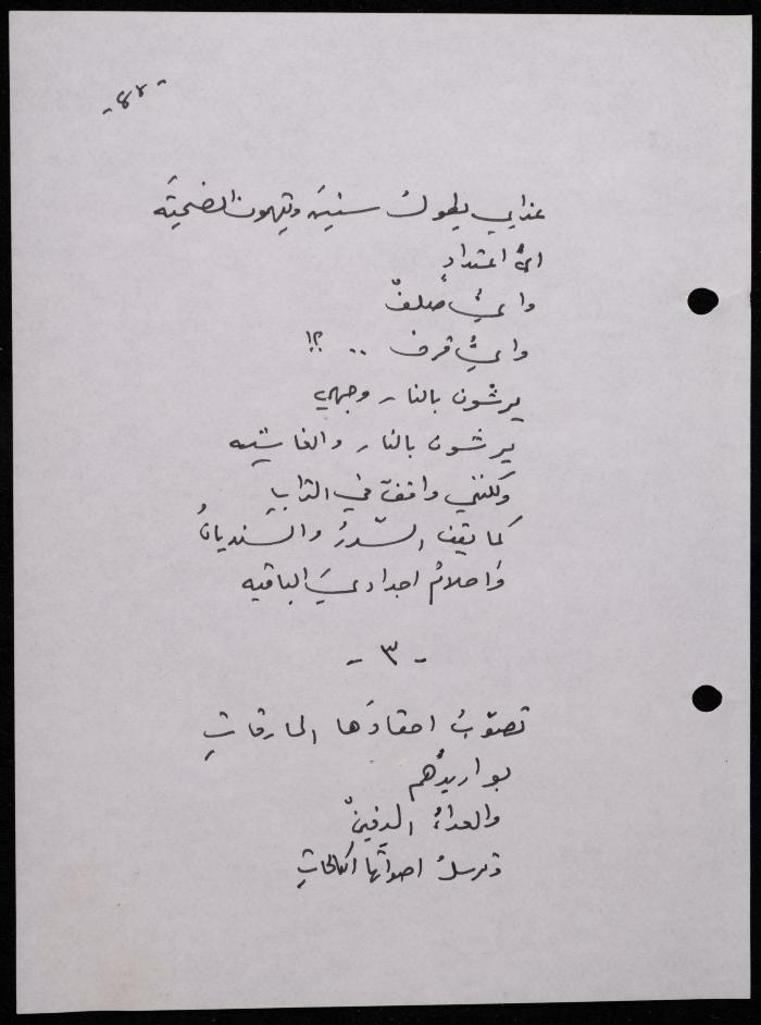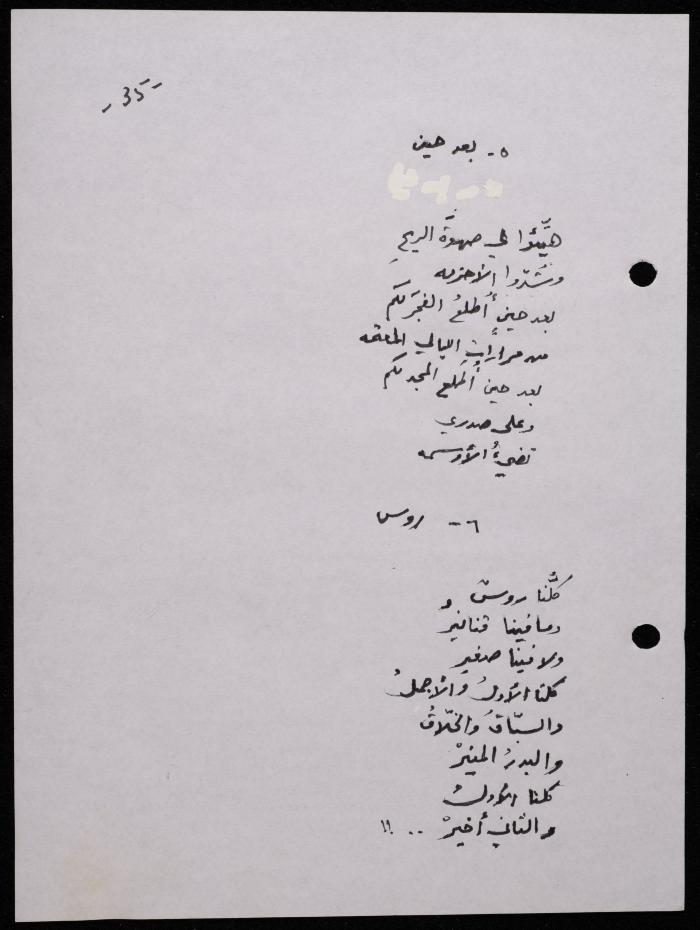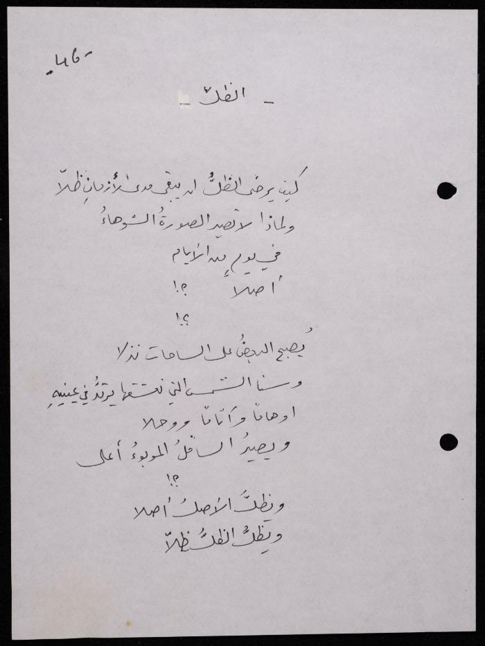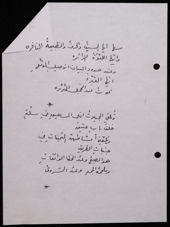 Handwritten, this 188-page archival item documents a poetry collection by Shakib Jahshan titled "Yotteloon Awsematan Min Shatha (They Come as Fragrant Medals)". The first section of the collection is titled "Kalimaton Fil-Asifa (Words In the Storm)", while the second is titled "Ihmeni Ya Abi (Protect Me, Father)".