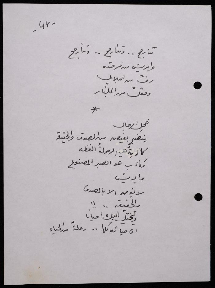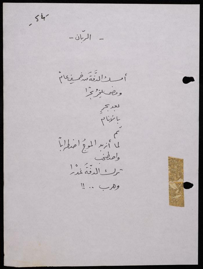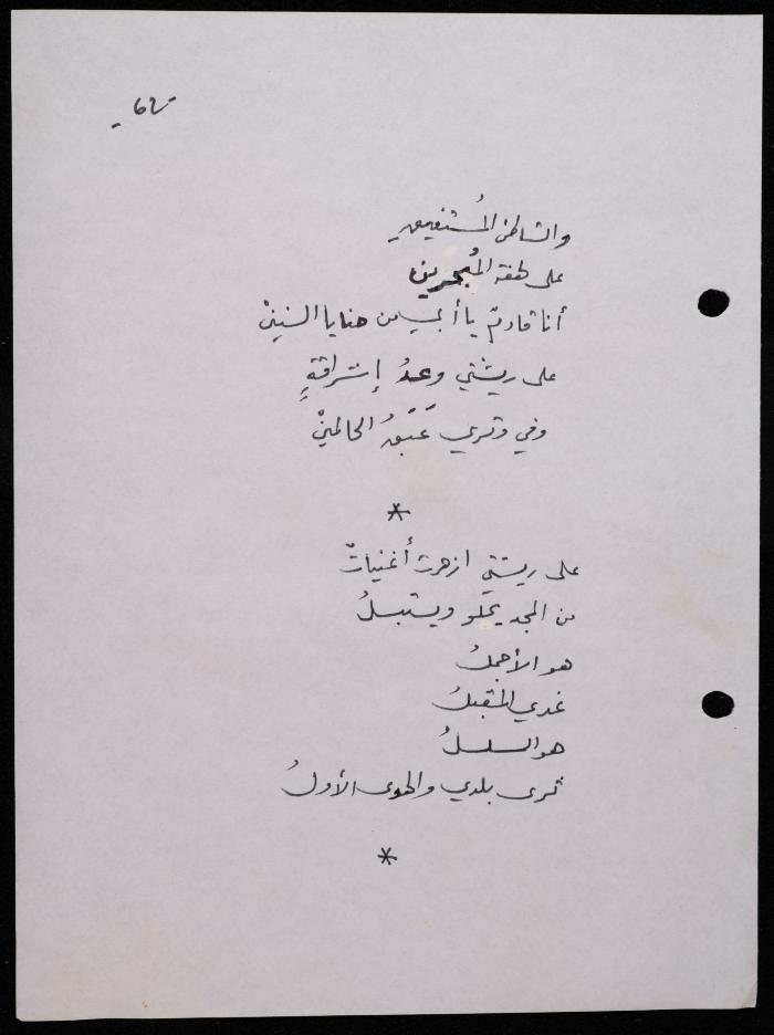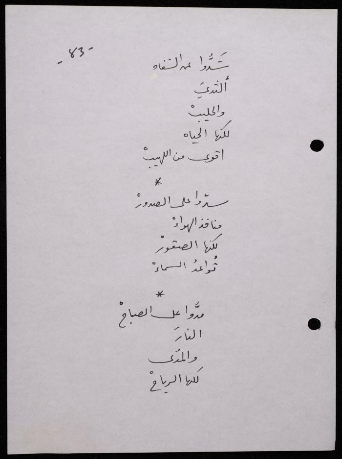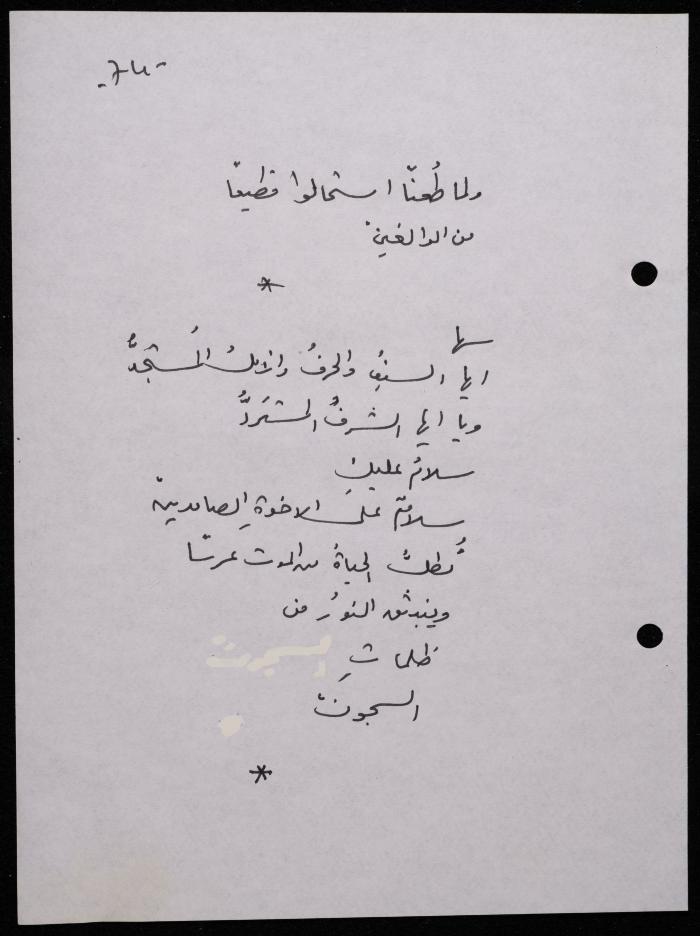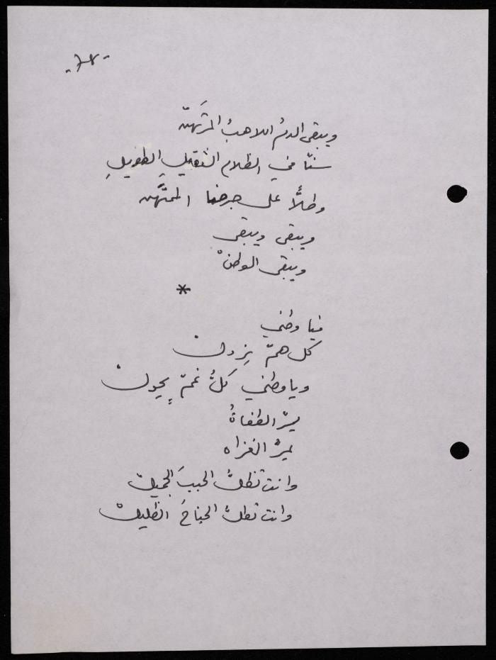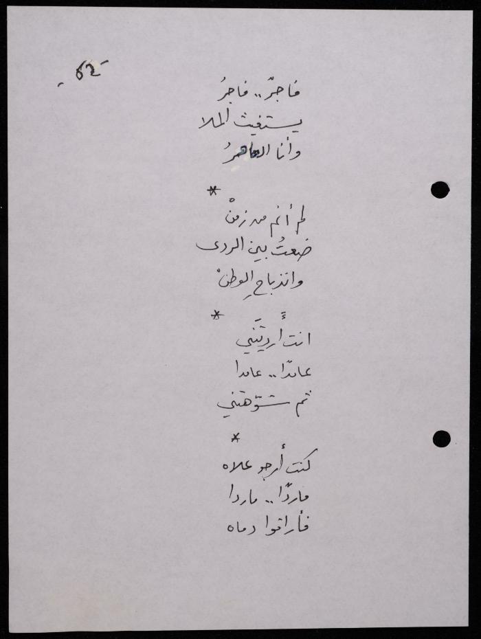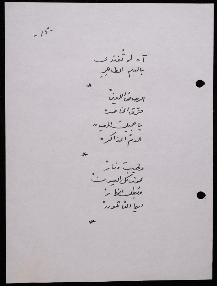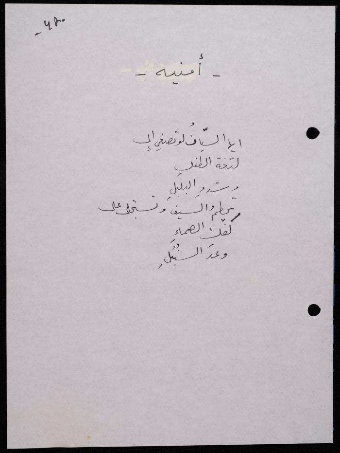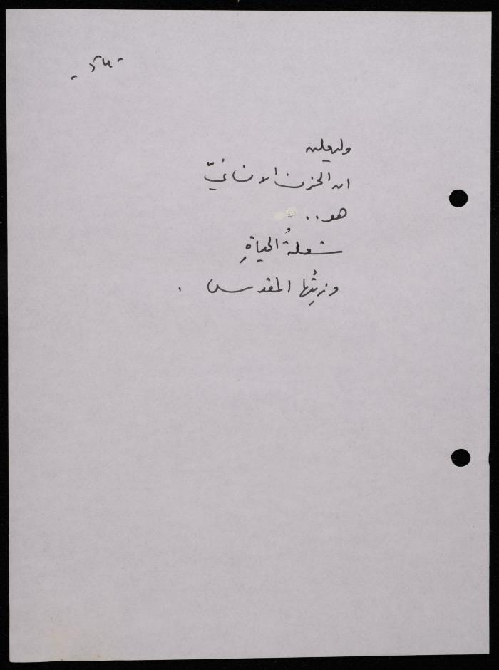 Handwritten, this 188-page archival item documents a poetry collection by Shakib Jahshan titled "Yotteloon Awsematan Min Shatha (They Come as Fragrant Medals)". The first section of the collection is titled "Kalimaton Fil-Asifa (Words In the Storm)", while the second is titled "Ihmeni Ya Abi (Protect Me, Father)".