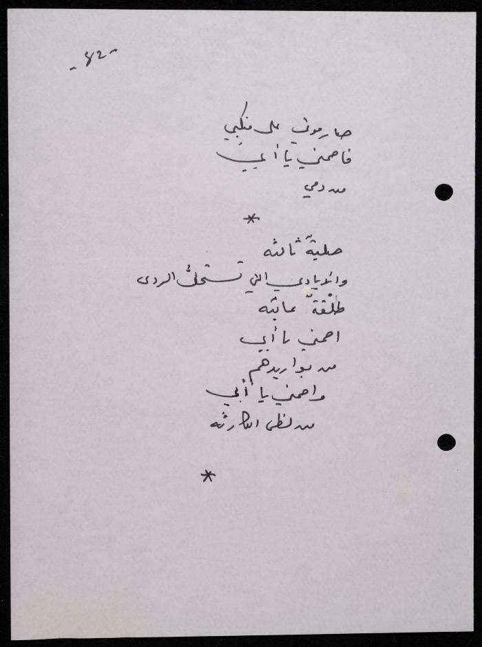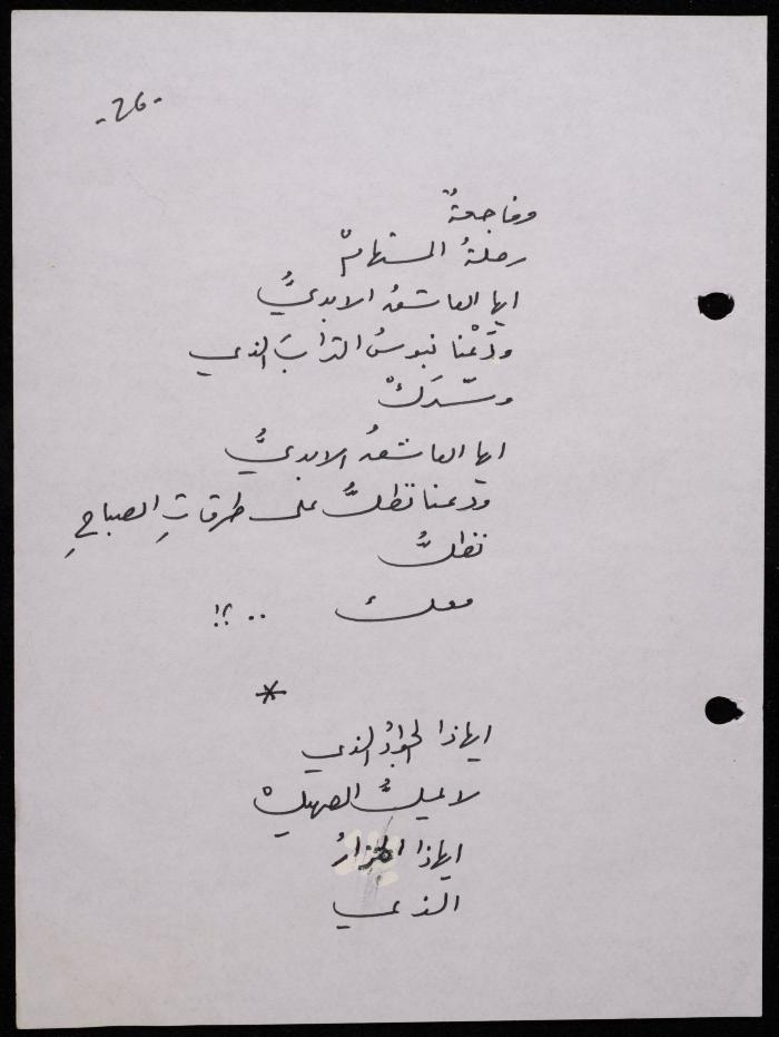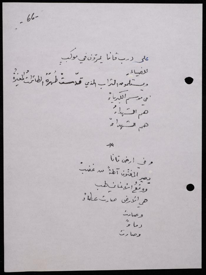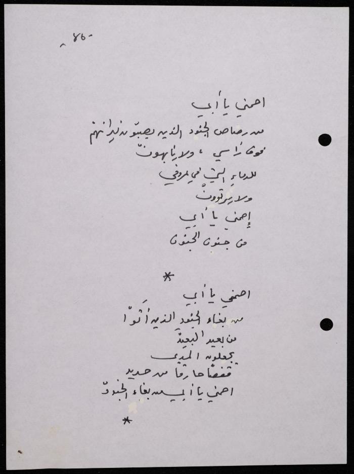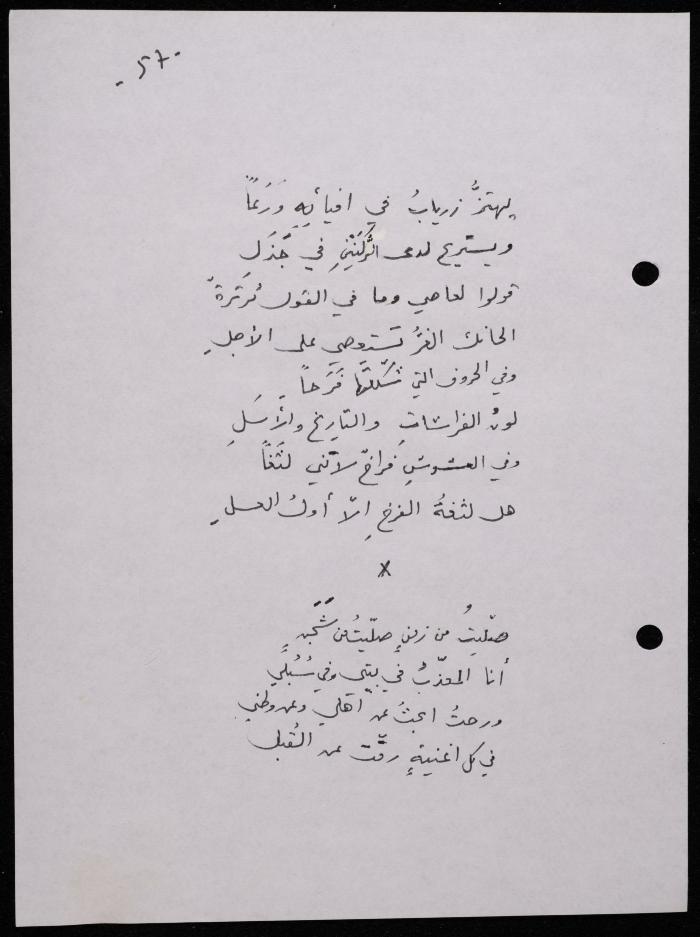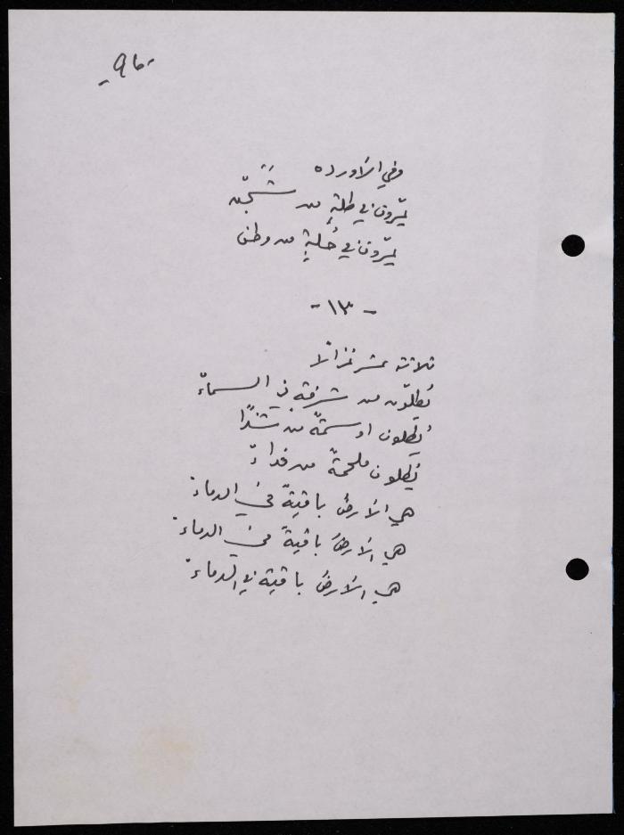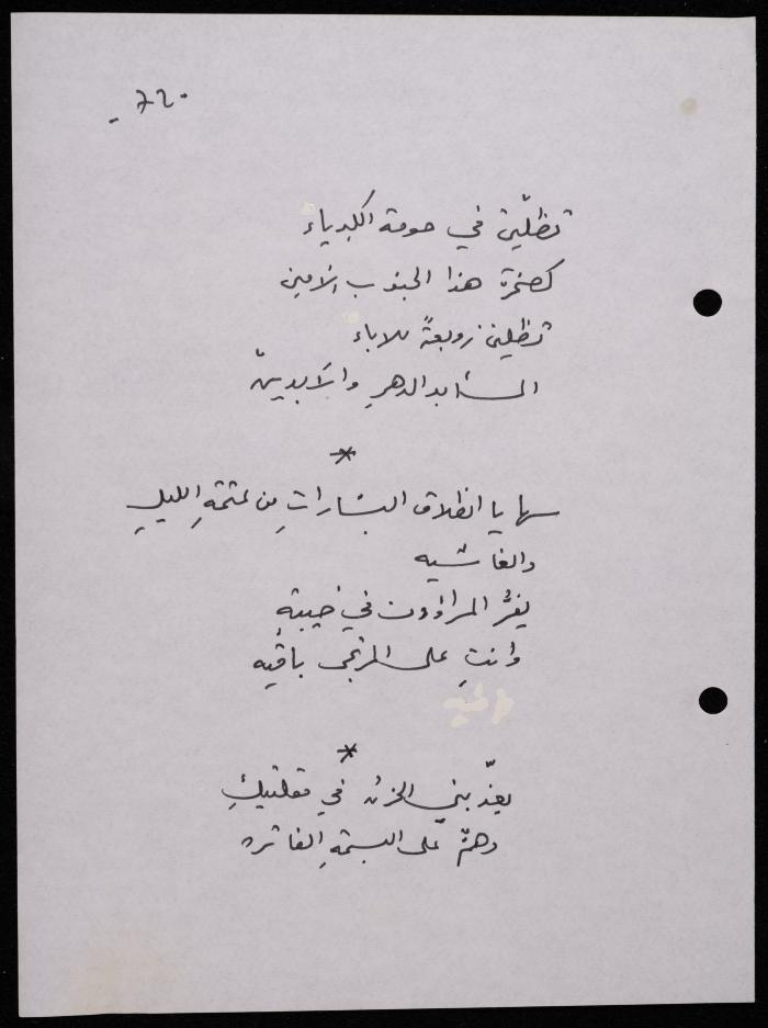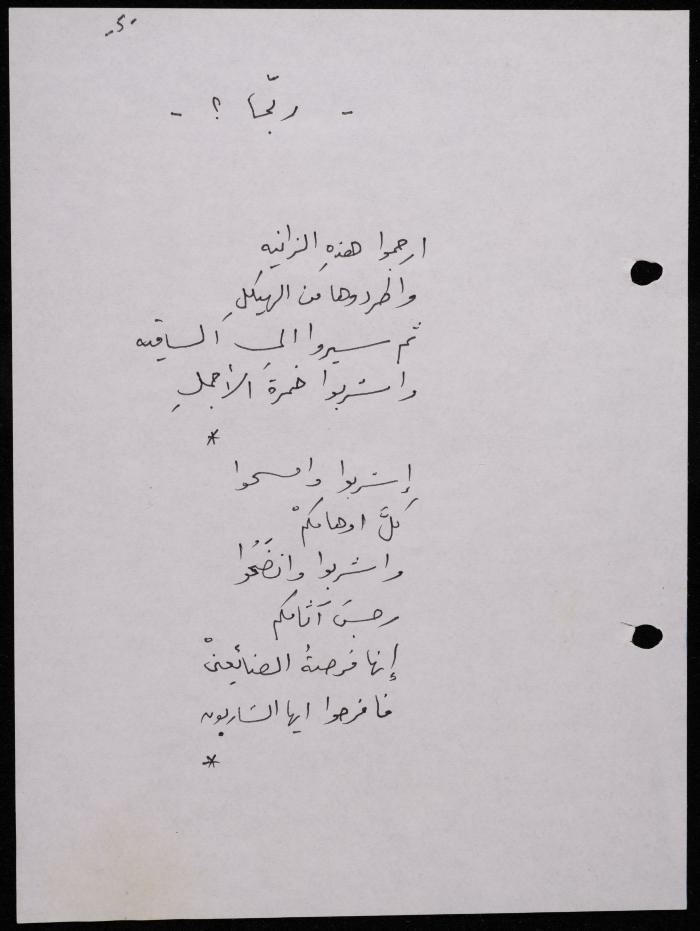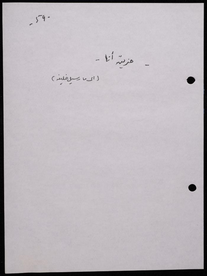 Handwritten, this 188-page archival item documents a poetry collection by Shakib Jahshan titled "Yotteloon Awsematan Min Shatha (They Come as Fragrant Medals)". The first section of the collection is titled "Kalimaton Fil-Asifa (Words In the Storm)", while the second is titled "Ihmeni Ya Abi (Protect Me, Father)".