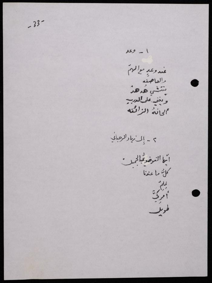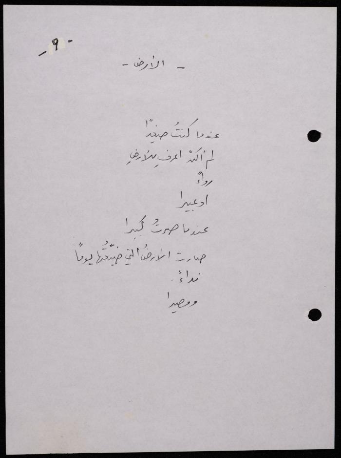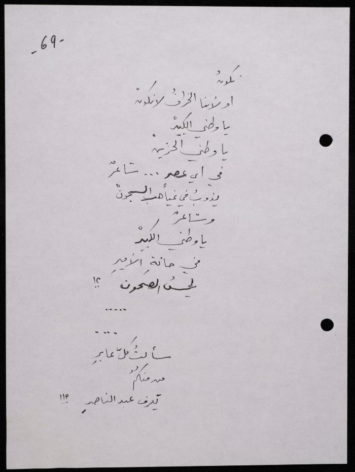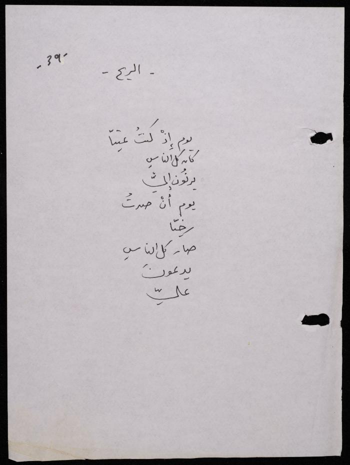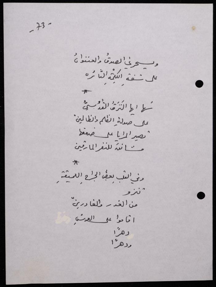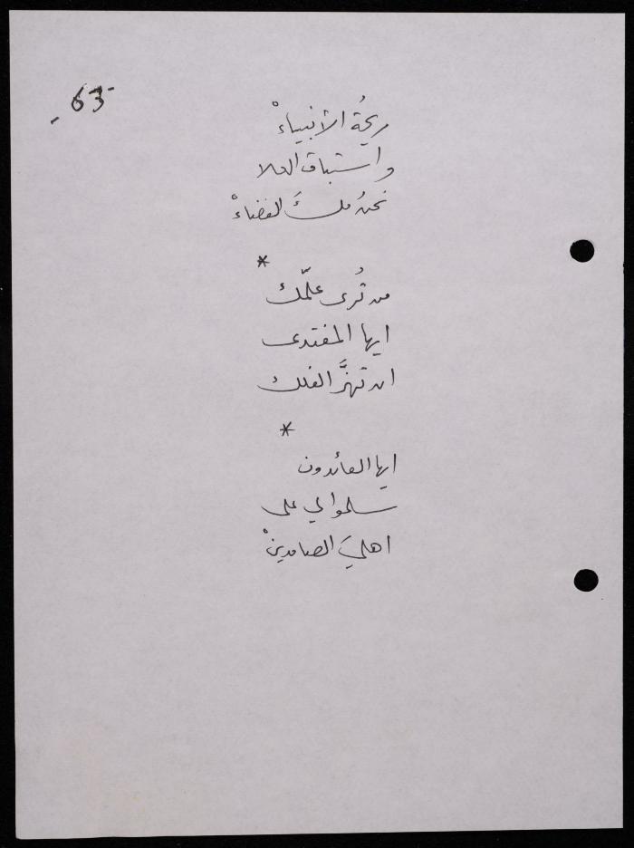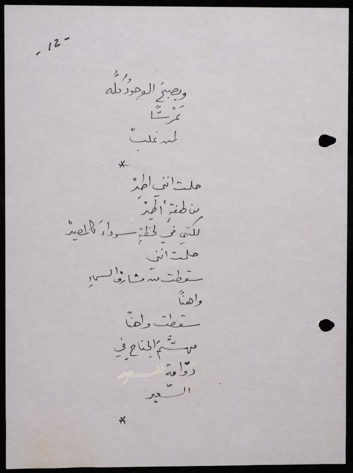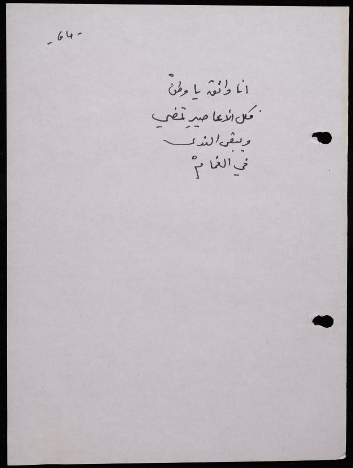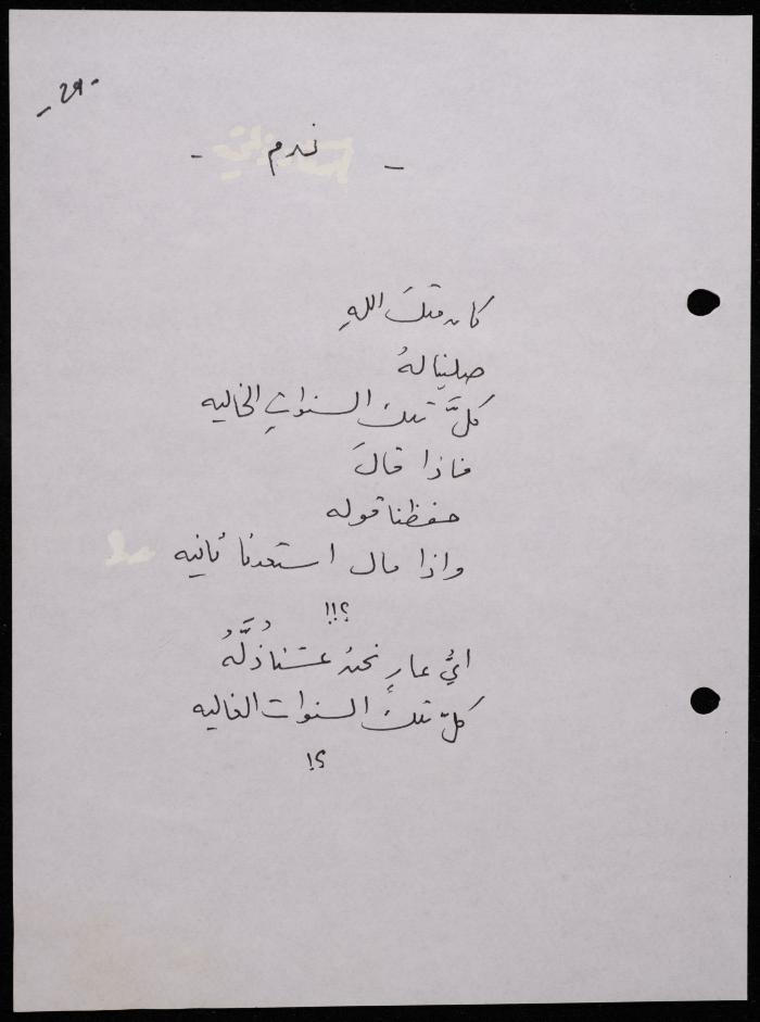 Handwritten, this 188-page archival item documents a poetry collection by Shakib Jahshan titled "Yotteloon Awsematan Min Shatha (They Come as Fragrant Medals)". The first section of the collection is titled "Kalimaton Fil-Asifa (Words In the Storm)", while the second is titled "Ihmeni Ya Abi (Protect Me, Father)".