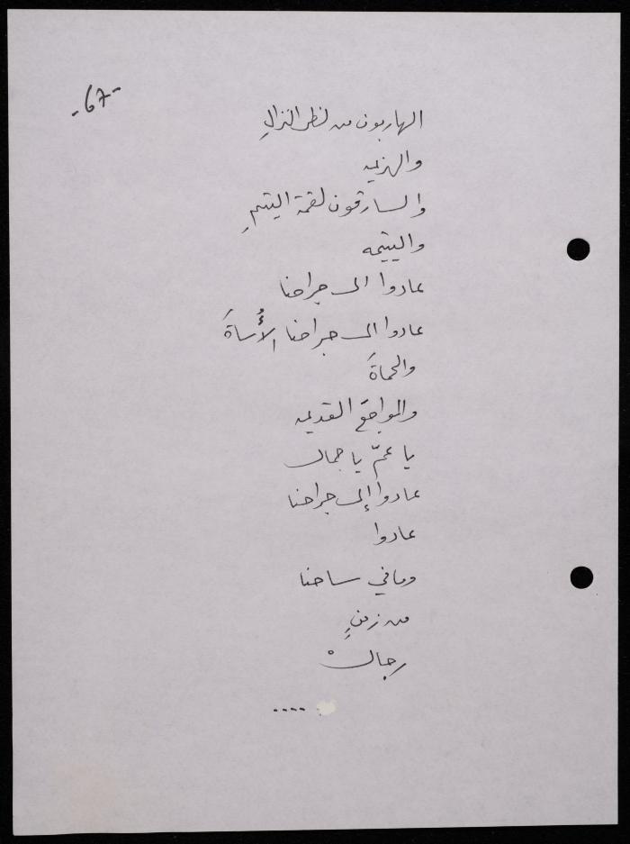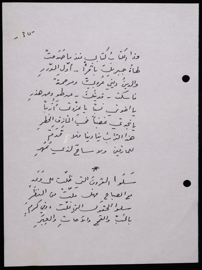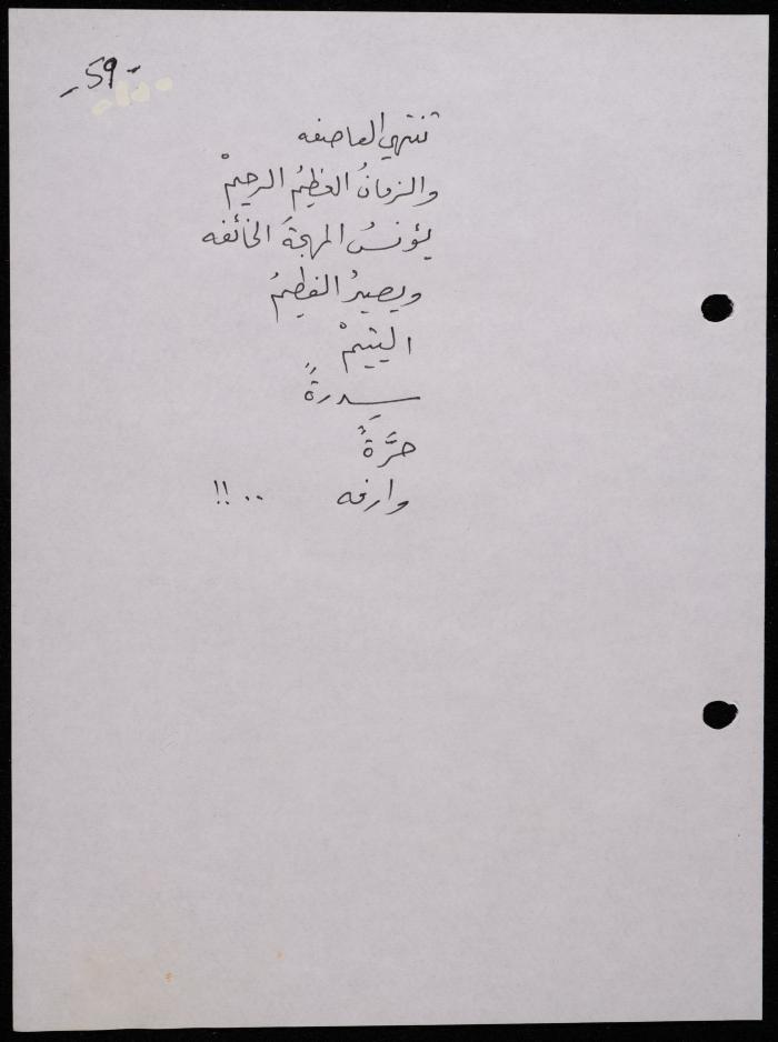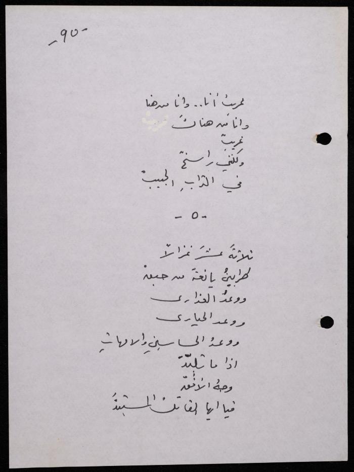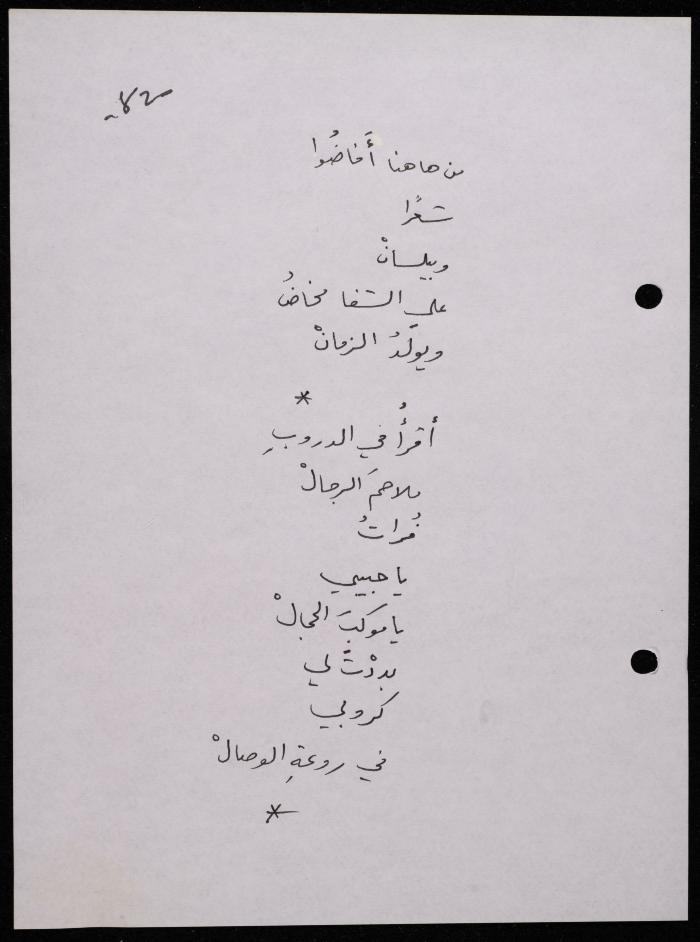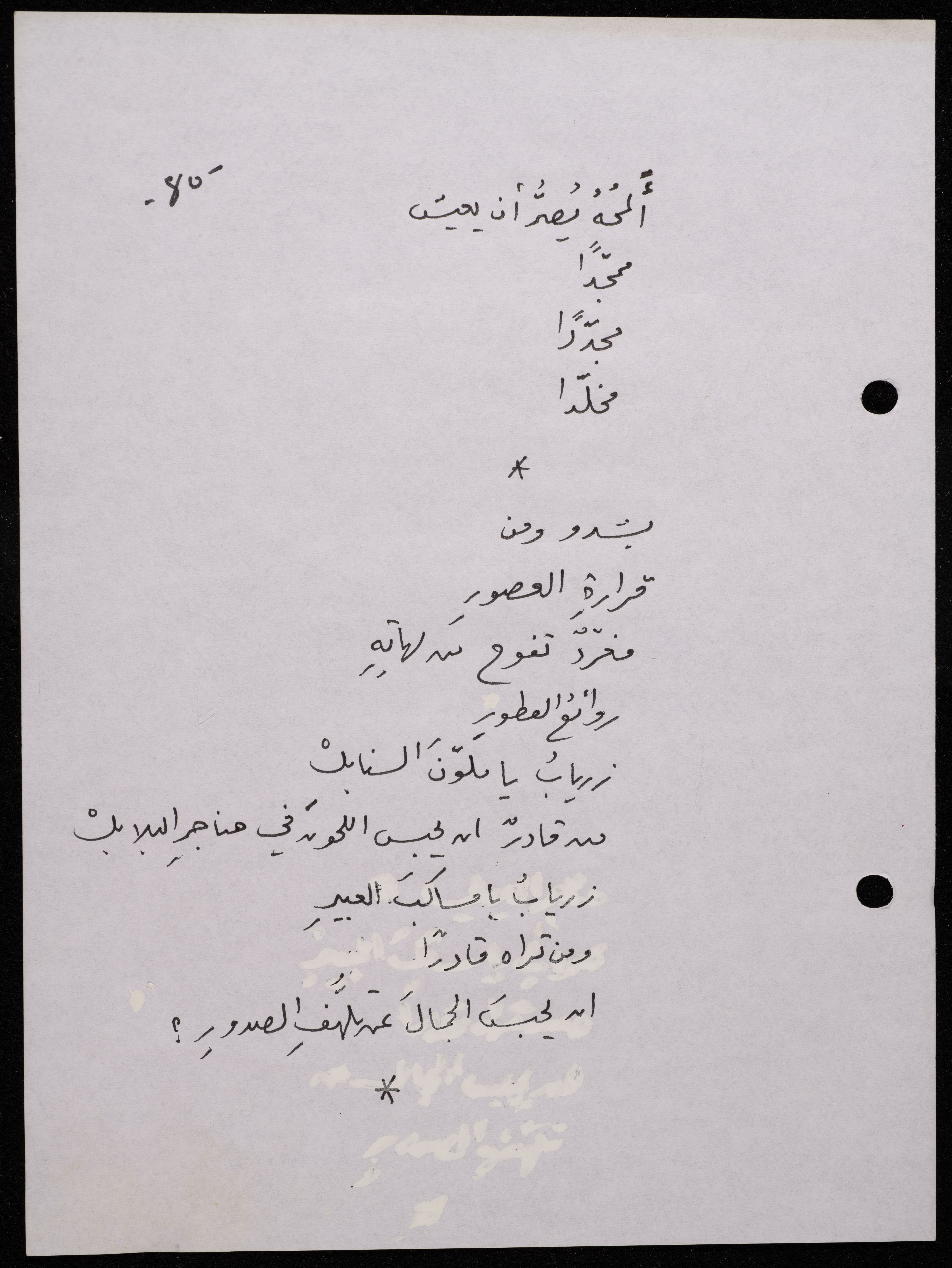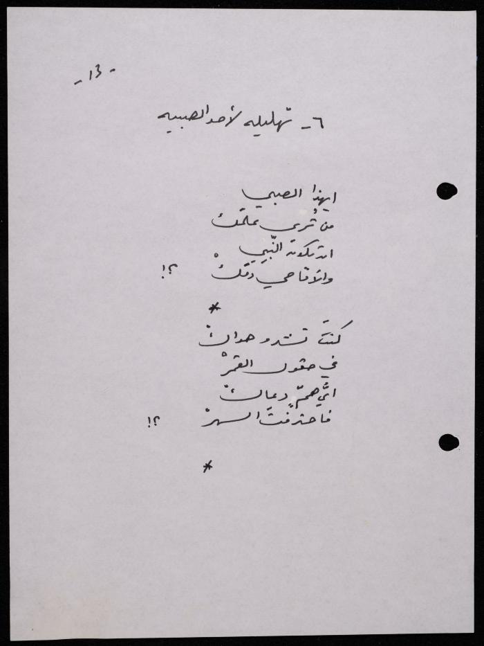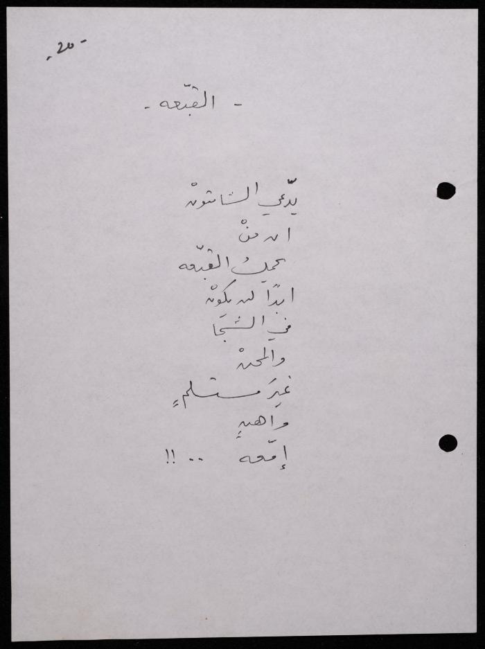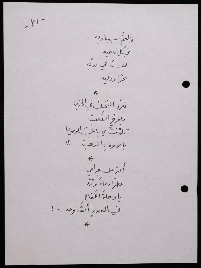 Handwritten, this 188-page archival item documents a poetry collection by Shakib Jahshan titled "Yotteloon Awsematan Min Shatha (They Come as Fragrant Medals)". The first section of the collection is titled "Kalimaton Fil-Asifa (Words In the Storm)", while the second is titled "Ihmeni Ya Abi (Protect Me, Father)".