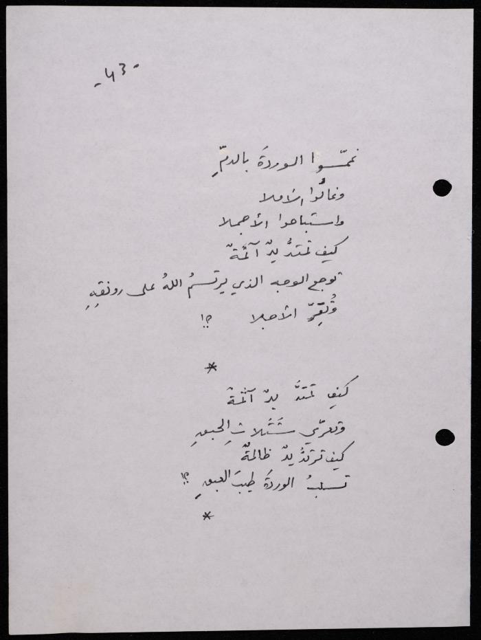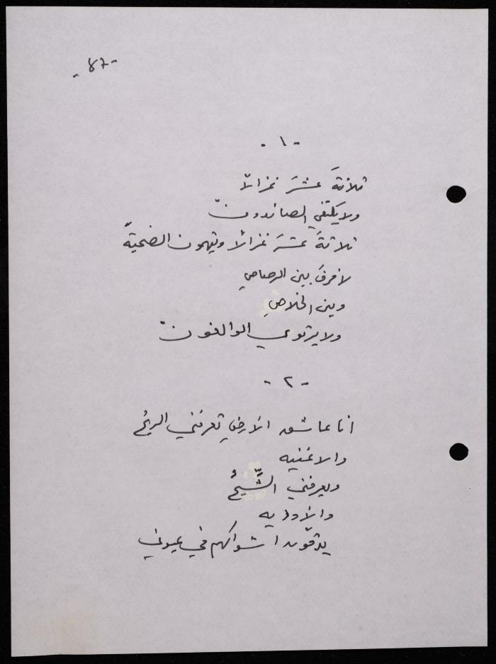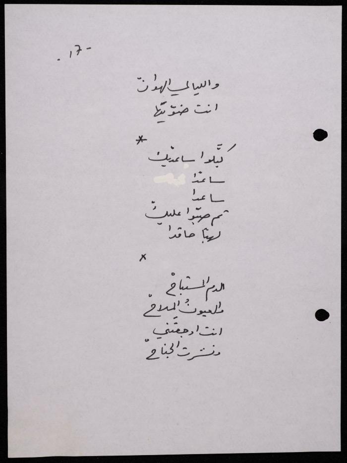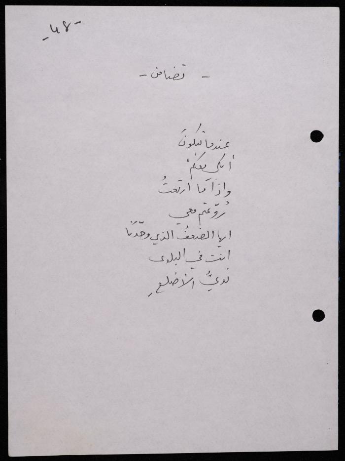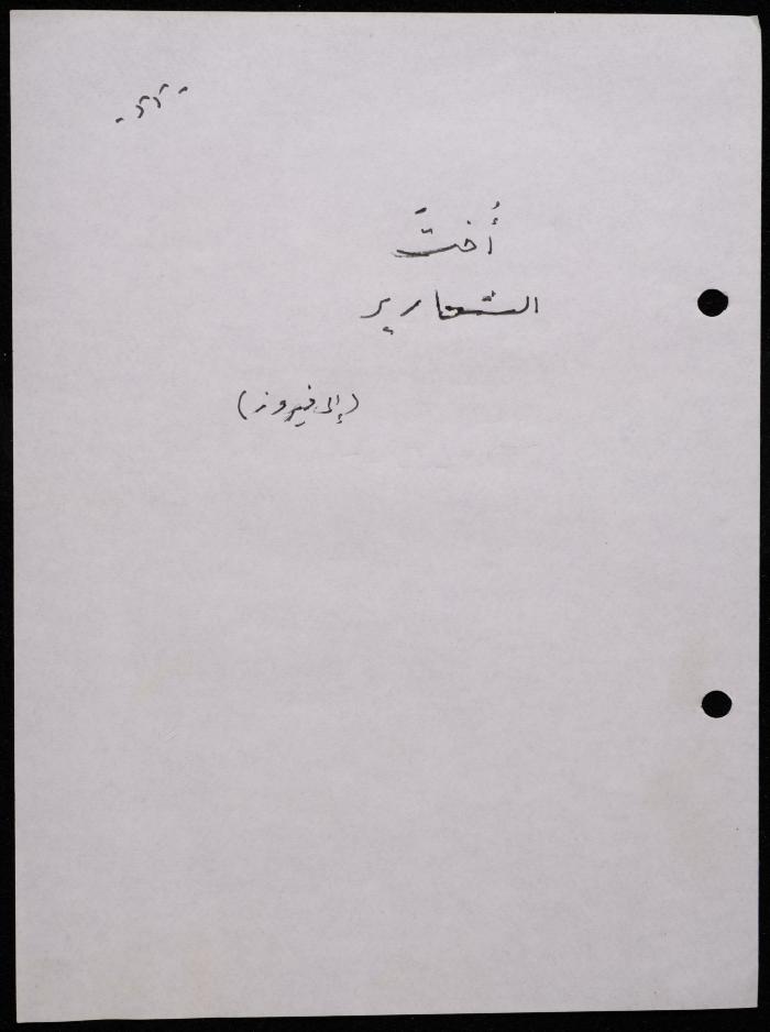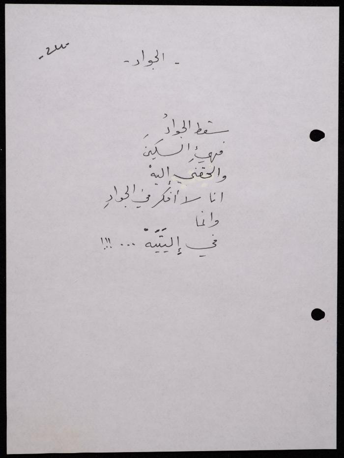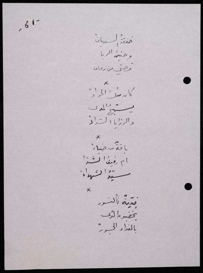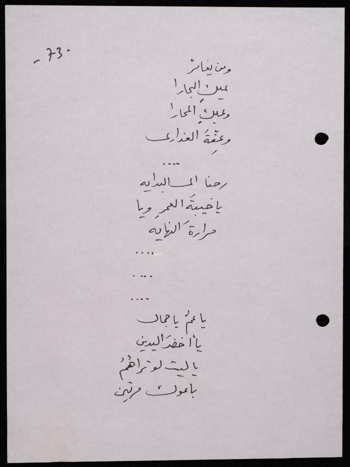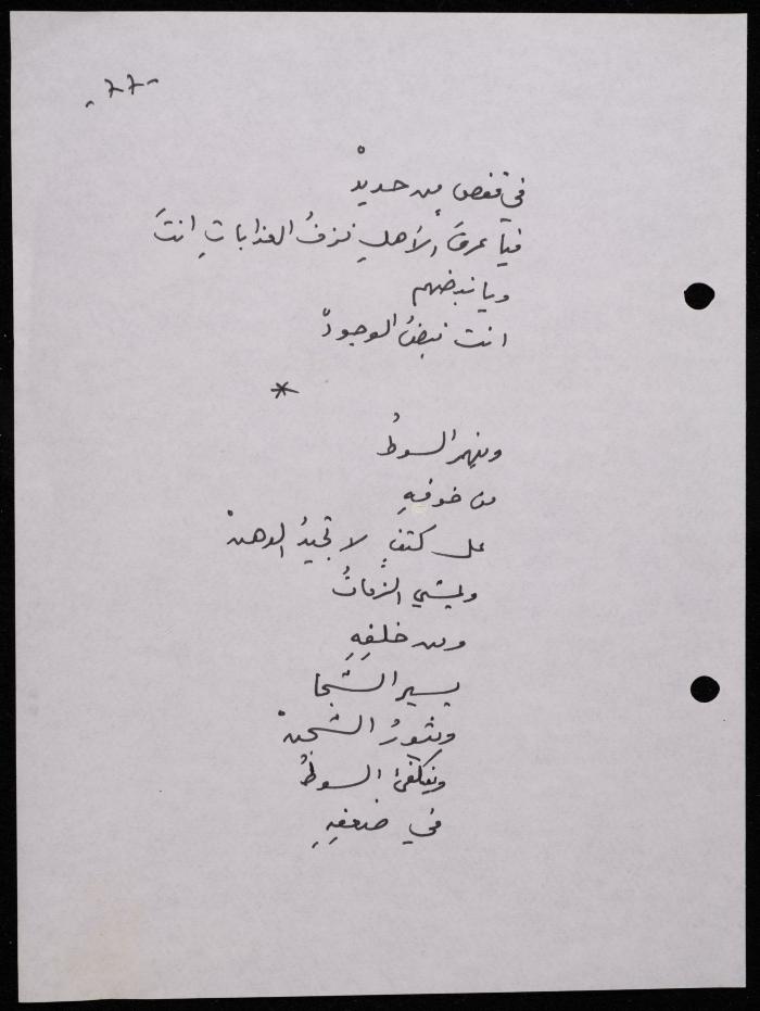 Handwritten, this 188-page archival item documents a poetry collection by Shakib Jahshan titled "Yotteloon Awsematan Min Shatha (They Come as Fragrant Medals)". The first section of the collection is titled "Kalimaton Fil-Asifa (Words In the Storm)", while the second is titled "Ihmeni Ya Abi (Protect Me, Father)".