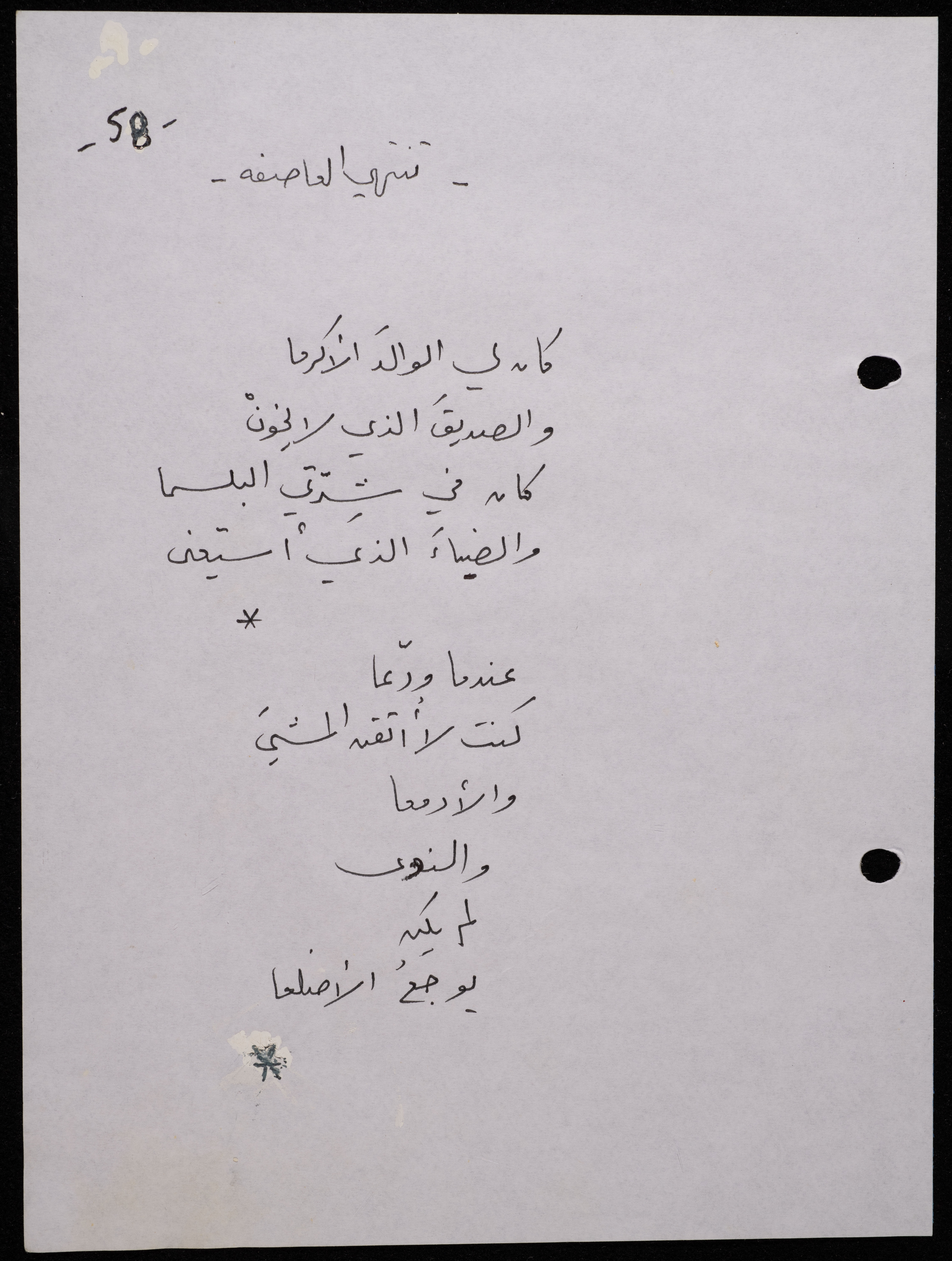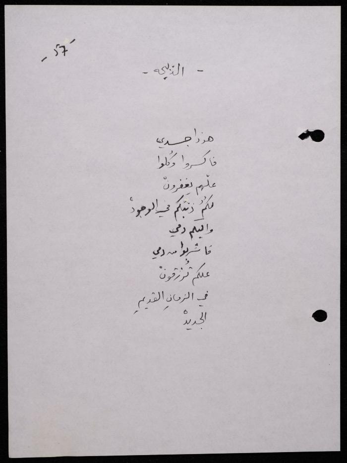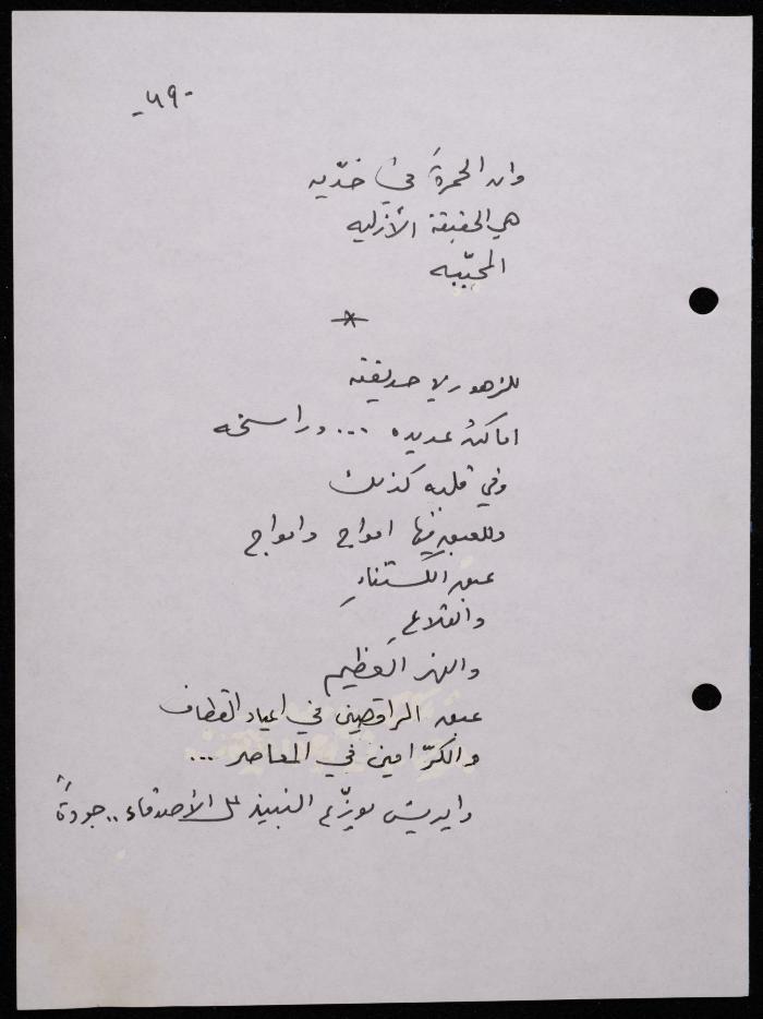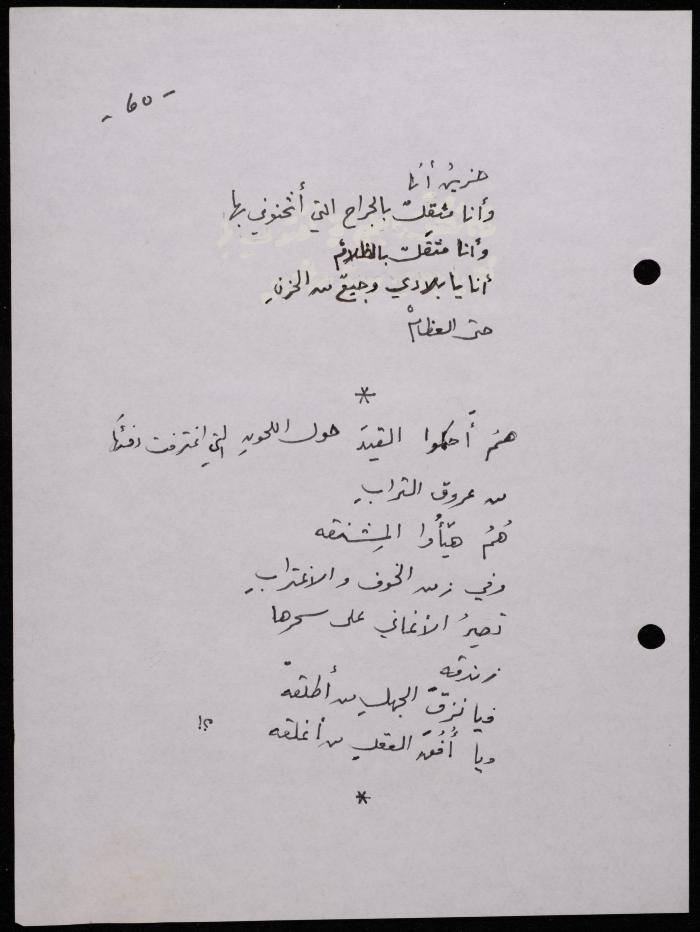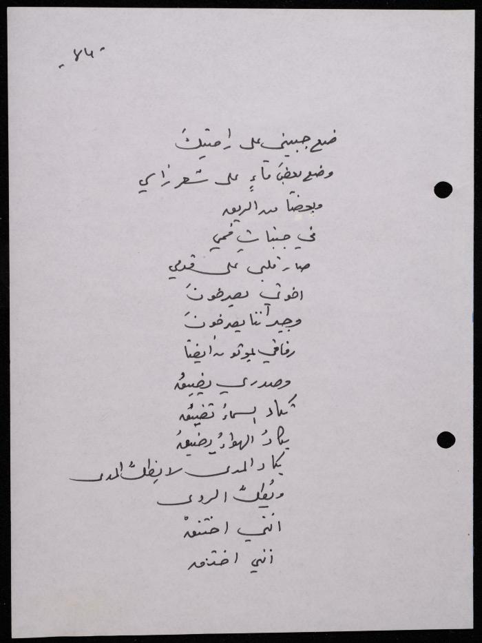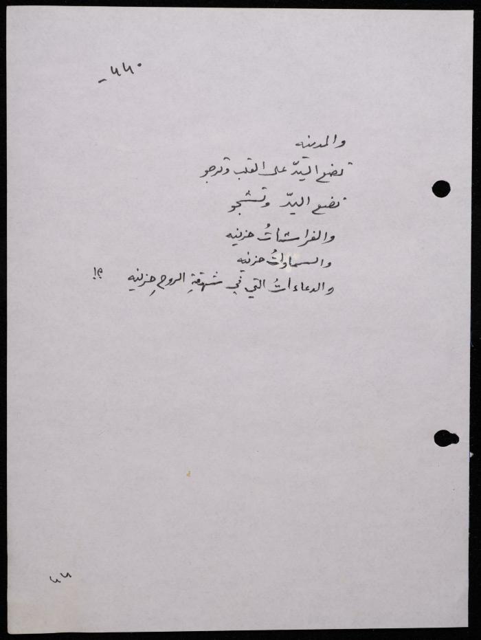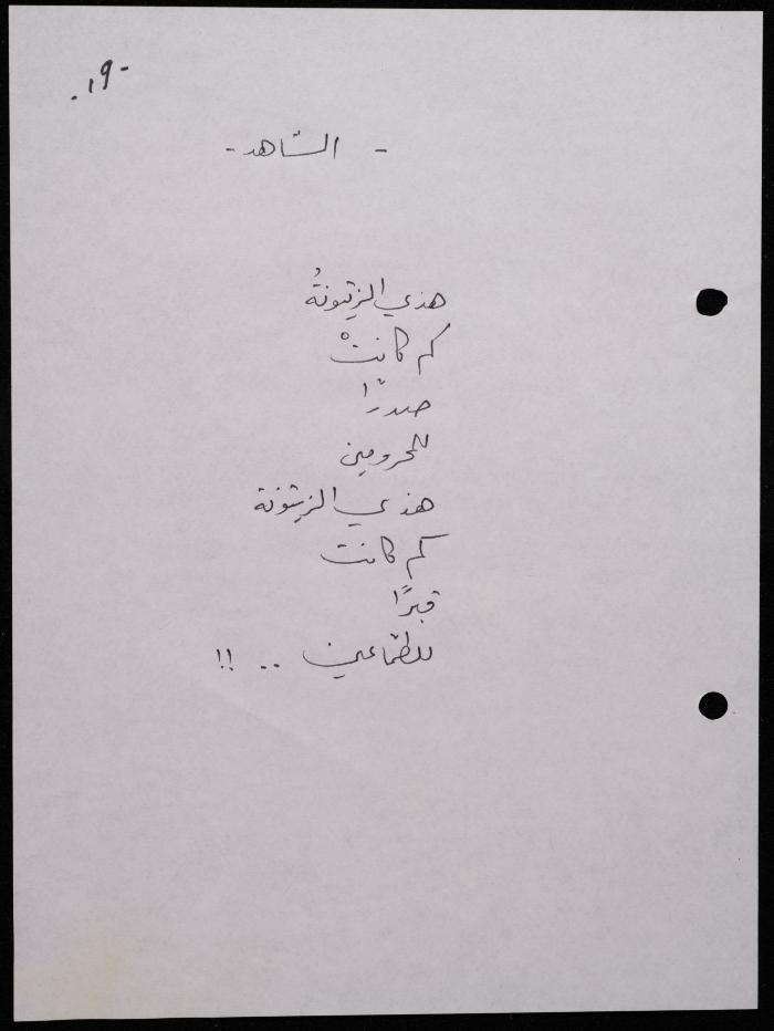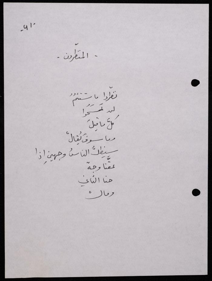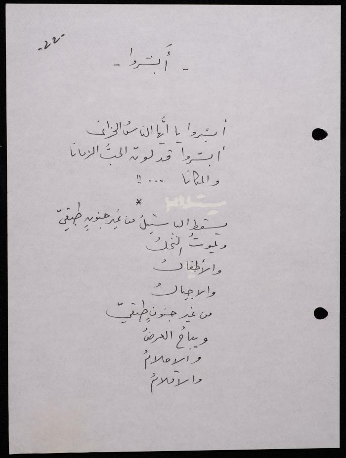 Handwritten, this 188-page archival item documents a poetry collection by Shakib Jahshan titled "Yotteloon Awsematan Min Shatha (They Come as Fragrant Medals)". The first section of the collection is titled "Kalimaton Fil-Asifa (Words In the Storm)", while the second is titled "Ihmeni Ya Abi (Protect Me, Father)".