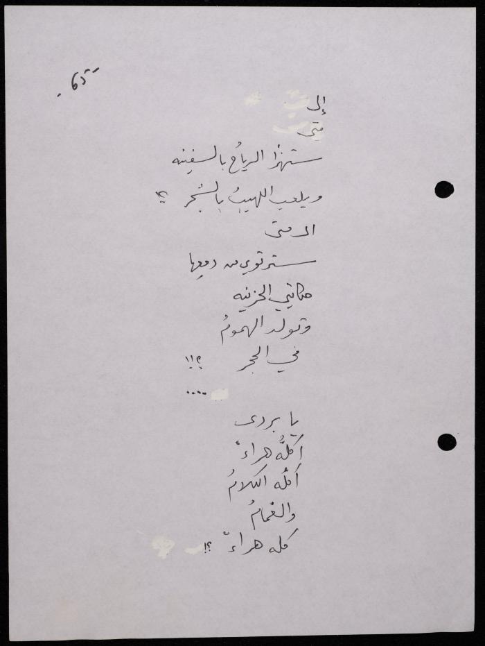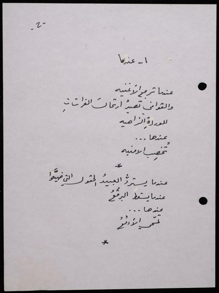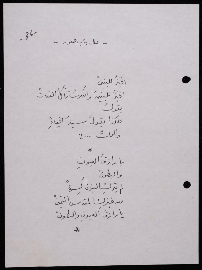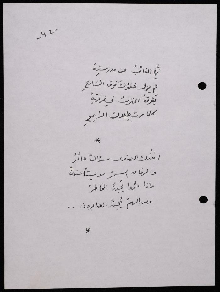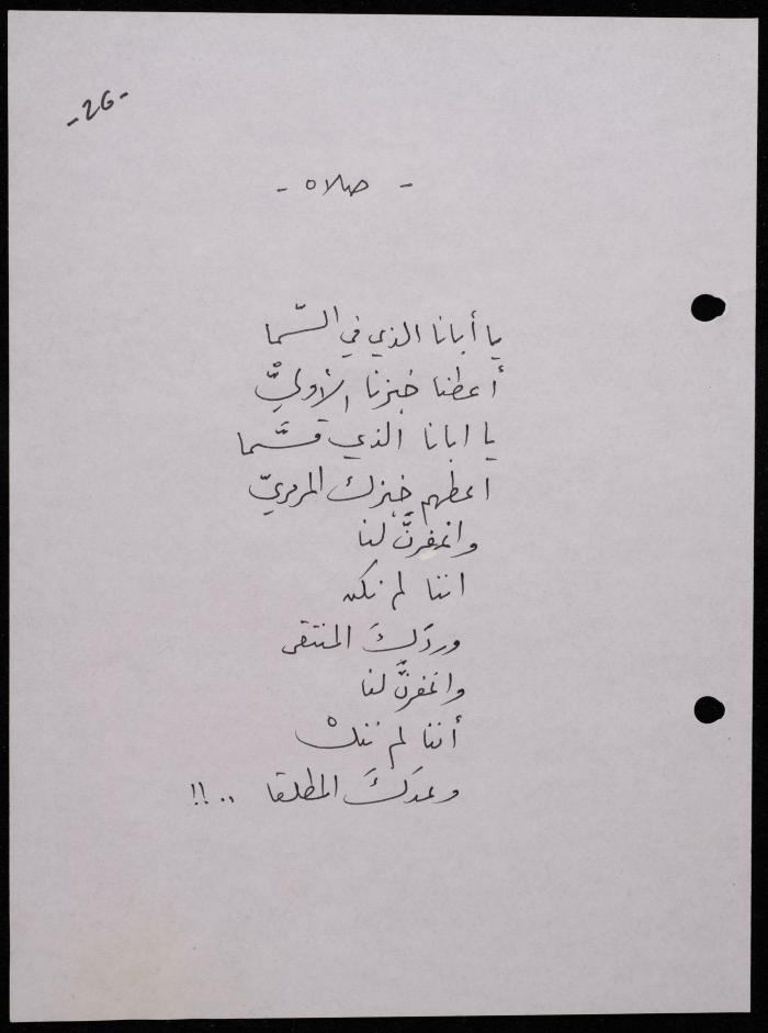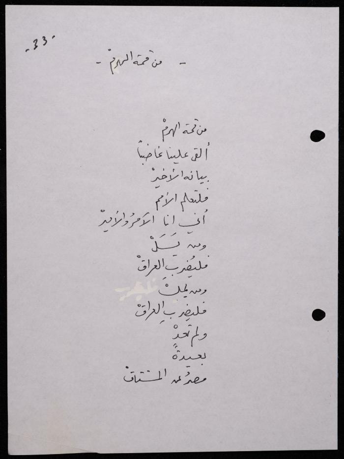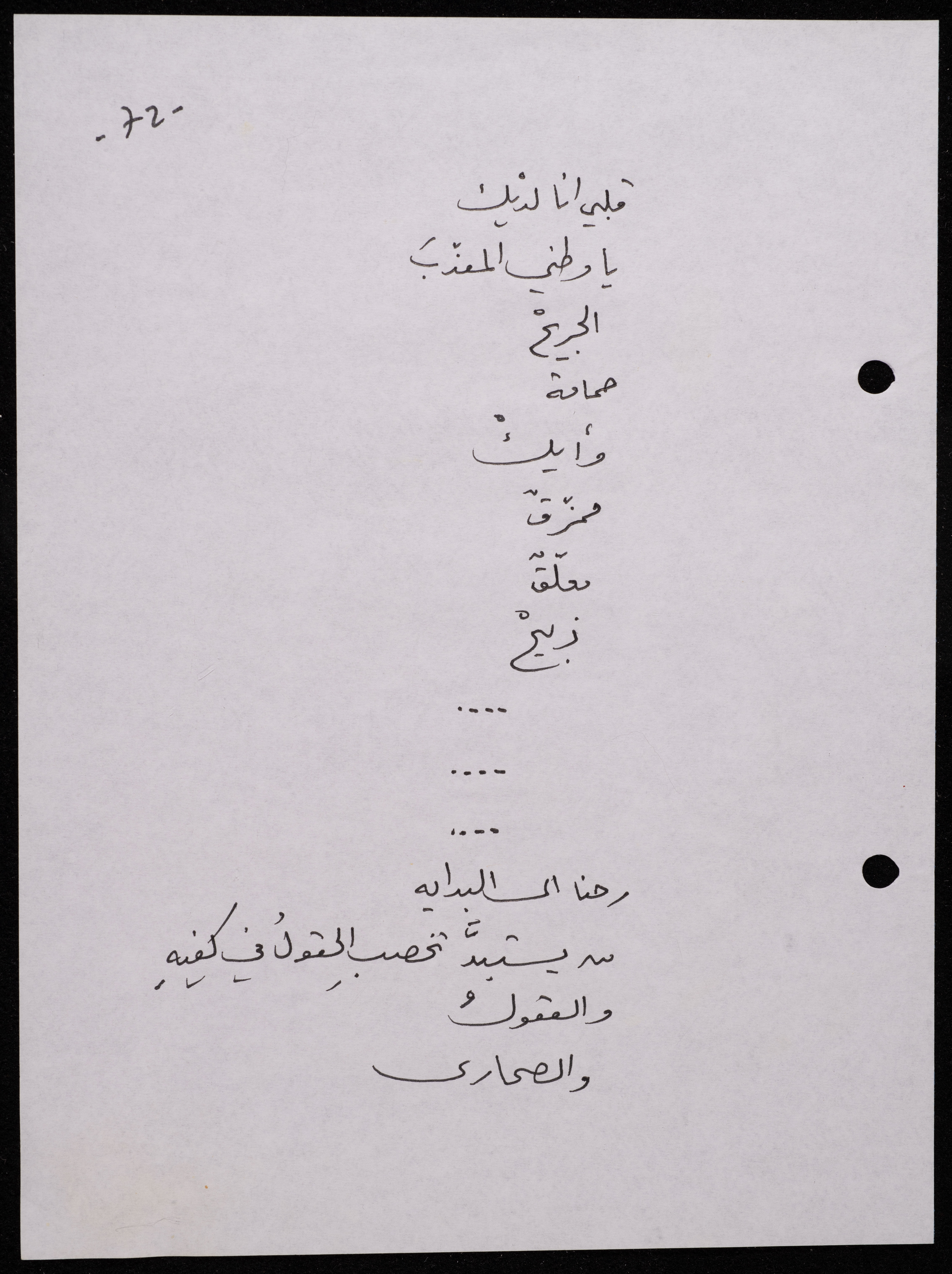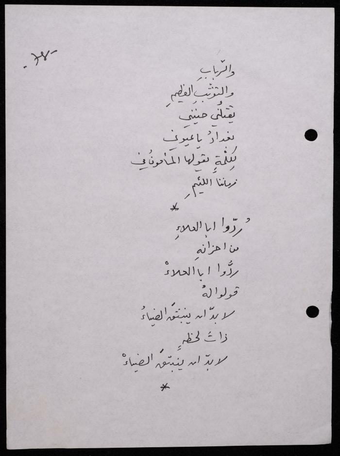 Handwritten, this 188-page archival item documents a poetry collection by Shakib Jahshan titled "Yotteloon Awsematan Min Shatha (They Come as Fragrant Medals)". The first section of the collection is titled "Kalimaton Fil-Asifa (Words In the Storm)", while the second is titled "Ihmeni Ya Abi (Protect Me, Father)".