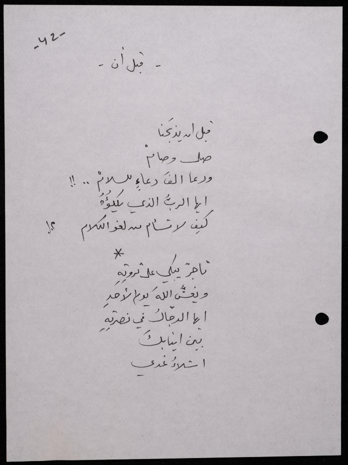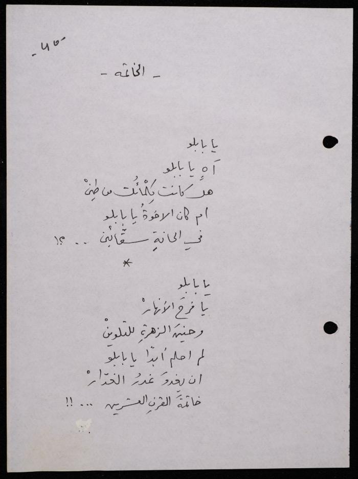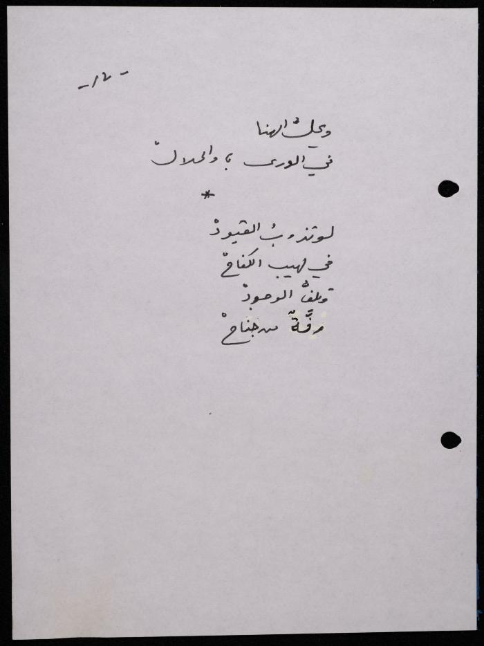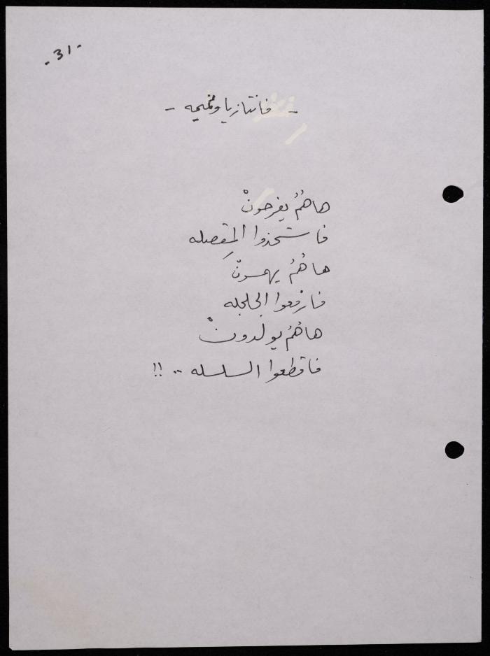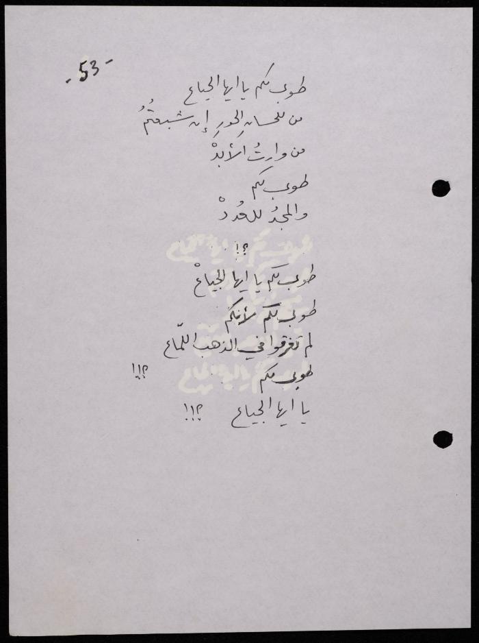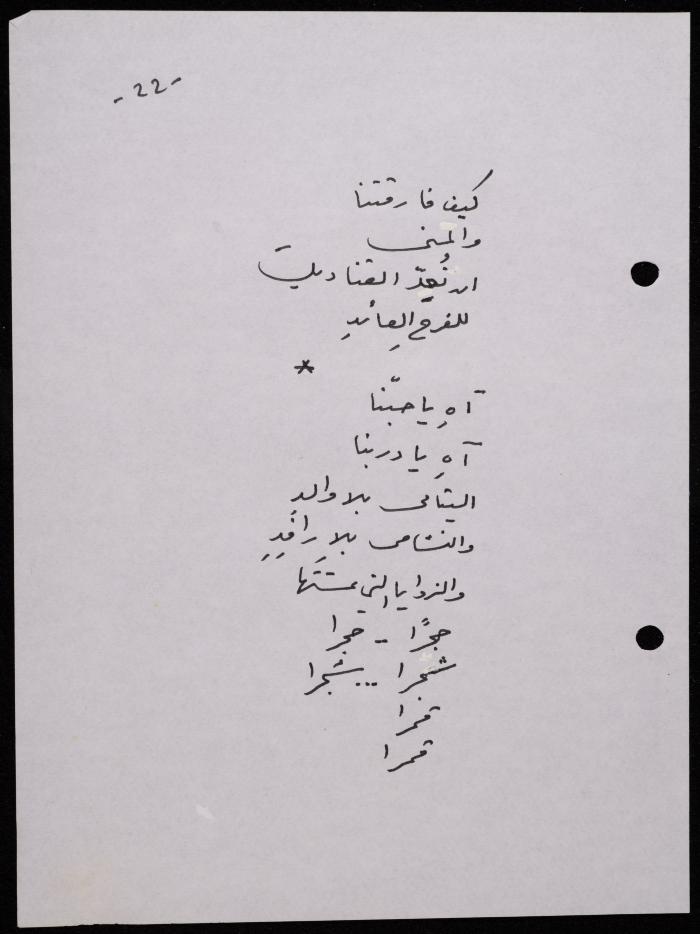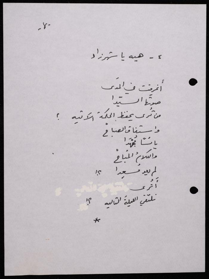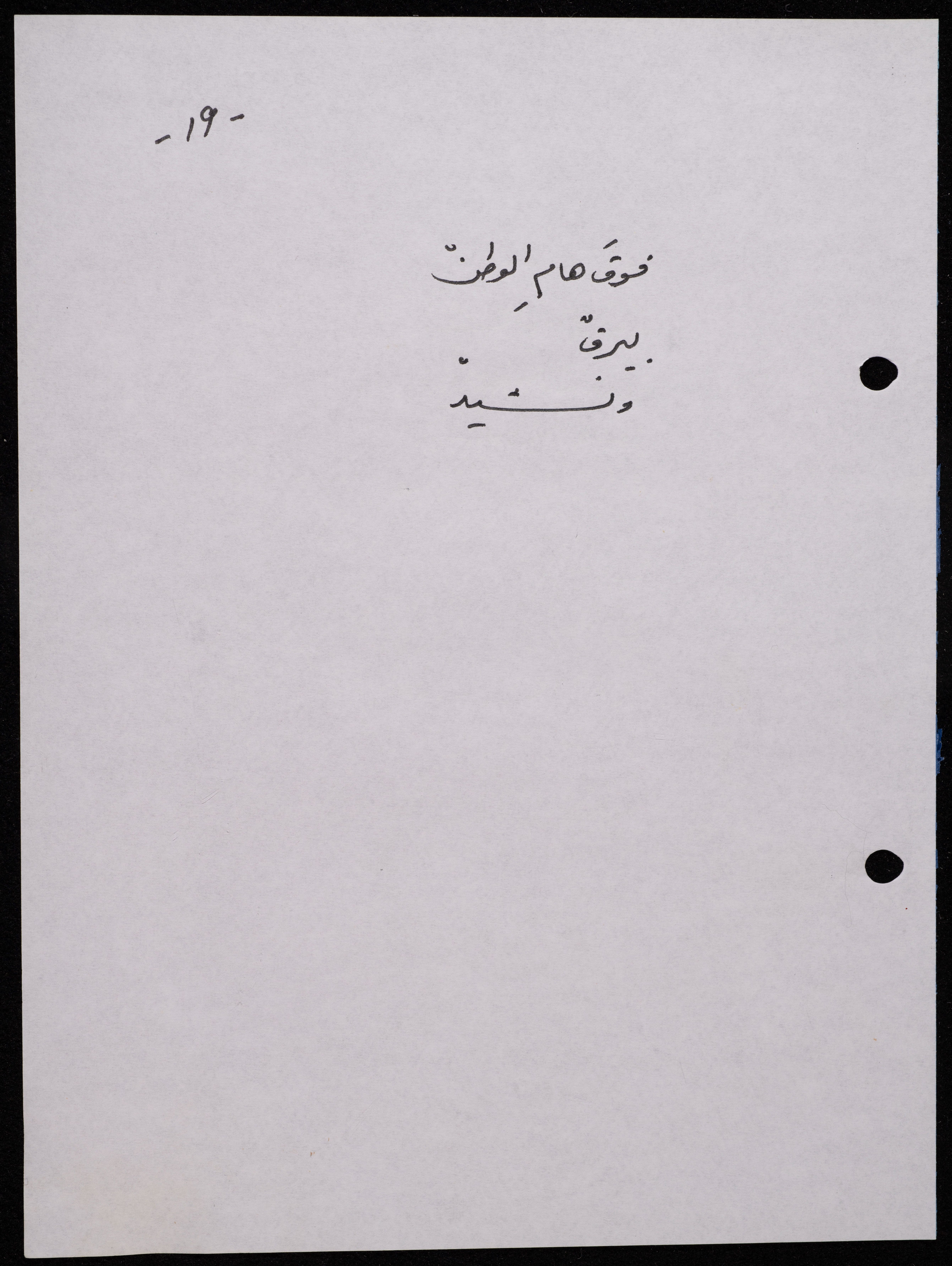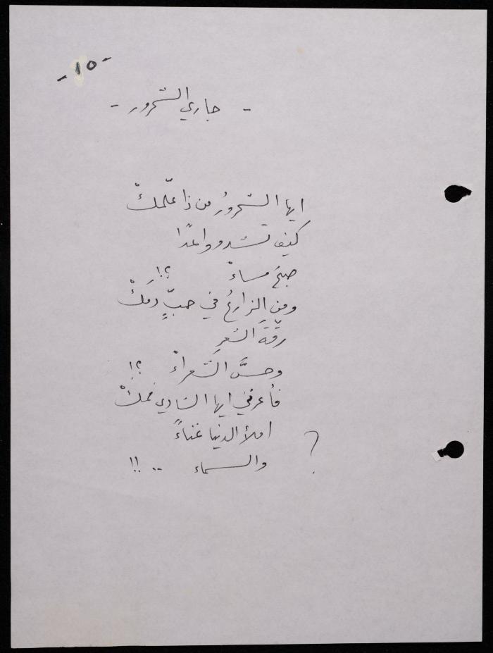 Handwritten, this 188-page archival item documents a poetry collection by Shakib Jahshan titled "Yotteloon Awsematan Min Shatha (They Come as Fragrant Medals)". The first section of the collection is titled "Kalimaton Fil-Asifa (Words In the Storm)", while the second is titled "Ihmeni Ya Abi (Protect Me, Father)".