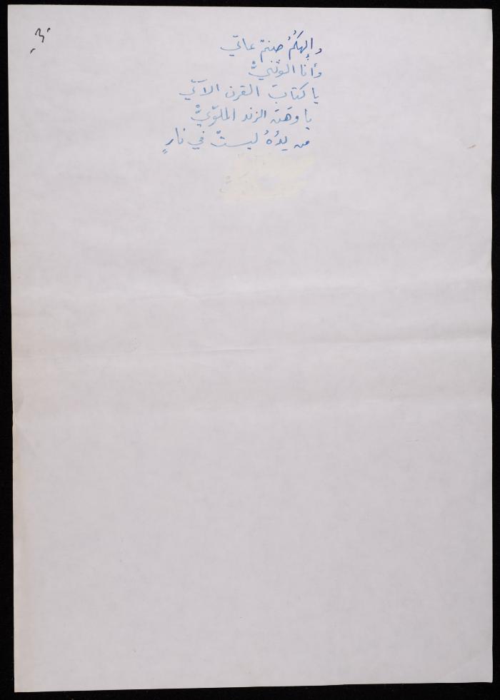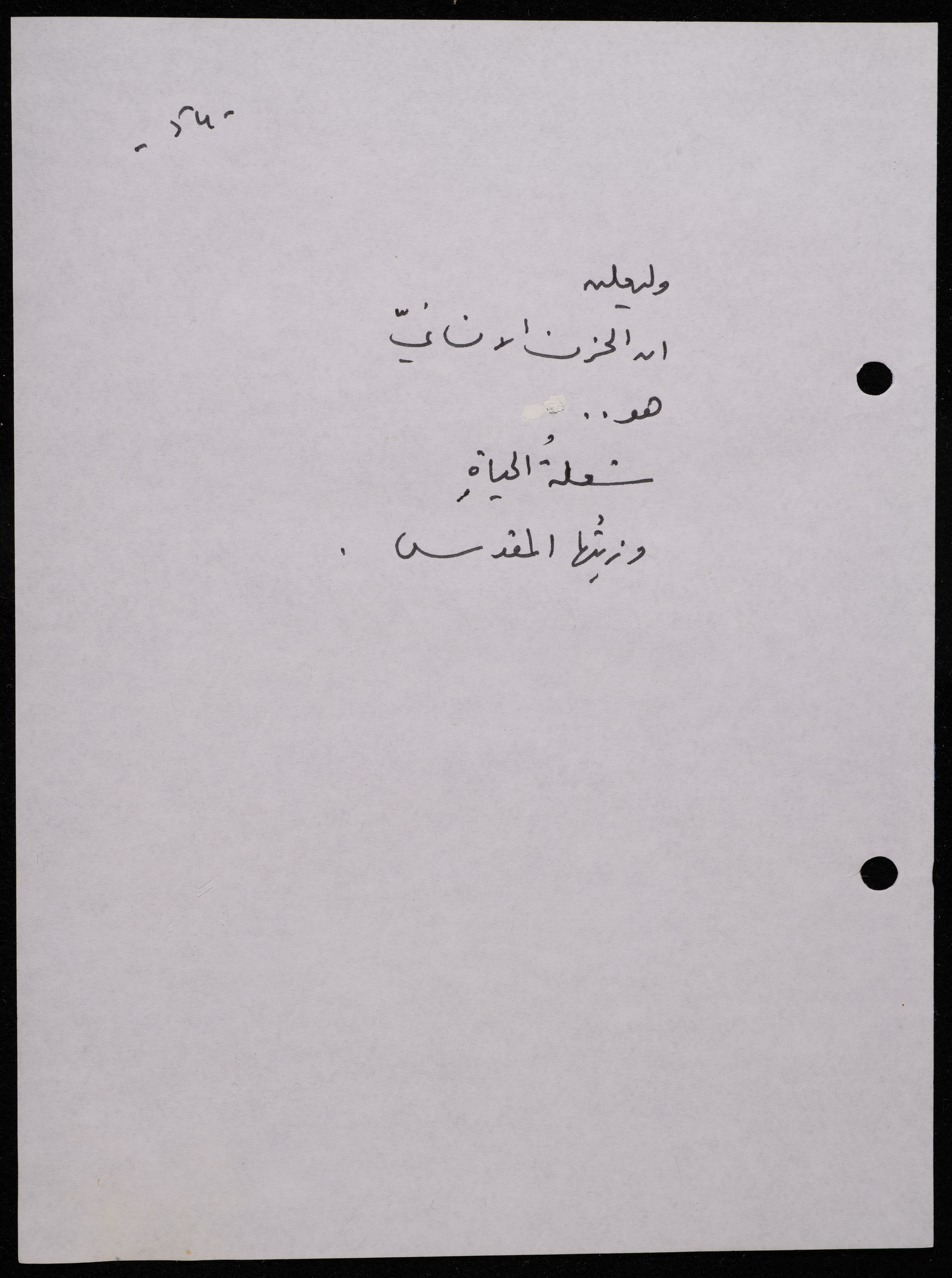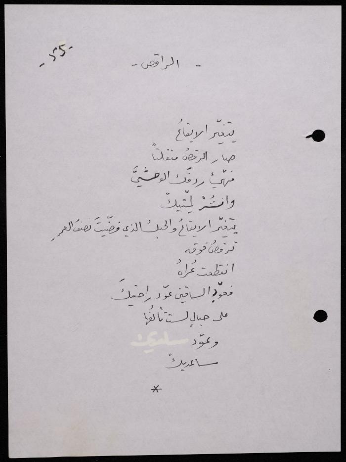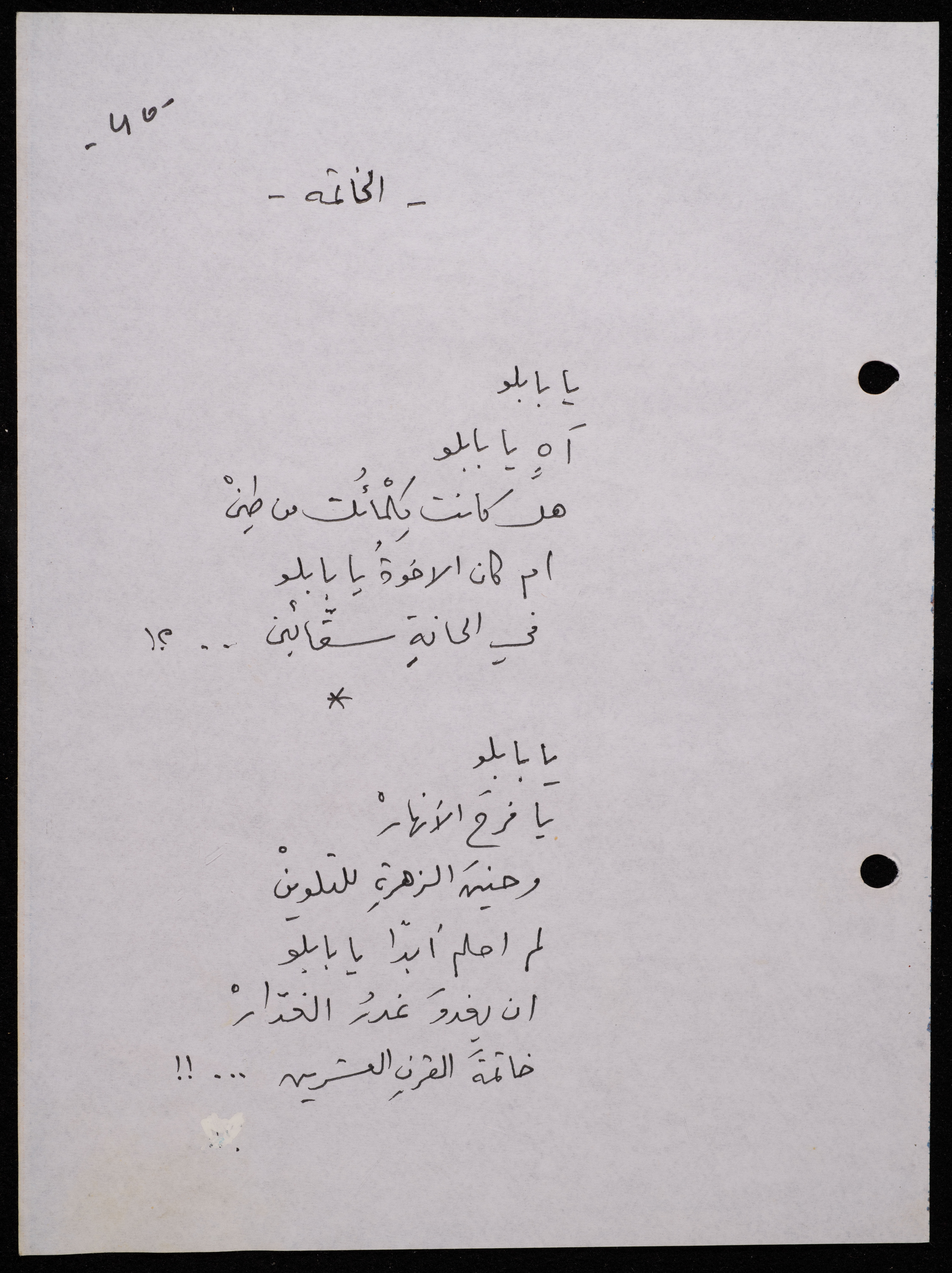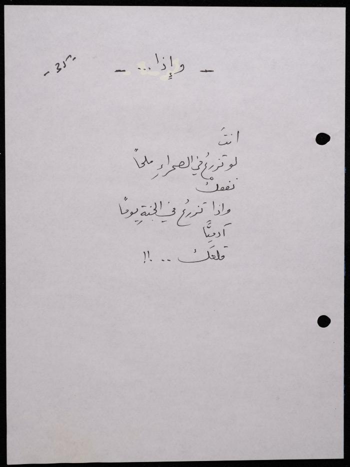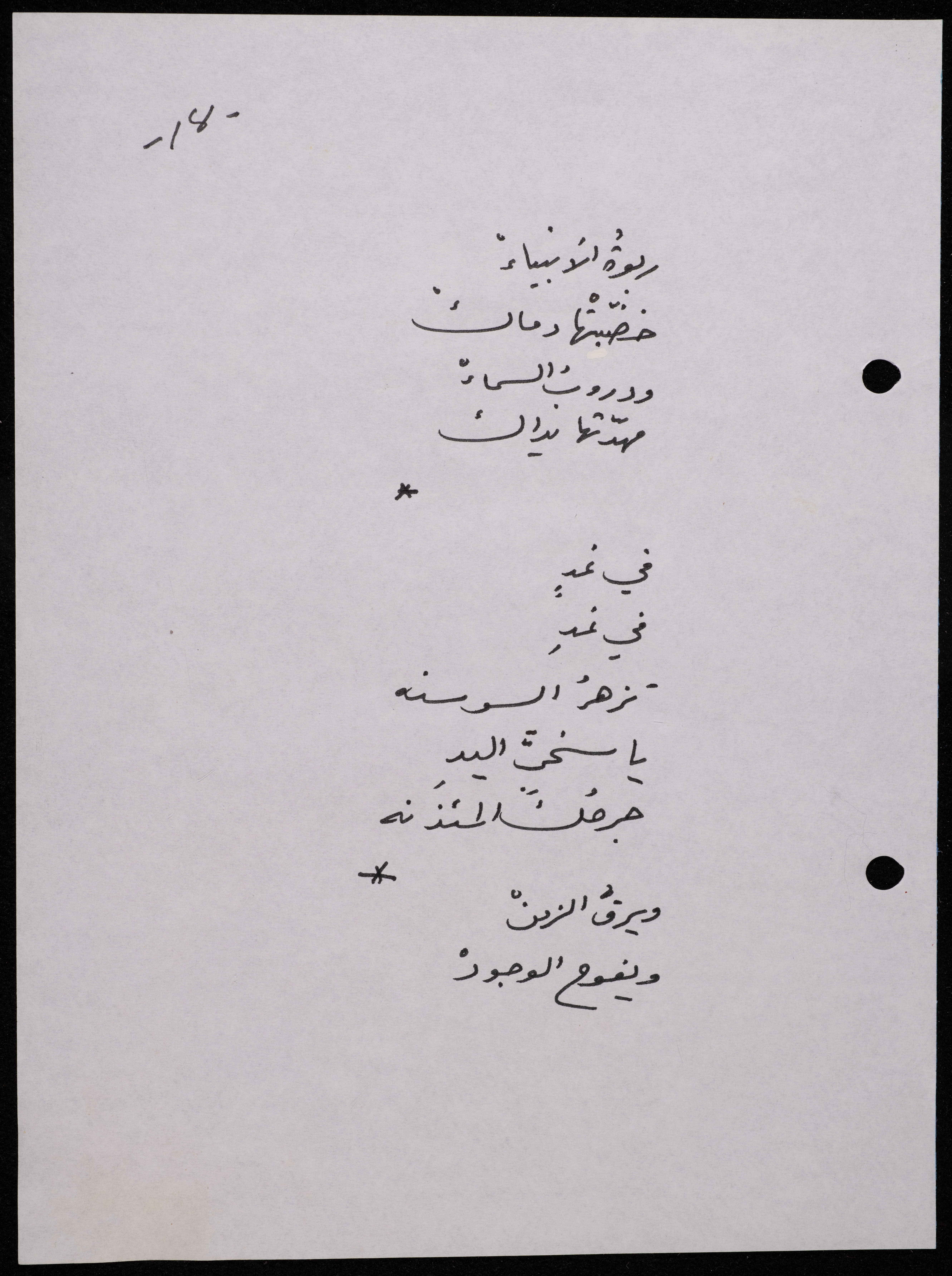 Handwritten, this 188-page archival item documents a poetry collection by Shakib Jahshan titled "Yotteloon Awsematan Min Shatha (They Come as Fragrant Medals)". The first section of the collection is titled "Kalimaton Fil-Asifa (Words In the Storm)", while the second is titled "Ihmeni Ya Abi (Protect Me, Father)".
