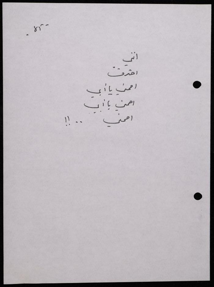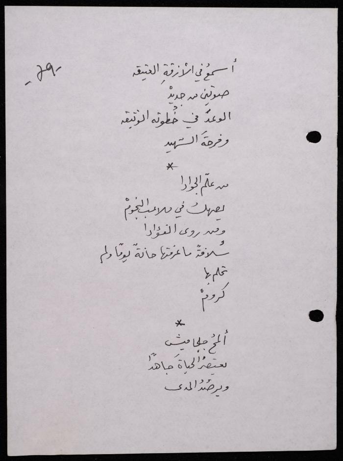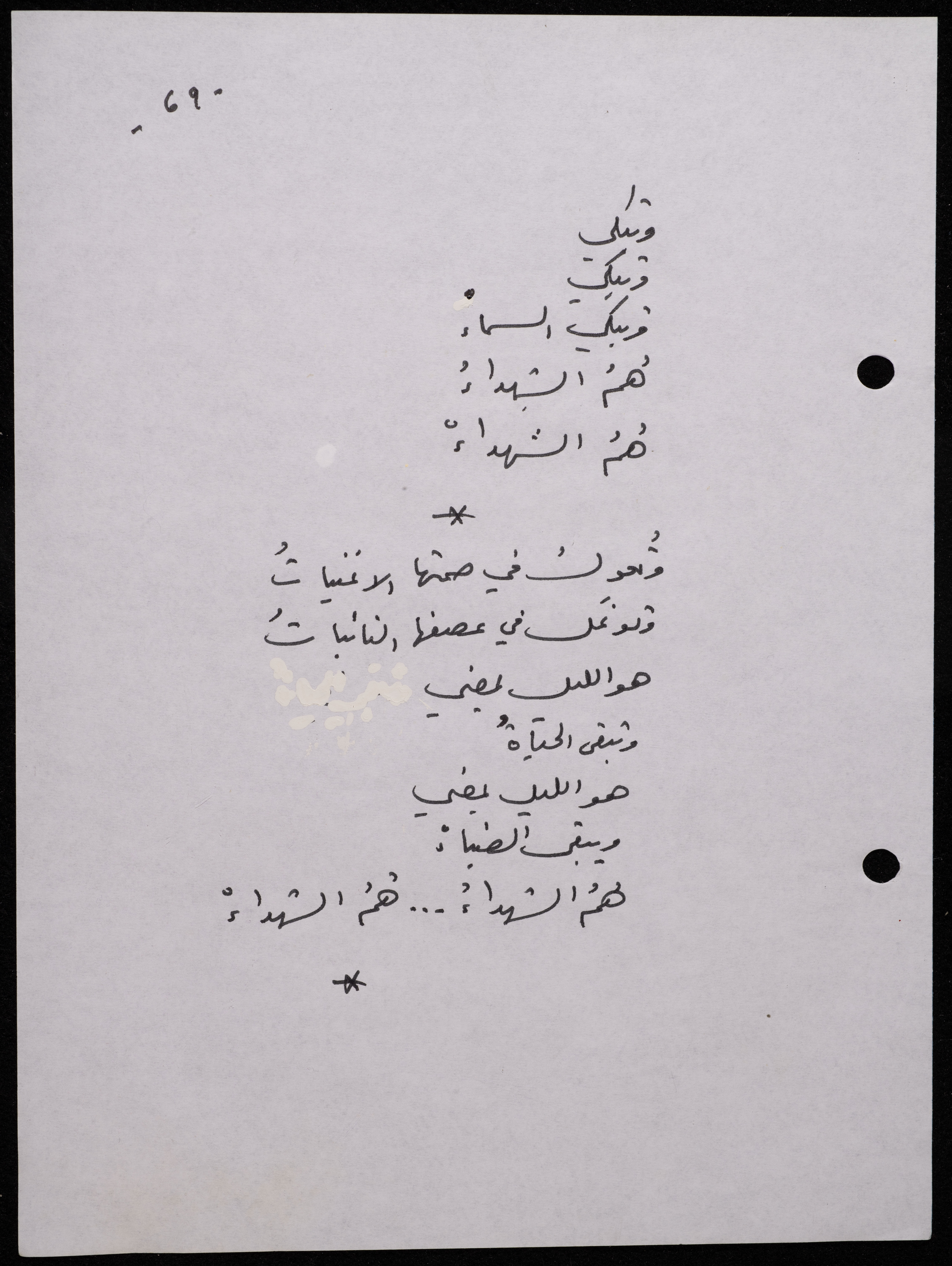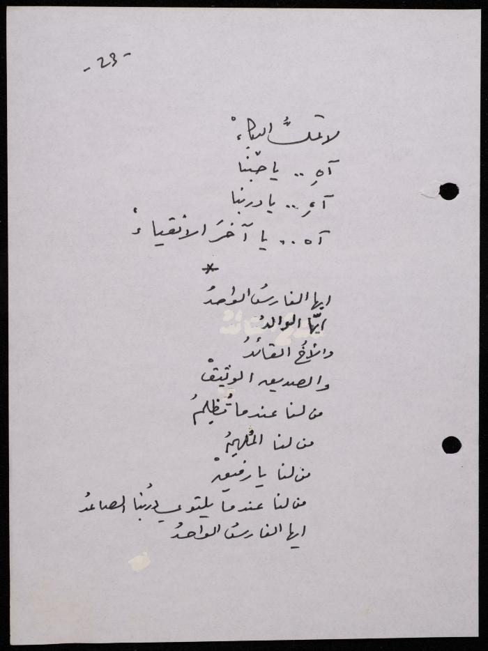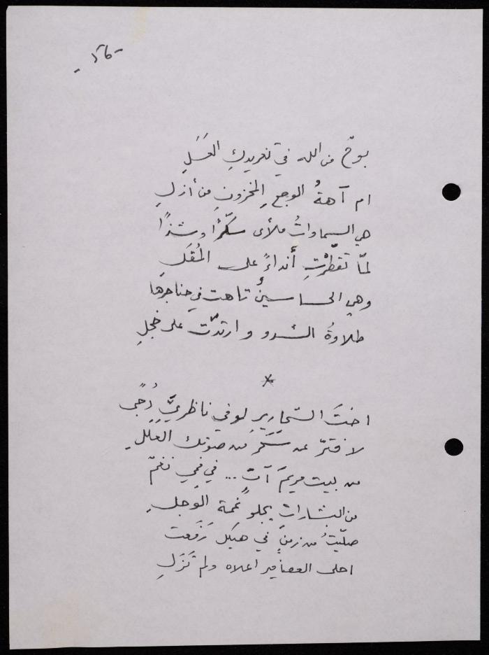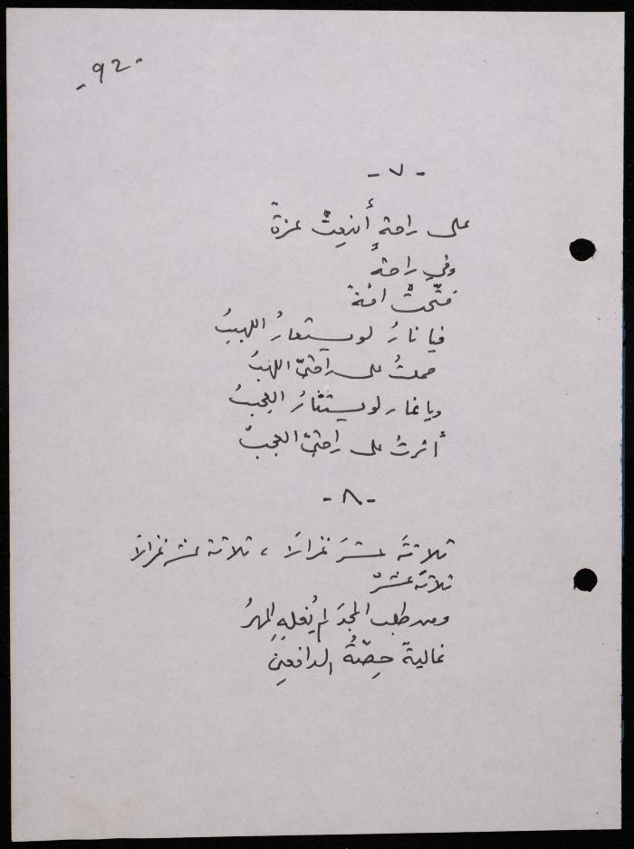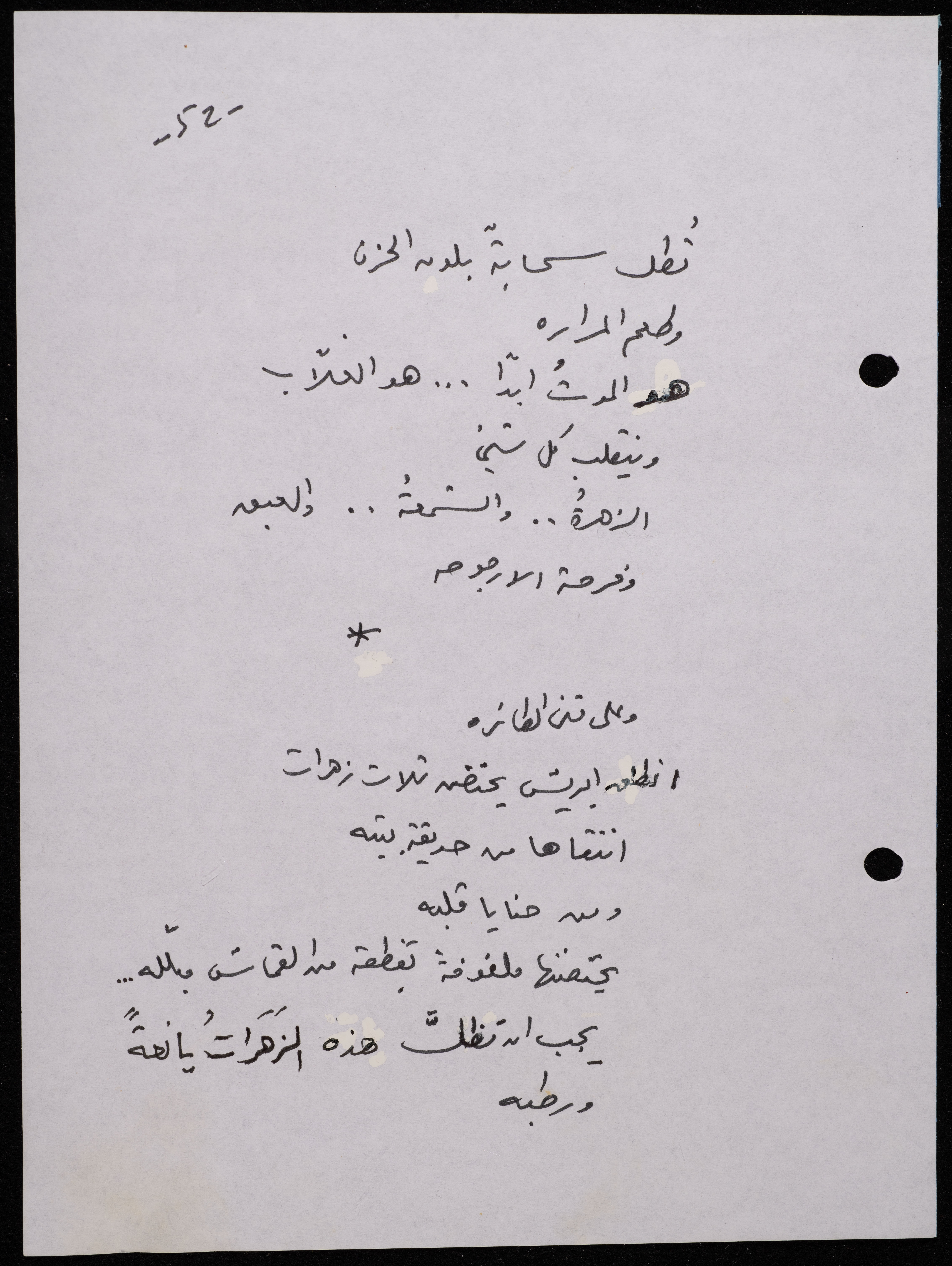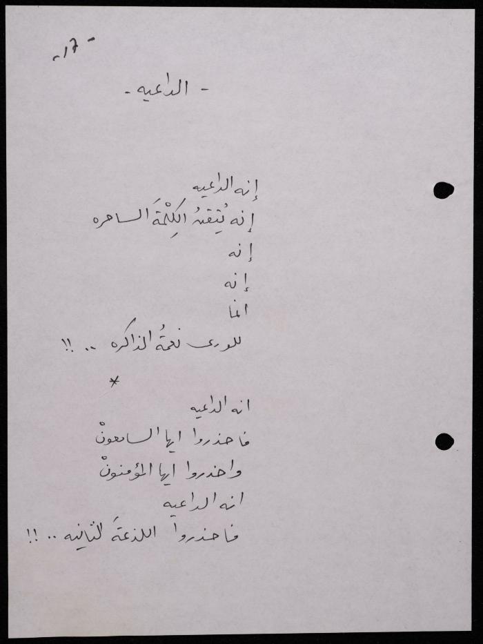 Handwritten, this 188-page archival item documents a poetry collection by Shakib Jahshan titled "Yotteloon Awsematan Min Shatha (They Come as Fragrant Medals)". The first section of the collection is titled "Kalimaton Fil-Asifa (Words In the Storm)", while the second is titled "Ihmeni Ya Abi (Protect Me, Father)".