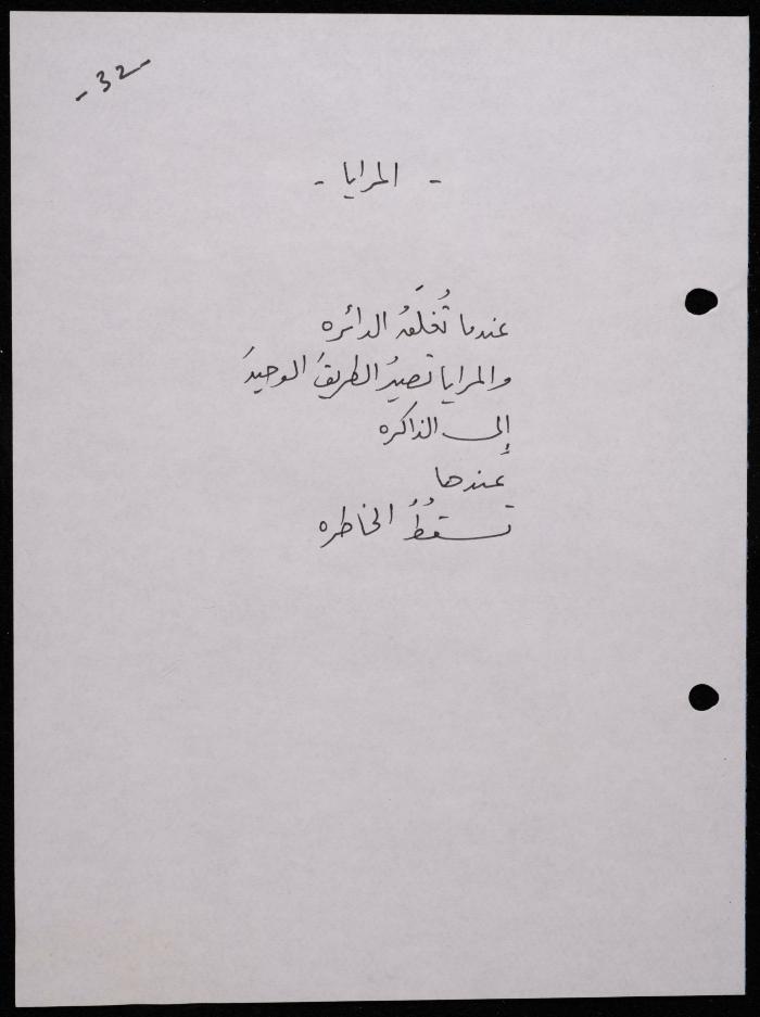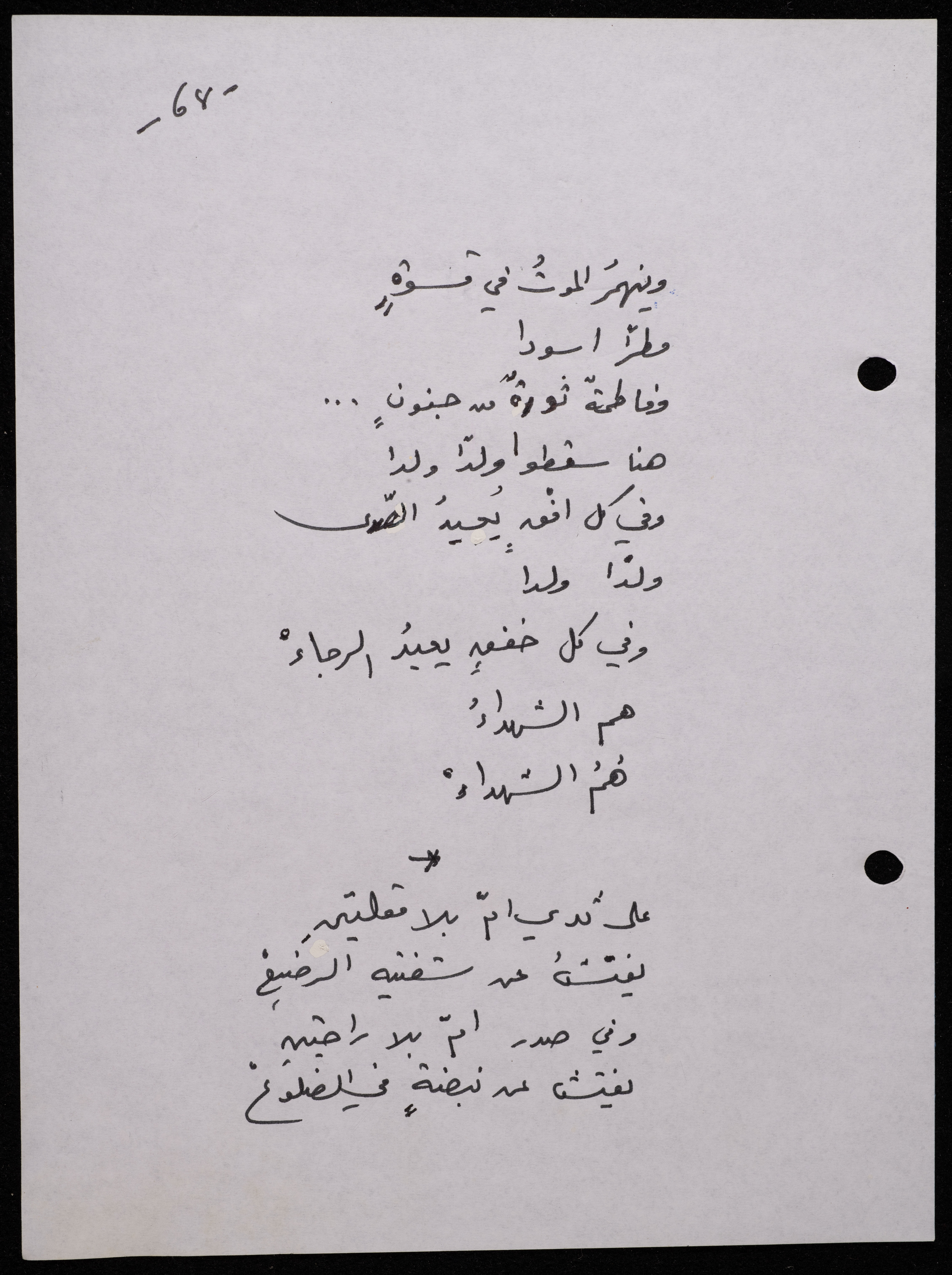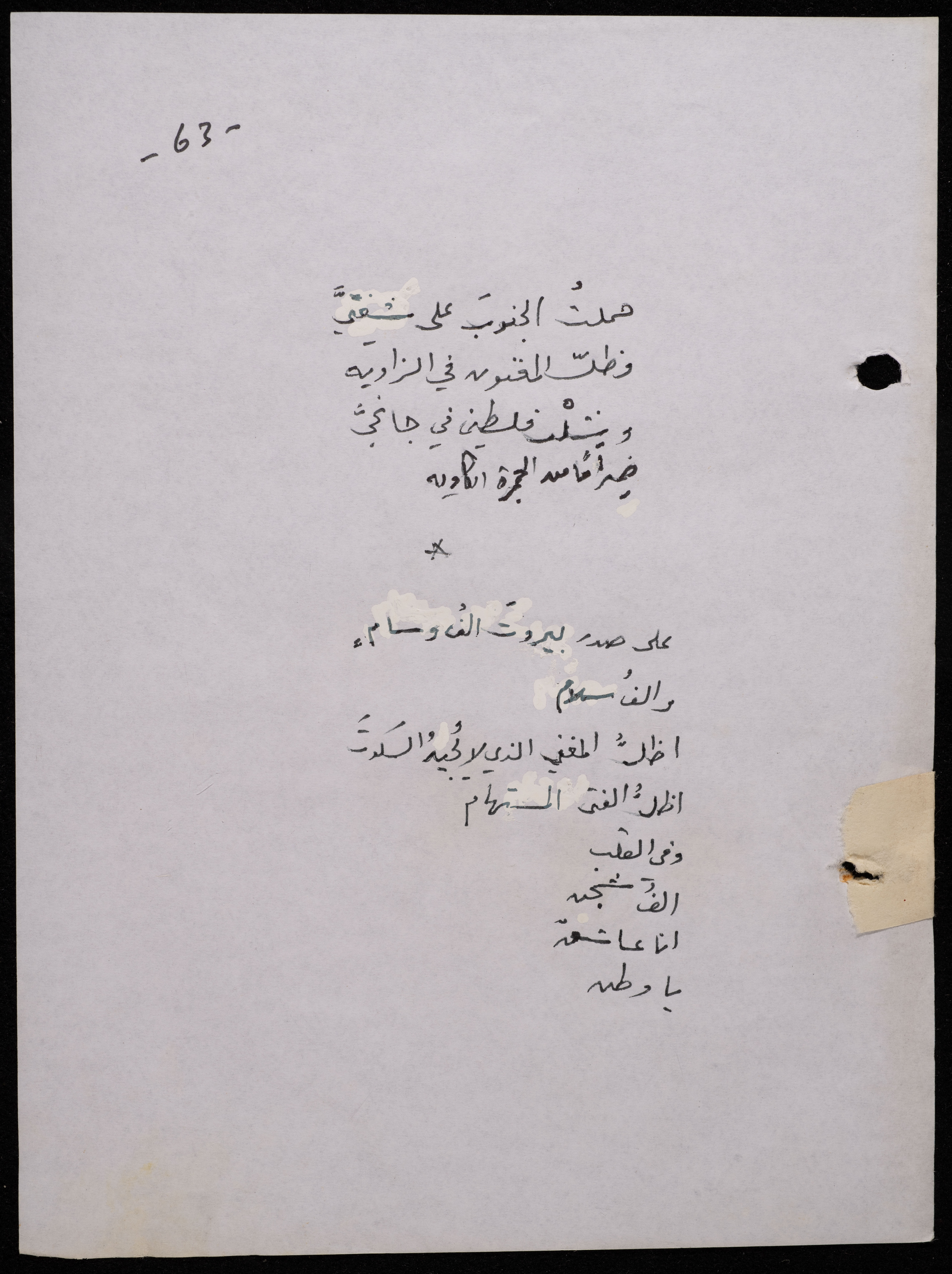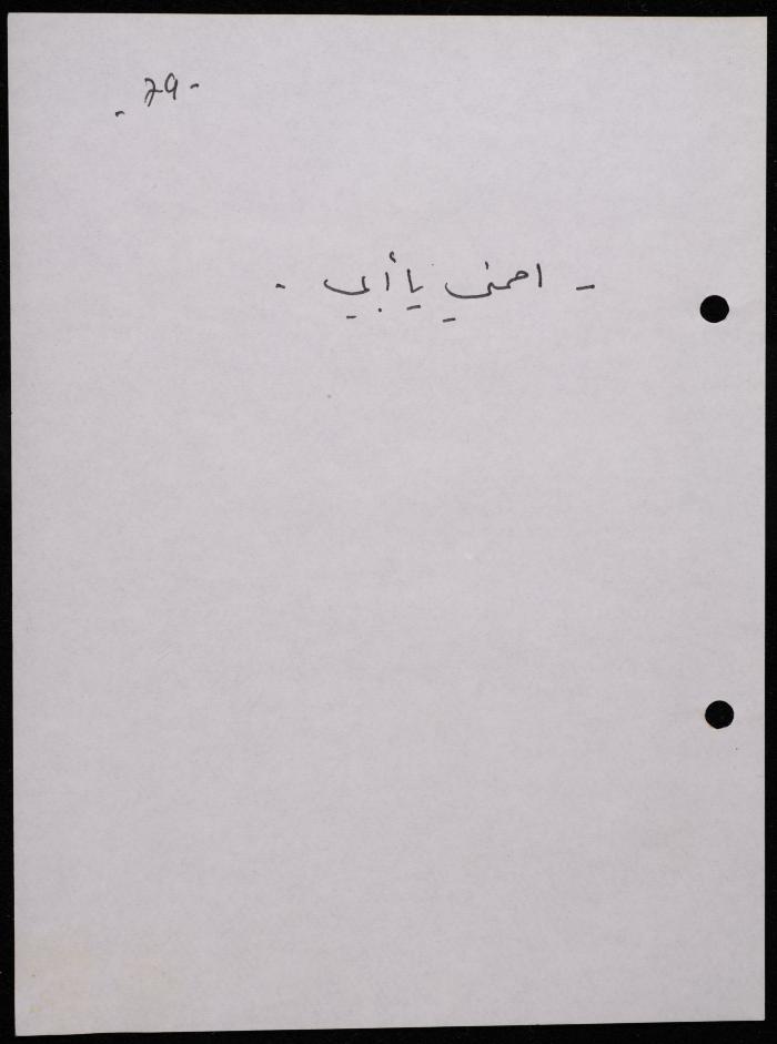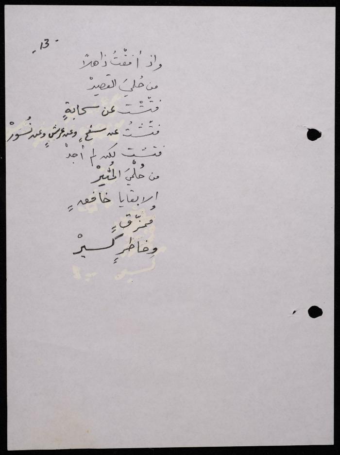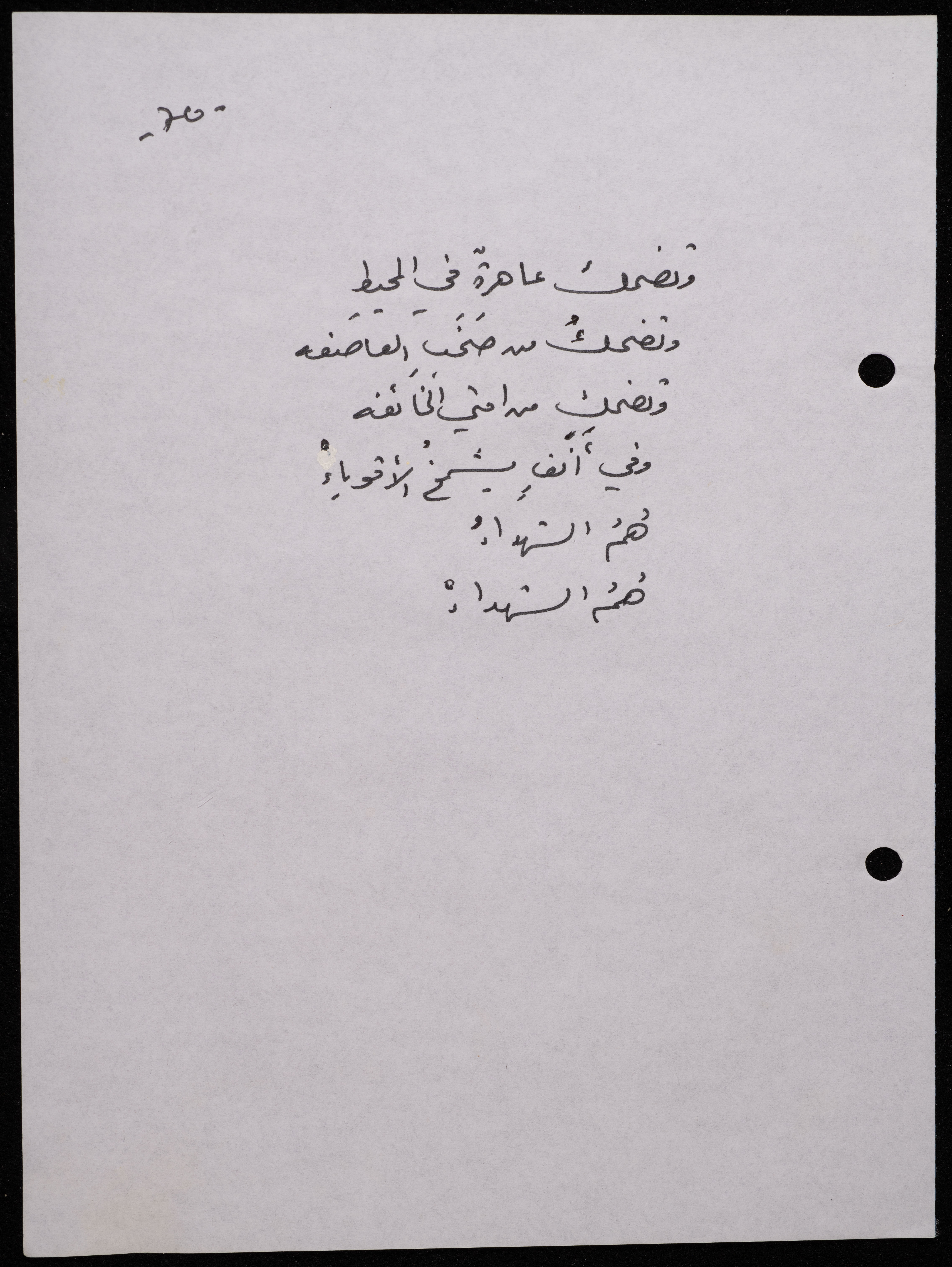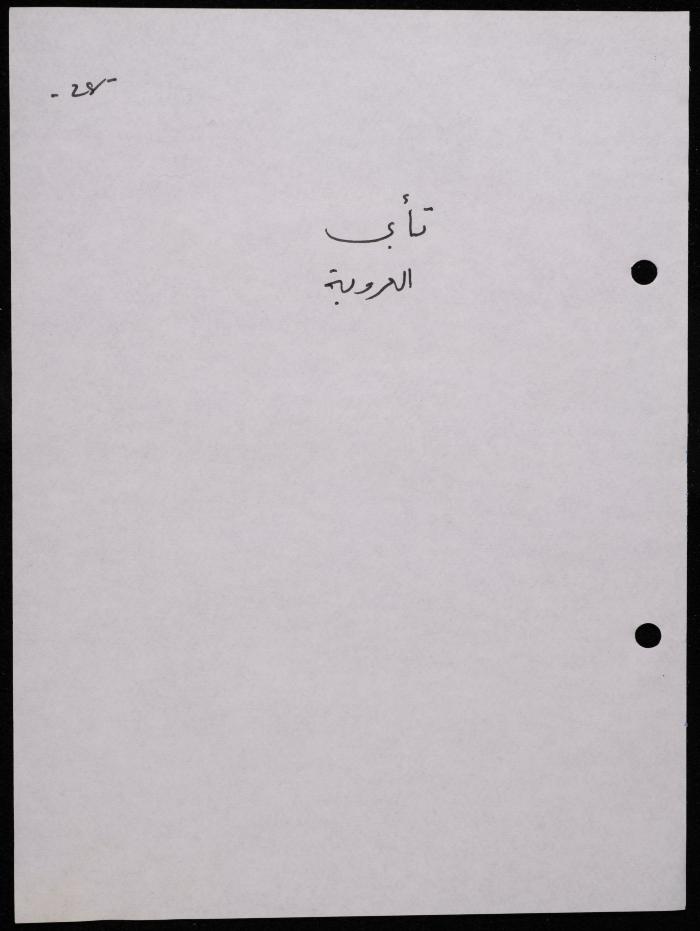 Handwritten, this 188-page archival item documents a poetry collection by Shakib Jahshan titled "Yotteloon Awsematan Min Shatha (They Come as Fragrant Medals)". The first section of the collection is titled "Kalimaton Fil-Asifa (Words In the Storm)", while the second is titled "Ihmeni Ya Abi (Protect Me, Father)".