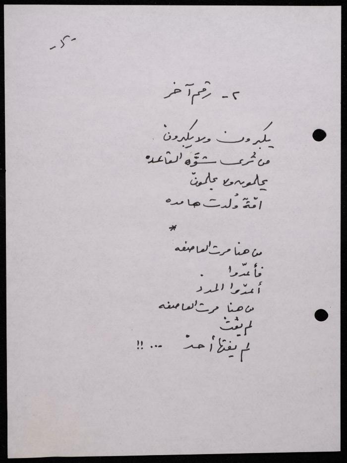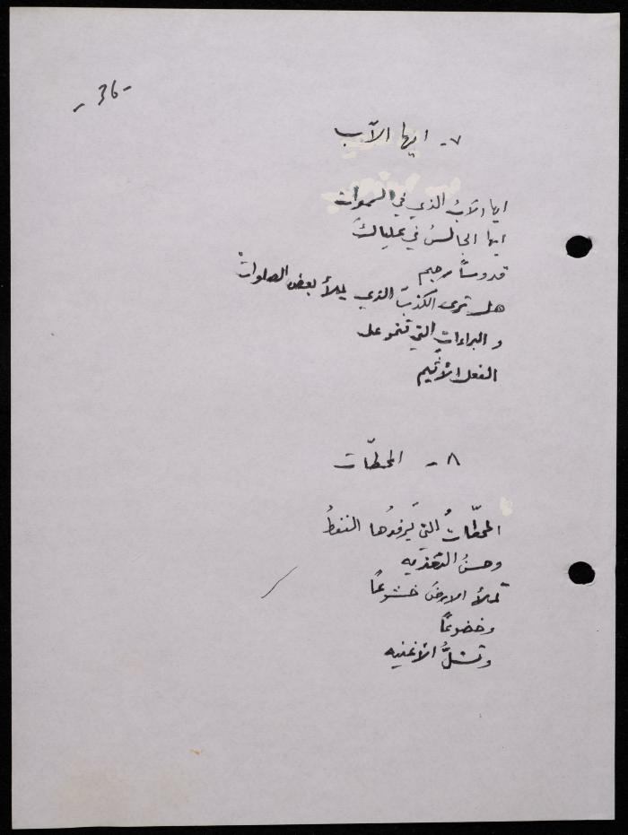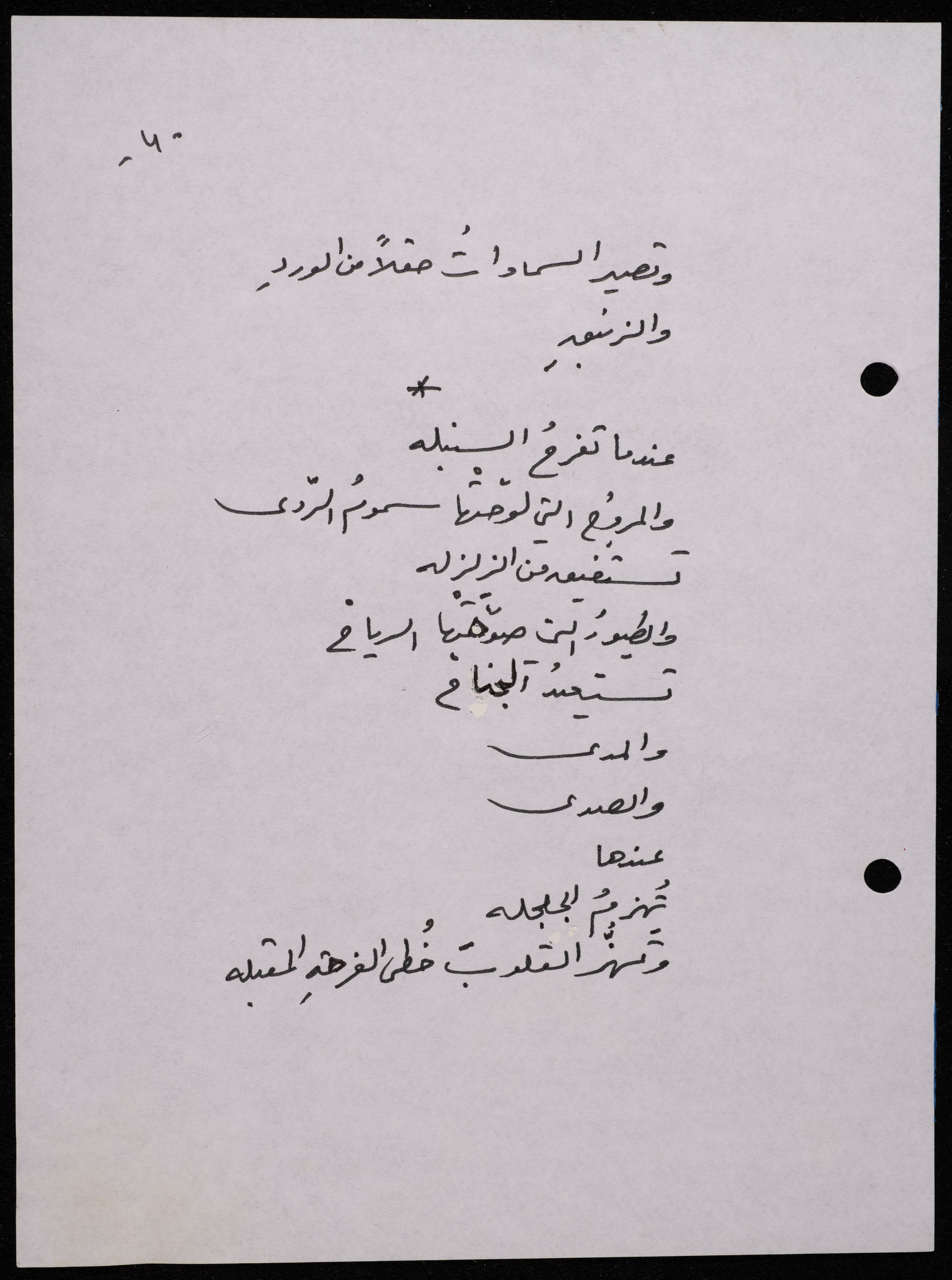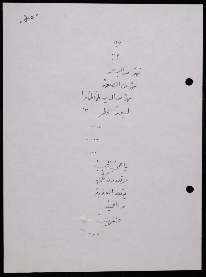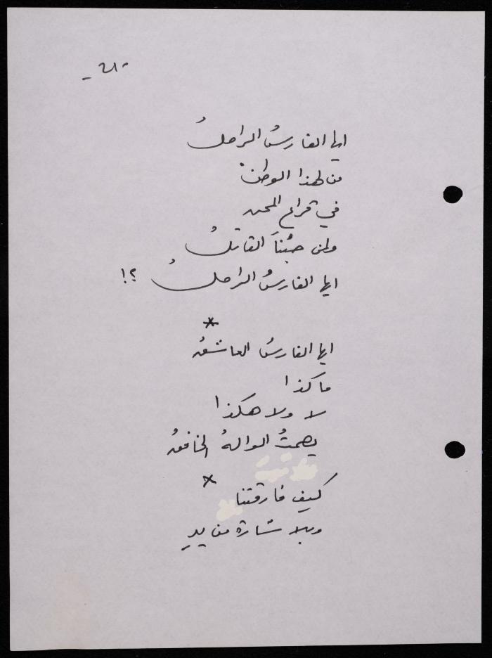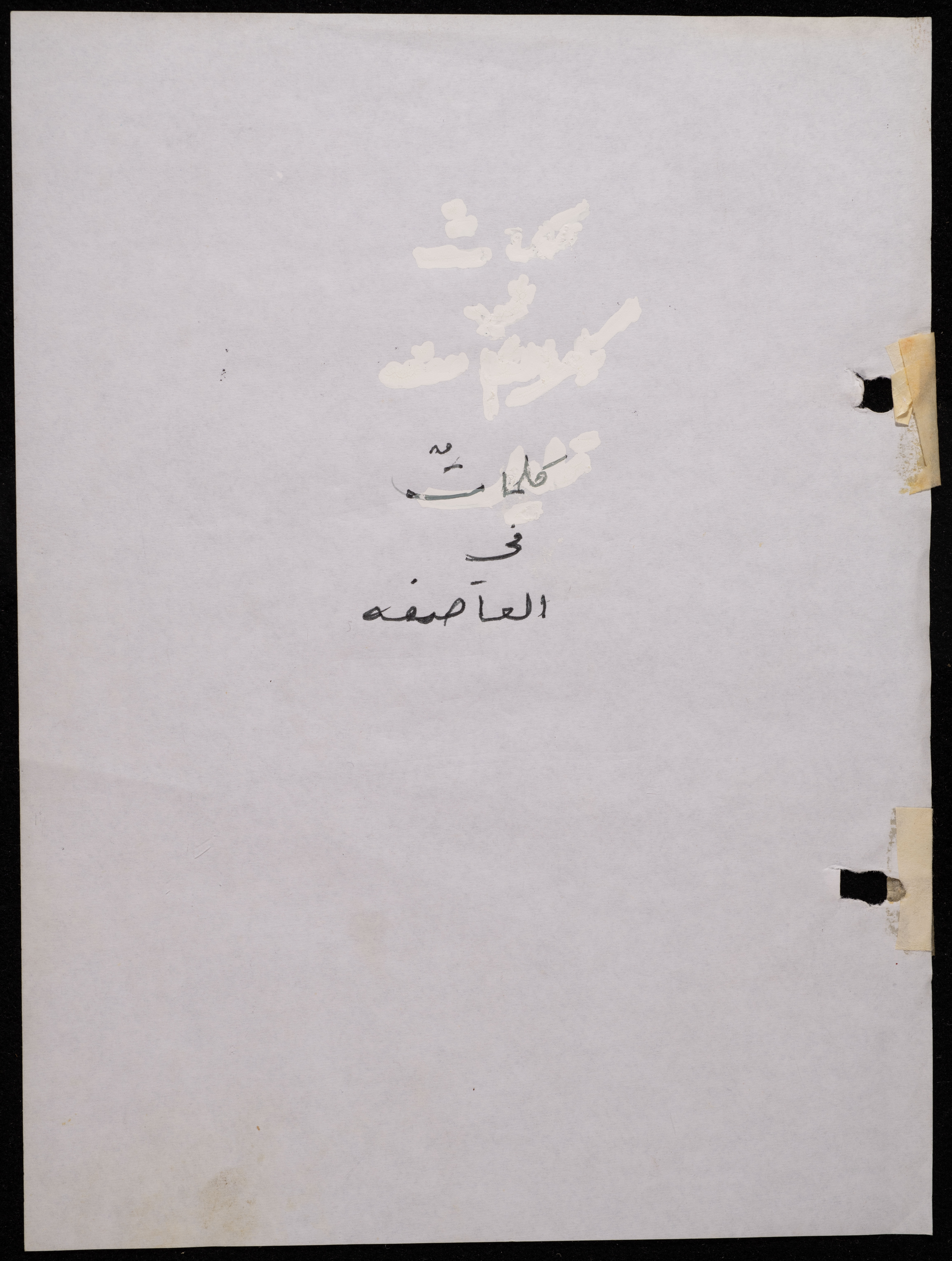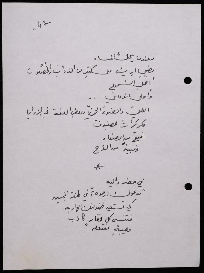 Handwritten, this 188-page archival item documents a poetry collection by Shakib Jahshan titled "Yotteloon Awsematan Min Shatha (They Come as Fragrant Medals)". The first section of the collection is titled "Kalimaton Fil-Asifa (Words In the Storm)", while the second is titled "Ihmeni Ya Abi (Protect Me, Father)".
