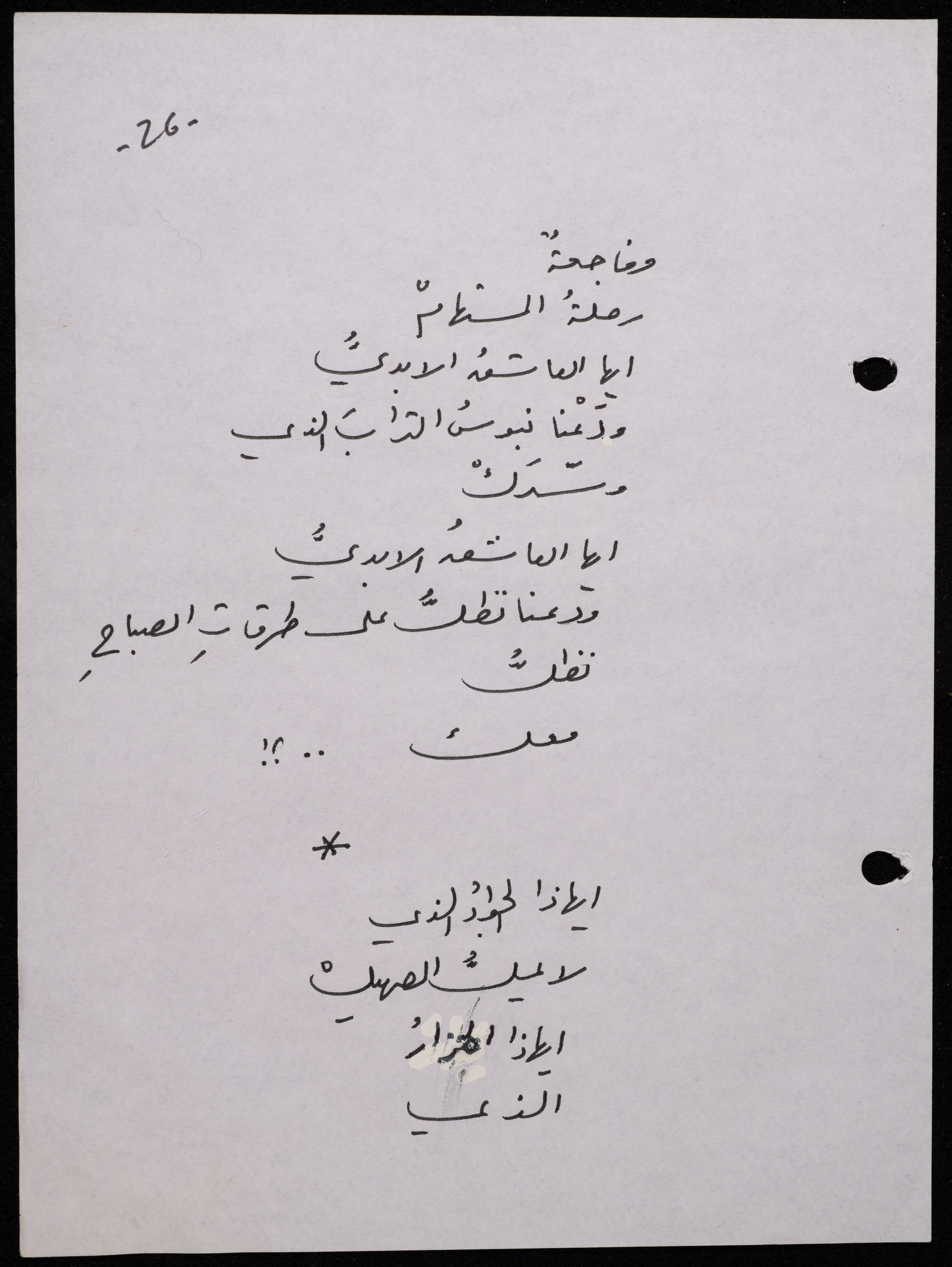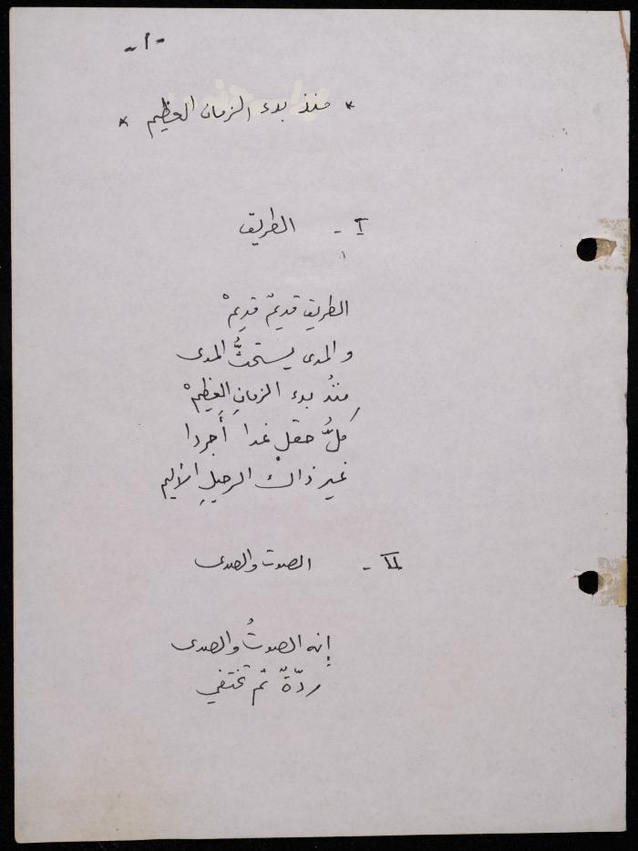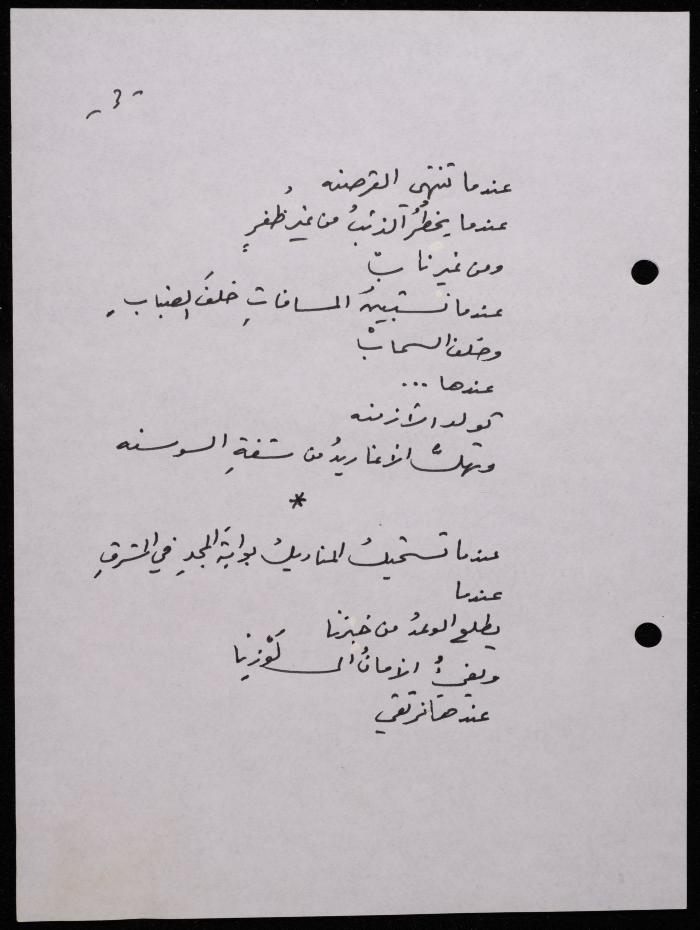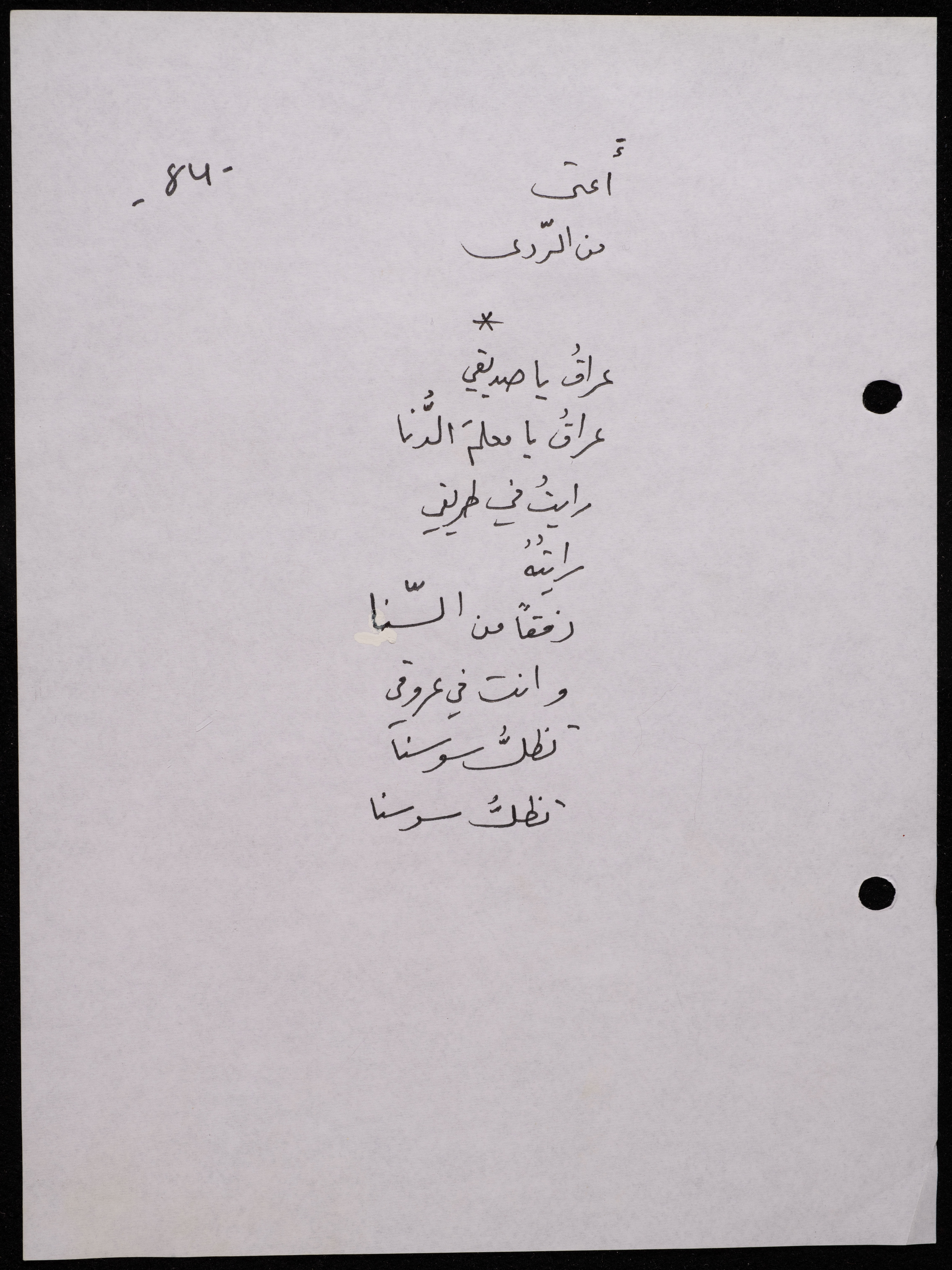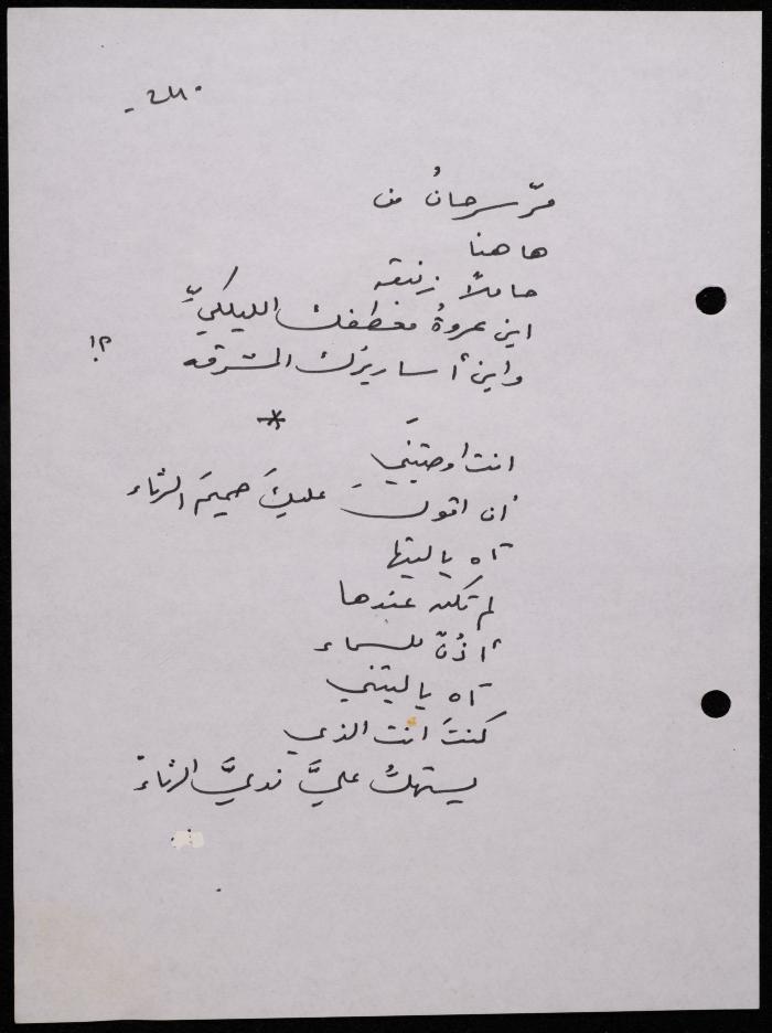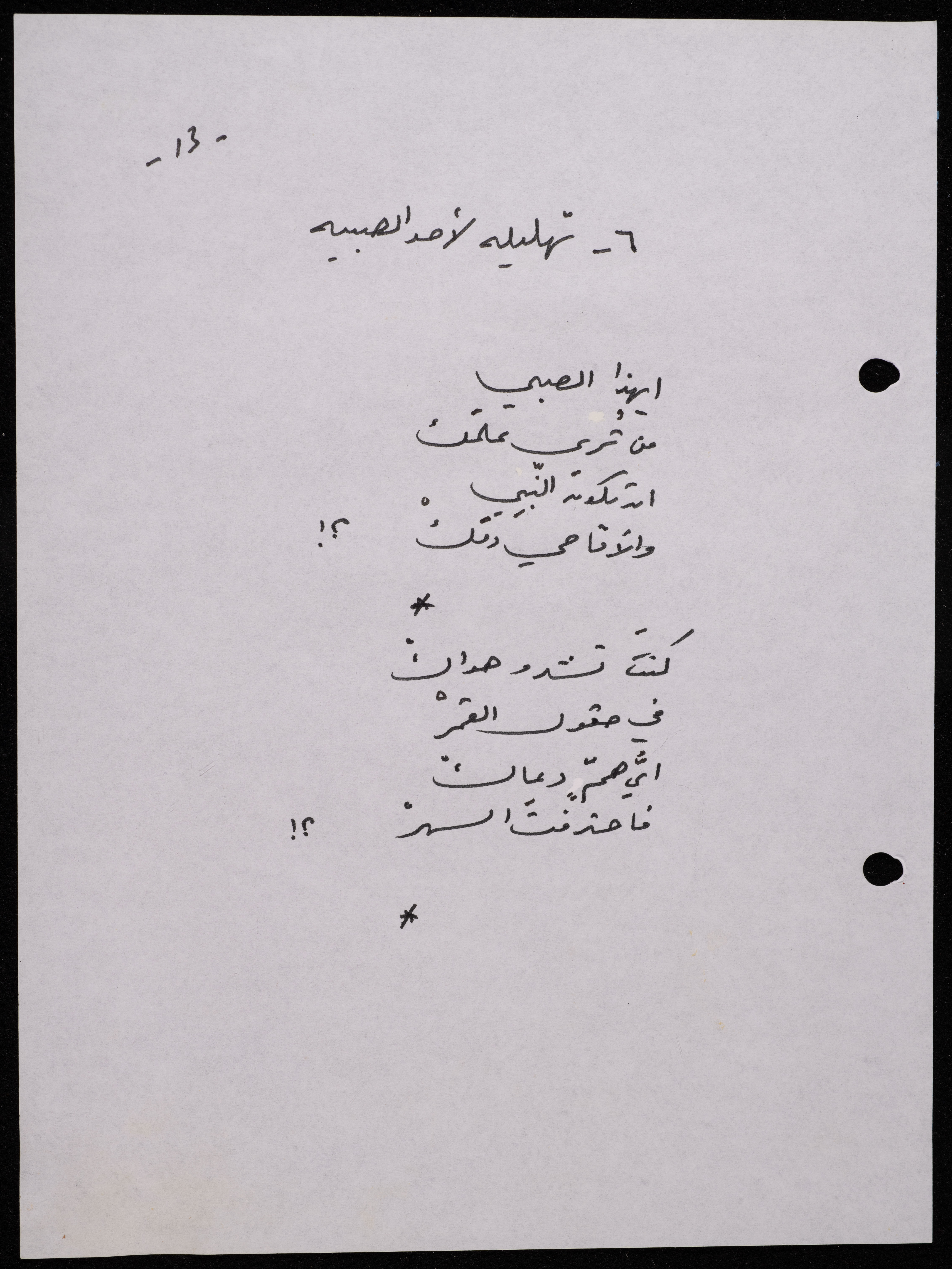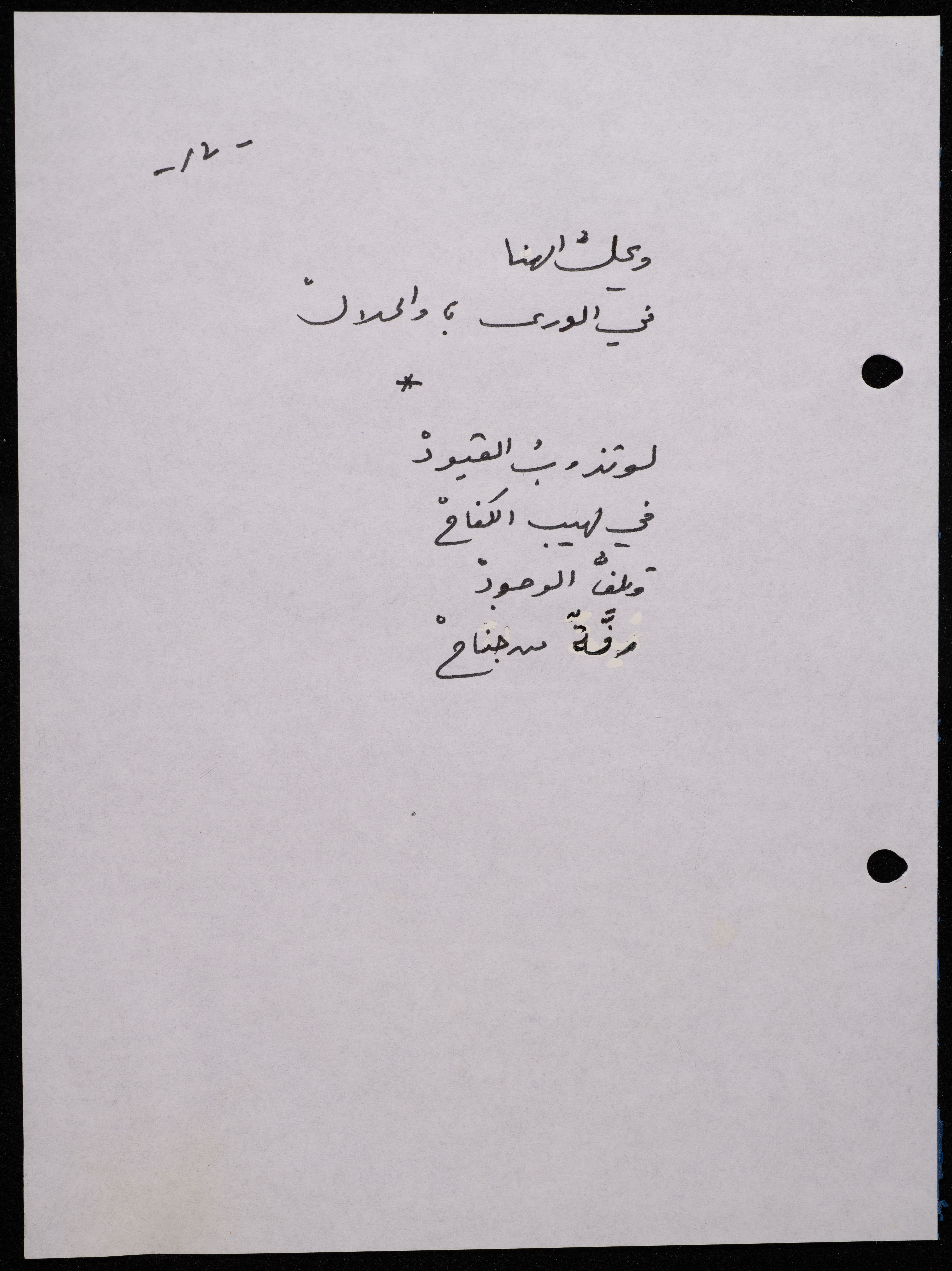 Handwritten, this 188-page archival item documents a poetry collection by Shakib Jahshan titled "Yotteloon Awsematan Min Shatha (They Come as Fragrant Medals)". The first section of the collection is titled "Kalimaton Fil-Asifa (Words In the Storm)", while the second is titled "Ihmeni Ya Abi (Protect Me, Father)".