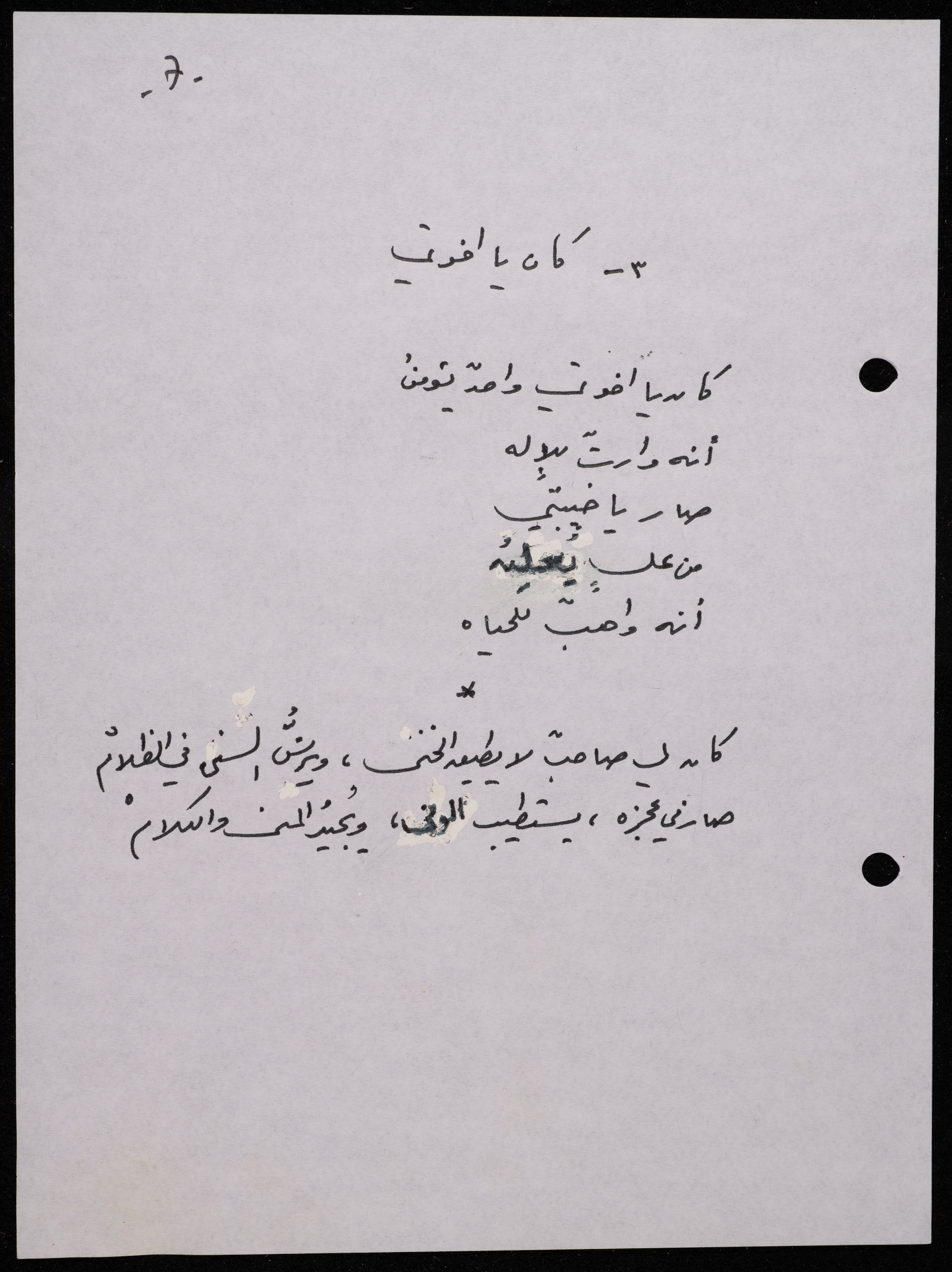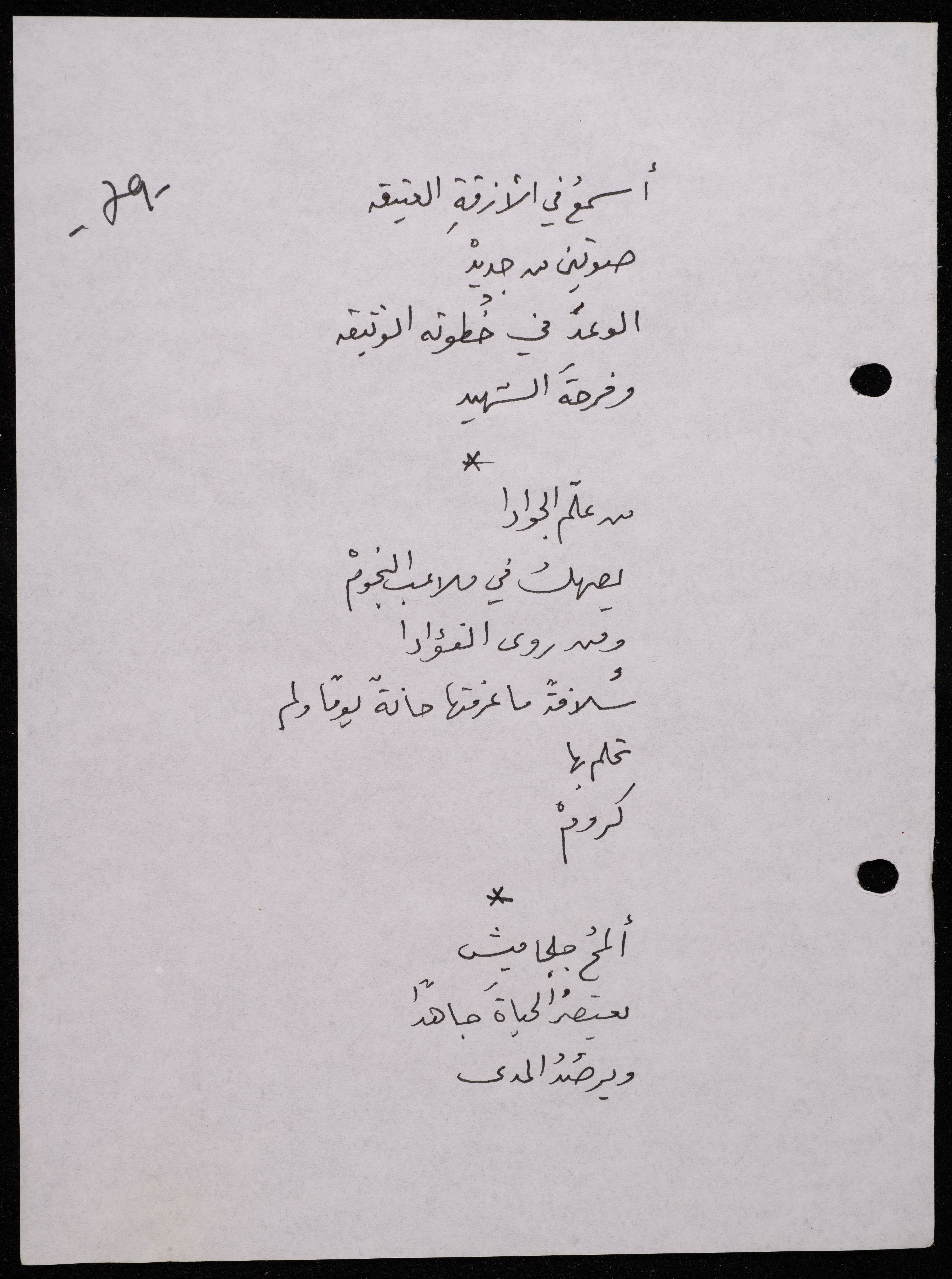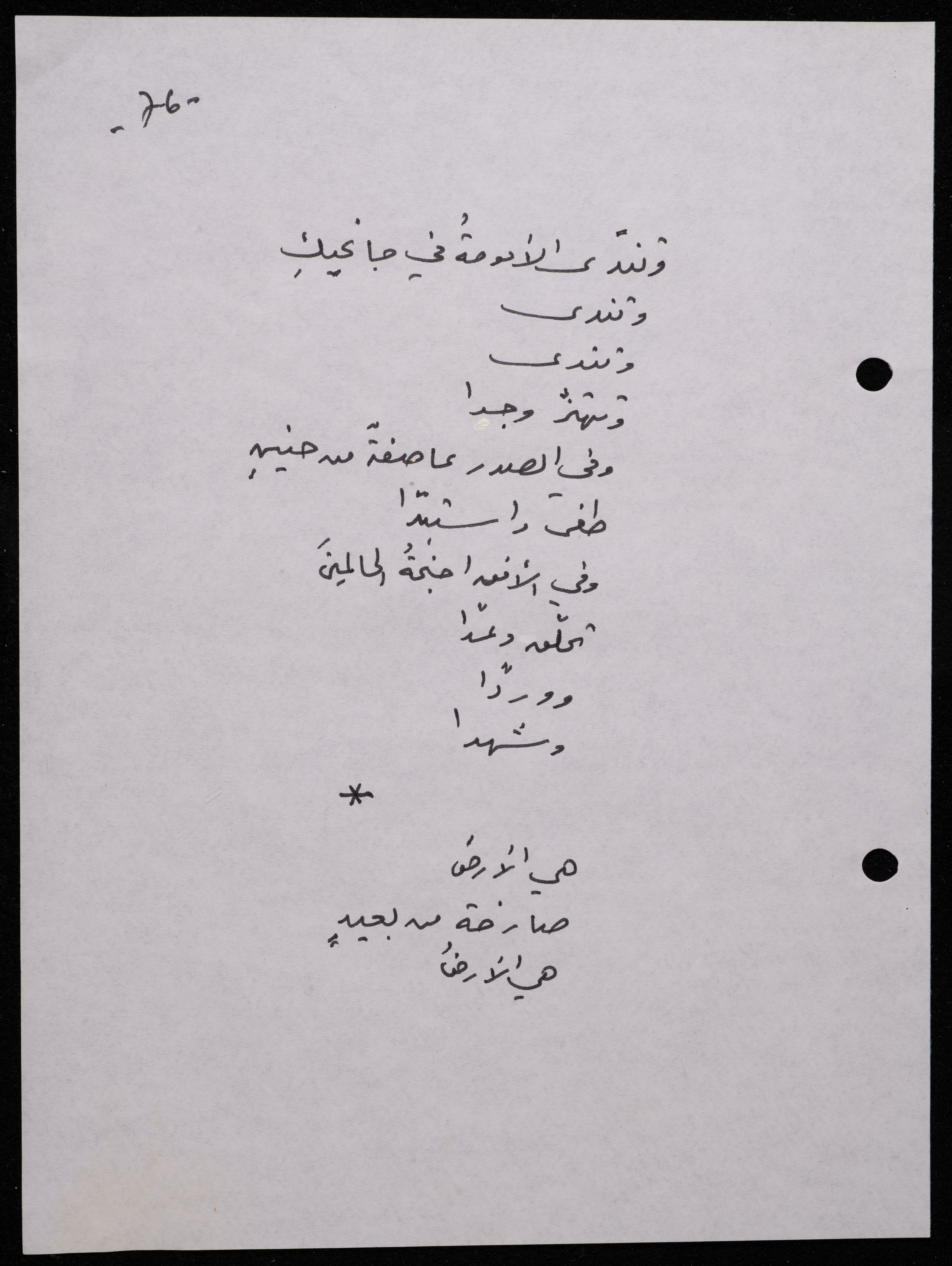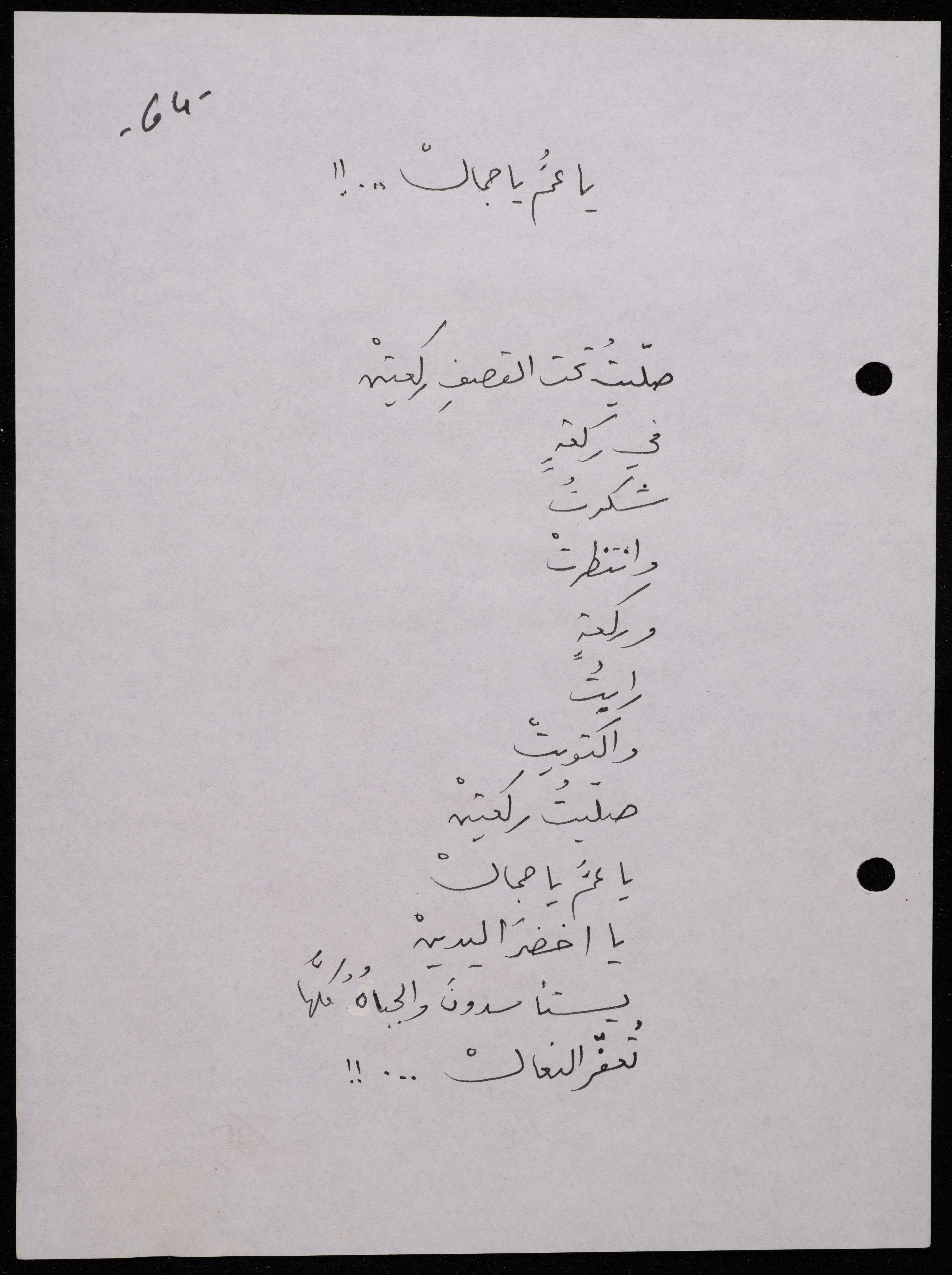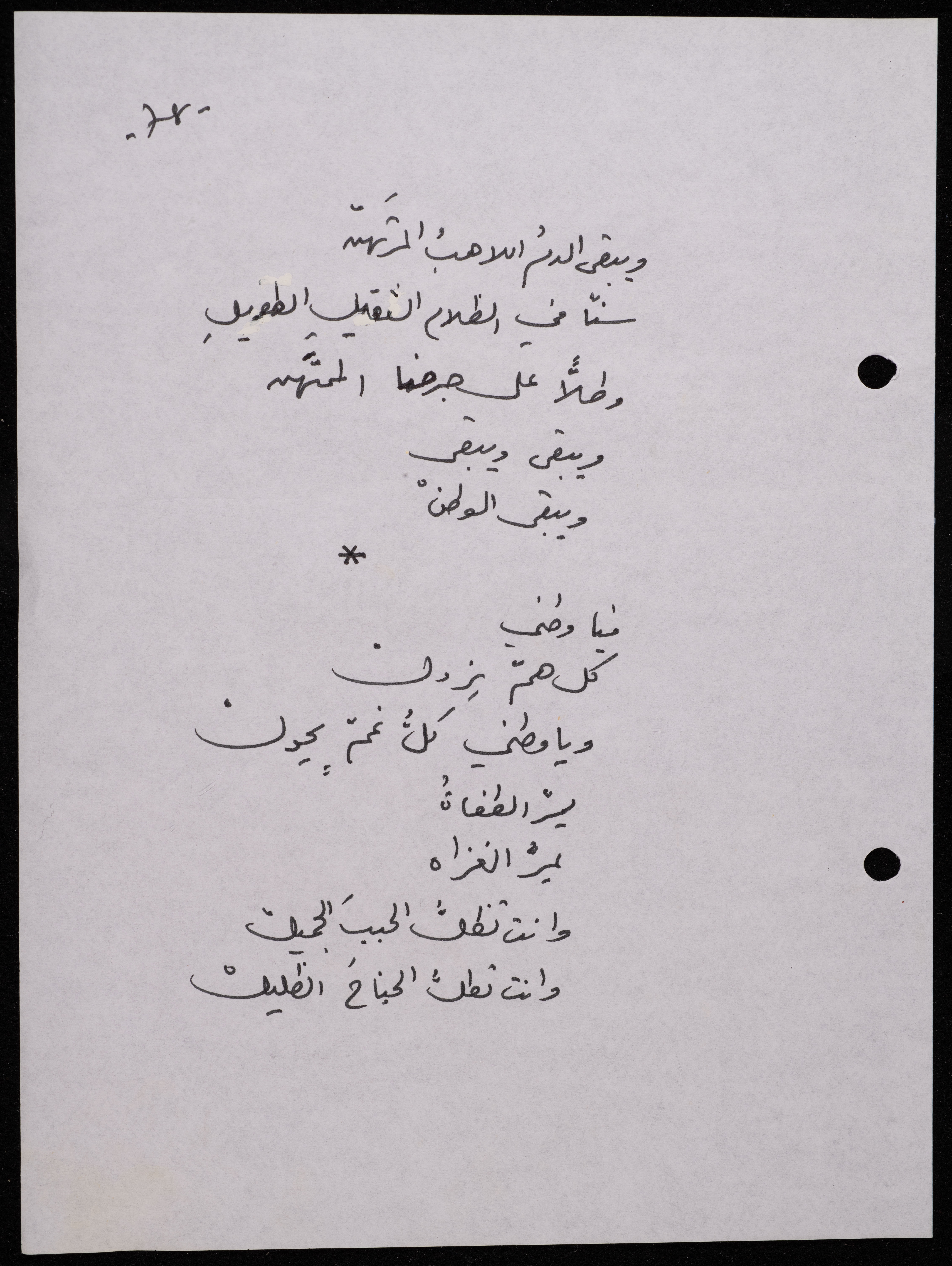 Handwritten, this 188-page archival item documents a poetry collection by Shakib Jahshan titled "Yotteloon Awsematan Min Shatha (They Come as Fragrant Medals)". The first section of the collection is titled "Kalimaton Fil-Asifa (Words In the Storm)", while the second is titled "Ihmeni Ya Abi (Protect Me, Father)".