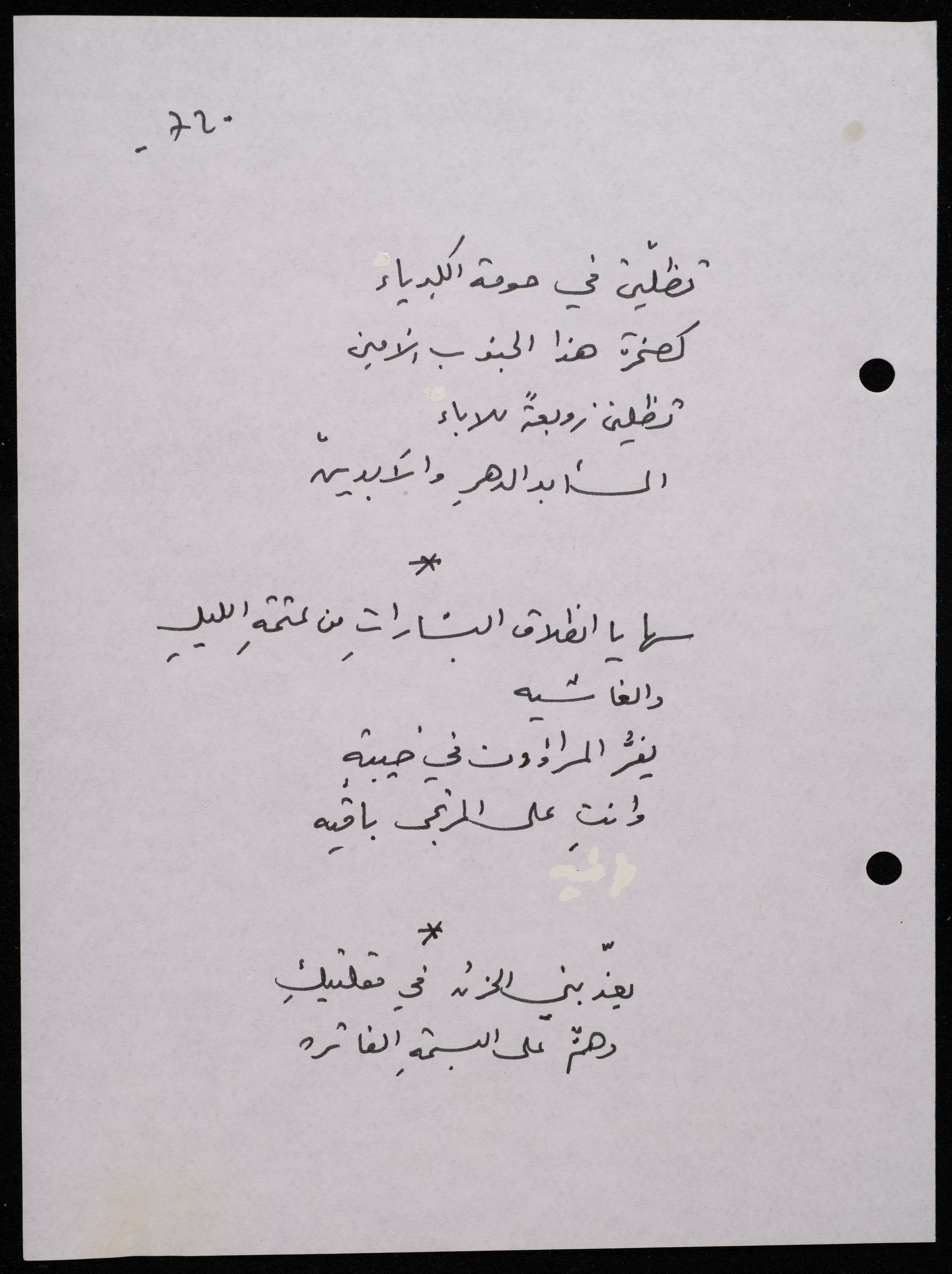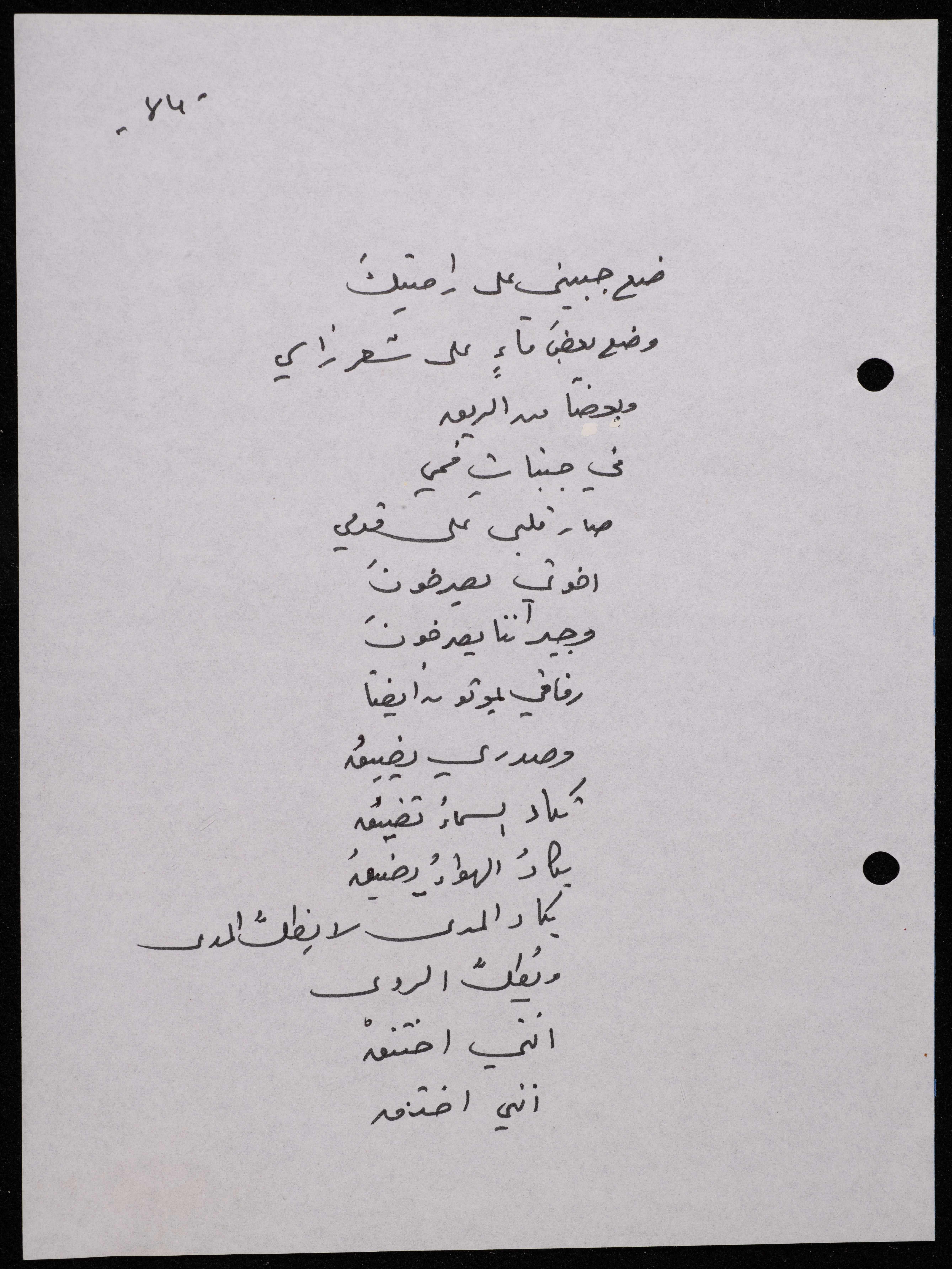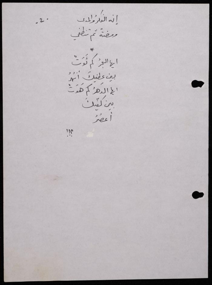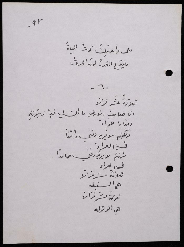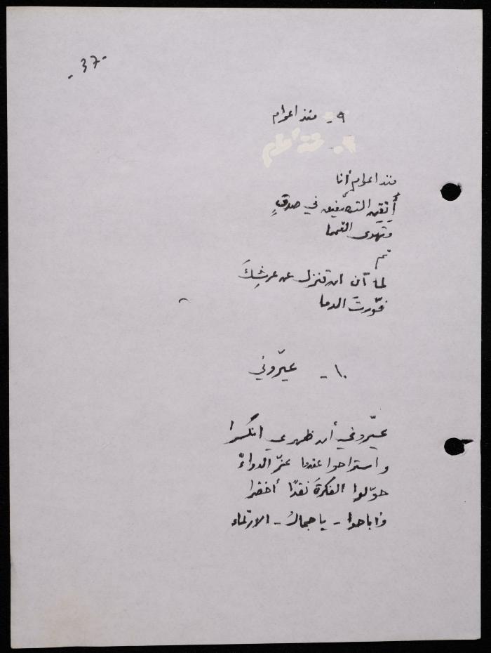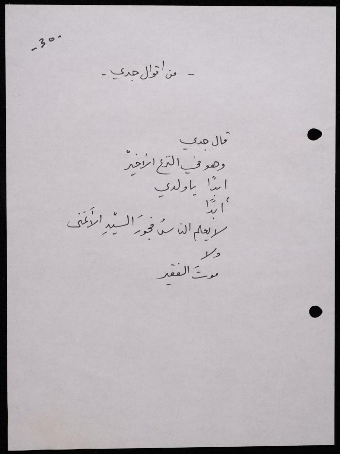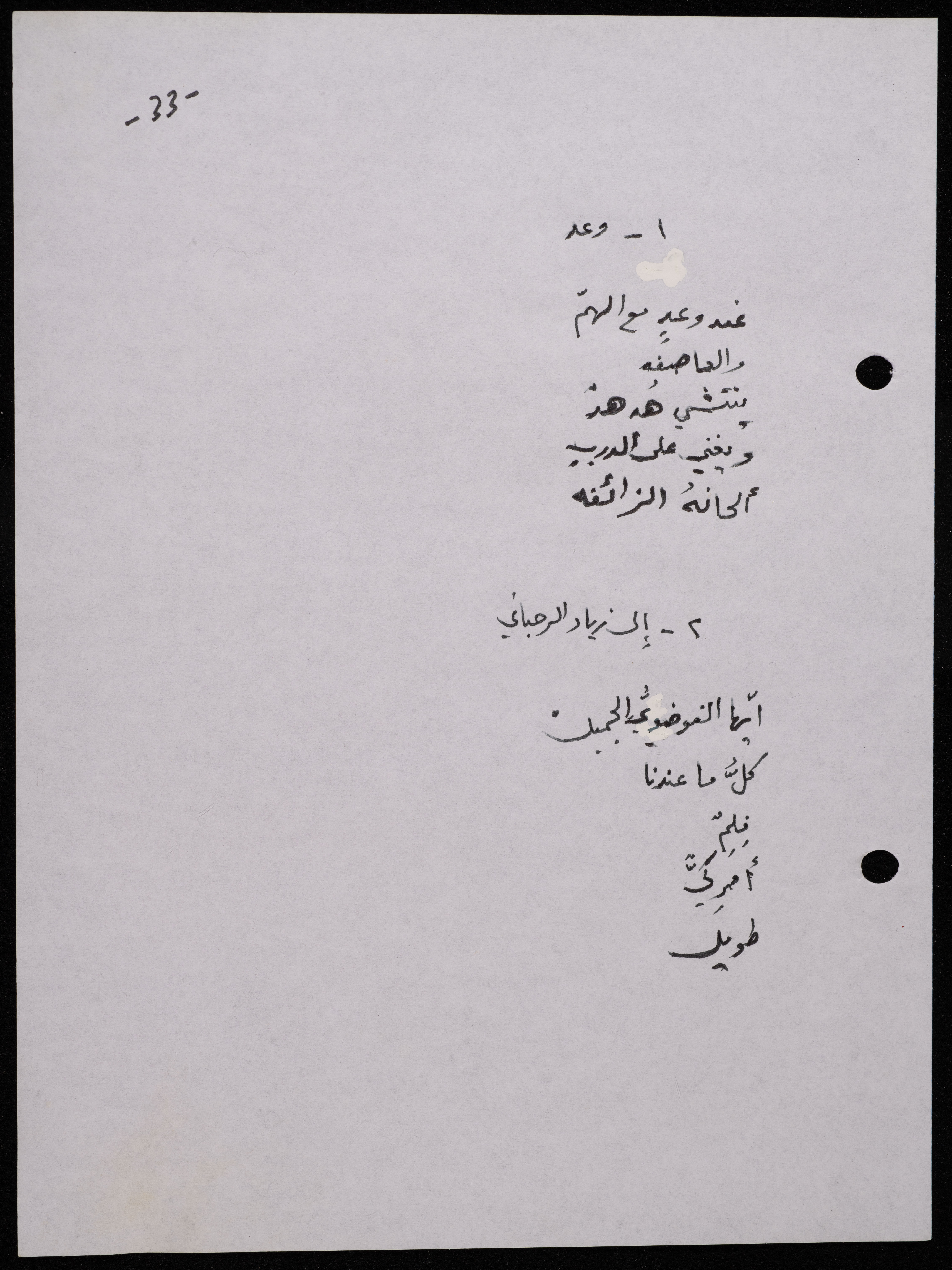 Handwritten, this 188-page archival item documents a poetry collection by Shakib Jahshan titled "Yotteloon Awsematan Min Shatha (They Come as Fragrant Medals)". The first section of the collection is titled "Kalimaton Fil-Asifa (Words In the Storm)", while the second is titled "Ihmeni Ya Abi (Protect Me, Father)".