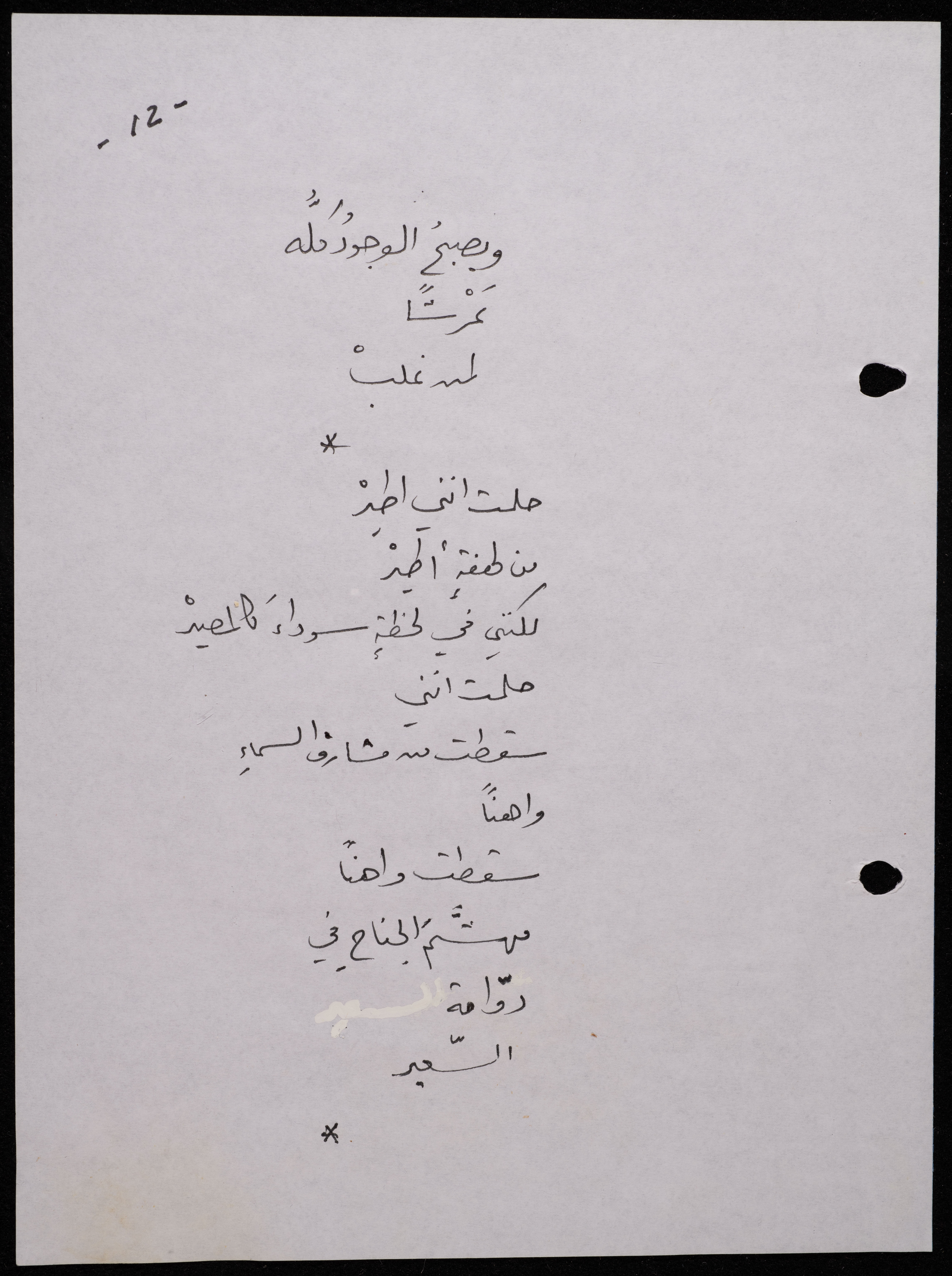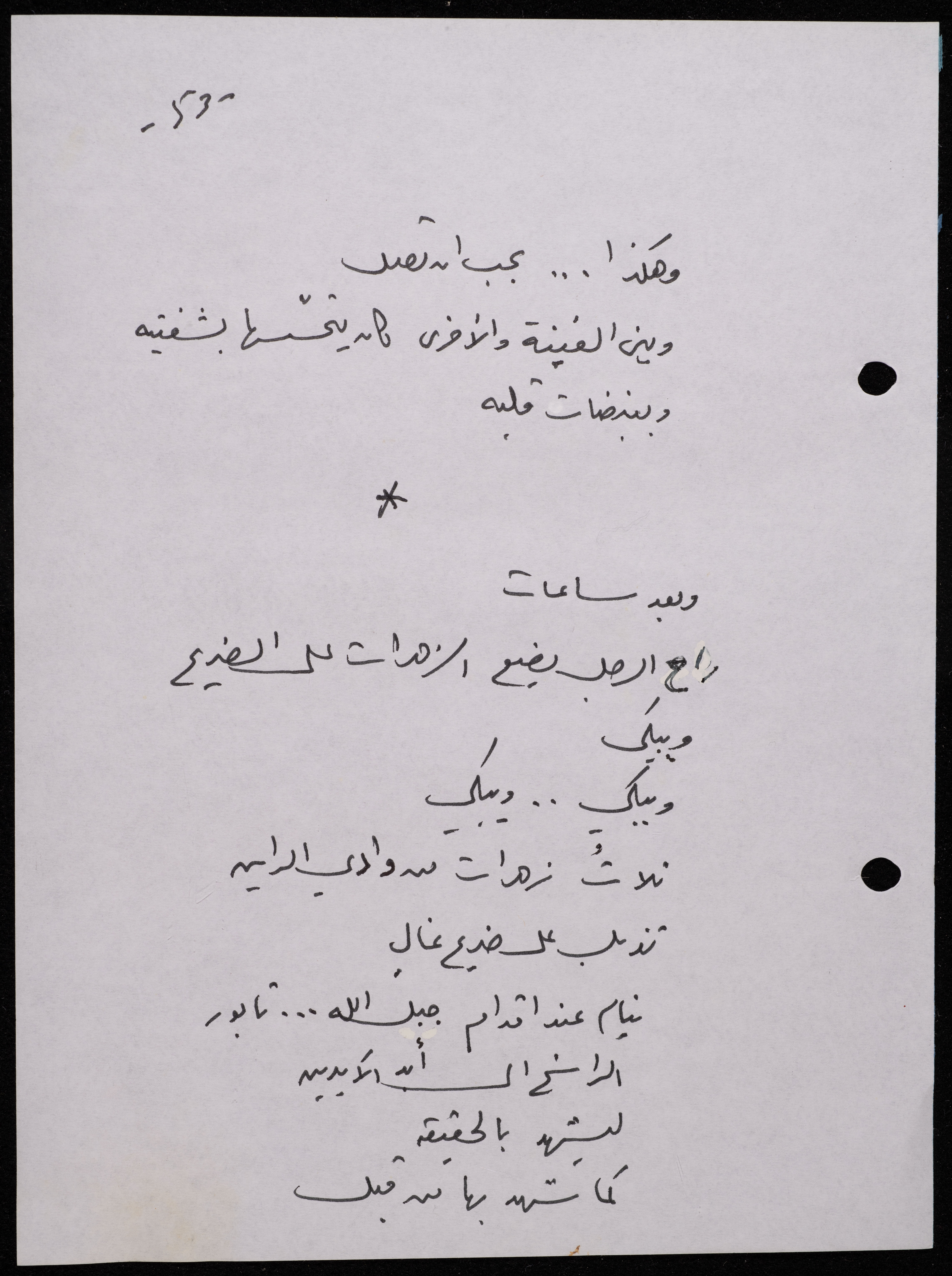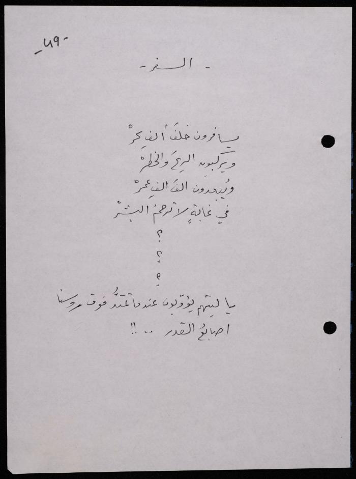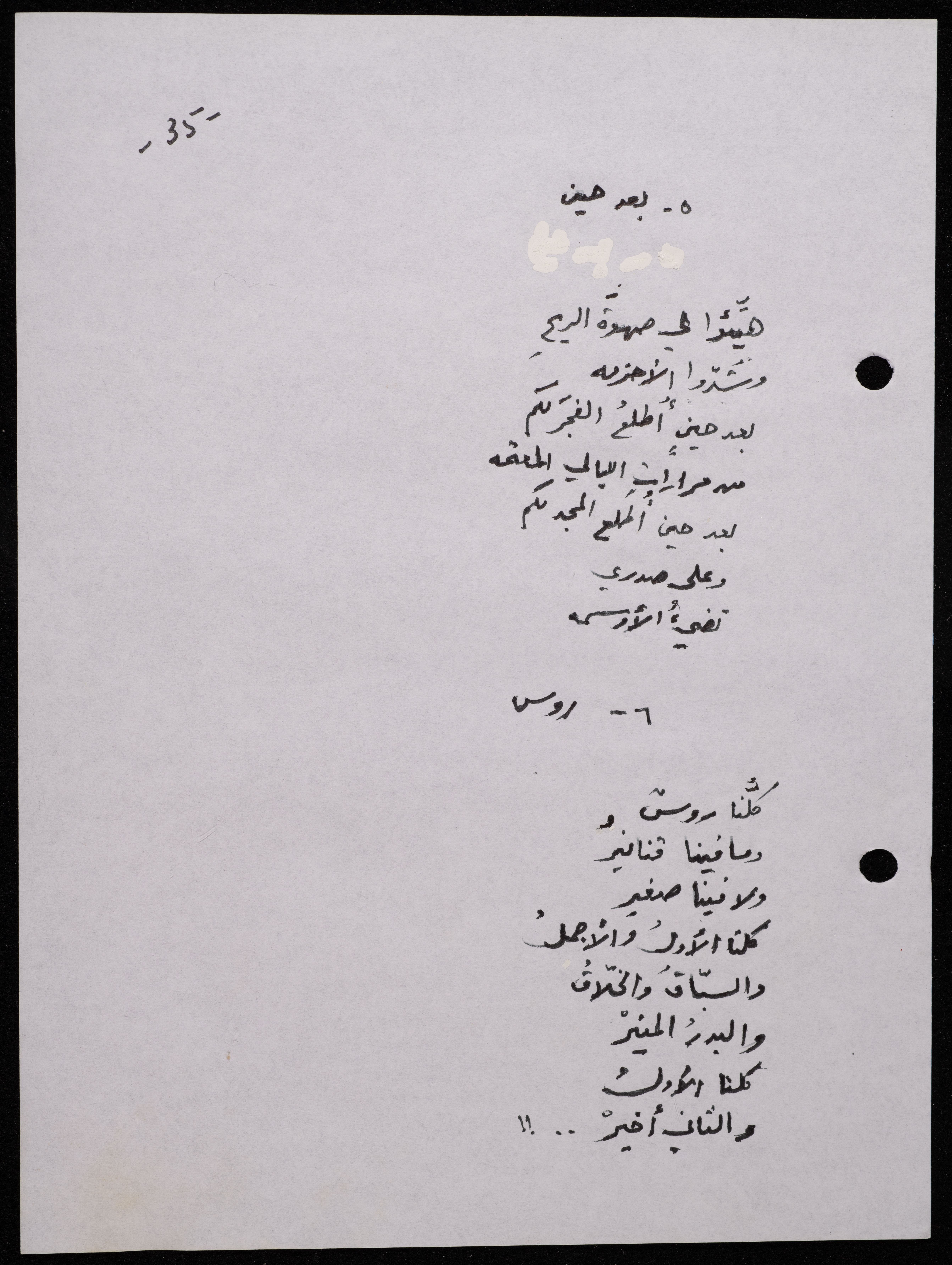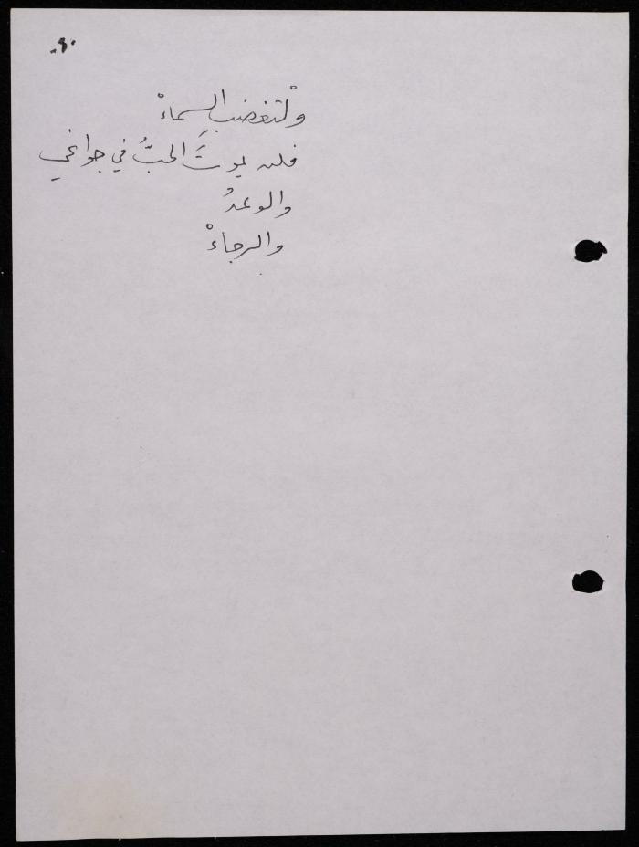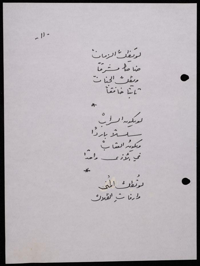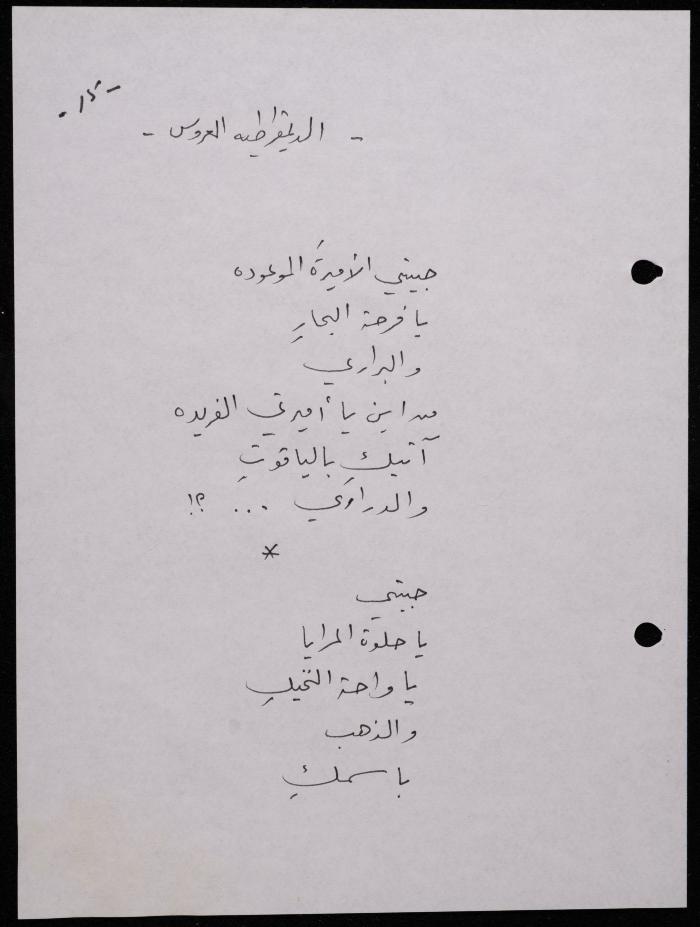 Handwritten, this 188-page archival item documents a poetry collection by Shakib Jahshan titled "Yotteloon Awsematan Min Shatha (They Come as Fragrant Medals)". The first section of the collection is titled "Kalimaton Fil-Asifa (Words In the Storm)", while the second is titled "Ihmeni Ya Abi (Protect Me, Father)".
