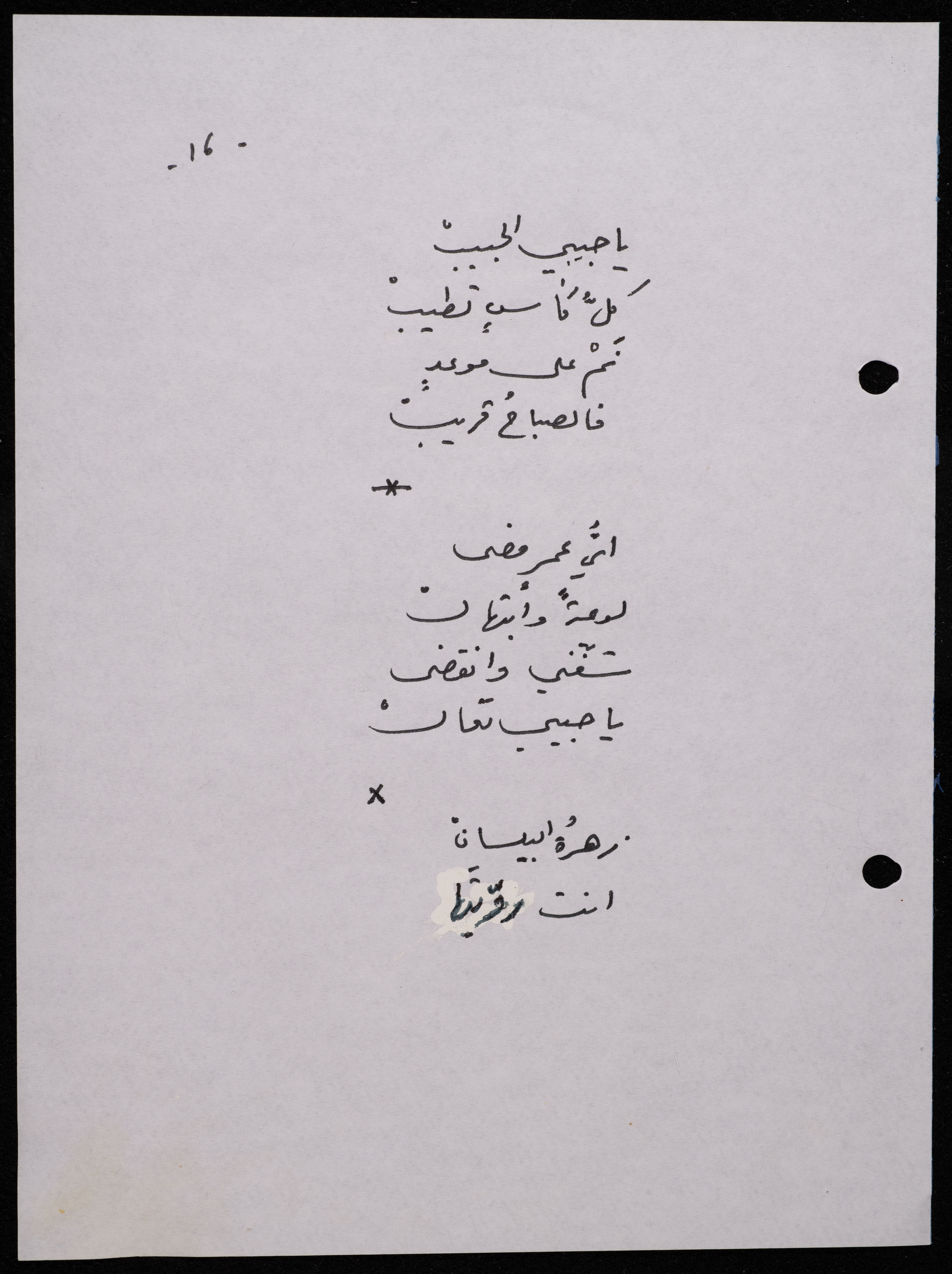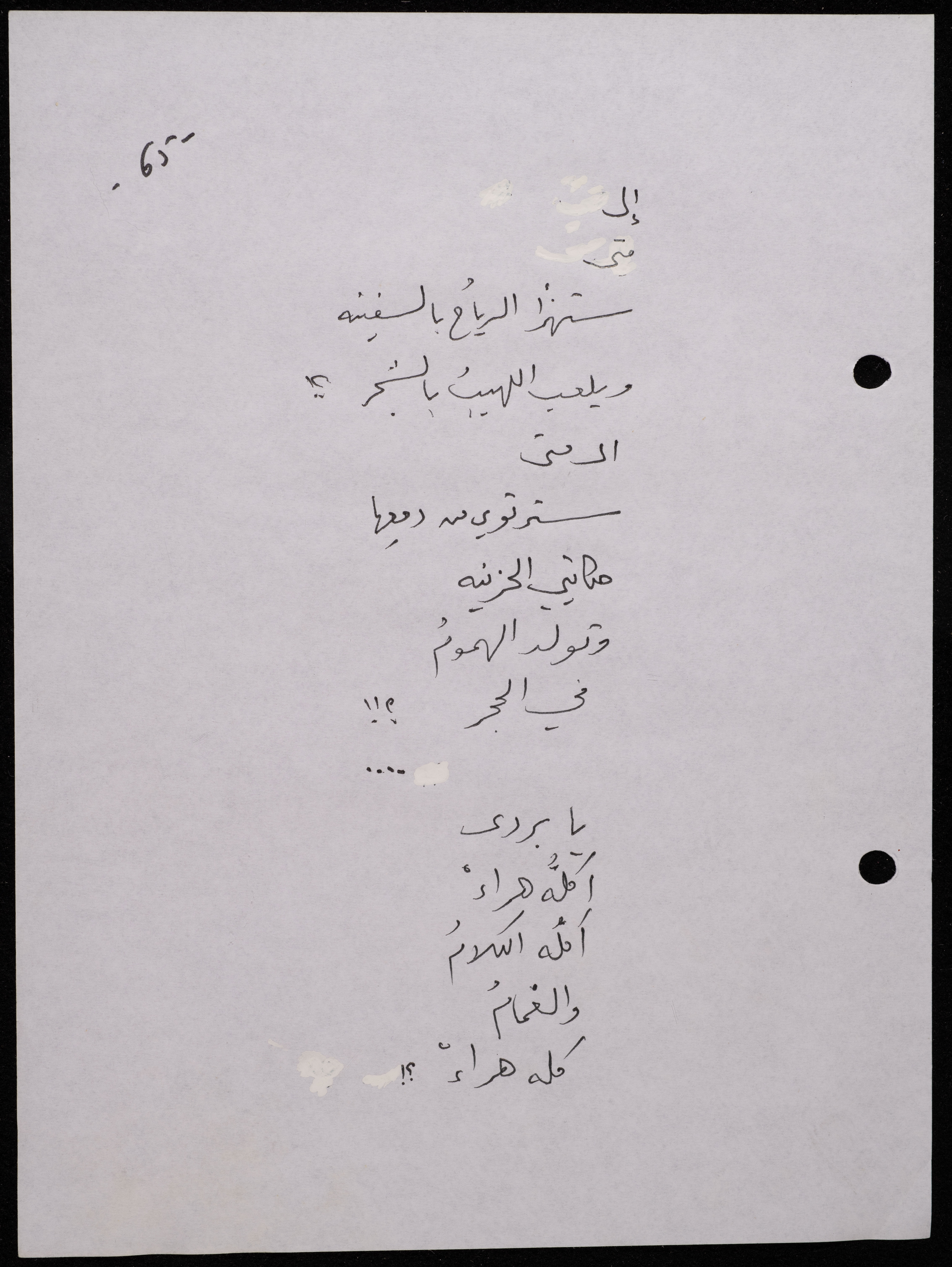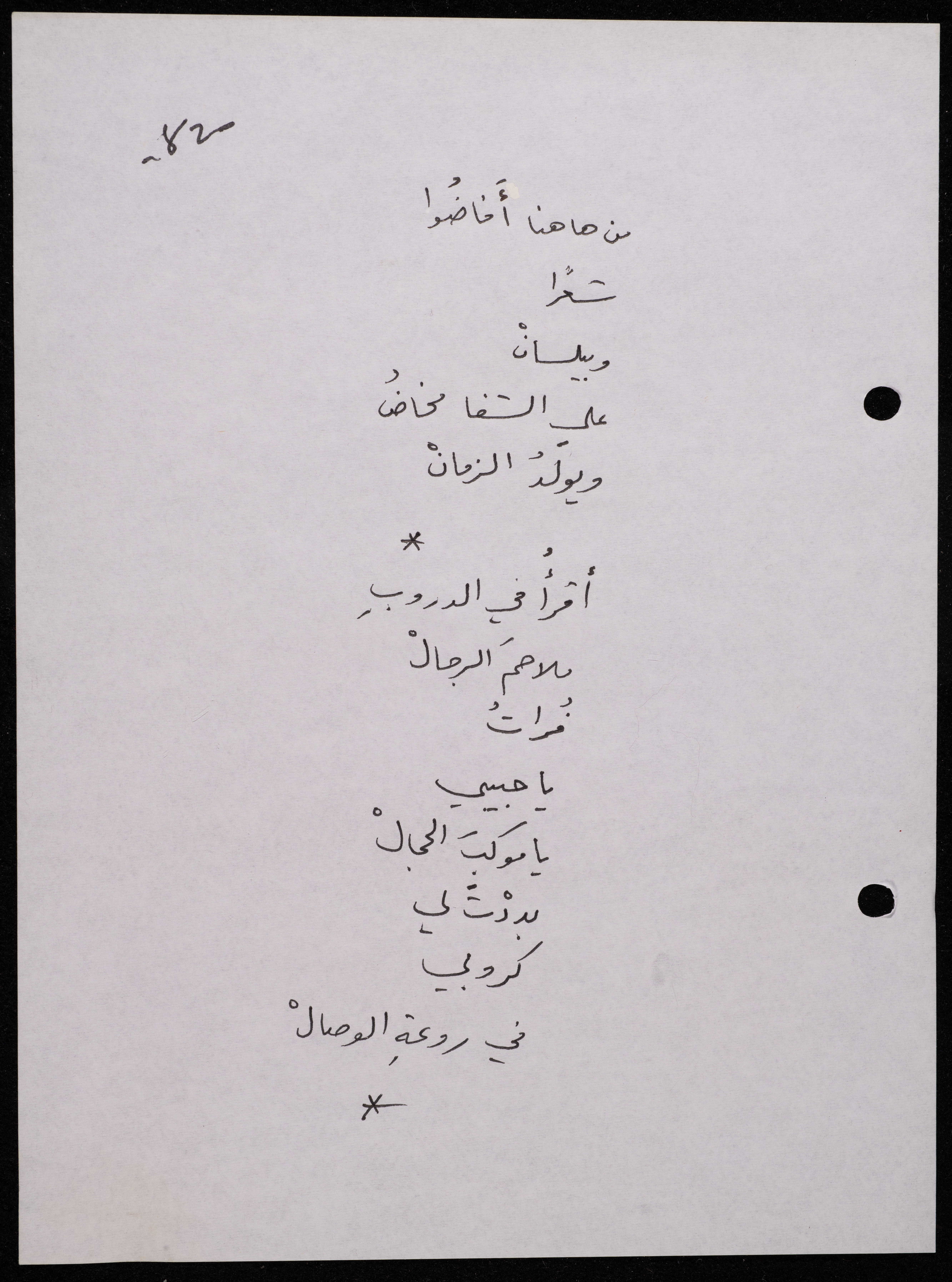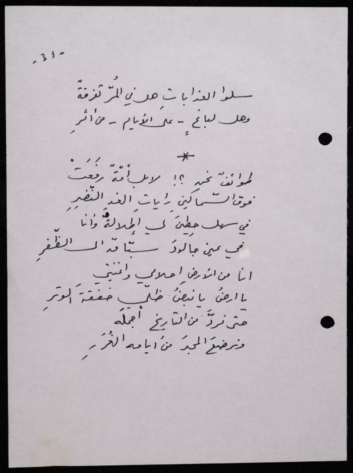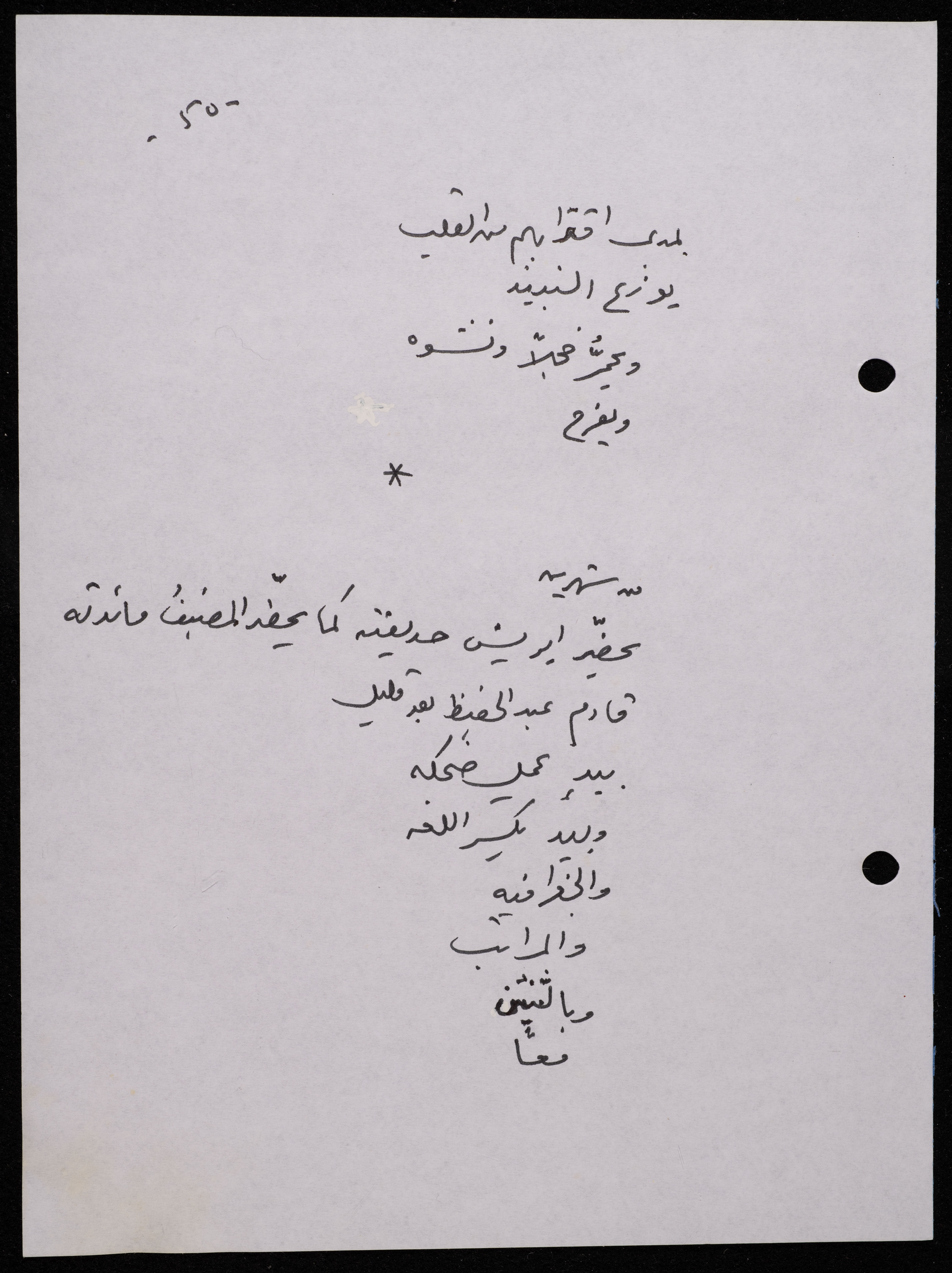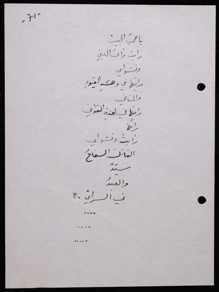 Handwritten, this 188-page archival item documents a poetry collection by Shakib Jahshan titled "Yotteloon Awsematan Min Shatha (They Come as Fragrant Medals)". The first section of the collection is titled "Kalimaton Fil-Asifa (Words In the Storm)", while the second is titled "Ihmeni Ya Abi (Protect Me, Father)".