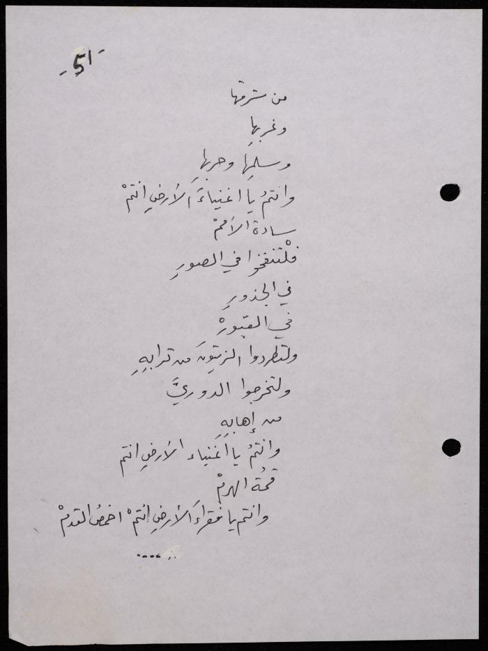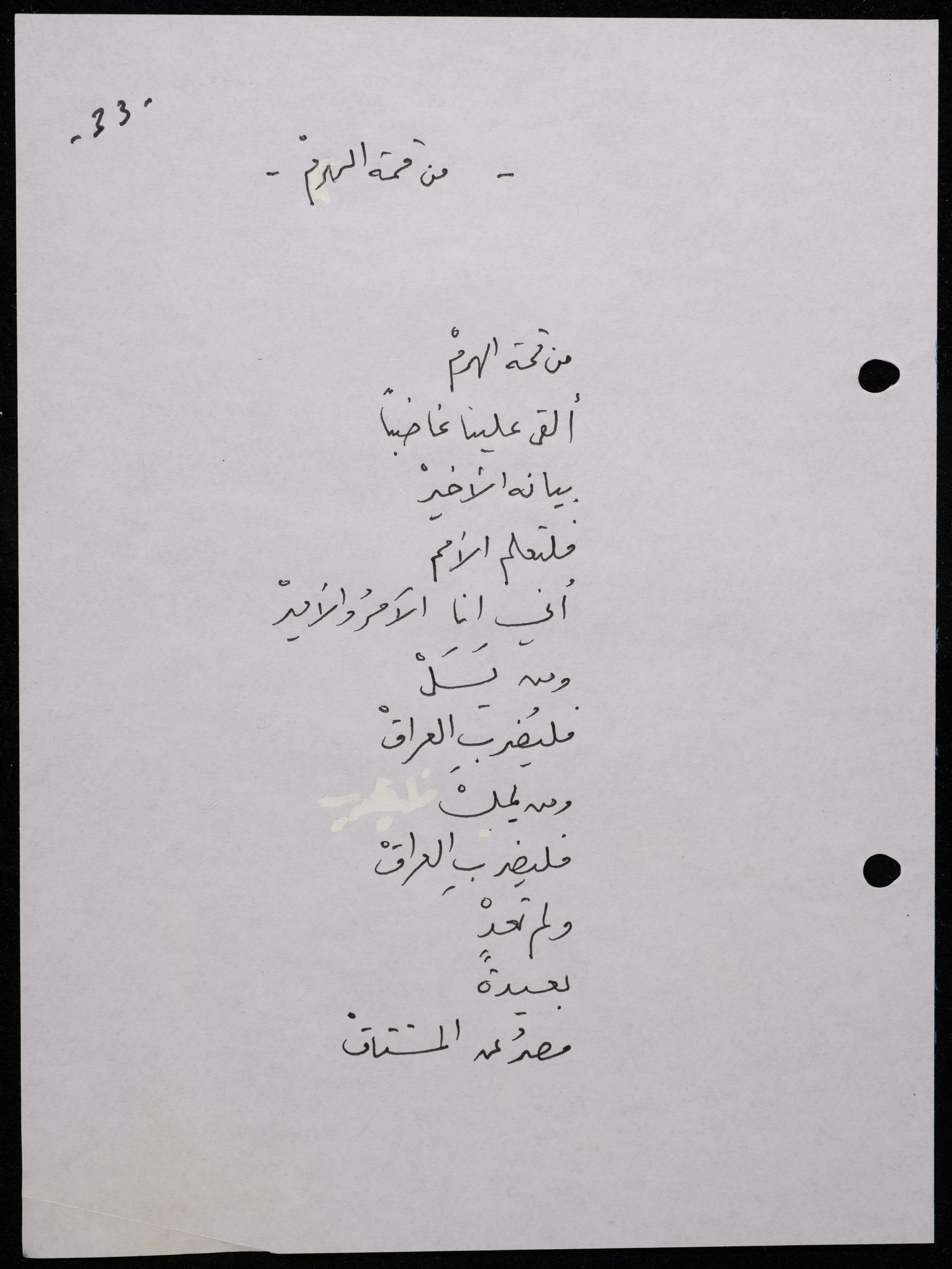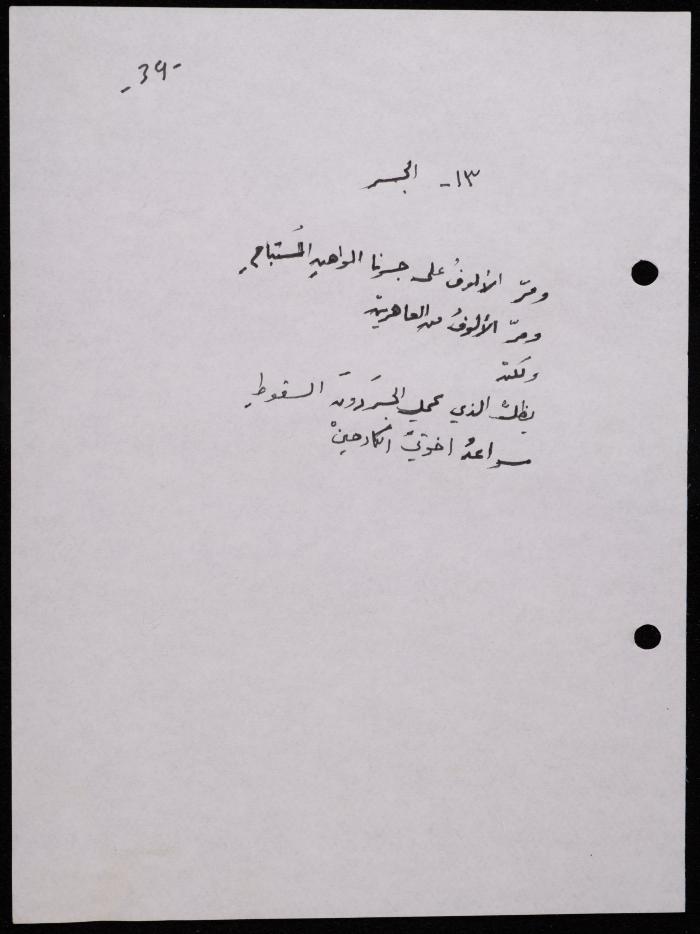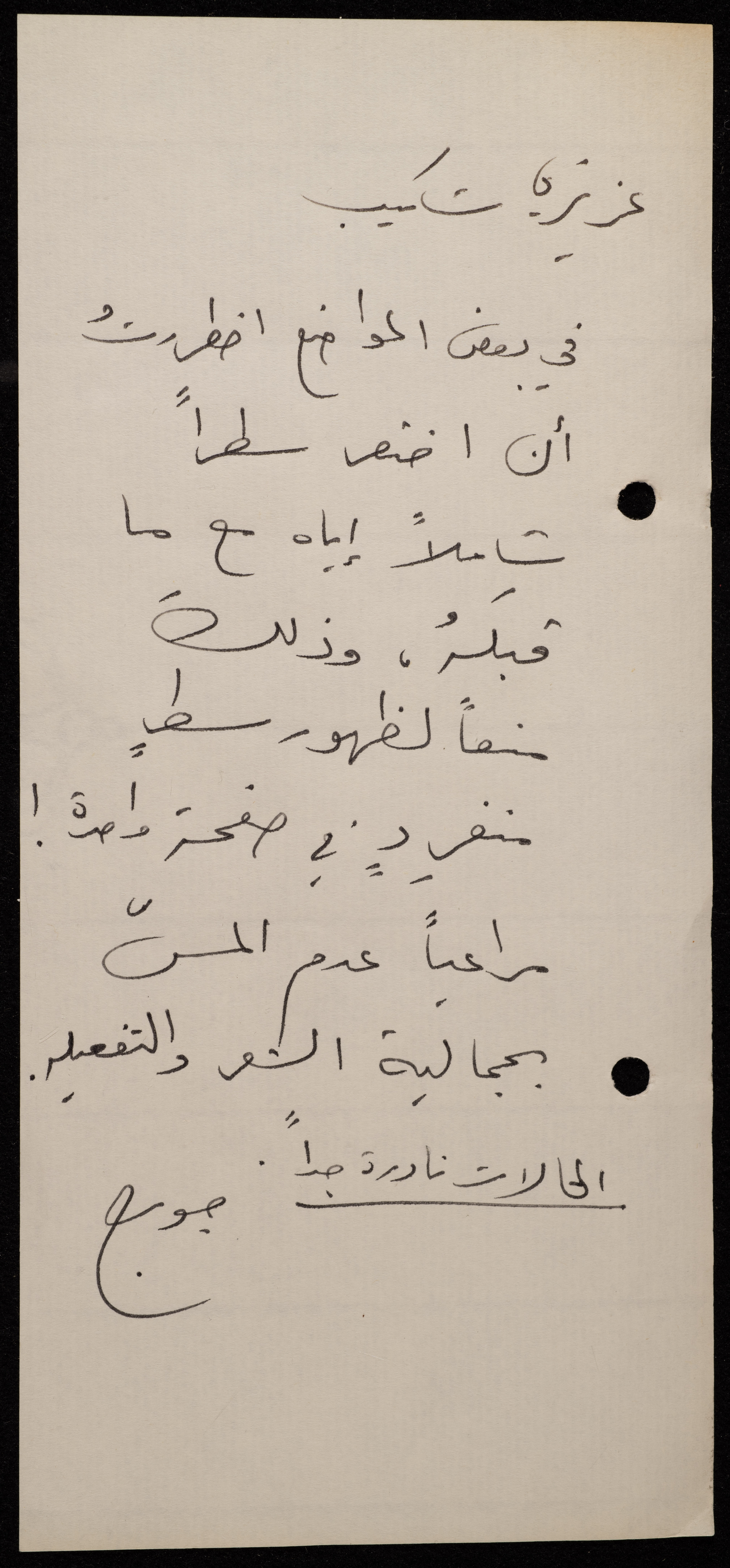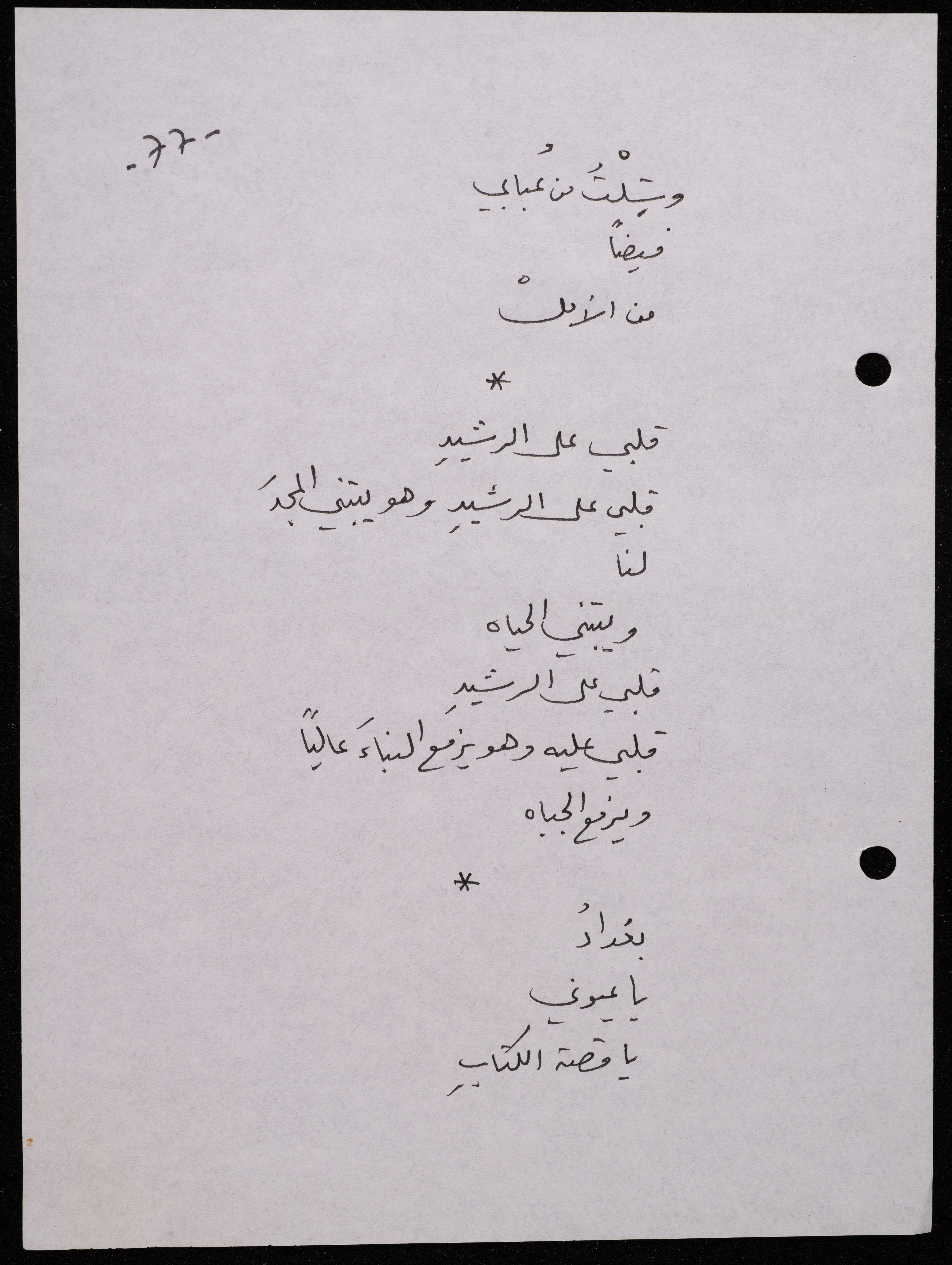 Handwritten, this 188-page archival item documents a poetry collection by Shakib Jahshan titled "Yotteloon Awsematan Min Shatha (They Come as Fragrant Medals)". The first section of the collection is titled "Kalimaton Fil-Asifa (Words In the Storm)", while the second is titled "Ihmeni Ya Abi (Protect Me, Father)".