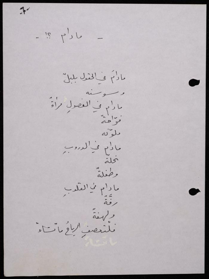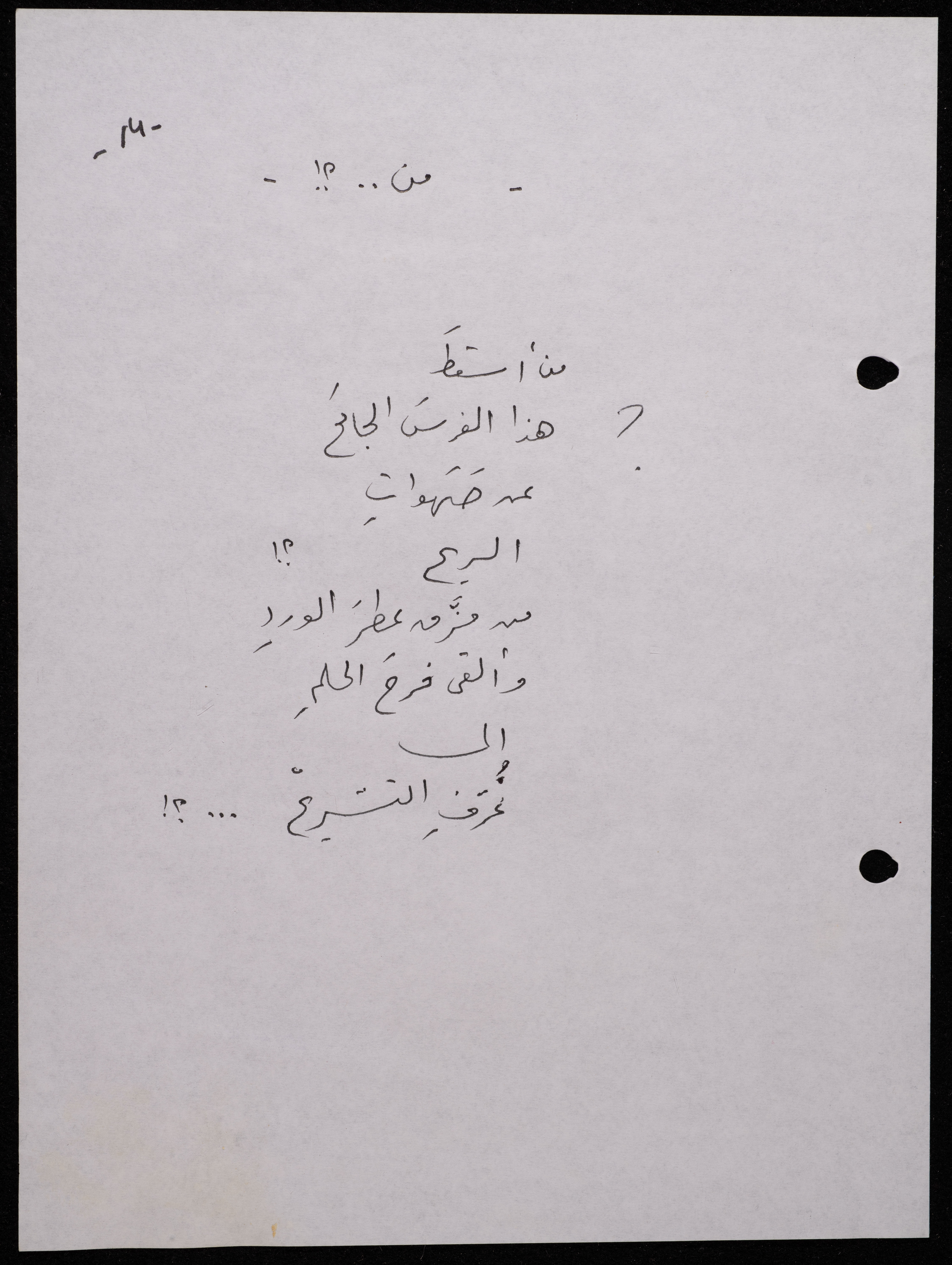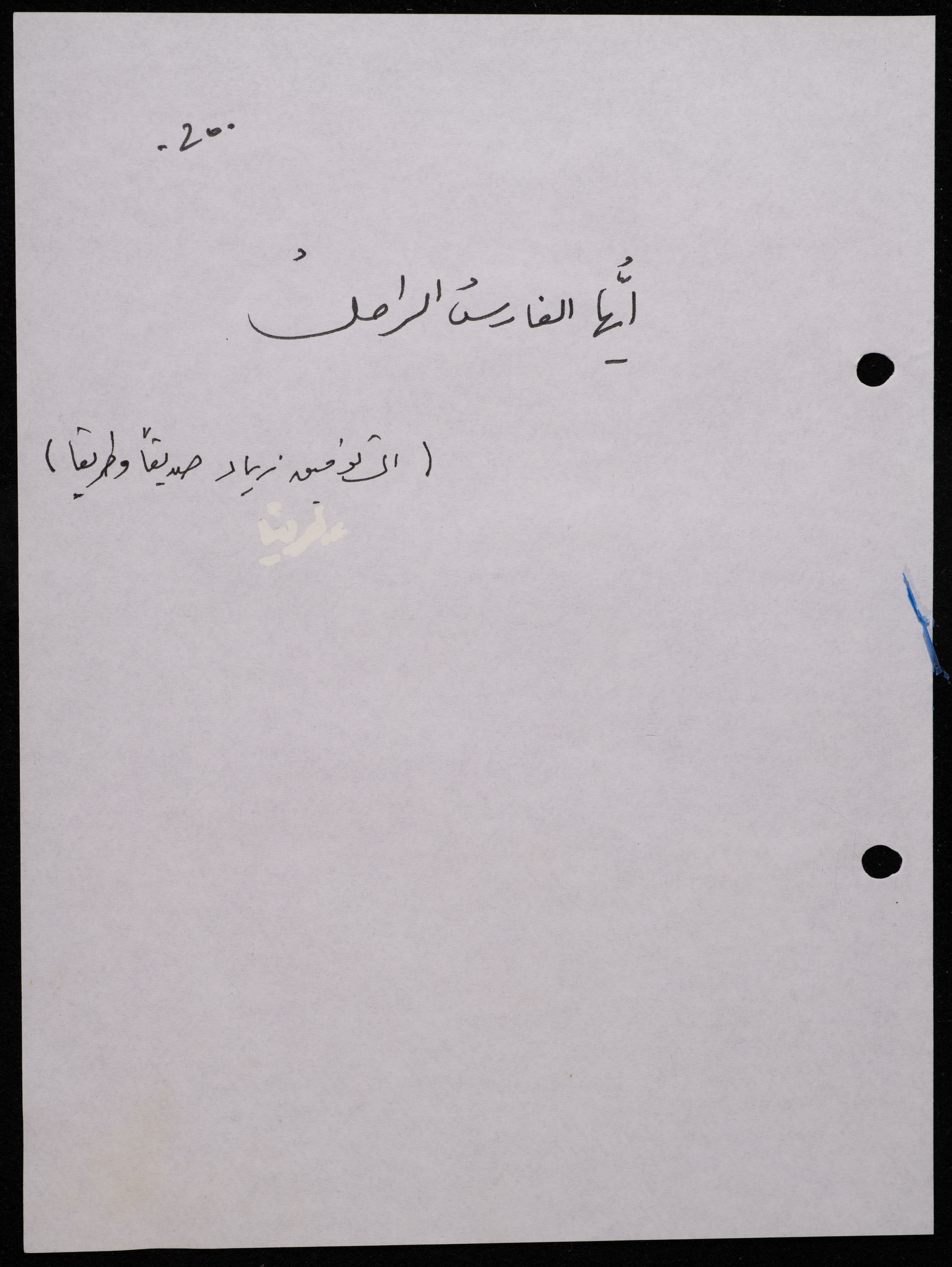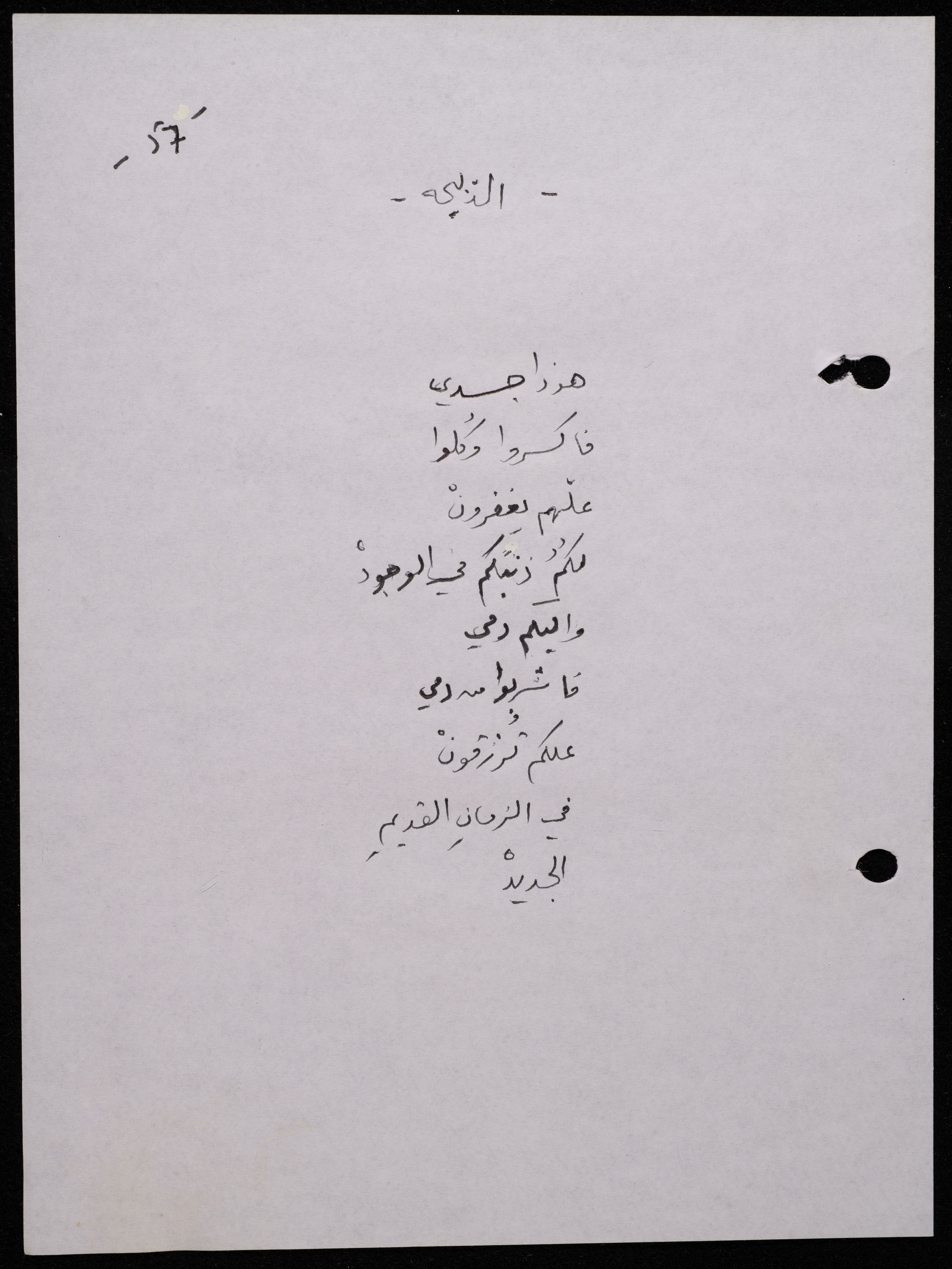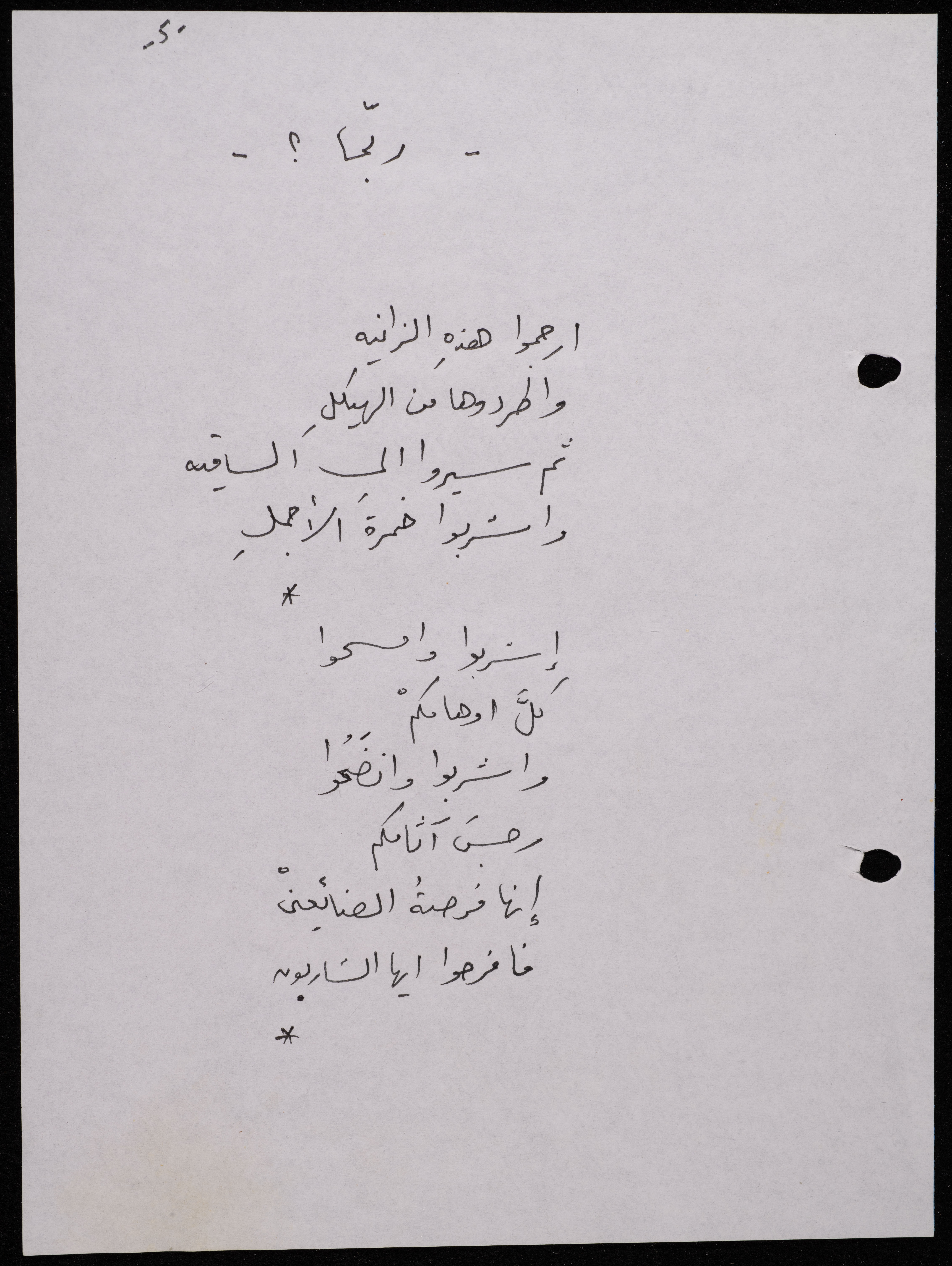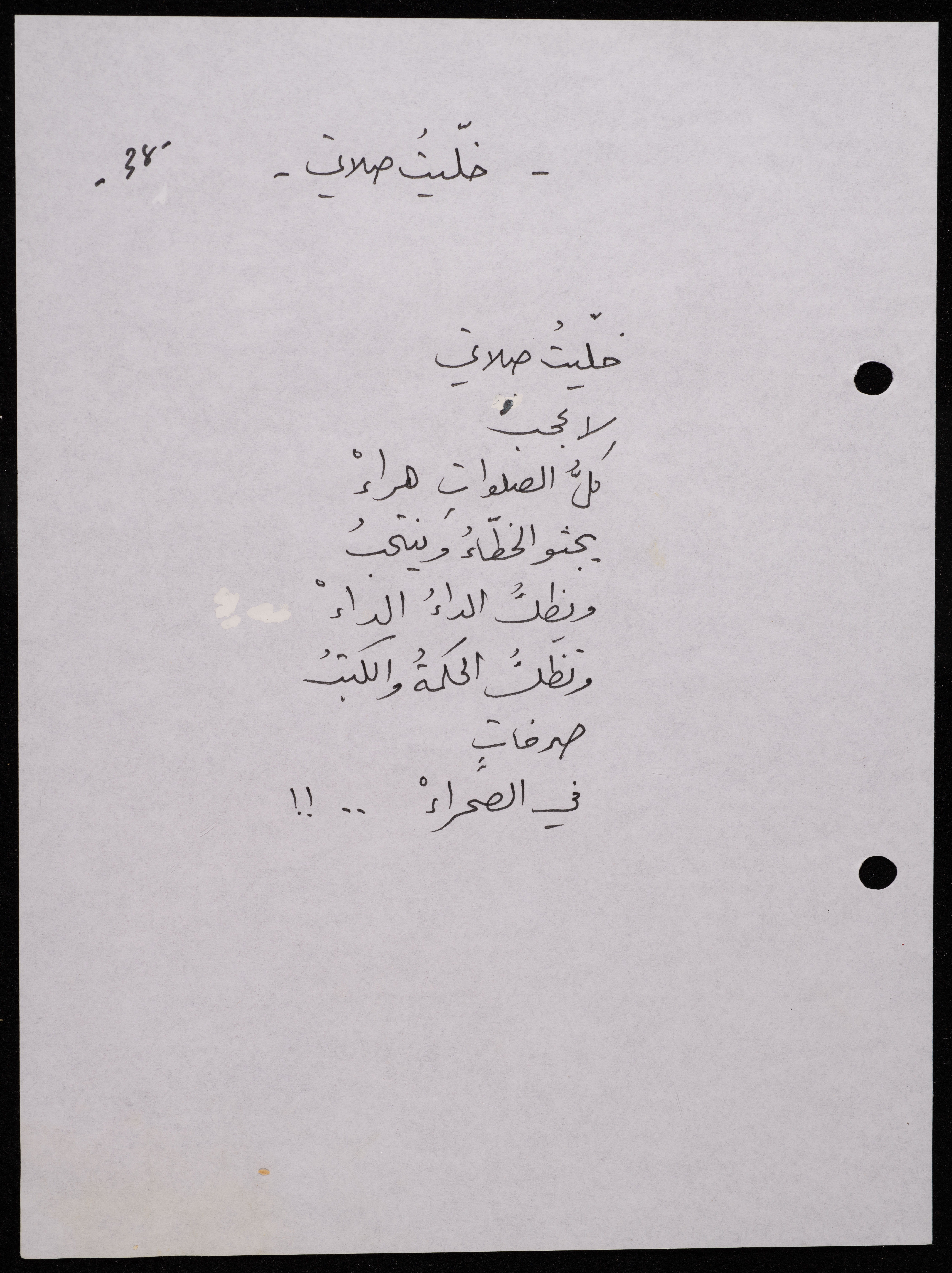 Handwritten, this 188-page archival item documents a poetry collection by Shakib Jahshan titled "Yotteloon Awsematan Min Shatha (They Come as Fragrant Medals)". The first section of the collection is titled "Kalimaton Fil-Asifa (Words In the Storm)", while the second is titled "Ihmeni Ya Abi (Protect Me, Father)".
