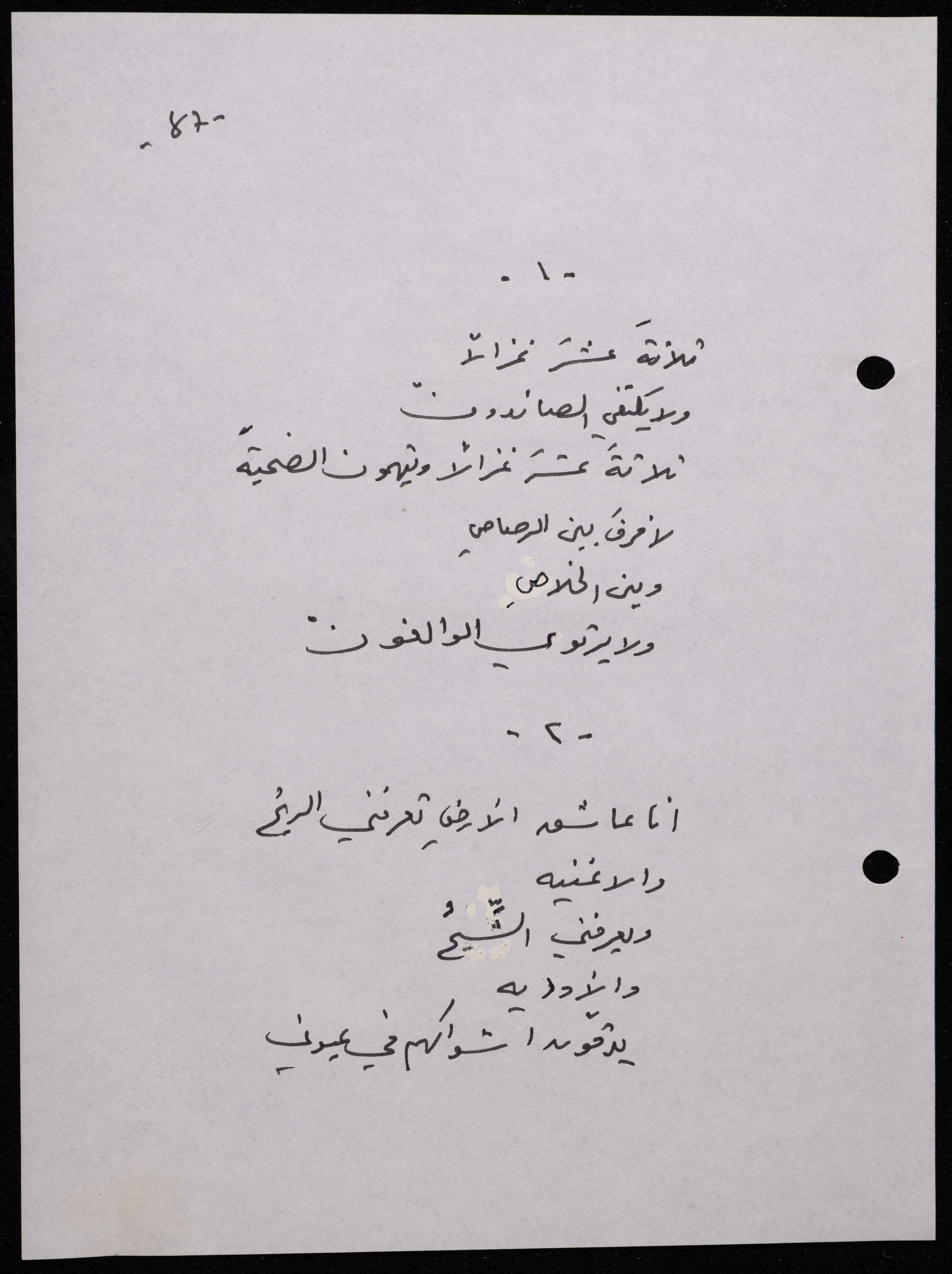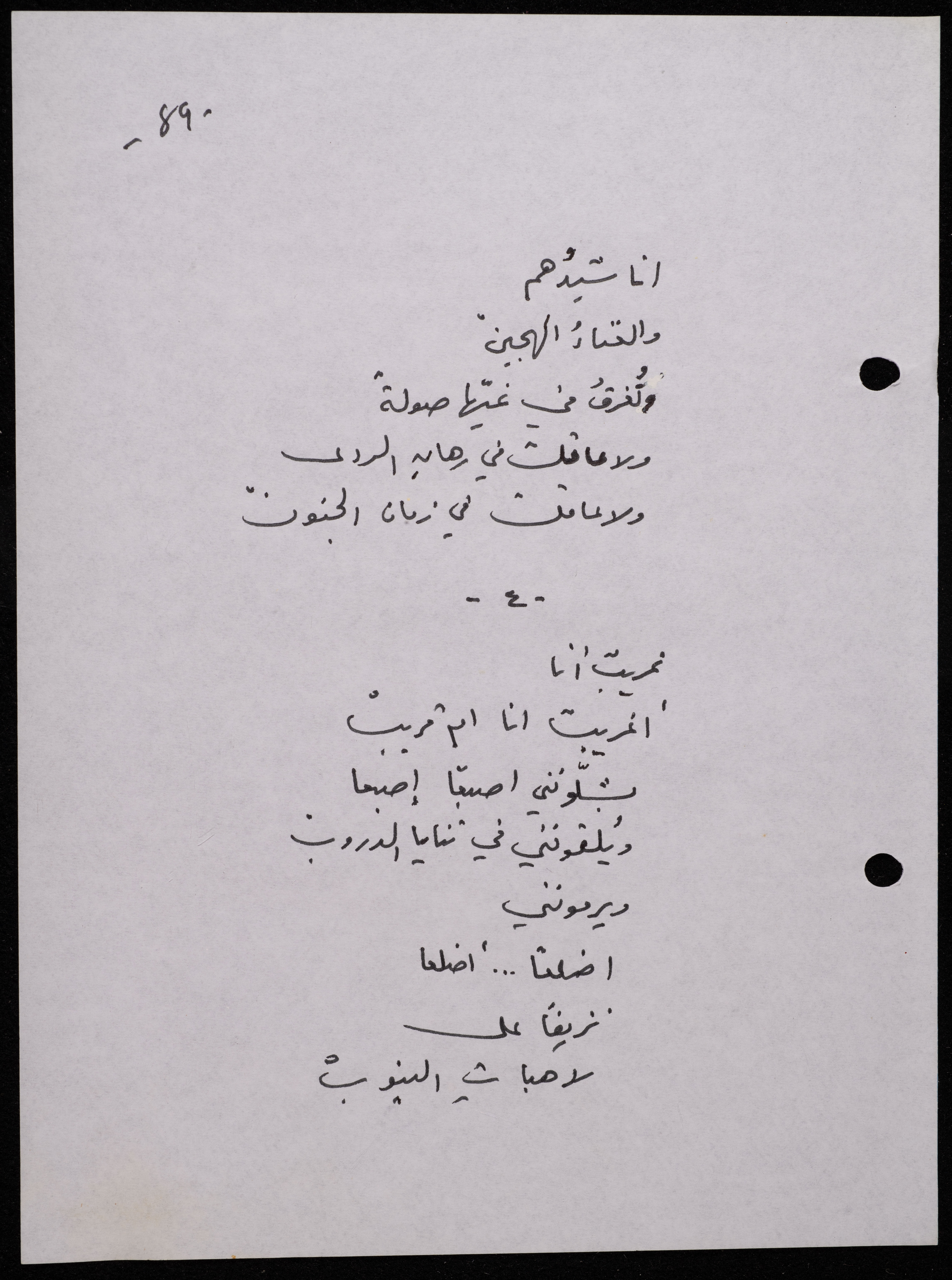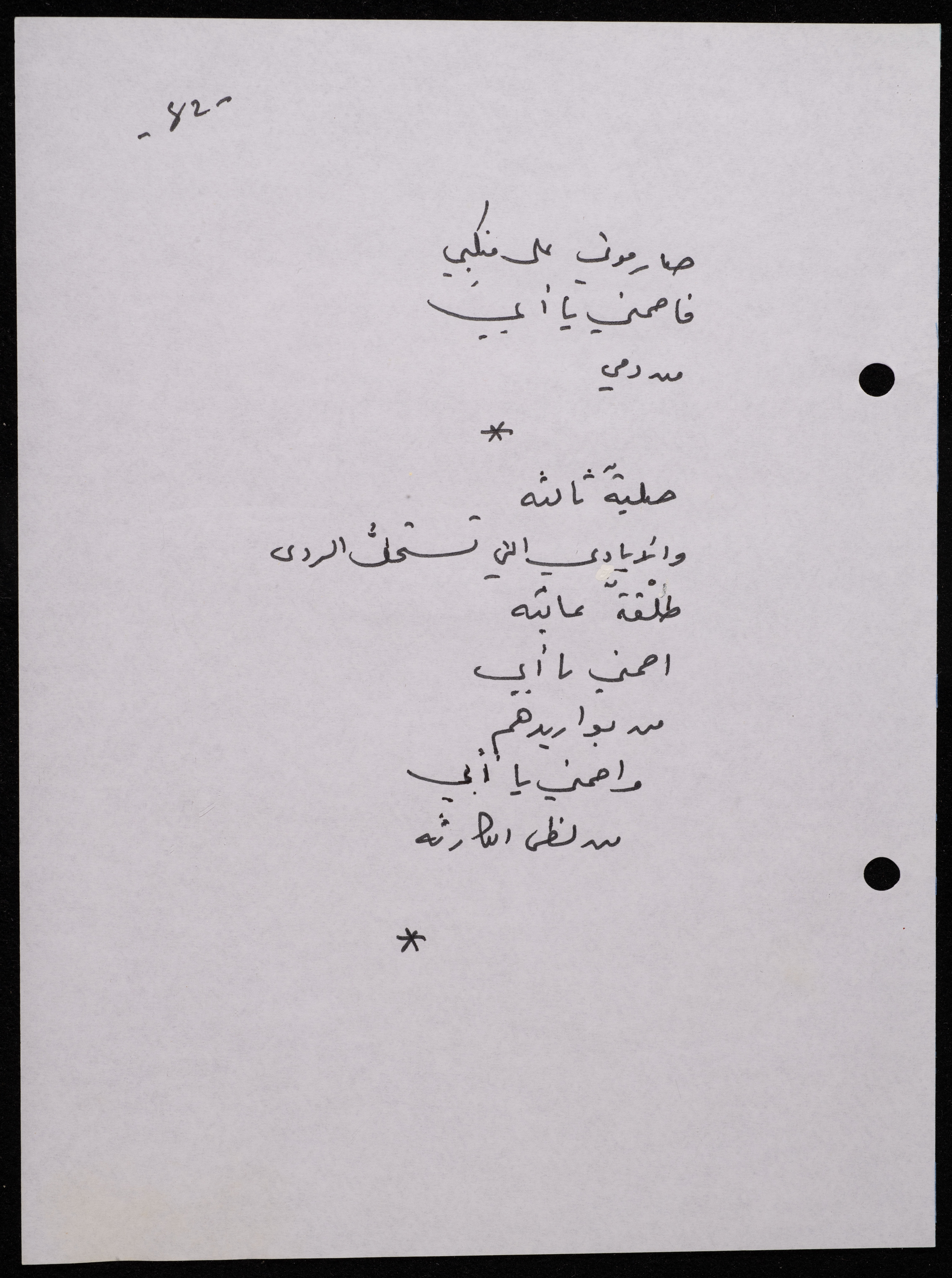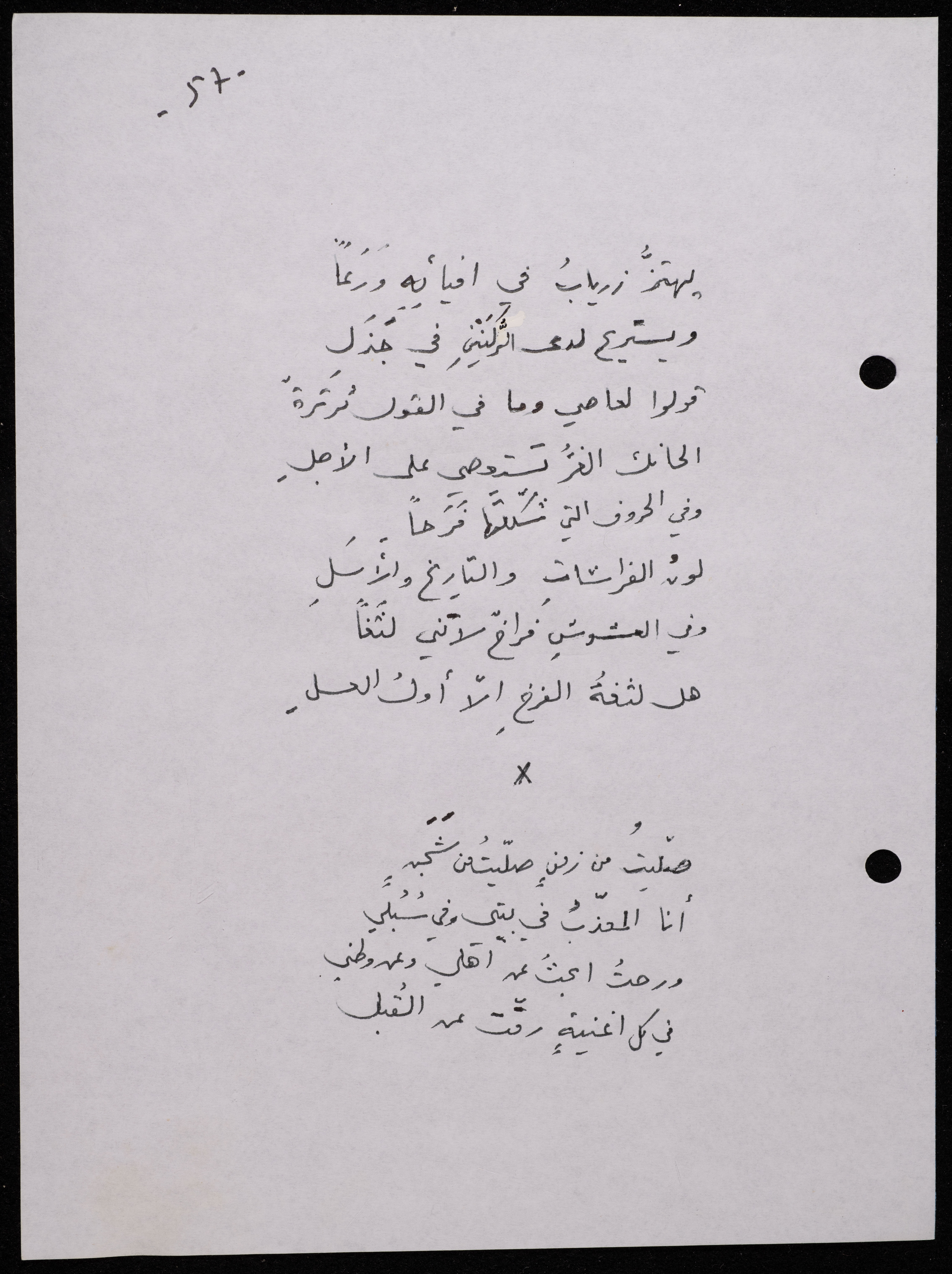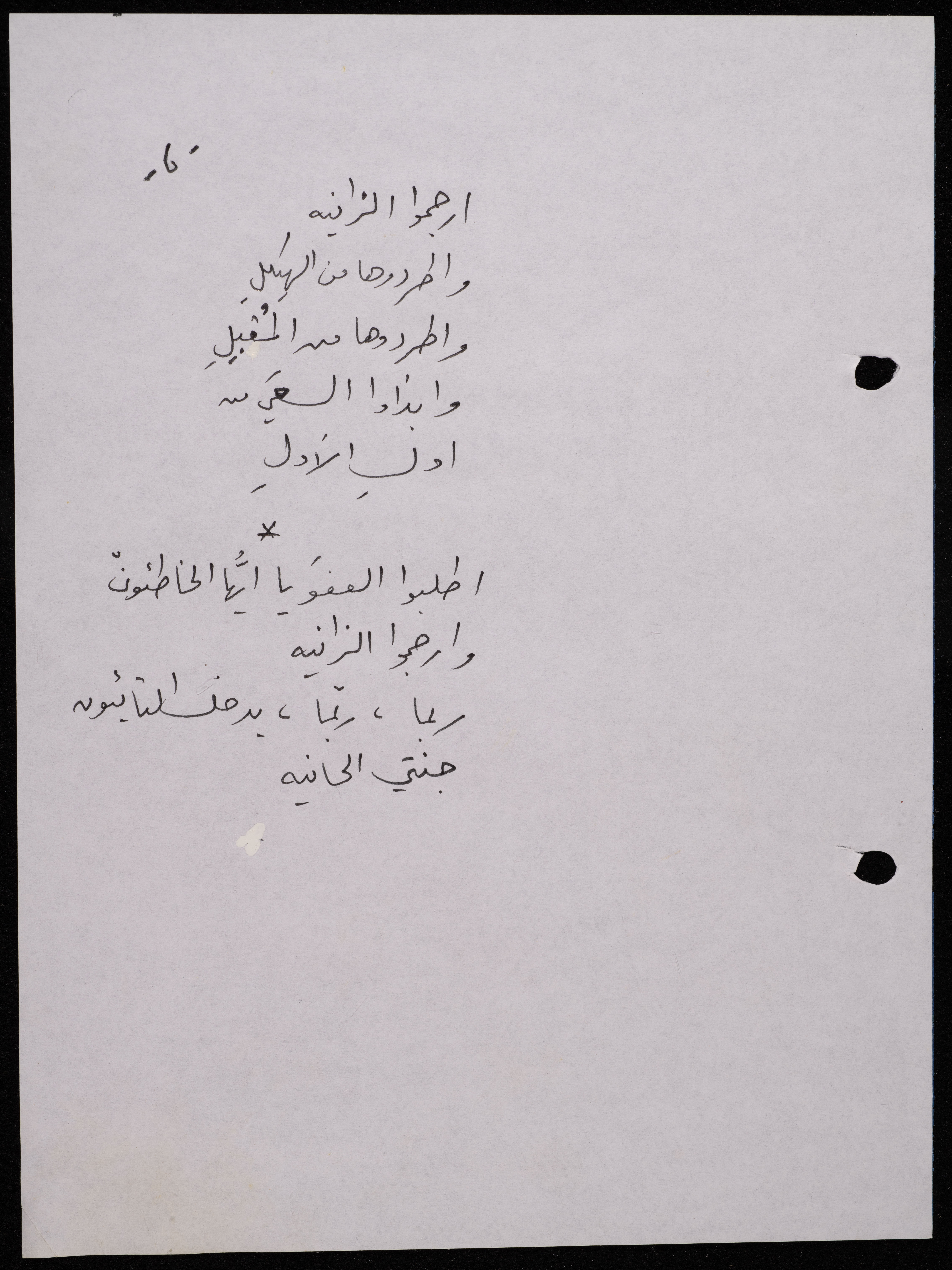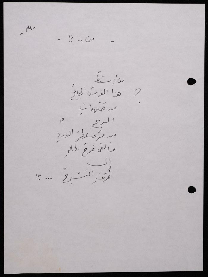 Handwritten, this 188-page archival item documents a poetry collection by Shakib Jahshan titled "Yotteloon Awsematan Min Shatha (They Come as Fragrant Medals)". The first section of the collection is titled "Kalimaton Fil-Asifa (Words In the Storm)", while the second is titled "Ihmeni Ya Abi (Protect Me, Father)".