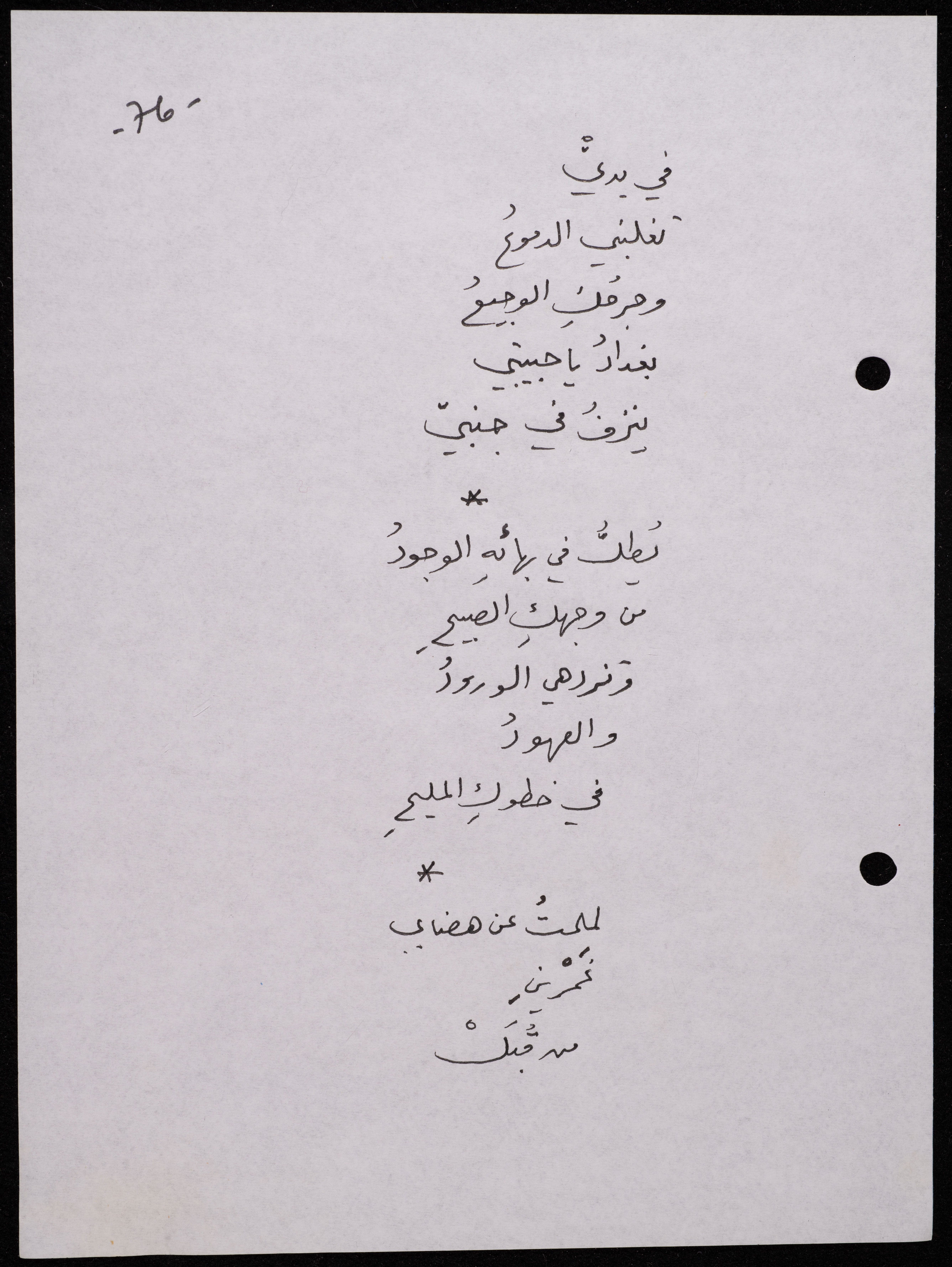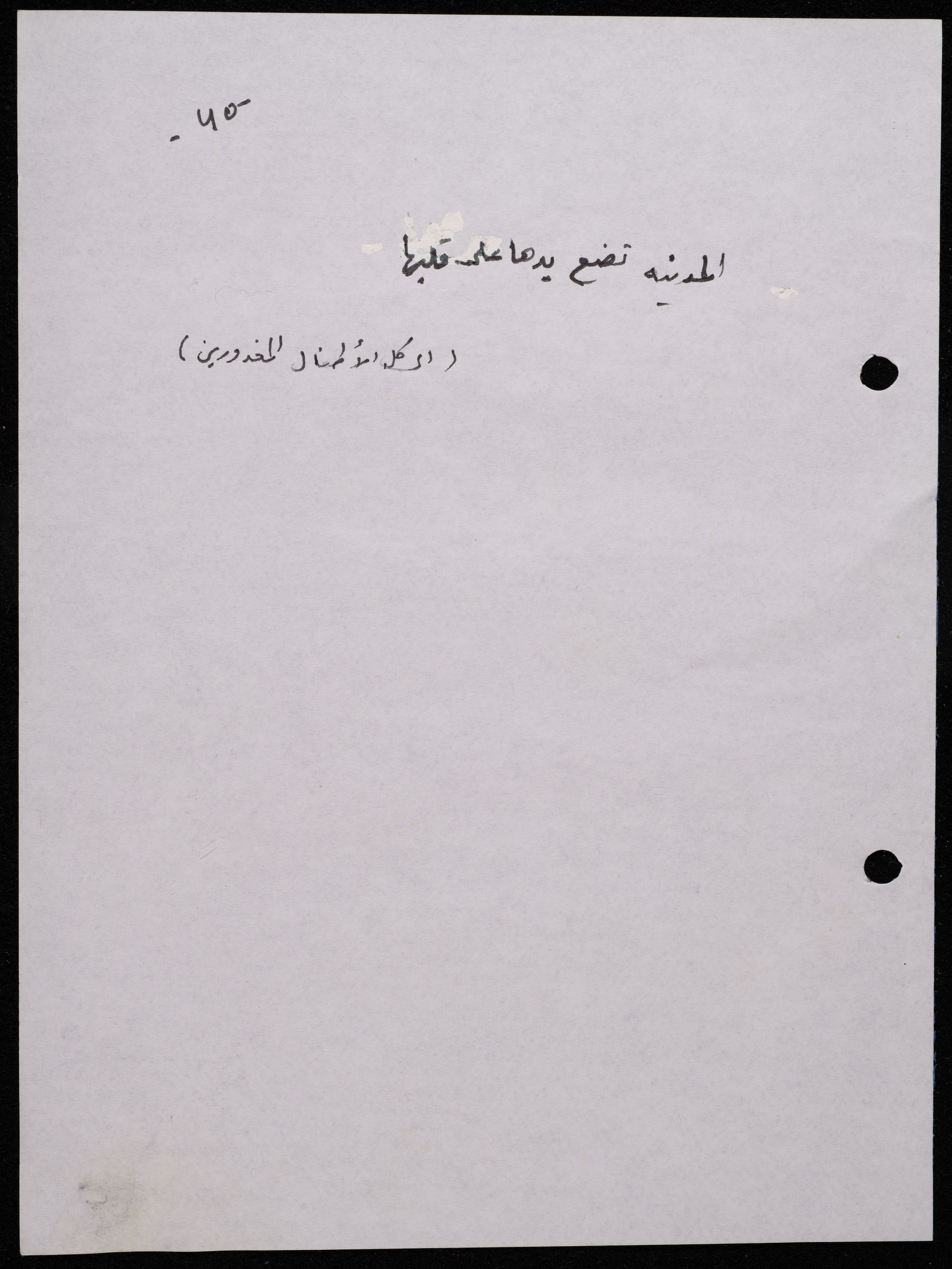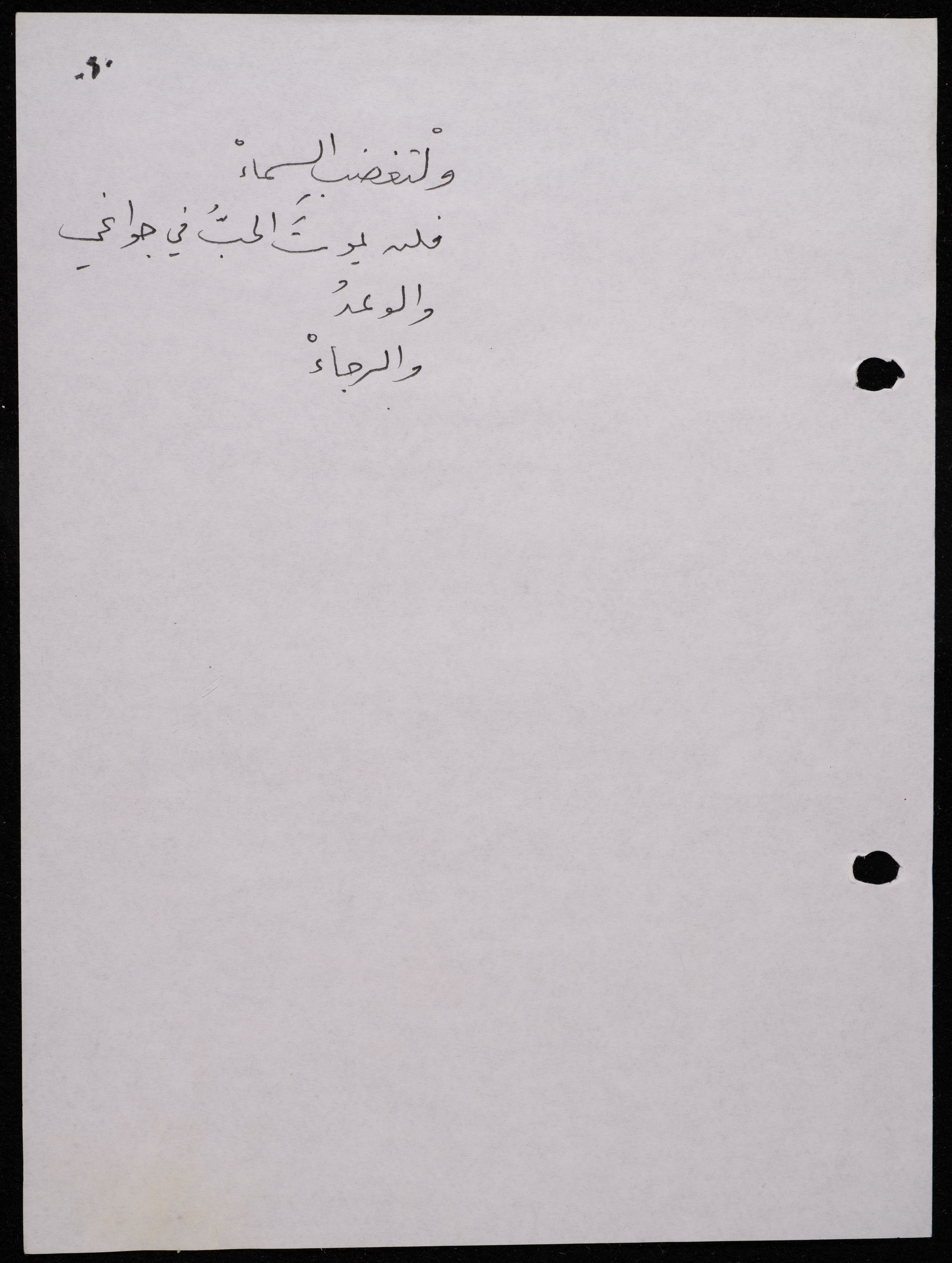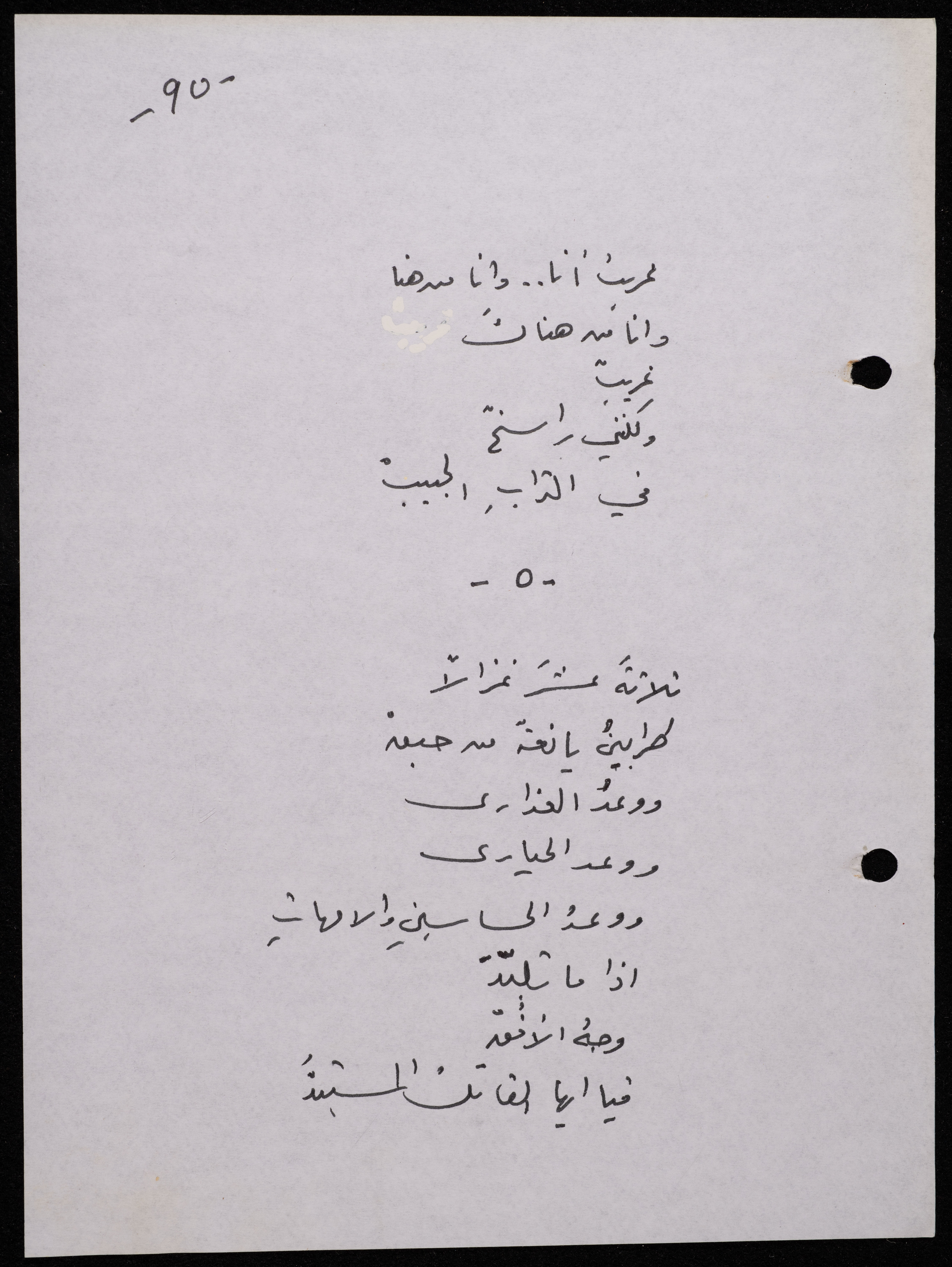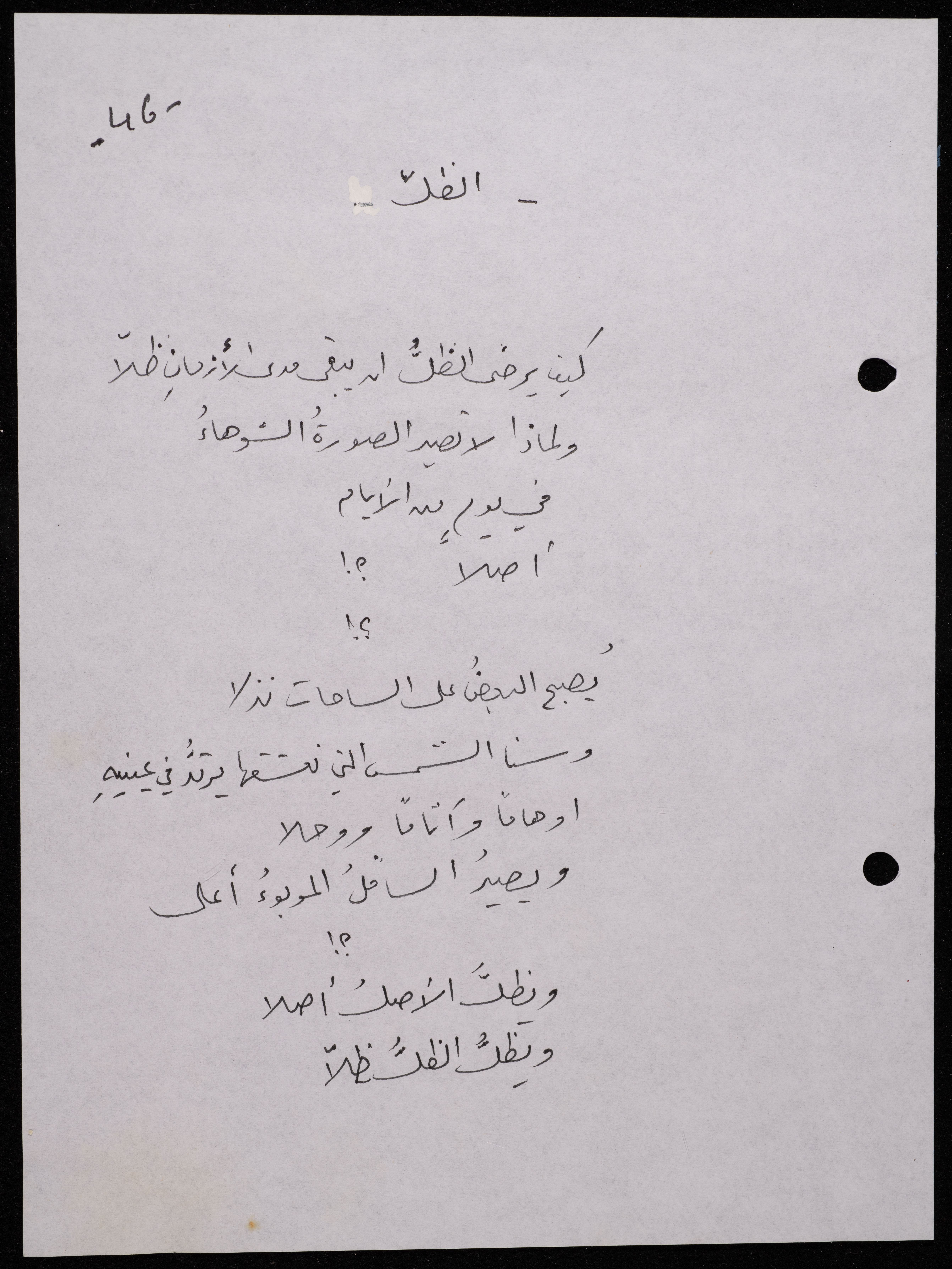 Handwritten, this 188-page archival item documents a poetry collection by Shakib Jahshan titled "Yotteloon Awsematan Min Shatha (They Come as Fragrant Medals)". The first section of the collection is titled "Kalimaton Fil-Asifa (Words In the Storm)", while the second is titled "Ihmeni Ya Abi (Protect Me, Father)".