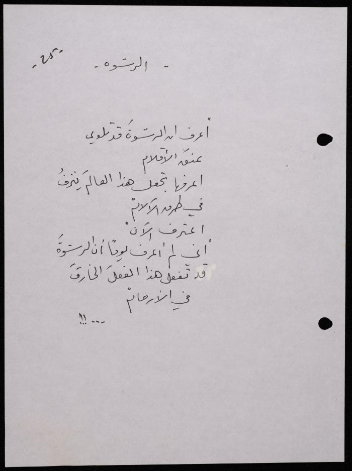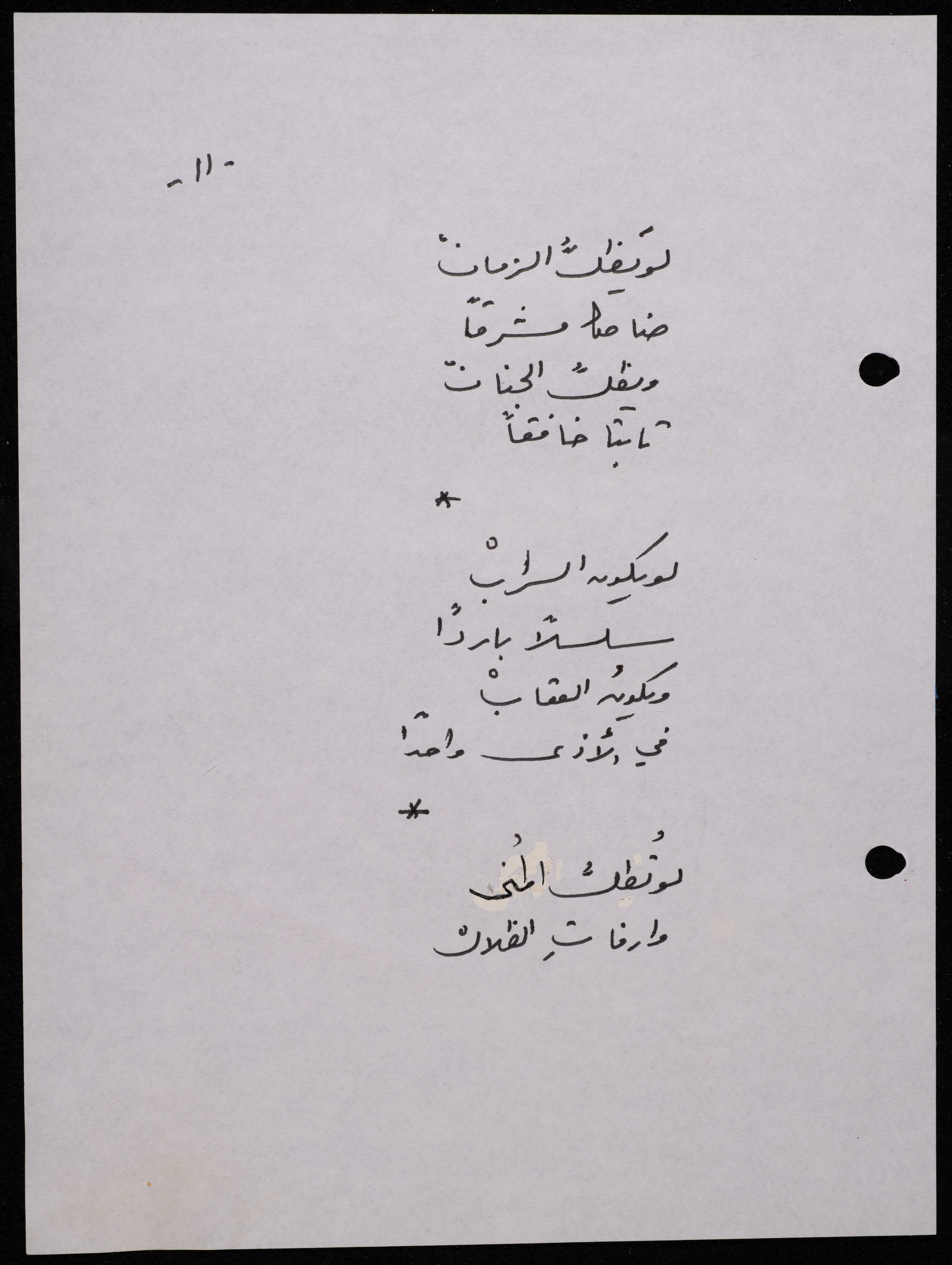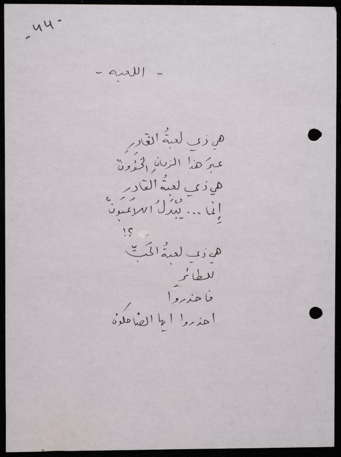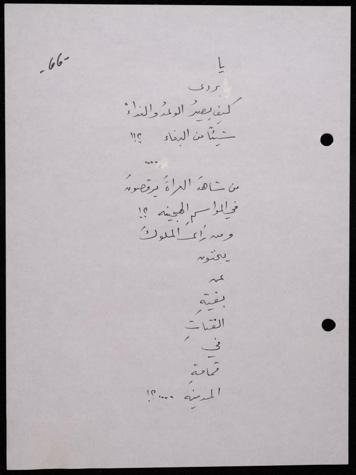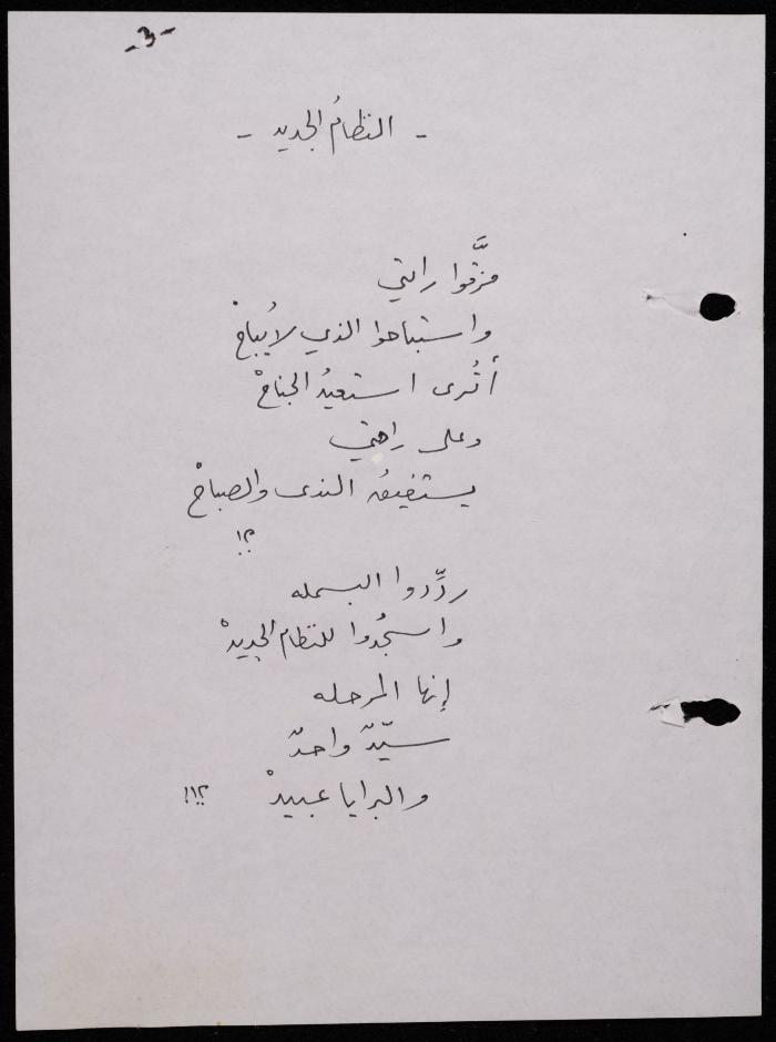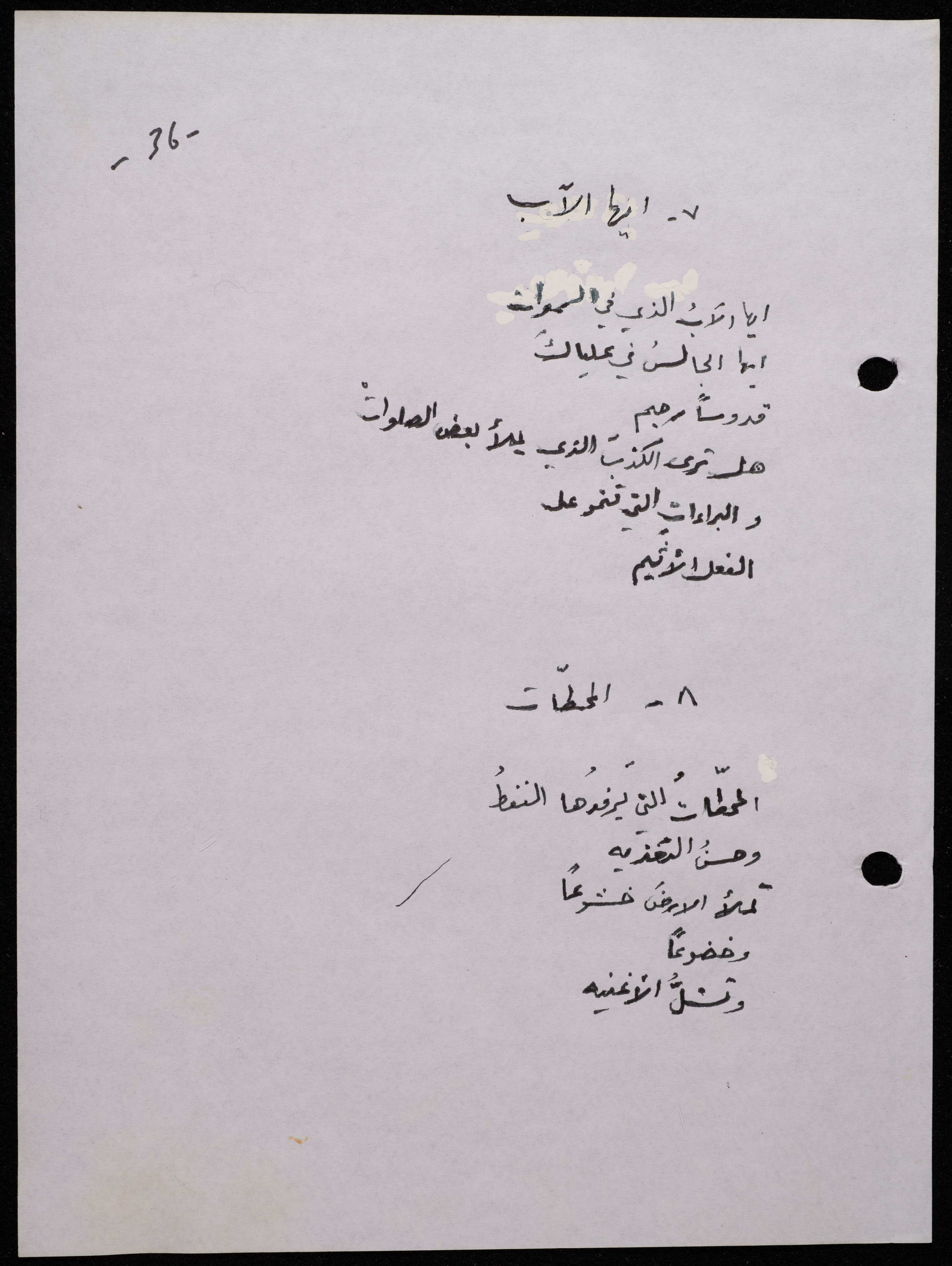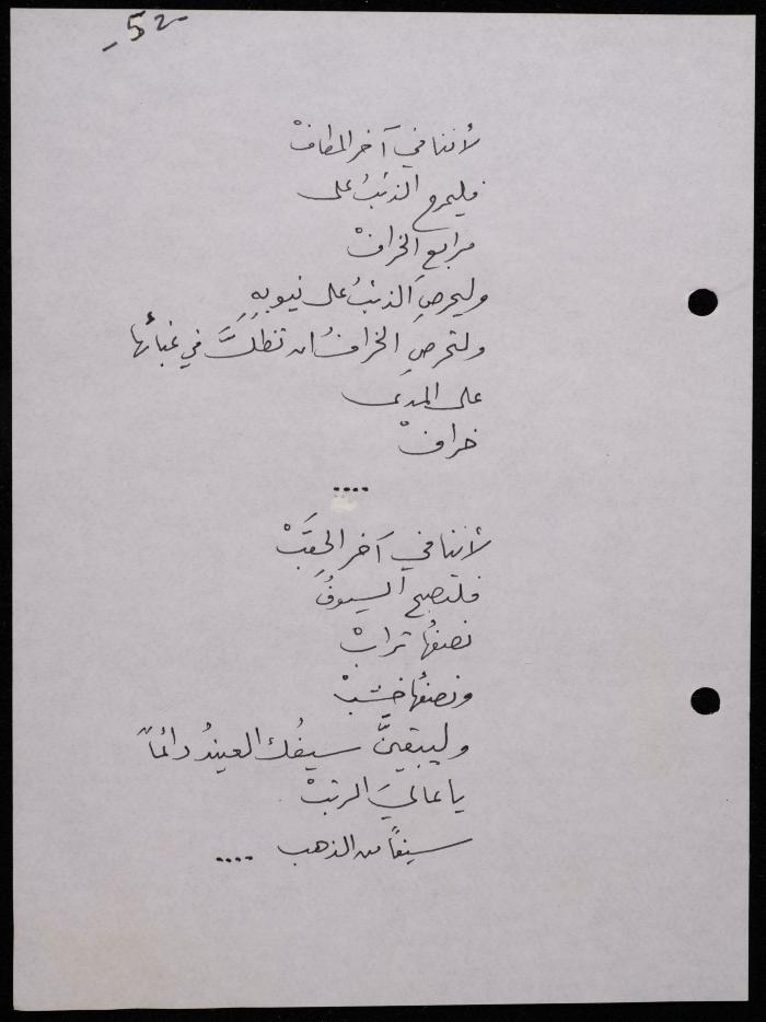 Handwritten, this 188-page archival item documents a poetry collection by Shakib Jahshan titled "Yotteloon Awsematan Min Shatha (They Come as Fragrant Medals)". The first section of the collection is titled "Kalimaton Fil-Asifa (Words In the Storm)", while the second is titled "Ihmeni Ya Abi (Protect Me, Father)".
