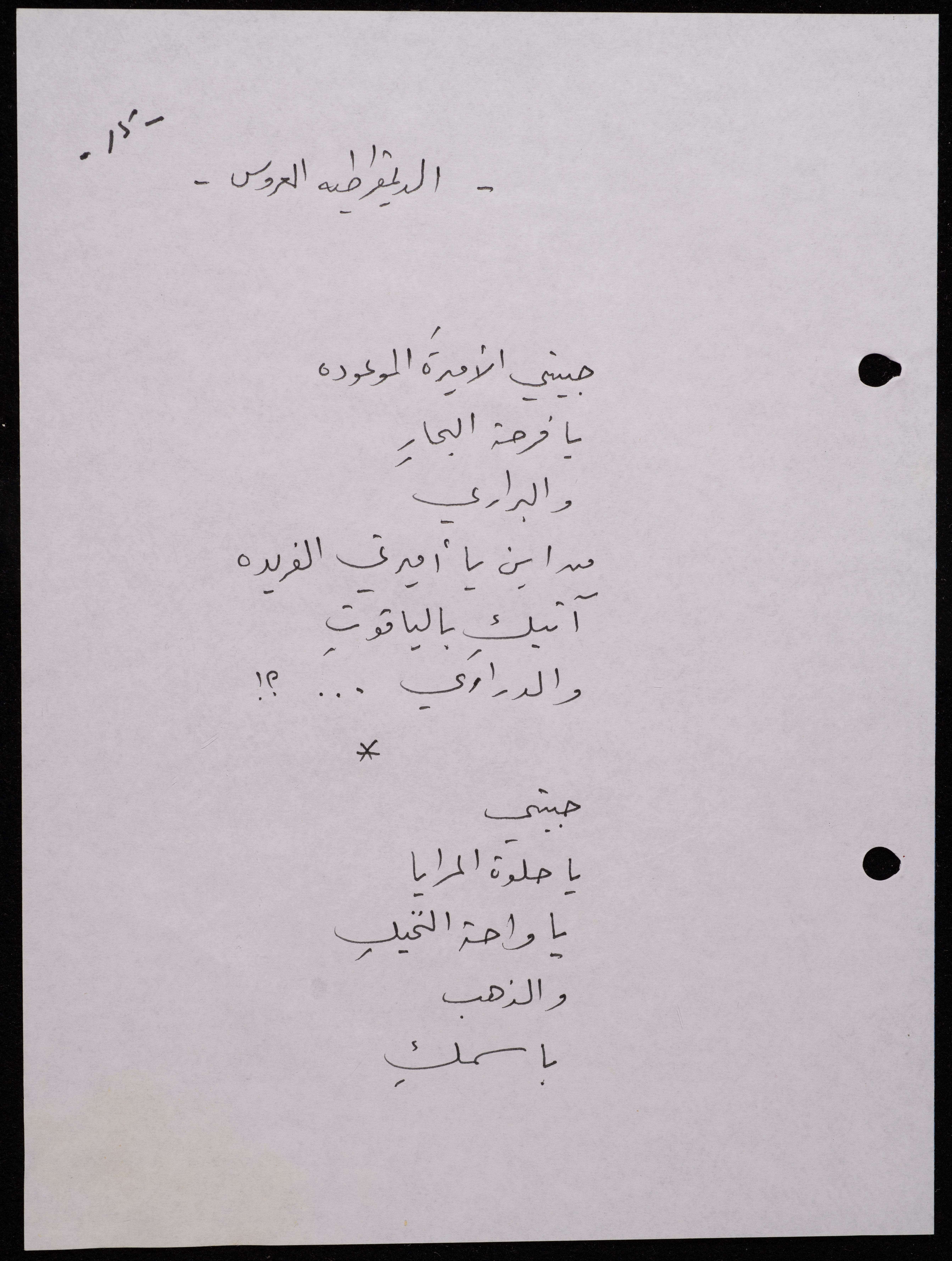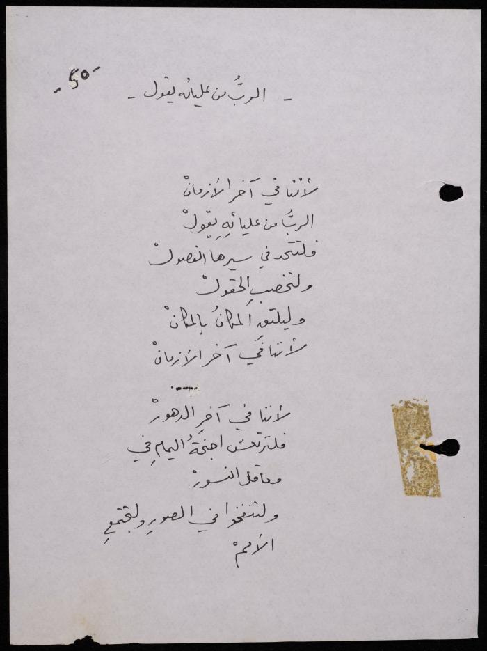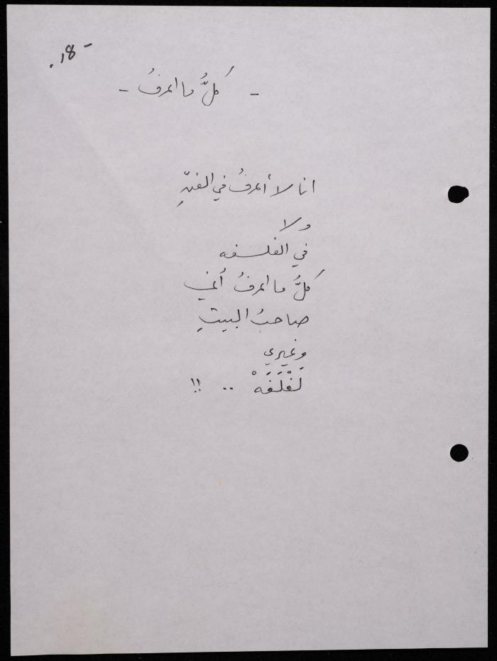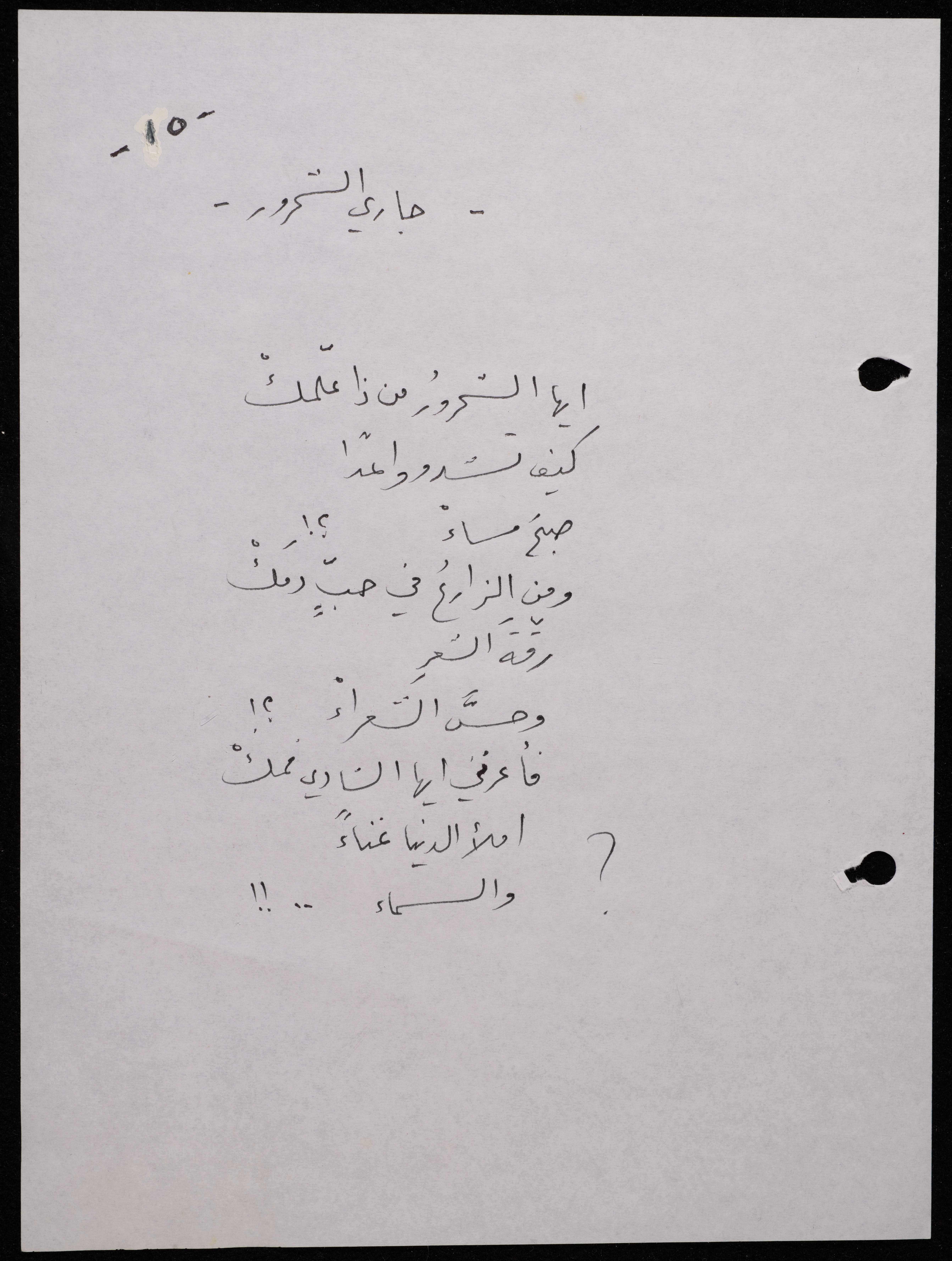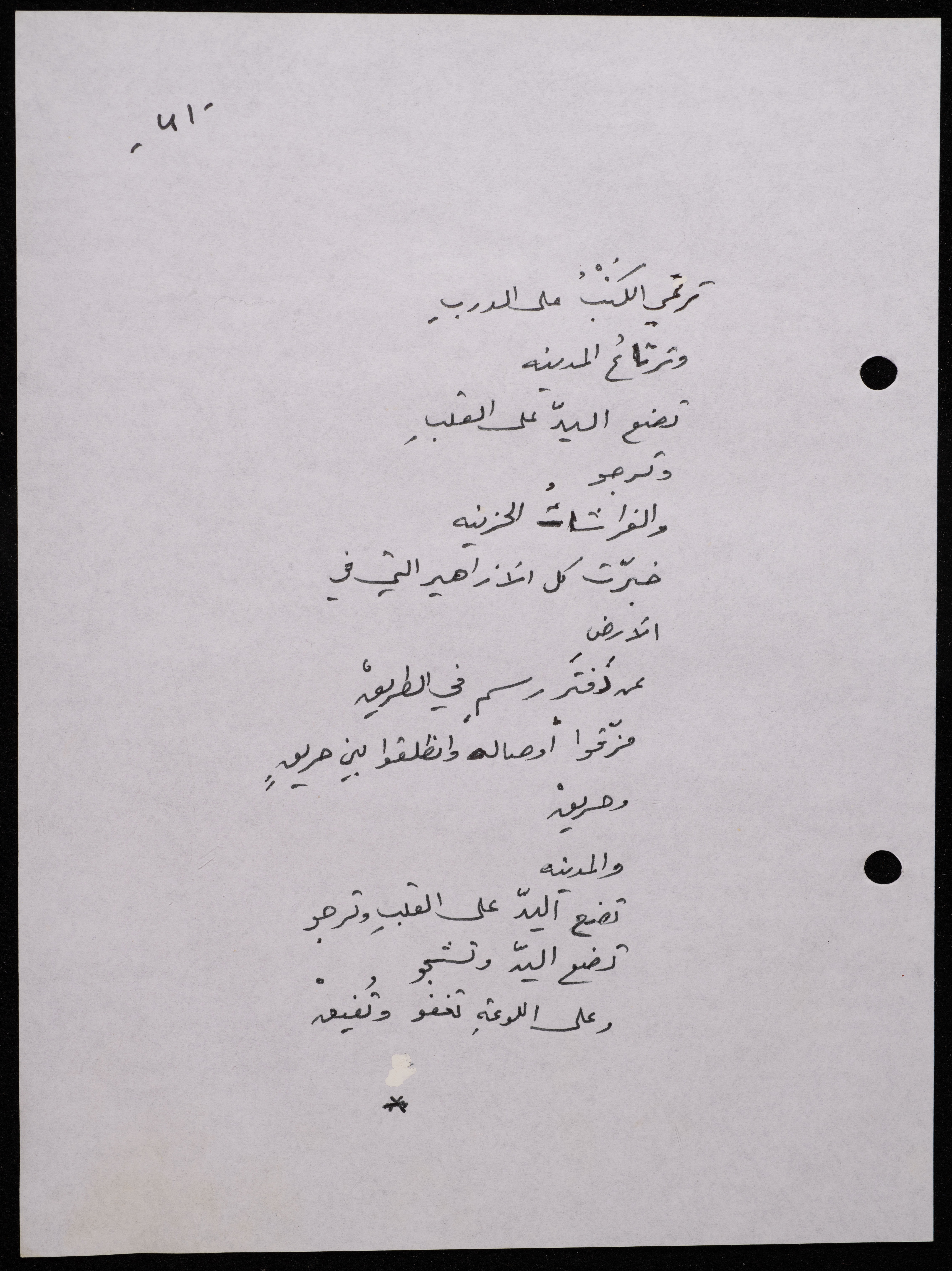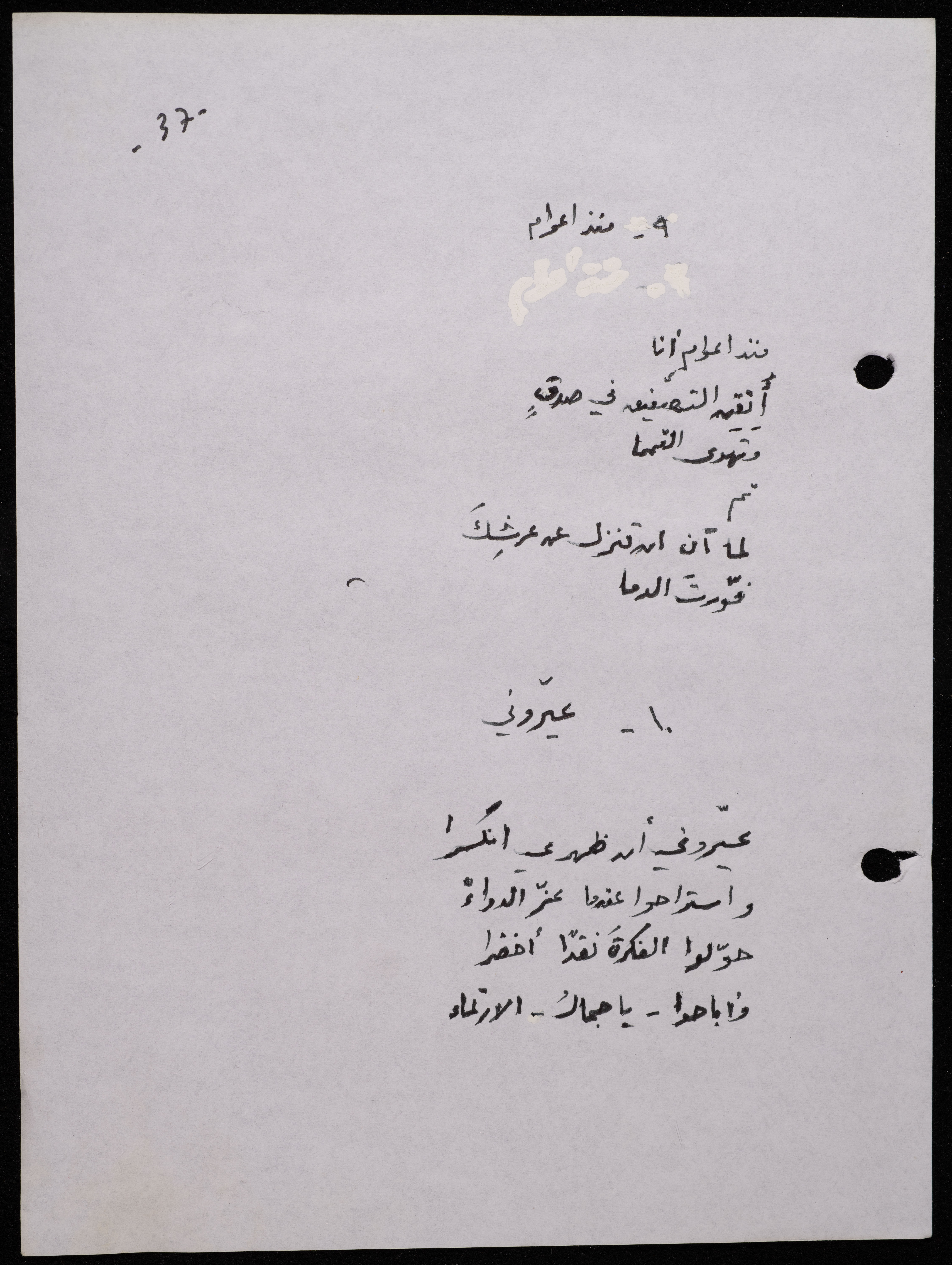 Handwritten, this 188-page archival item documents a poetry collection by Shakib Jahshan titled "Yotteloon Awsematan Min Shatha (They Come as Fragrant Medals)". The first section of the collection is titled "Kalimaton Fil-Asifa (Words In the Storm)", while the second is titled "Ihmeni Ya Abi (Protect Me, Father)".