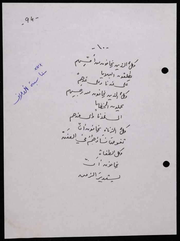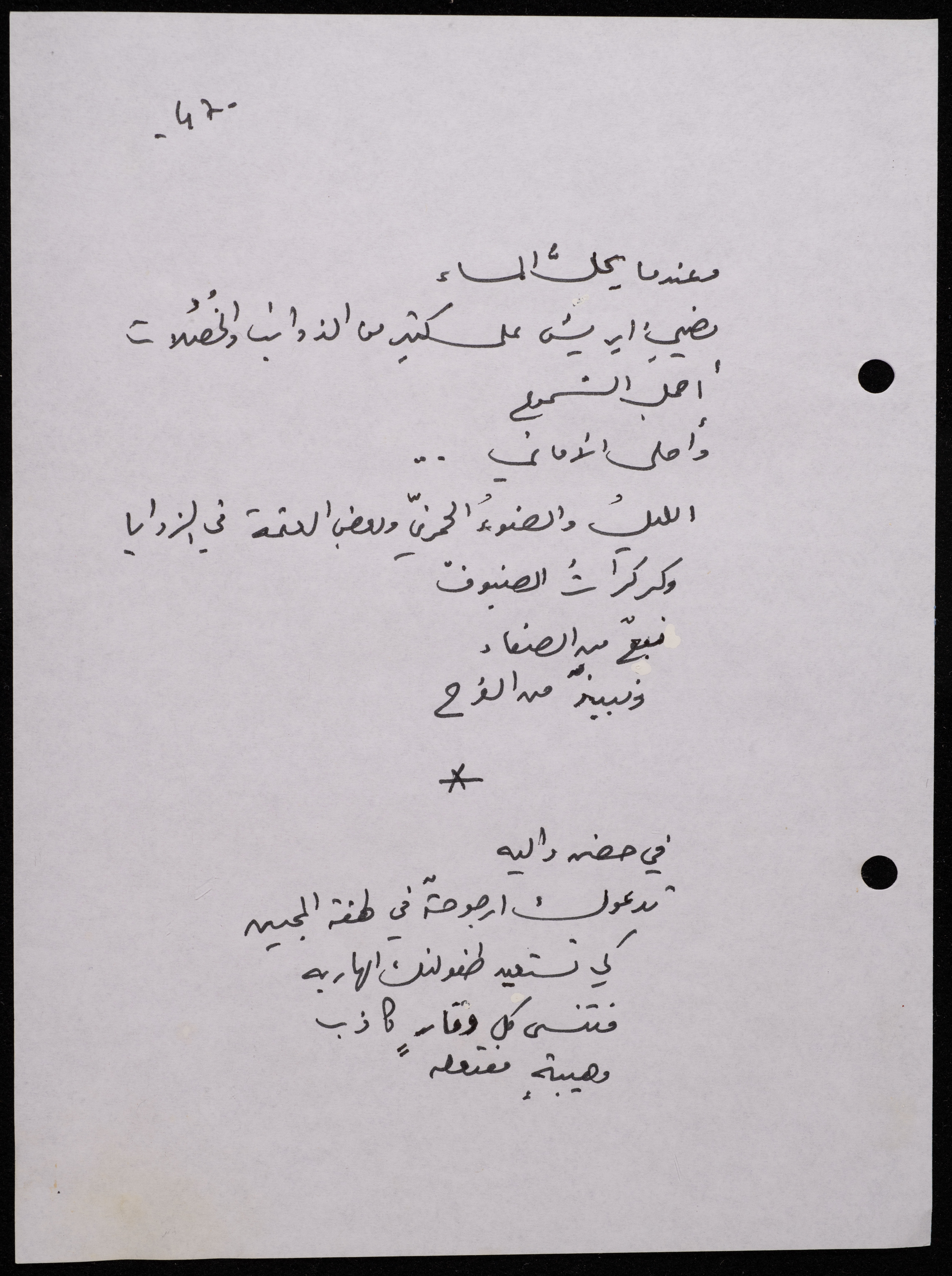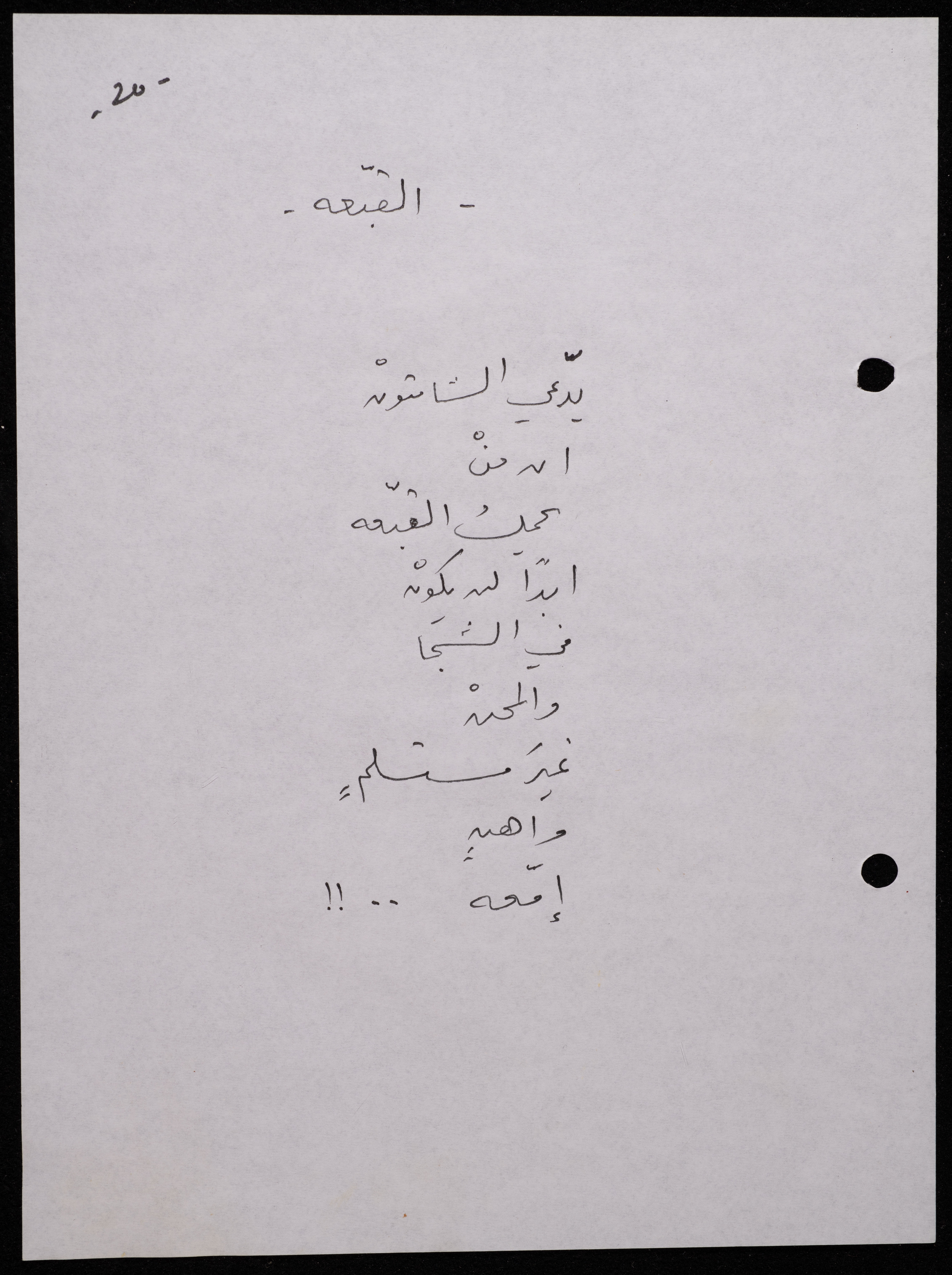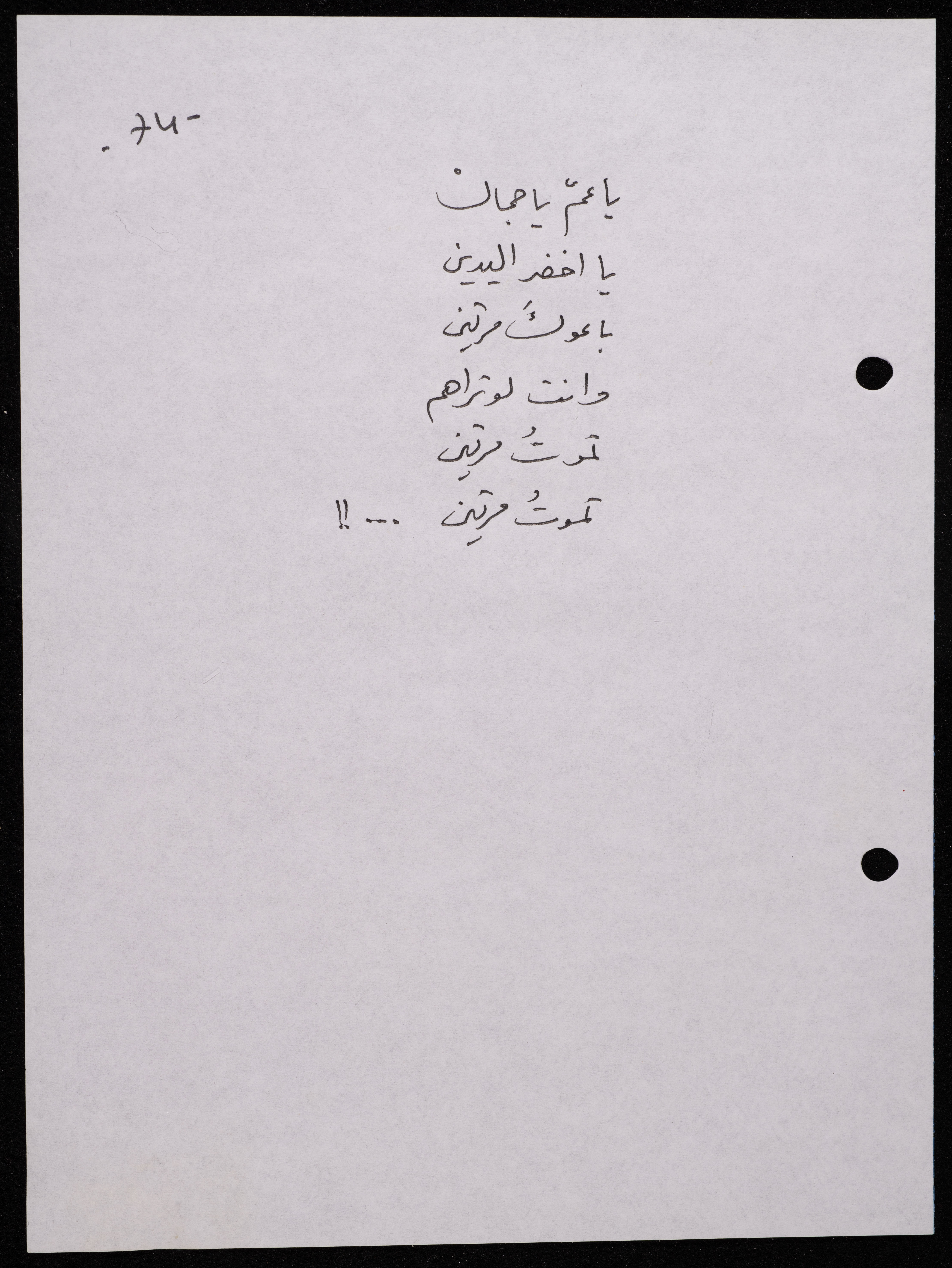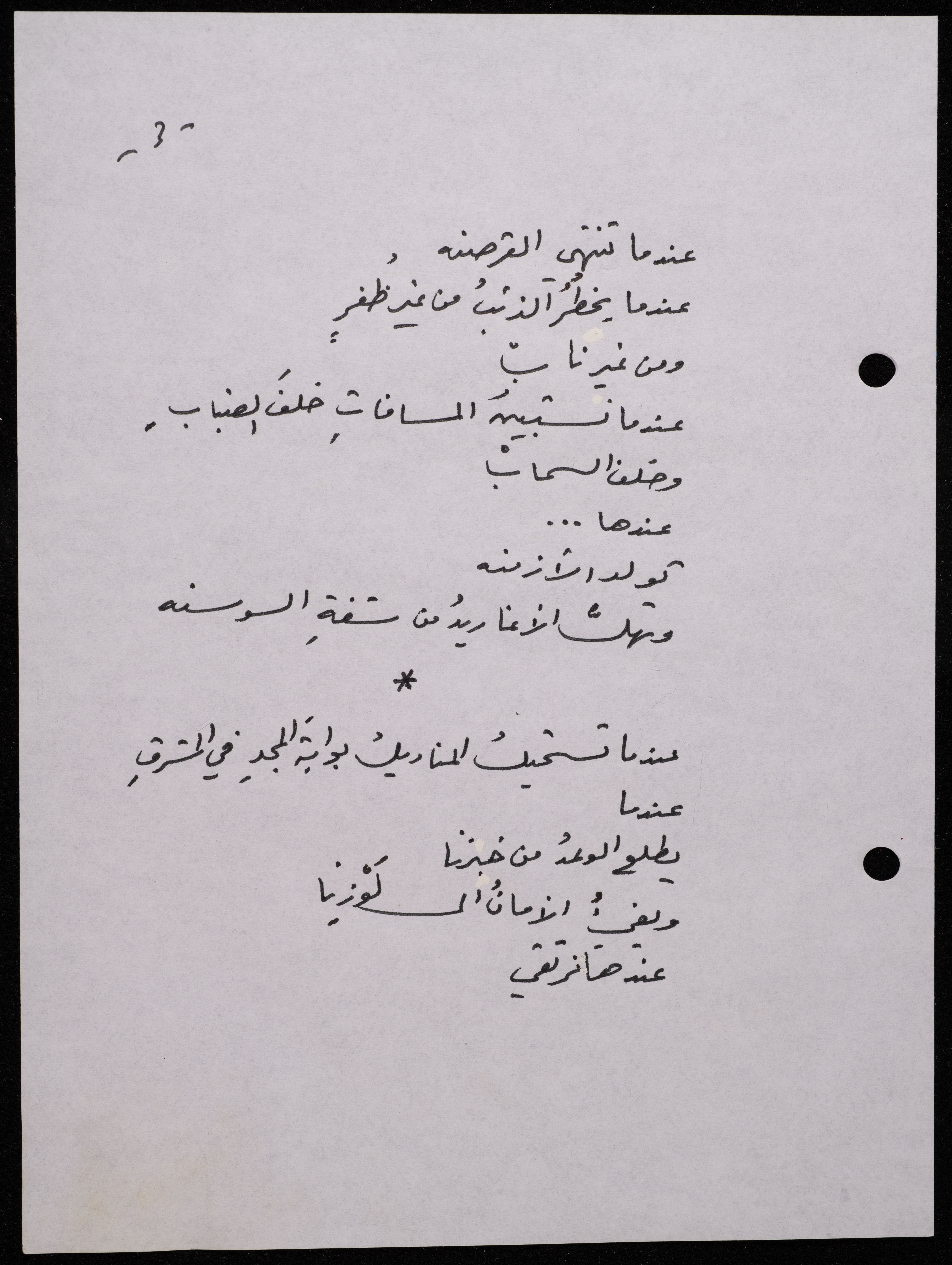 Handwritten, this 188-page archival item documents a poetry collection by Shakib Jahshan titled "Yotteloon Awsematan Min Shatha (They Come as Fragrant Medals)". The first section of the collection is titled "Kalimaton Fil-Asifa (Words In the Storm)", while the second is titled "Ihmeni Ya Abi (Protect Me, Father)".