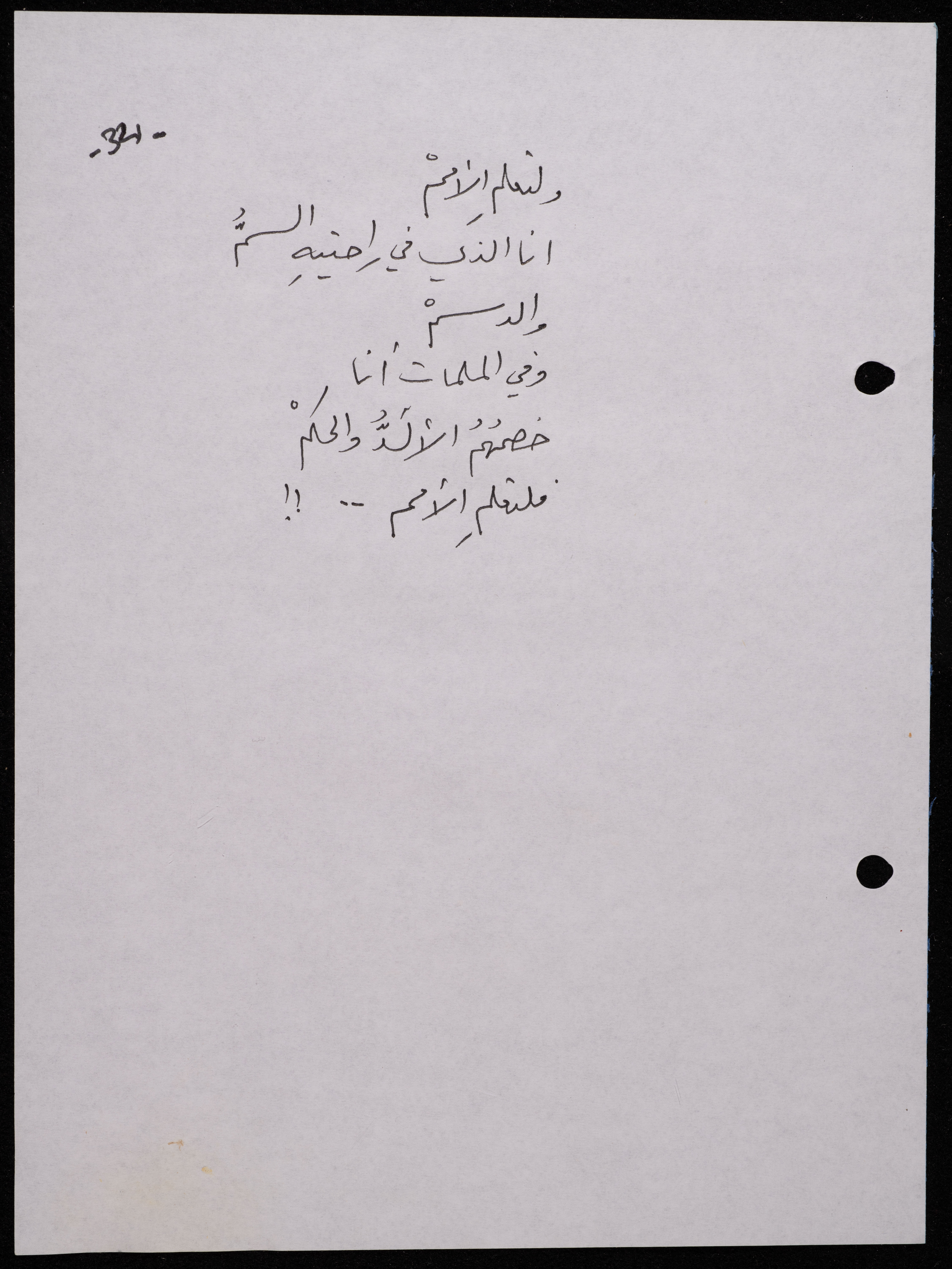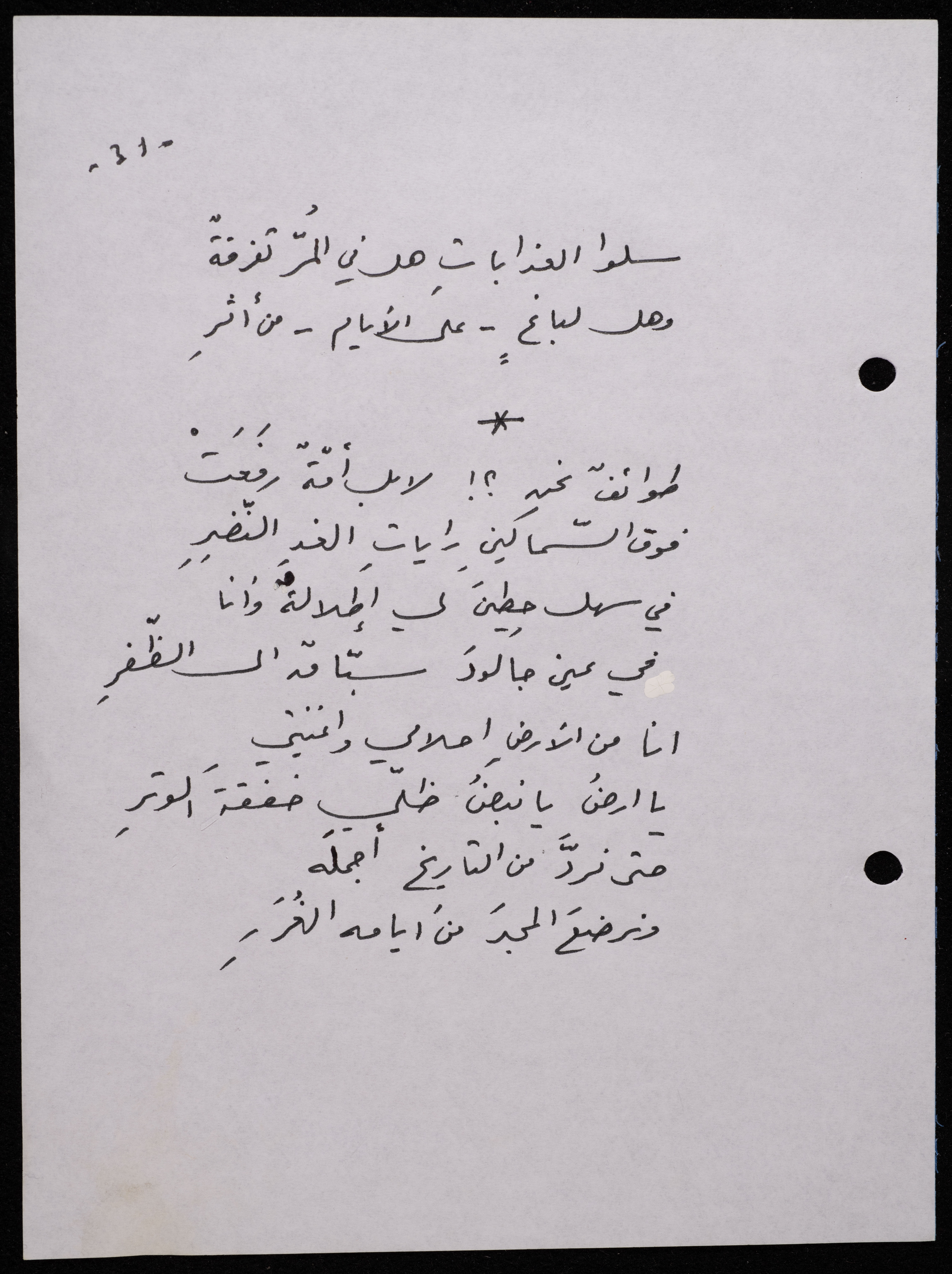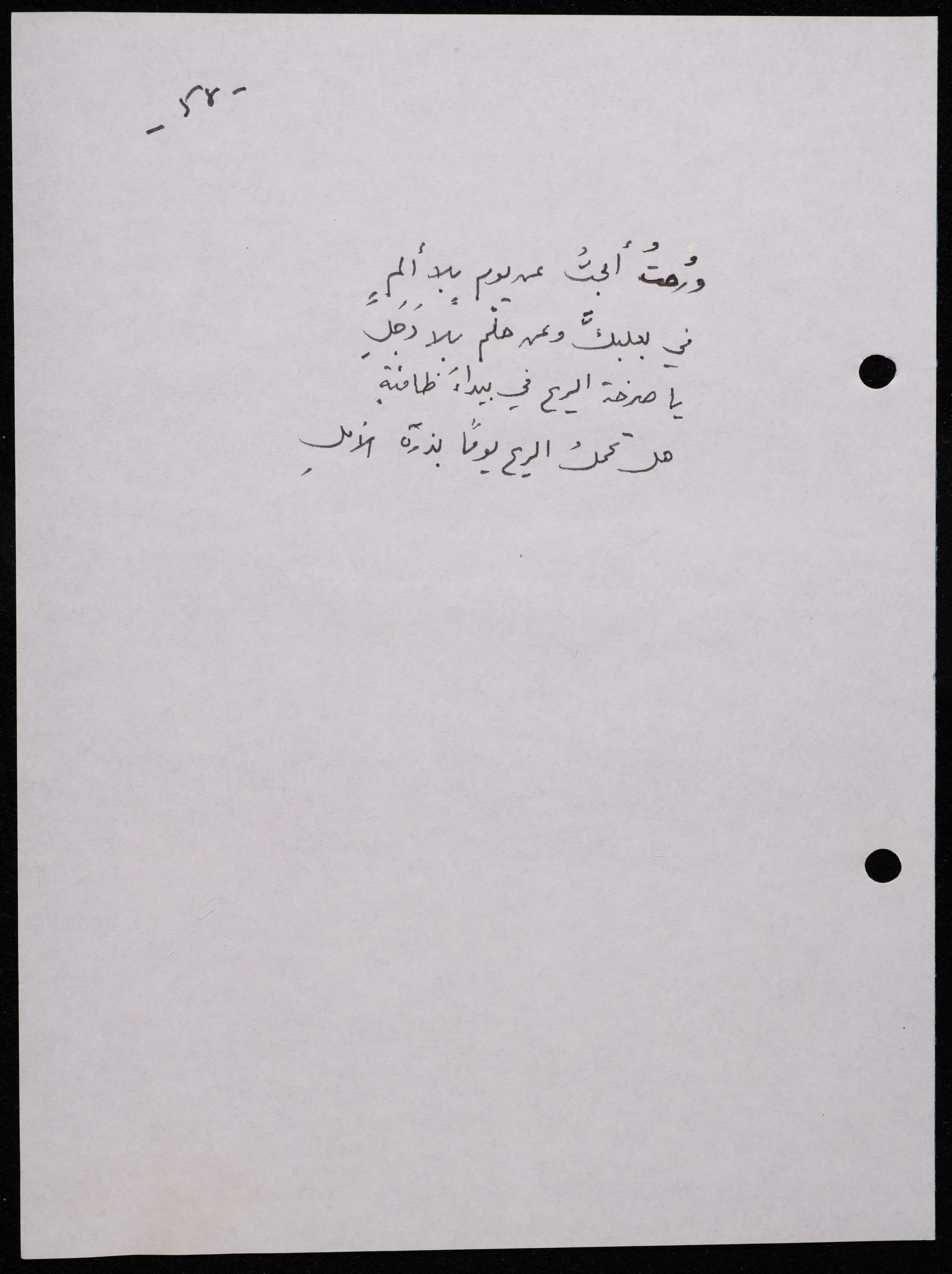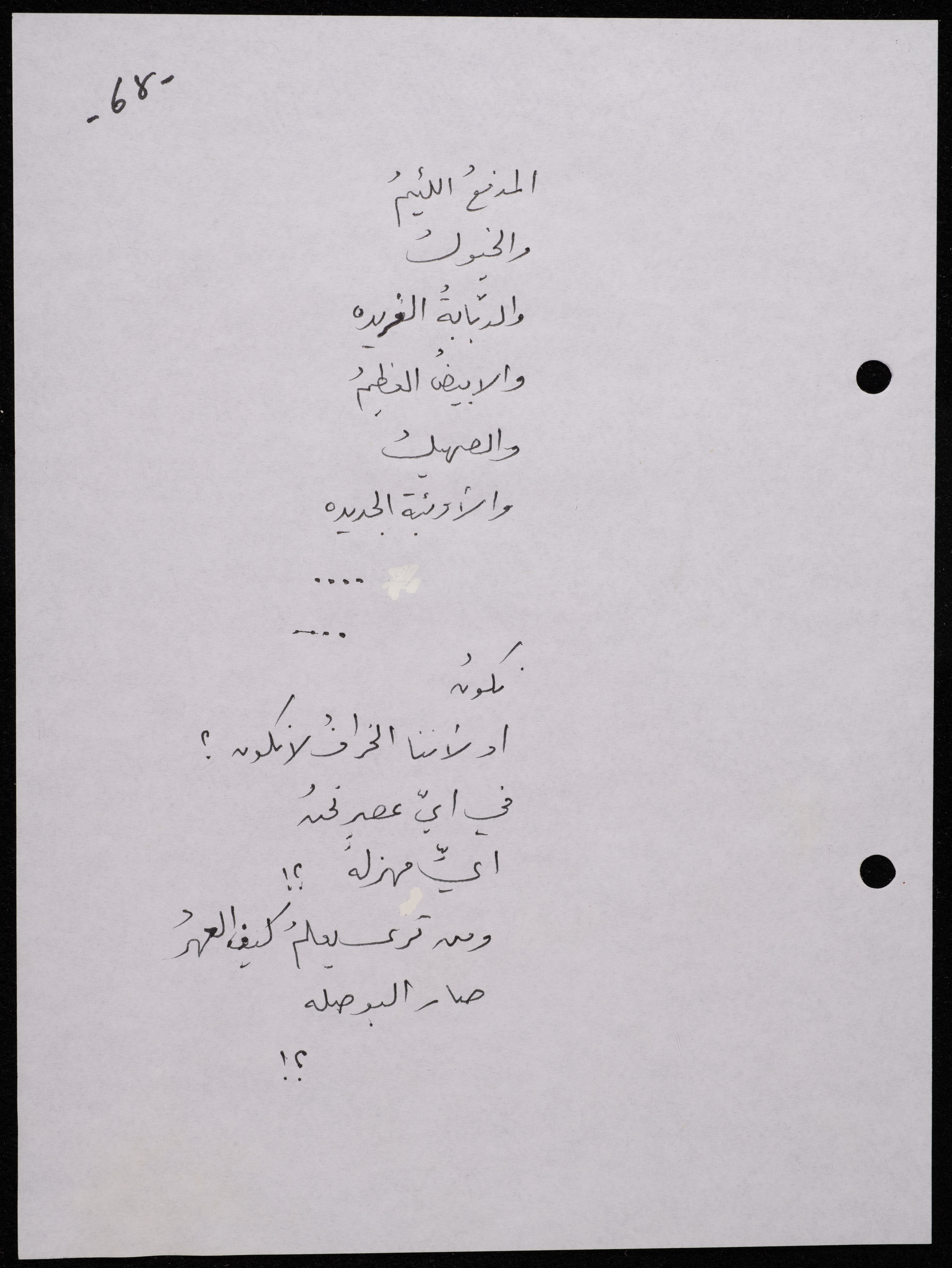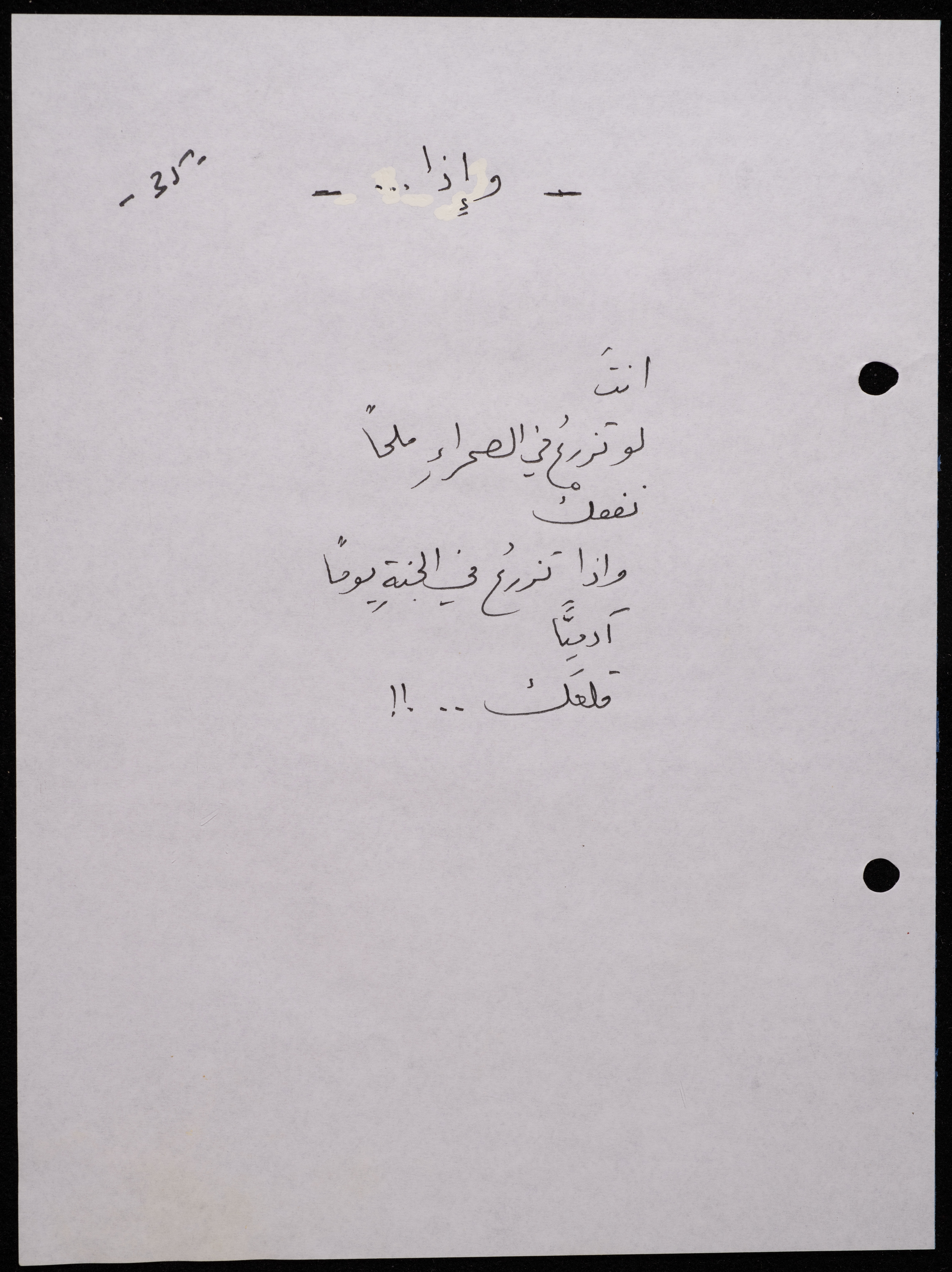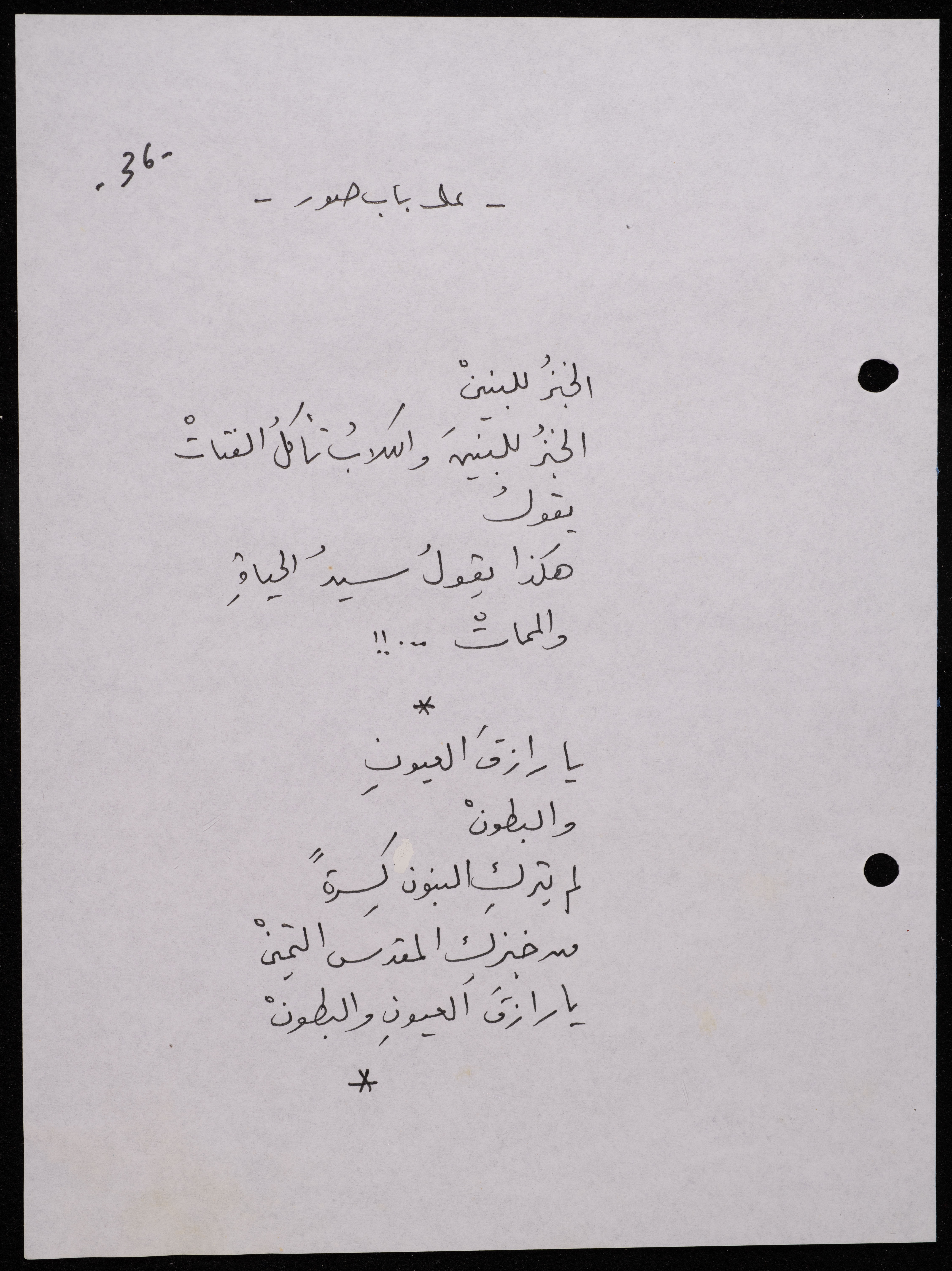 Handwritten, this 188-page archival item documents a poetry collection by Shakib Jahshan titled "Yotteloon Awsematan Min Shatha (They Come as Fragrant Medals)". The first section of the collection is titled "Kalimaton Fil-Asifa (Words In the Storm)", while the second is titled "Ihmeni Ya Abi (Protect Me, Father)".