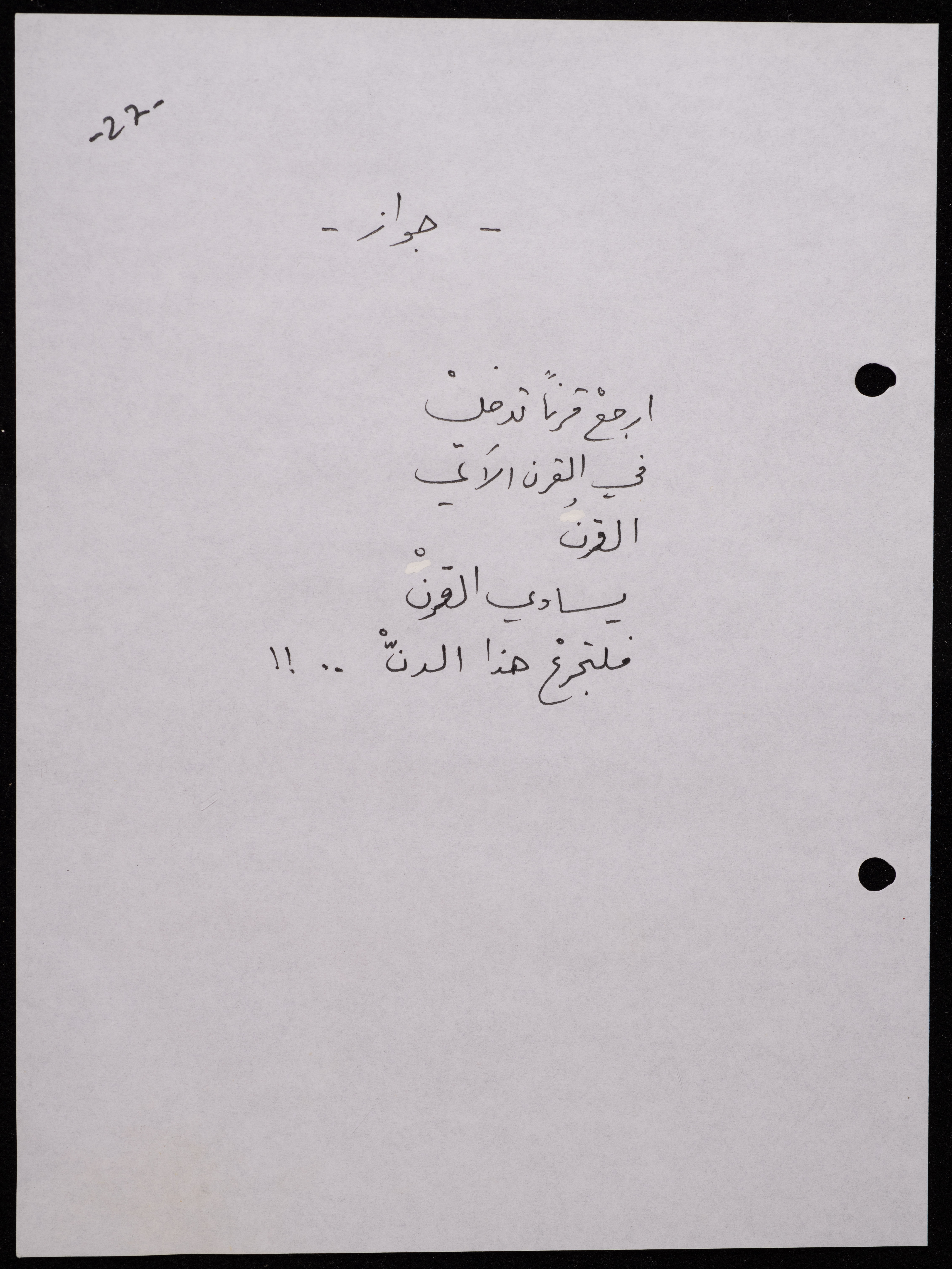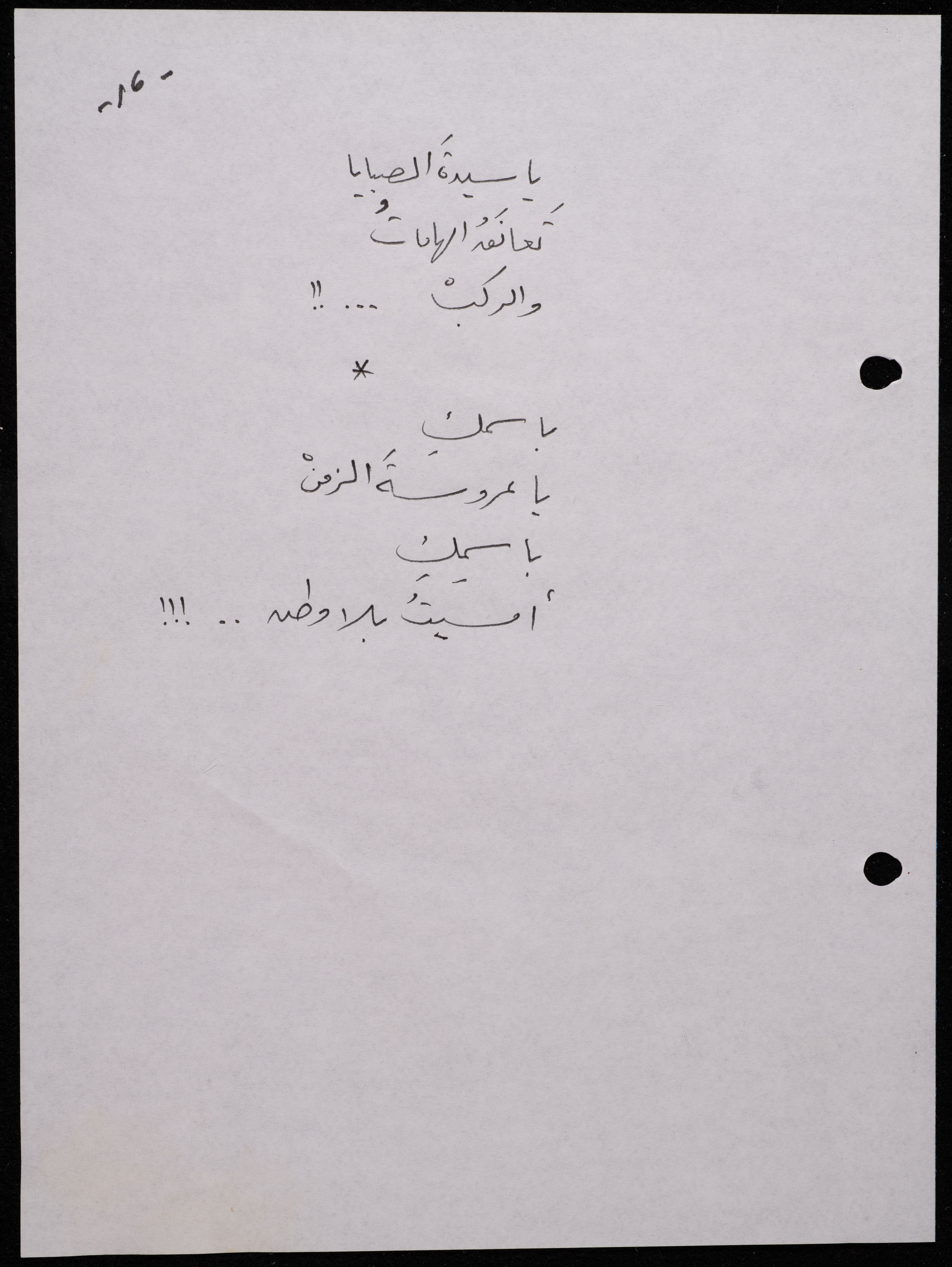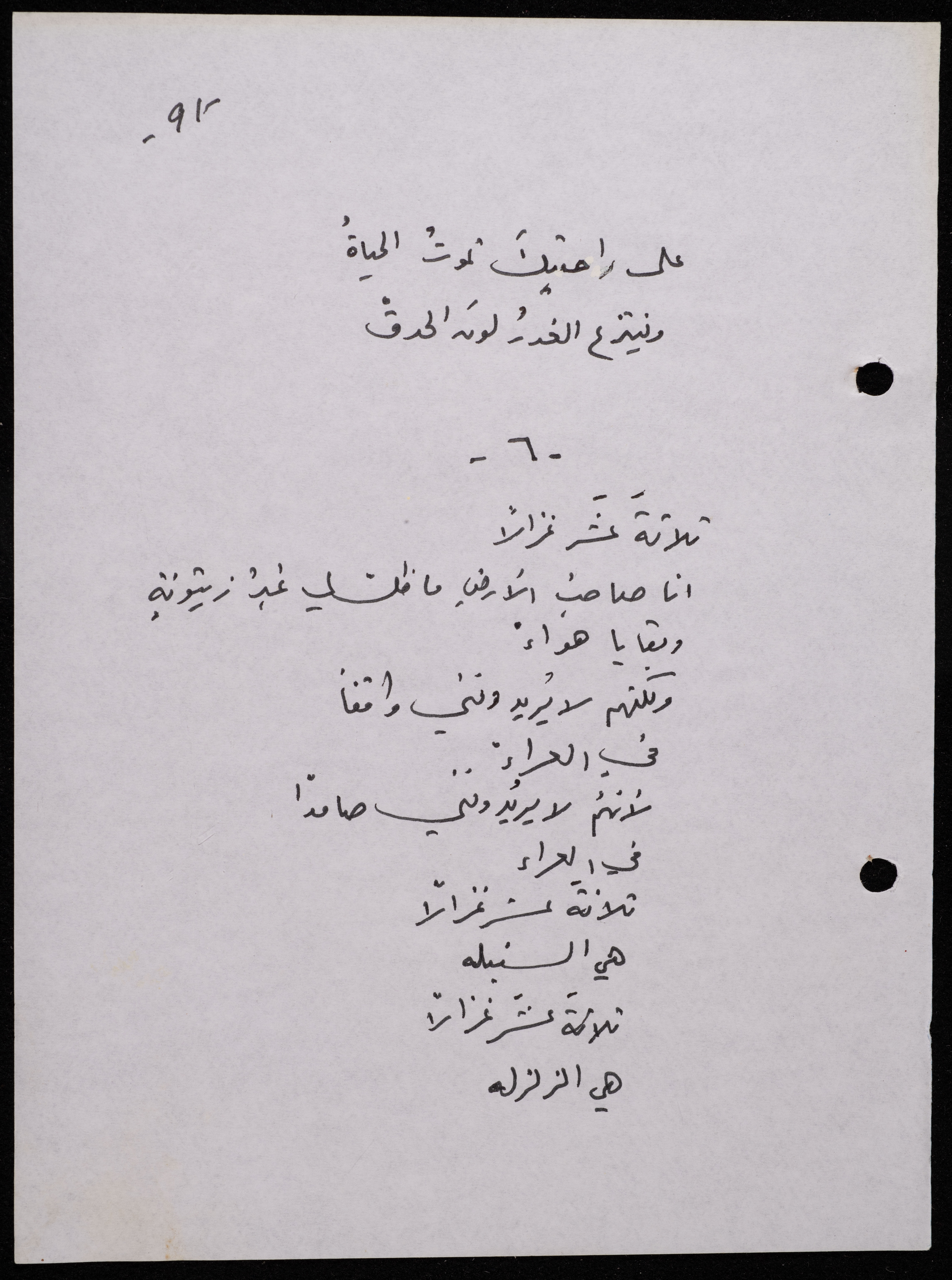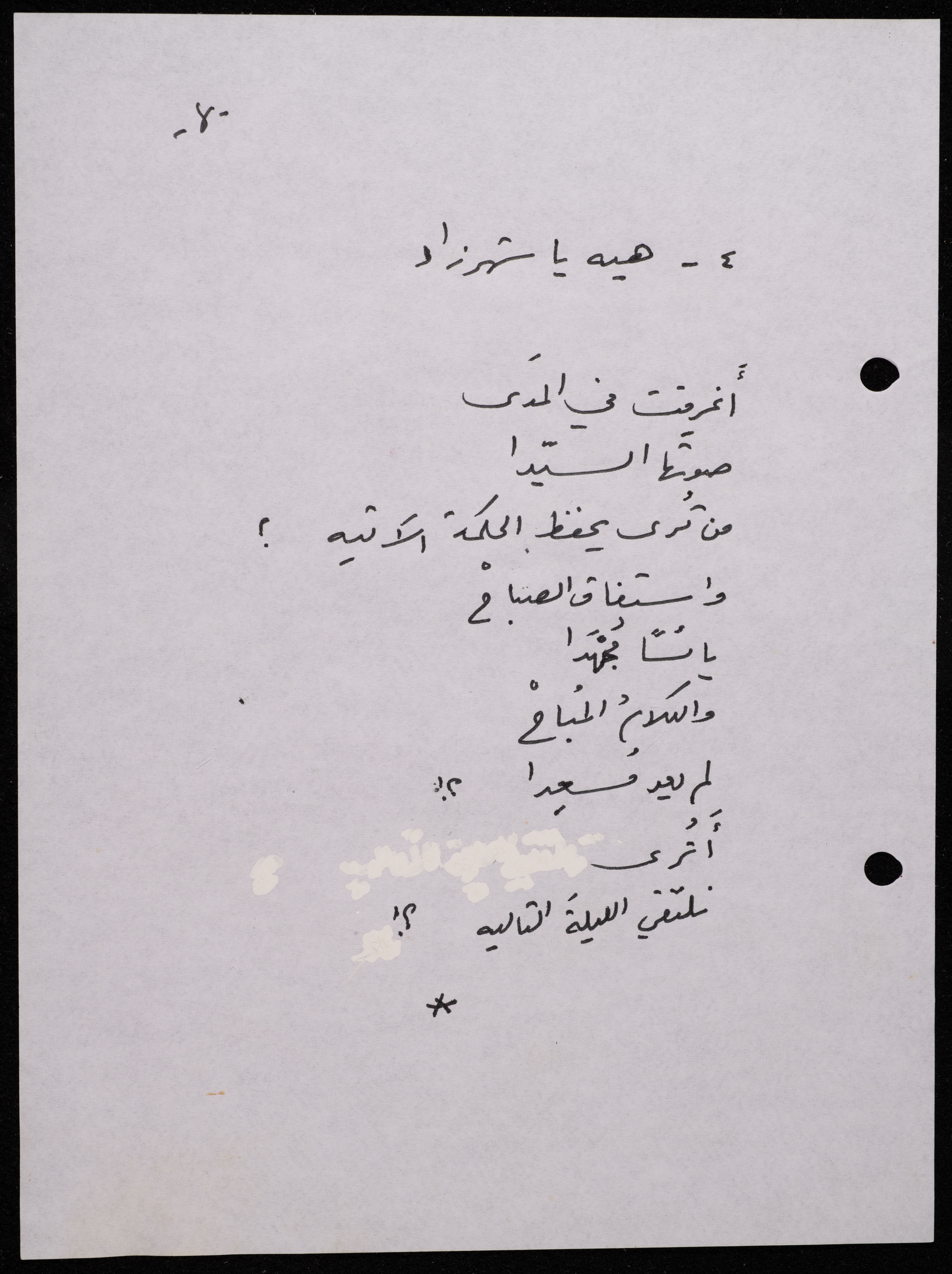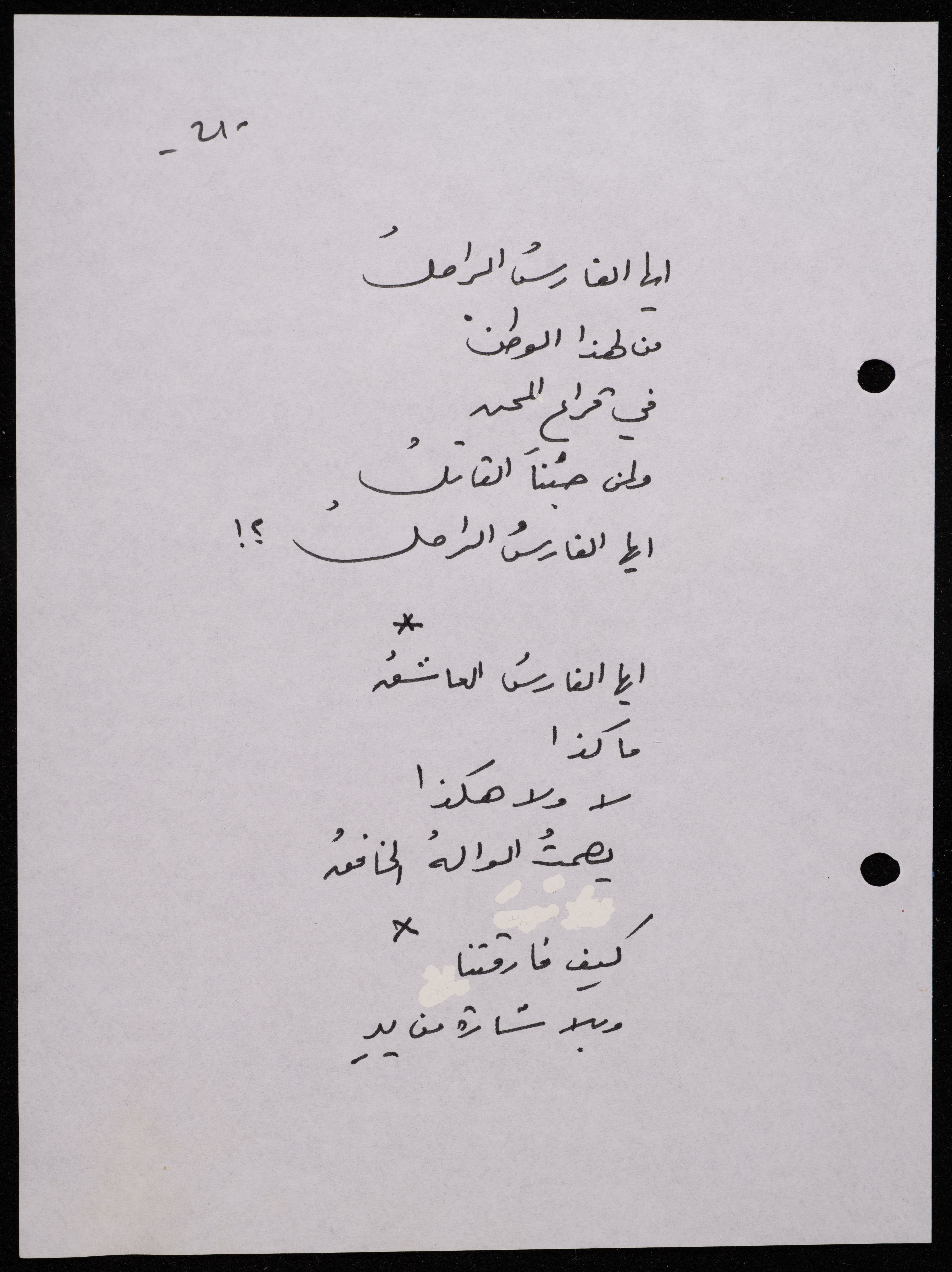 Handwritten, this 188-page archival item documents a poetry collection by Shakib Jahshan titled "Yotteloon Awsematan Min Shatha (They Come as Fragrant Medals)". The first section of the collection is titled "Kalimaton Fil-Asifa (Words In the Storm)", while the second is titled "Ihmeni Ya Abi (Protect Me, Father)".