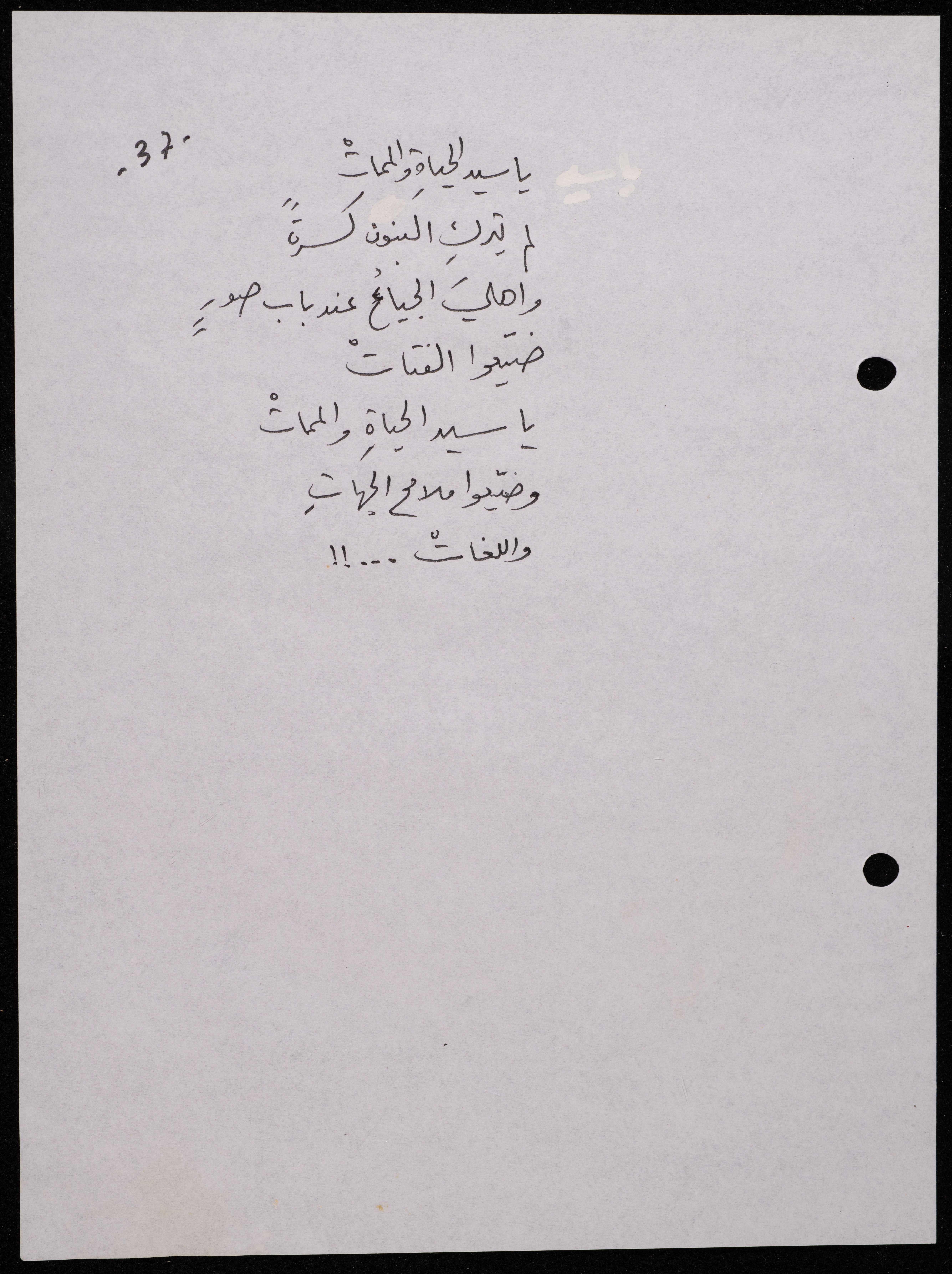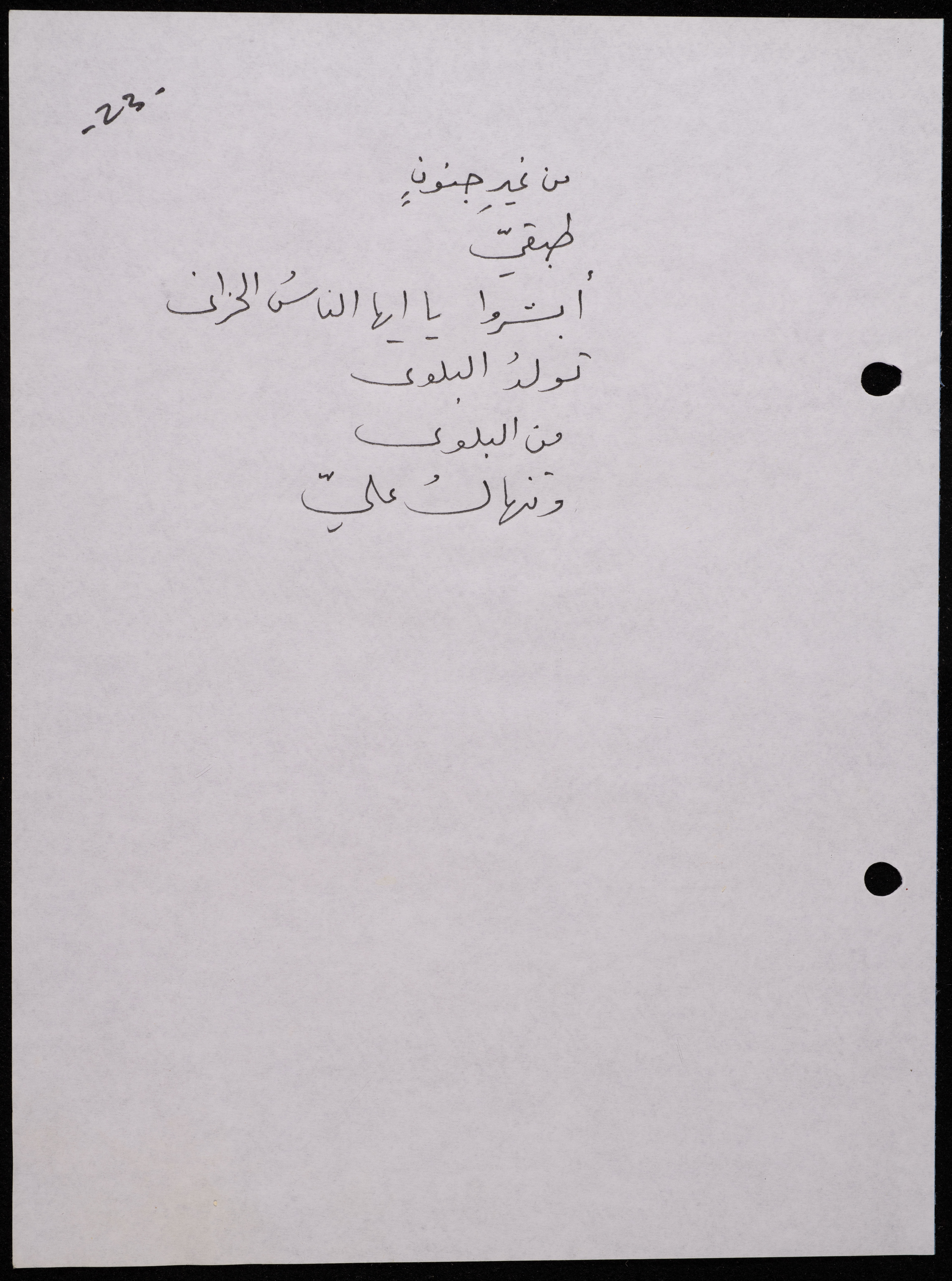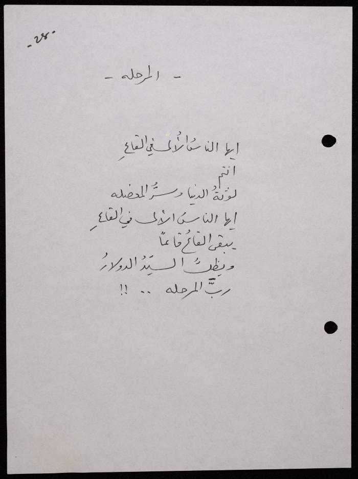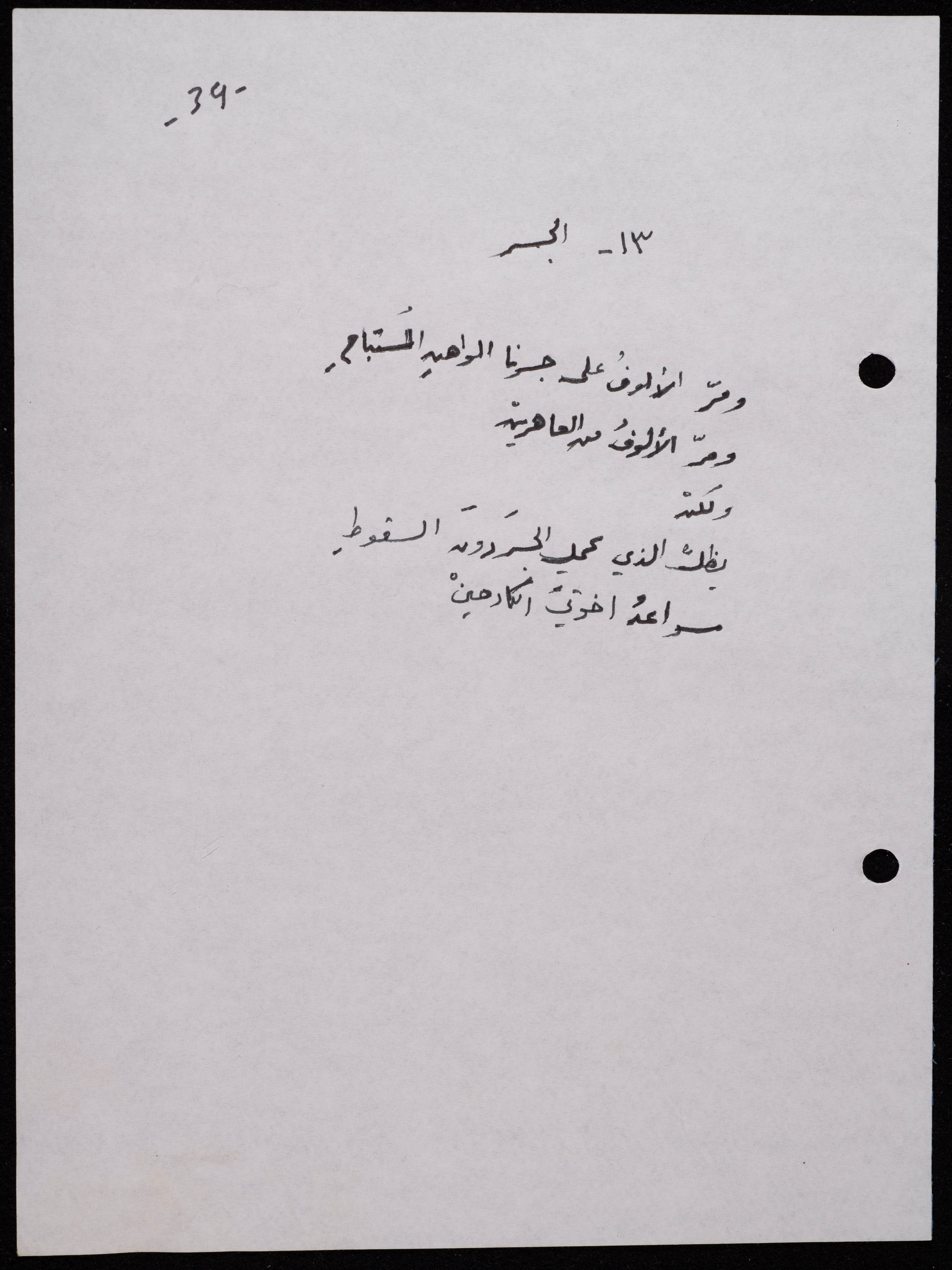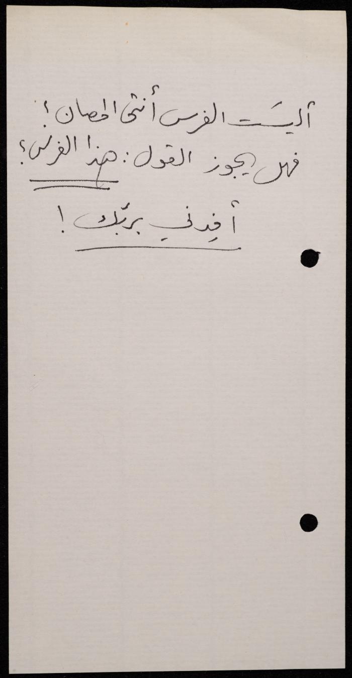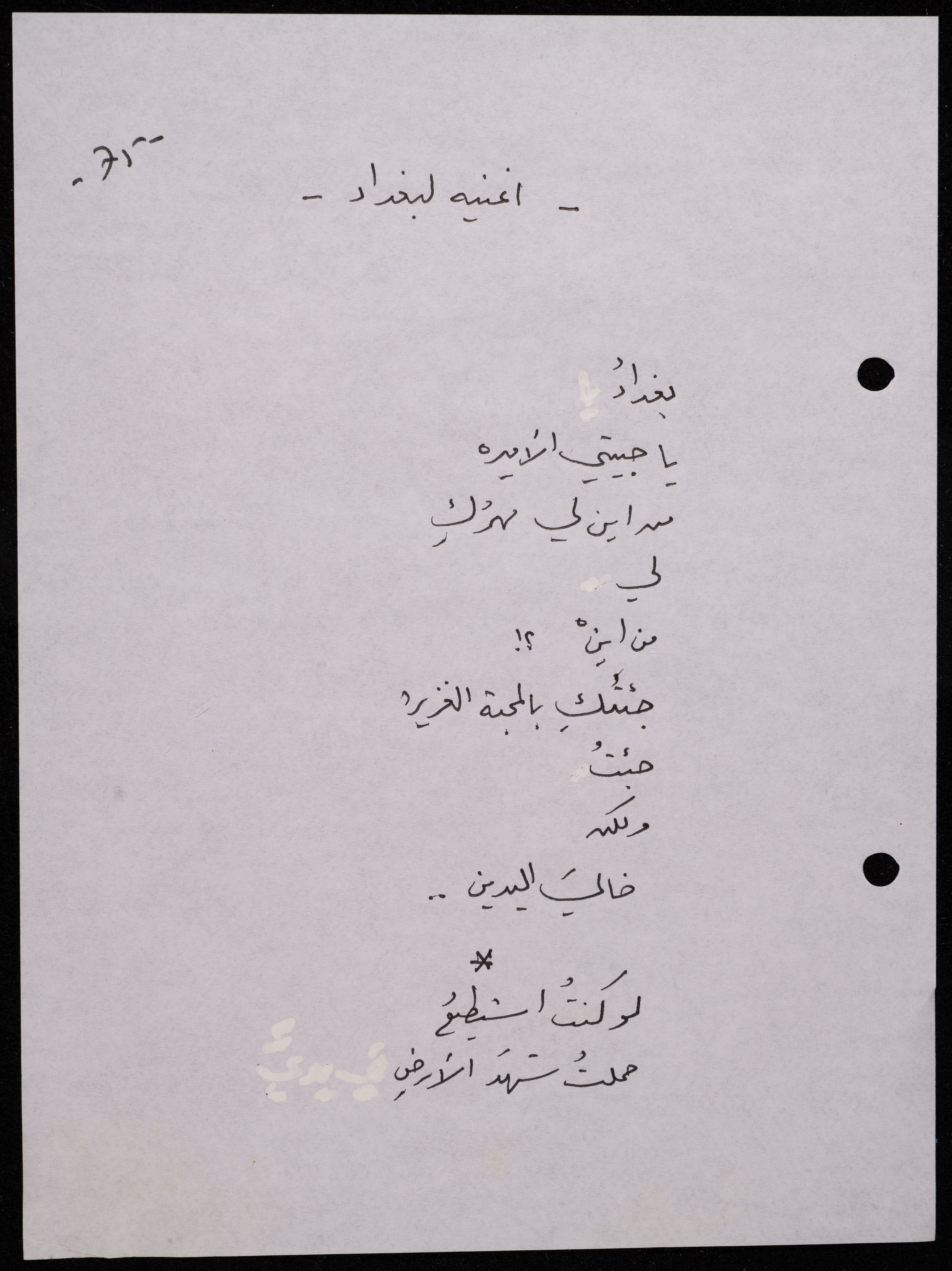 Handwritten, this 188-page archival item documents a poetry collection by Shakib Jahshan titled "Yotteloon Awsematan Min Shatha (They Come as Fragrant Medals)". The first section of the collection is titled "Kalimaton Fil-Asifa (Words In the Storm)", while the second is titled "Ihmeni Ya Abi (Protect Me, Father)".