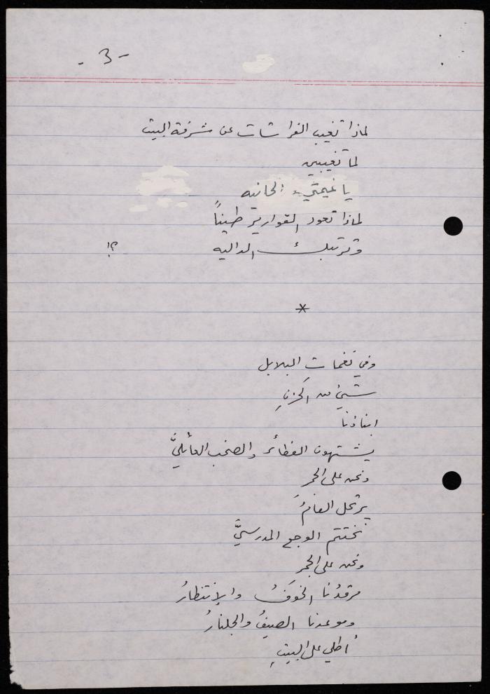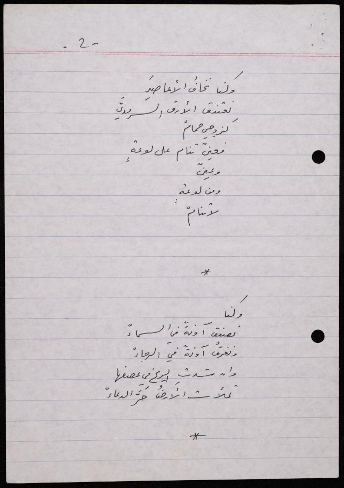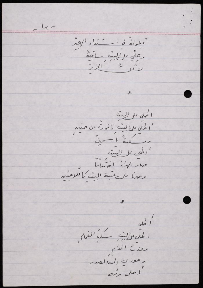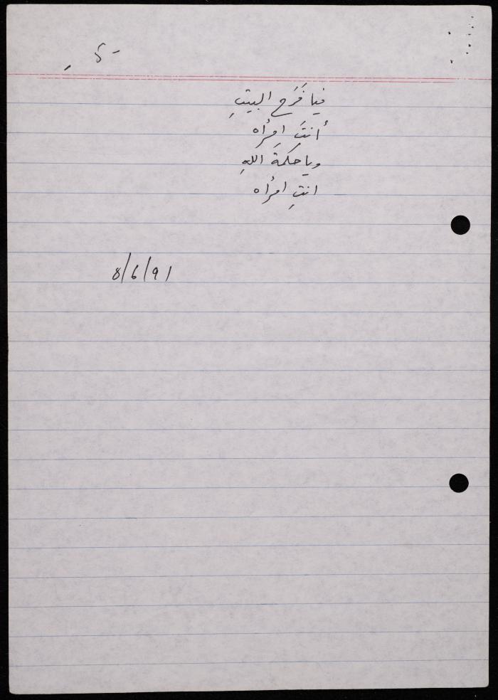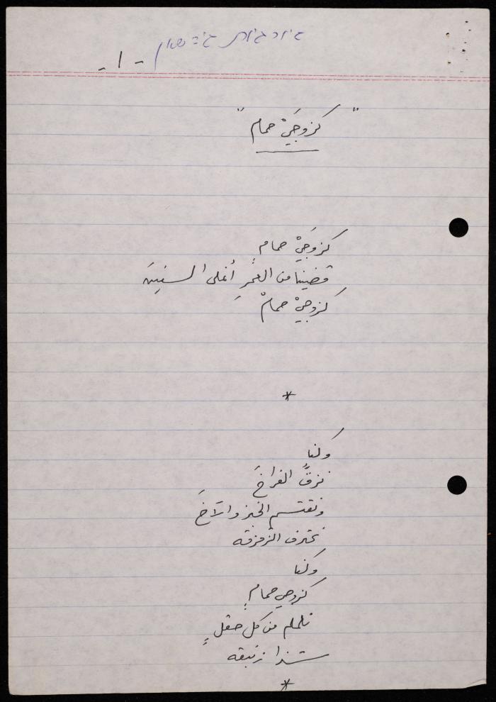 توثق هذه المادة الأرشيفية في 5 صفحات قصيدة لشكيب جهشان كتبت بخط اليد بعنوان "كزوجي حمام" بتاريخ 8 حزيران 1991.