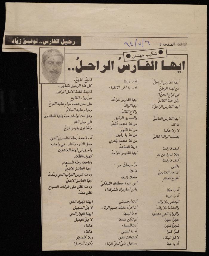 توثق هذه المادة الأرشيفية قصاصة من جريدة الاتحاد الصادرة بتاريخ 6 تموز 1994، واحتوت قصيدة لشكيب جهشان بعنوان "أيها الفارس الراحل".