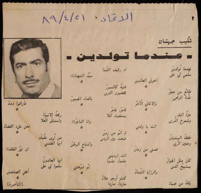 توثق هذه المادة الأرشيفية قصاصة من جريدة الاتحاد صادرة بتاريخ 21 نيسان 1989، احتوت قصيدة لشكيب جهشان بعنوان "عندما تولدين".
