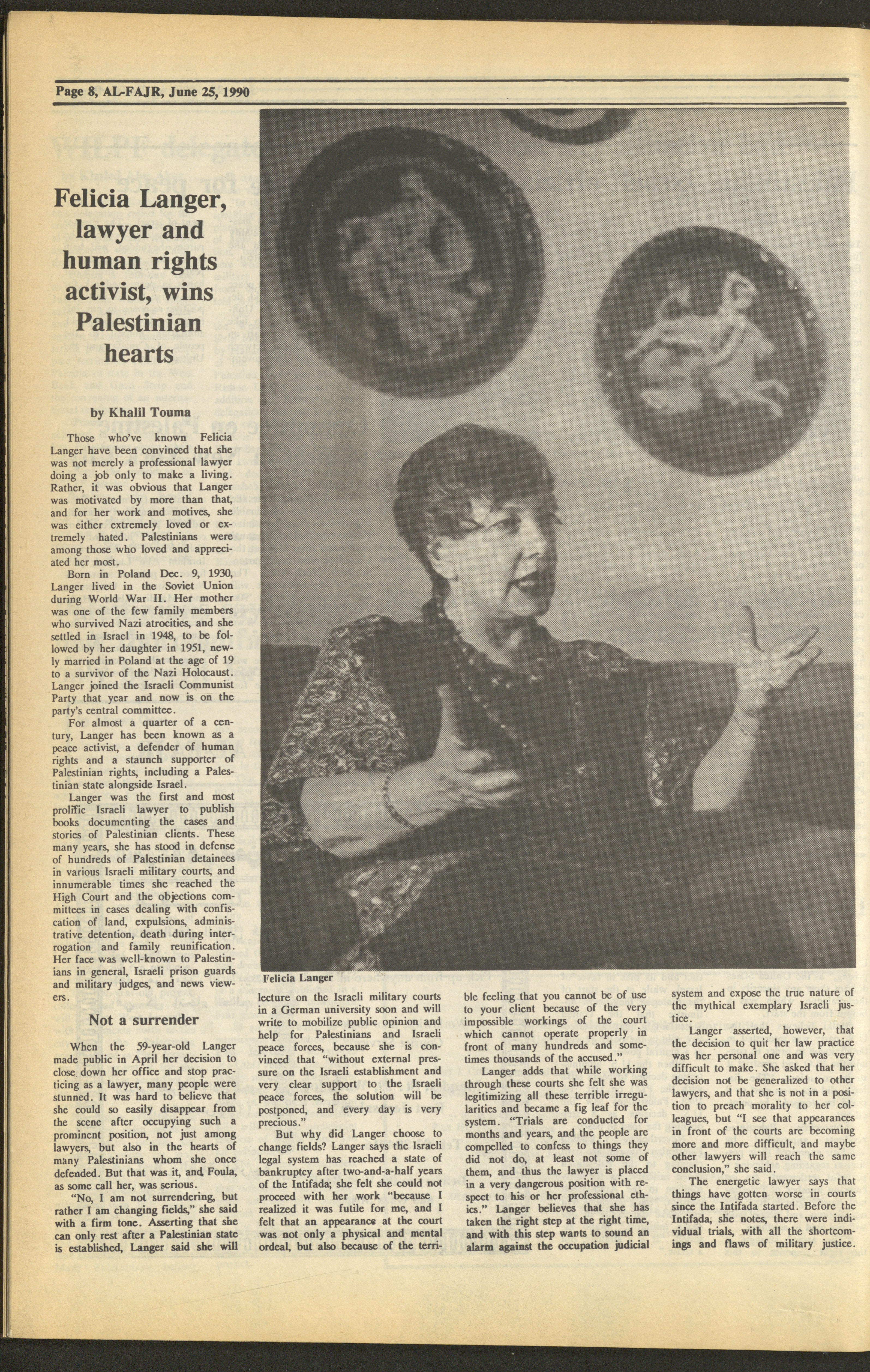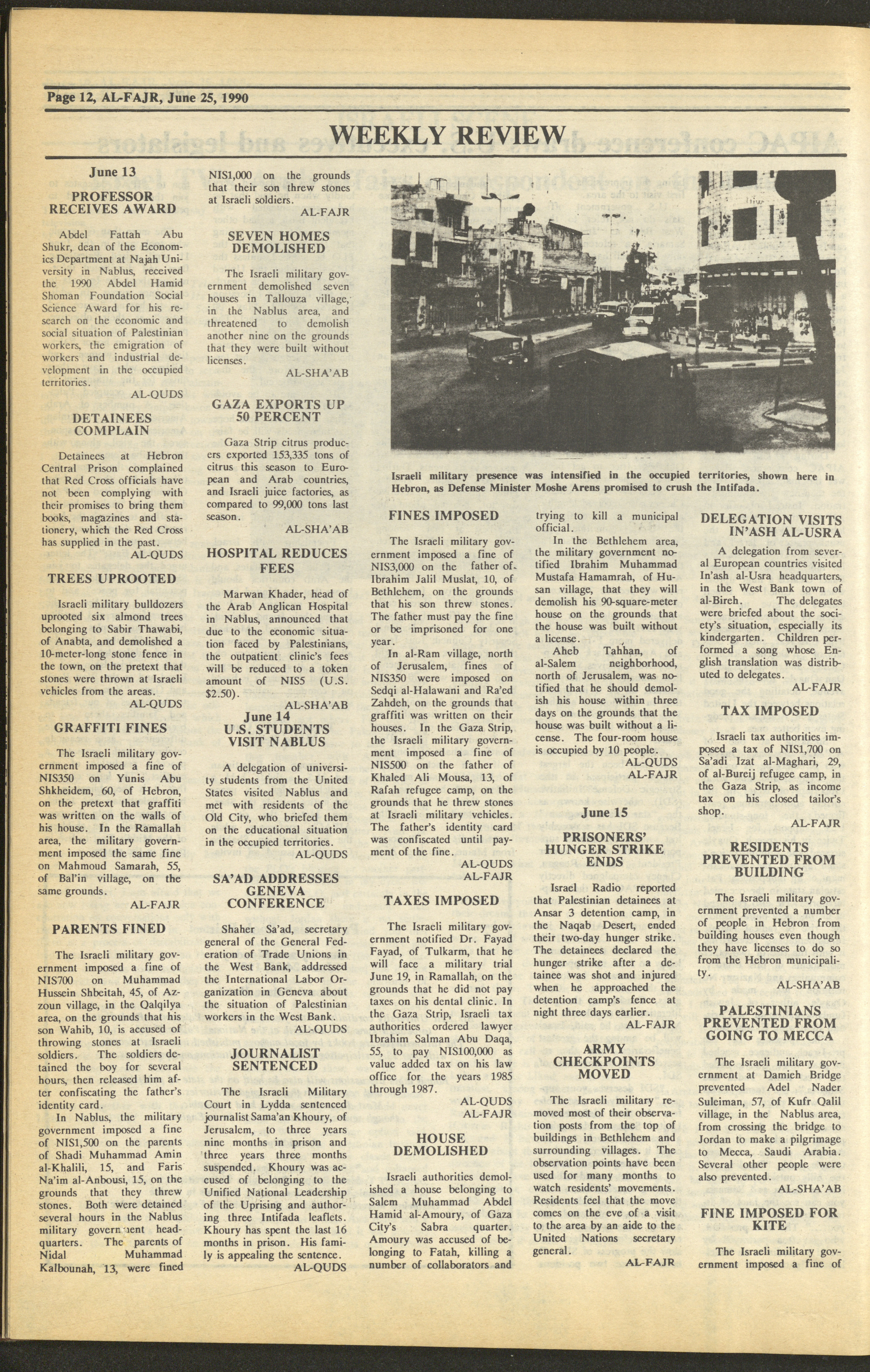 Issued in English on 25 June 1990, this document shows issue 527 of the weekly English version of al-Fajr Newspaper, which was the only English newspaper to be issued in the Palestinian Occupied Territories of 1948 since April 1980. The issue discusses several pieces of news, including the violations of the Israeli Occupation in the Palestinian Occupied Territories of 1948 during the First Intifada.