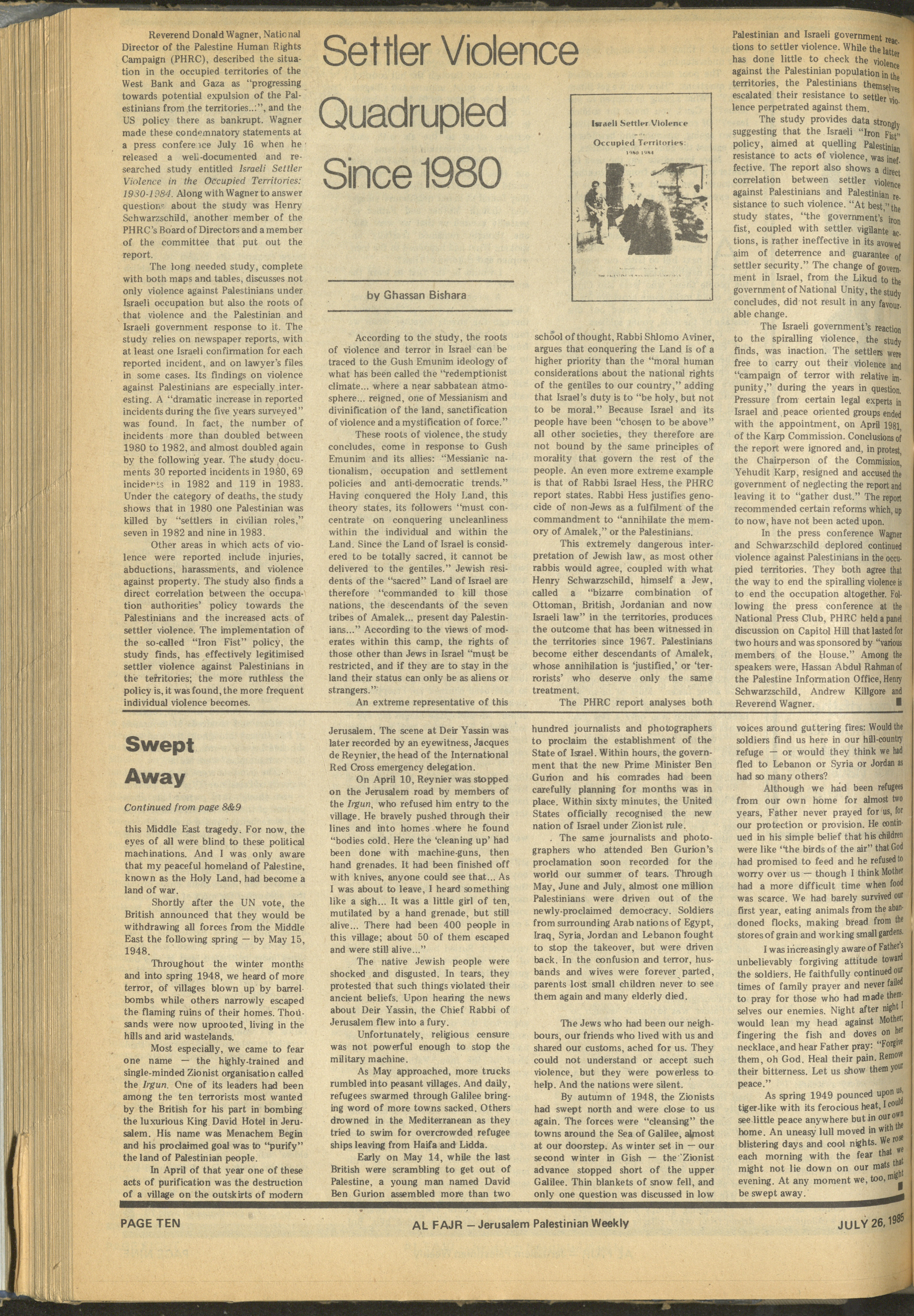 Issued in English on 26 July 1985, this document shows issue 273 of the weekly English version of al-Fajr Newspaper, which was the only English newspaper to be issued in the Palestinian Occupied Territories of 1948 since April 1980. The issue discusses several pieces of news, including the violations of the Israeli Occupation in the Palestinian Occupied Territories of 1948 during the First Intifada.