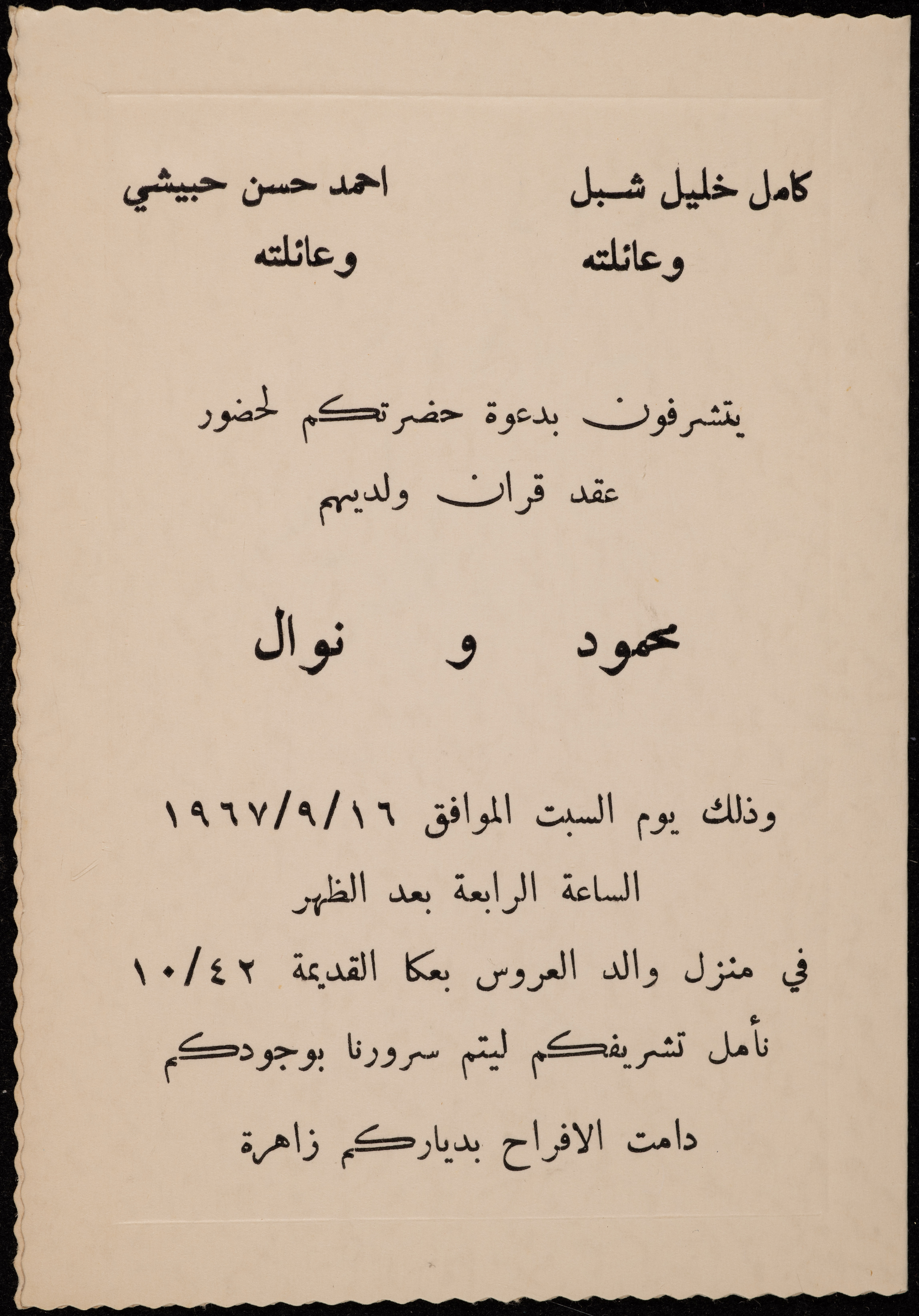 دعوة لحضور عقد قران نوال حبيشي ومحمد شبل بتاريخ 16 أيلول 1967، وذلك في منزل والد العروس في عكا القديمة.