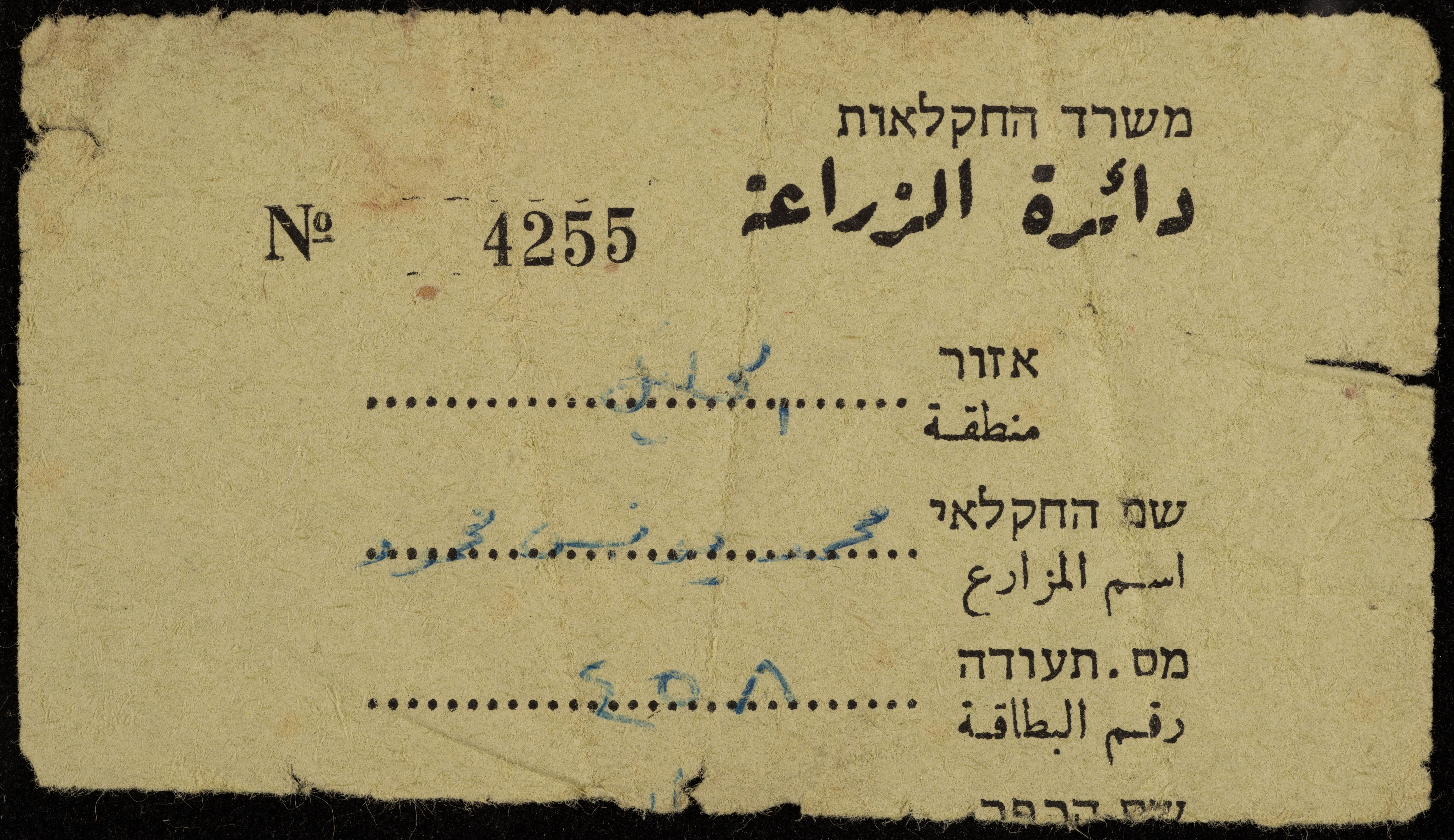 A Farmer's Card for Mohammad Mohammad, Hebron, the 1970s