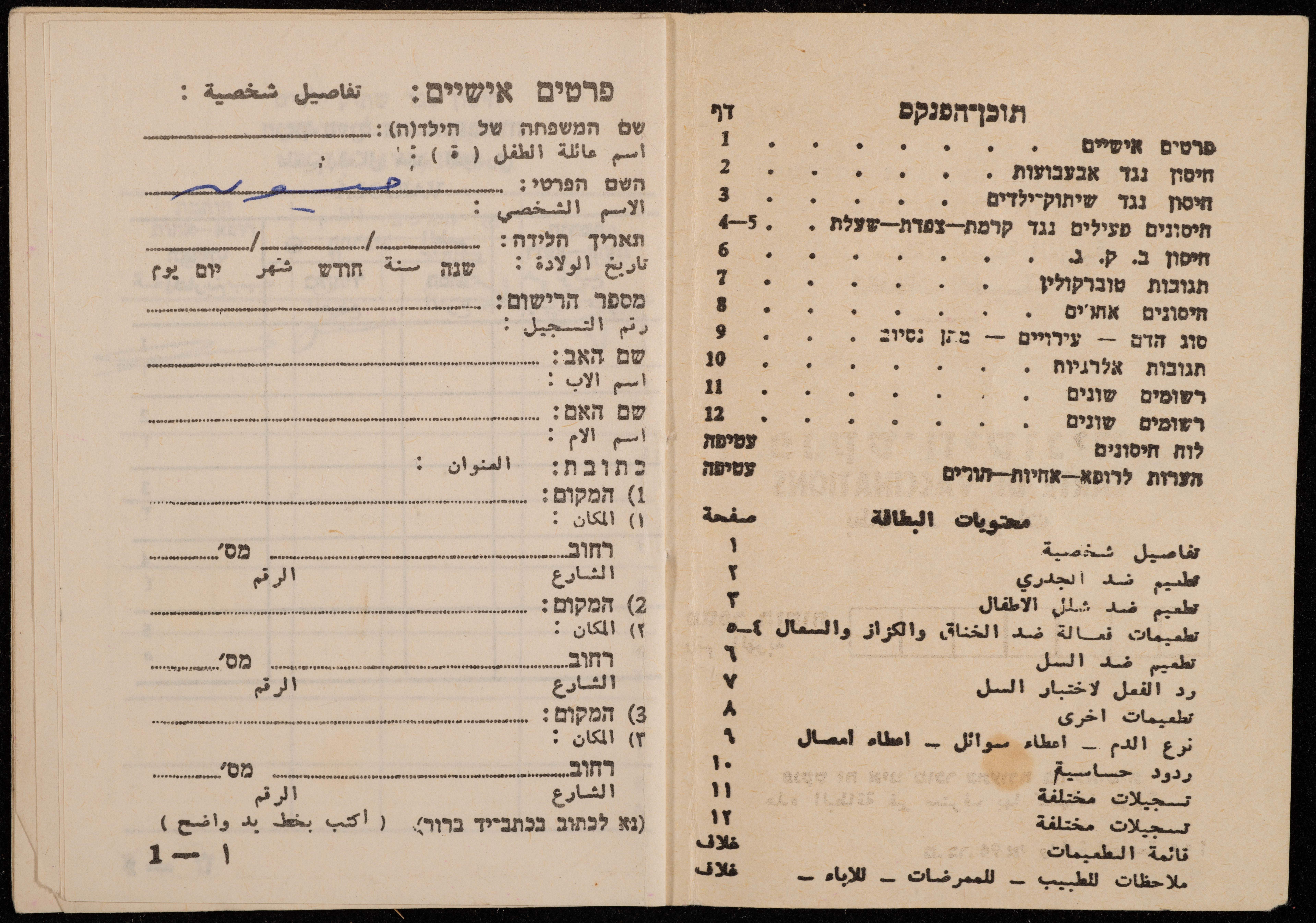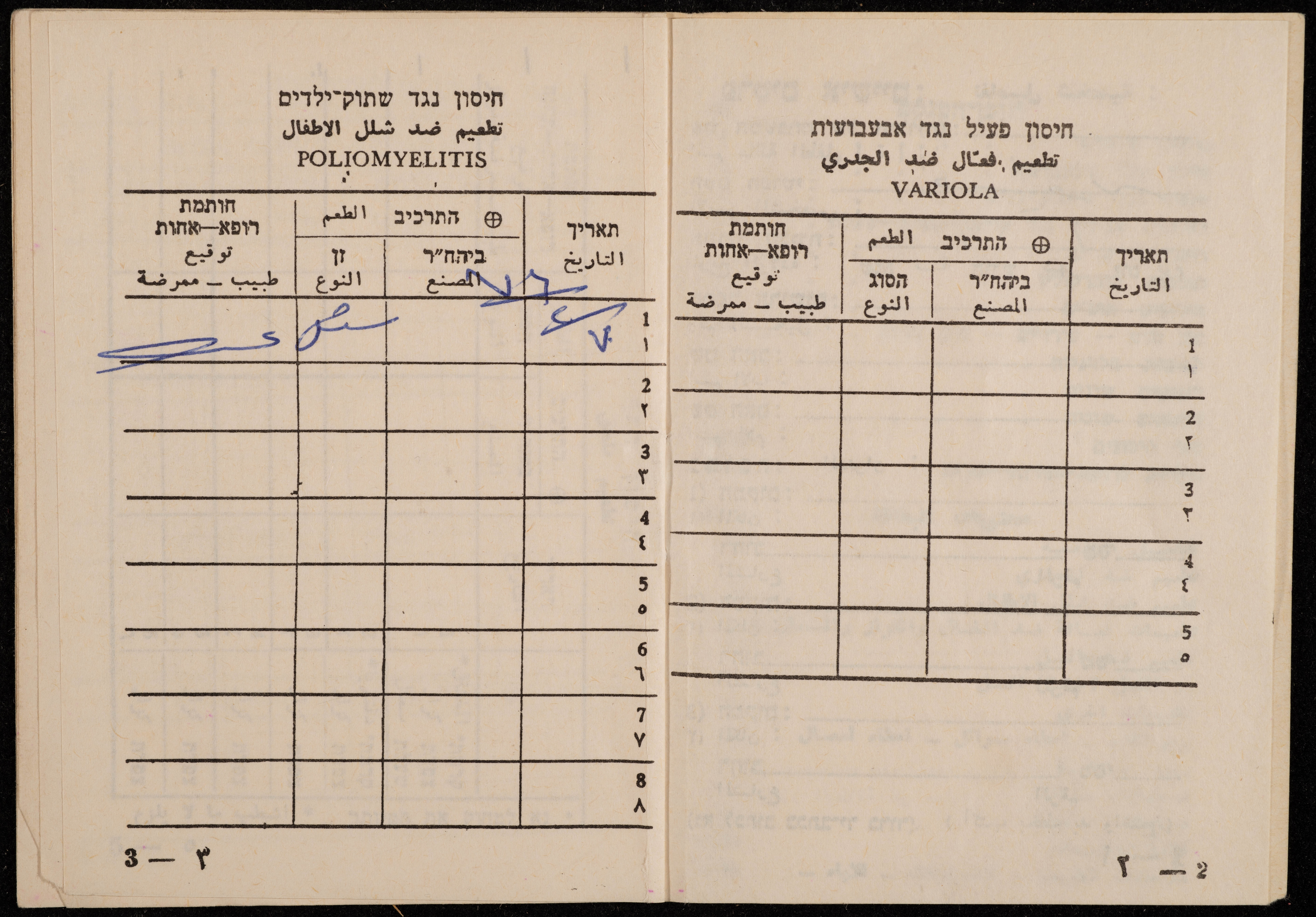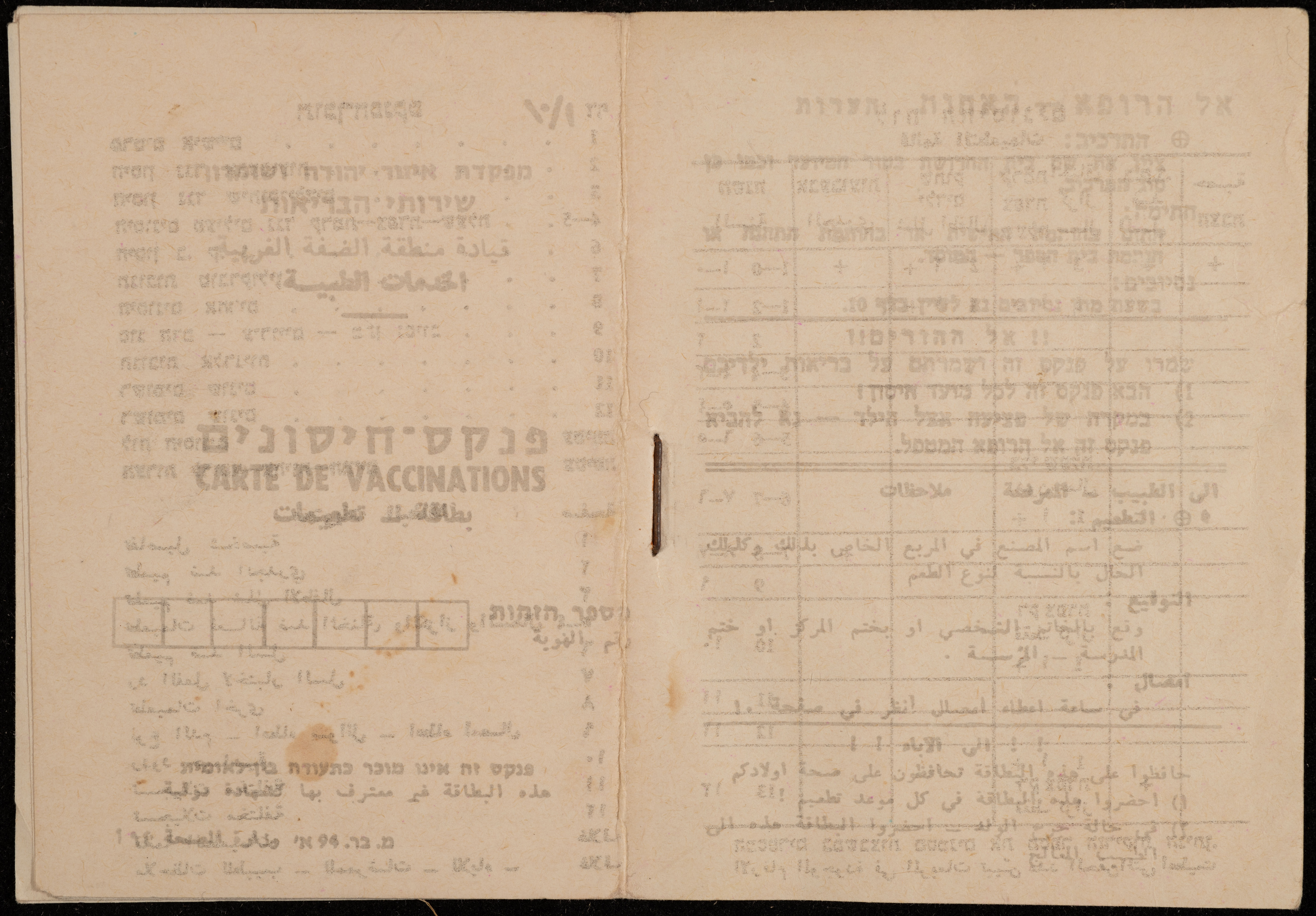 Issued by the health services of the Civil Administration, this document shows a vaccination card in the name of Maysoun, a child from the village of Jinba, that included that the child received her poliomyelitis vaccine on 7 February 1976.