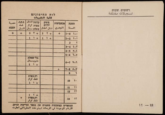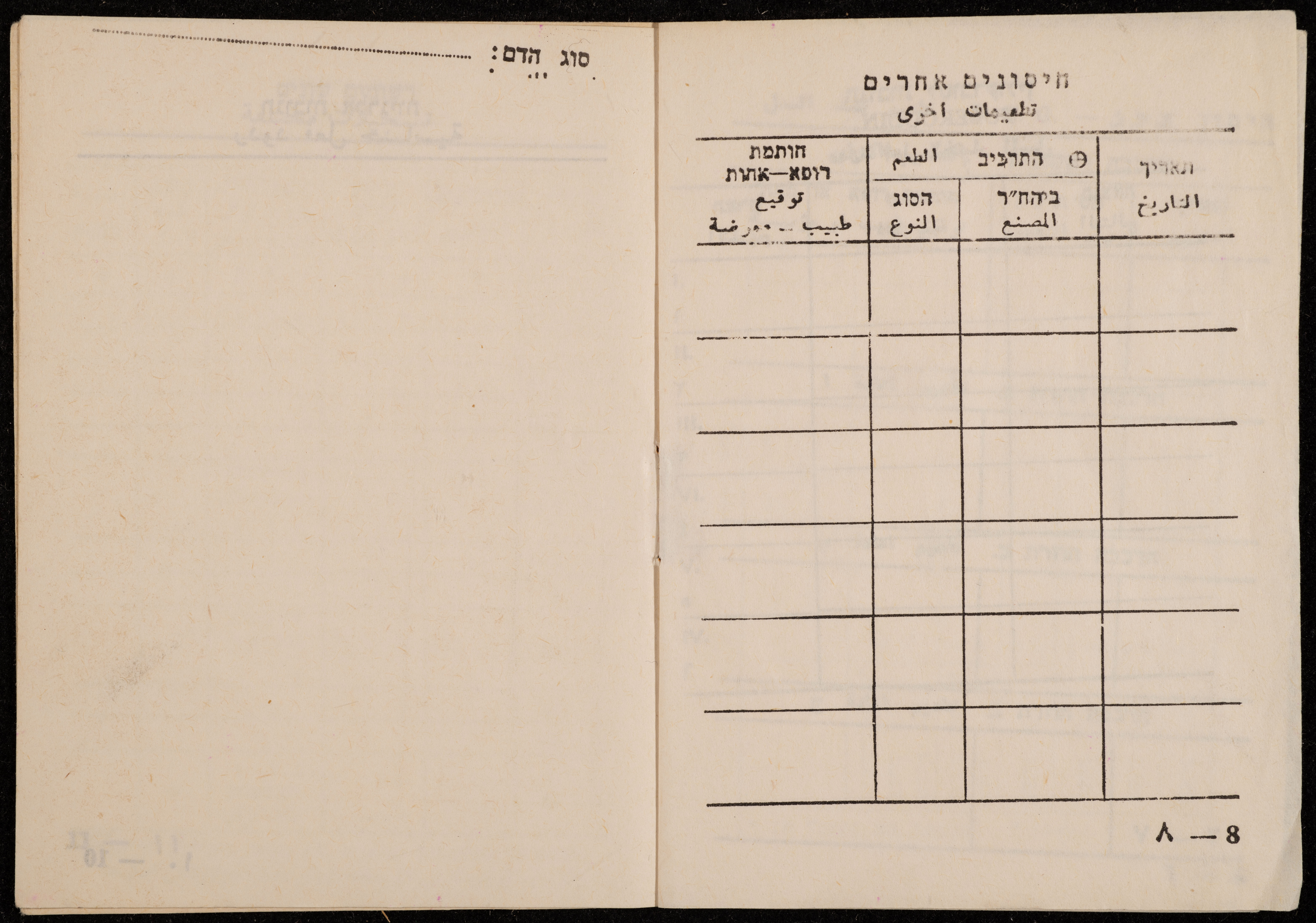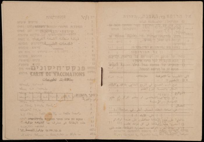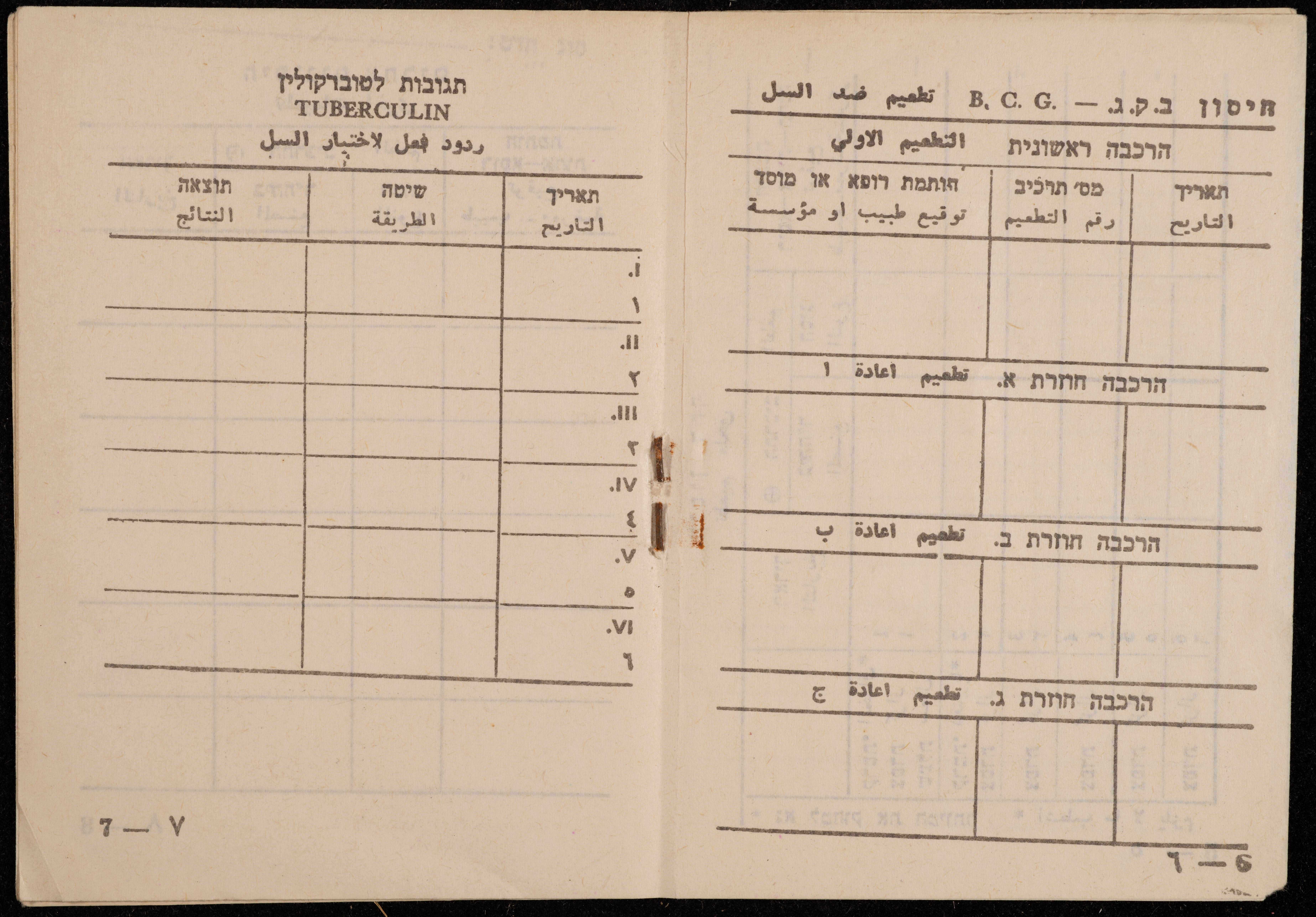Issued by the health services of the Civil Administration, this document shows a vaccination card in the name of Maysoun, a child from the village of Jinba, that included that the child received her poliomyelitis vaccine on 7 February 1976.