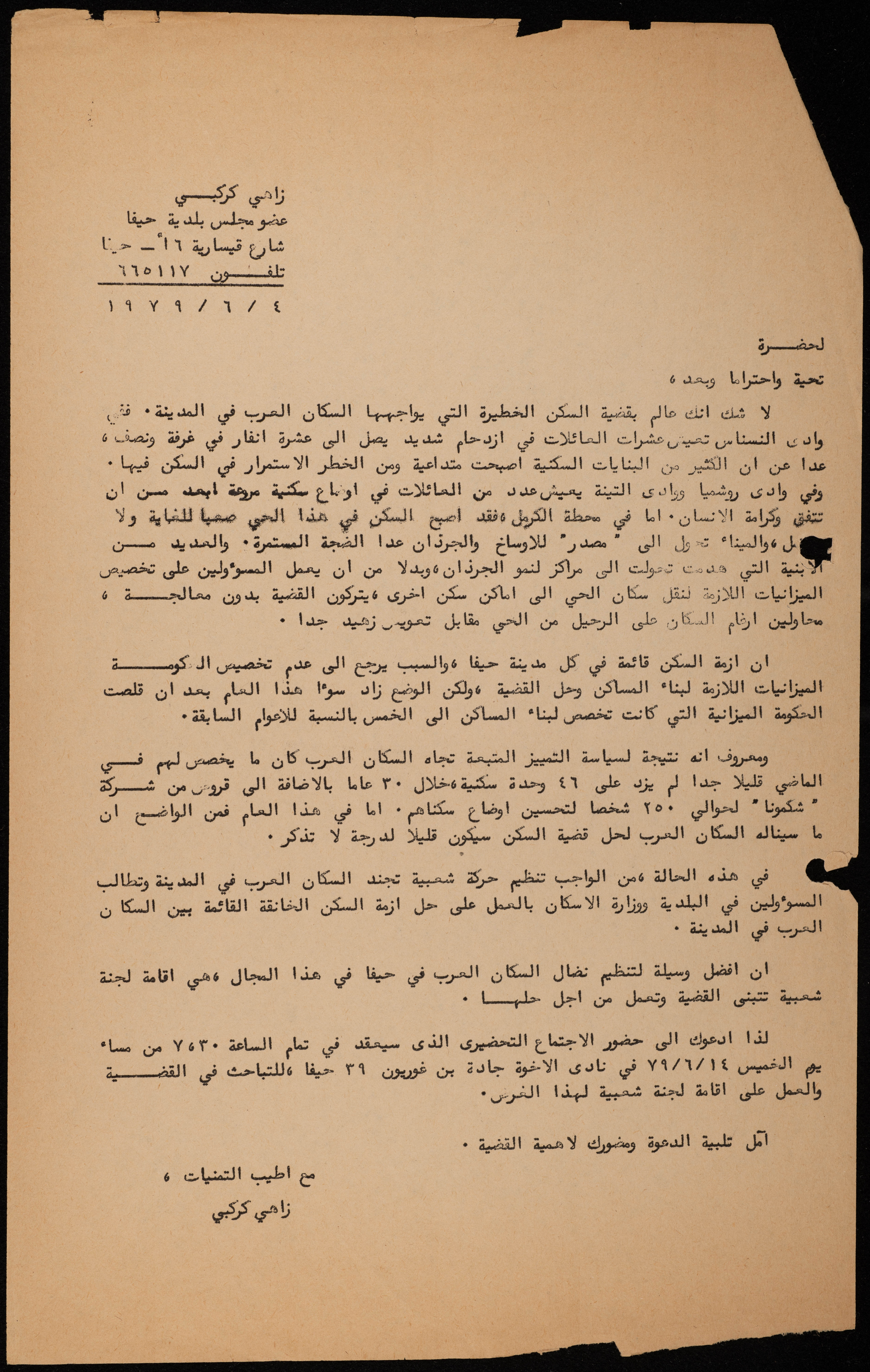 Sent on 4 June 1979, this document shows a letter from Zahi Karkabi, a member of the Haifa municipality, containing an invitation to a preparatory meeting regarding the issue of Arab housing in Haifa.