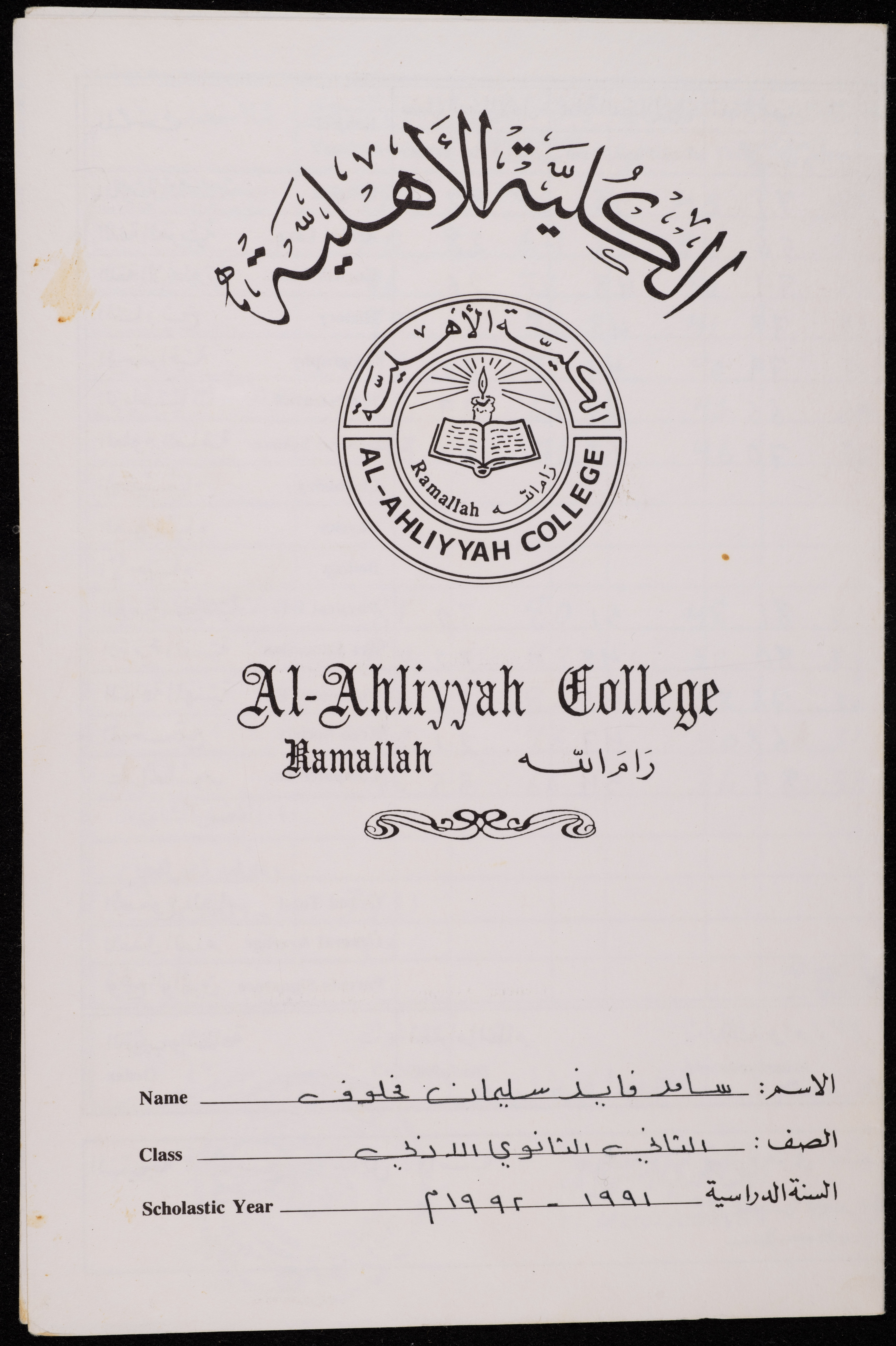 تقرير علامات مباحث الصف الثاني الثانوي أدبي للطالب سامر مخلوف، صدر عن مدرسة الكلية الأهلية في رام الله للسنة الدراسية 1991-1992.