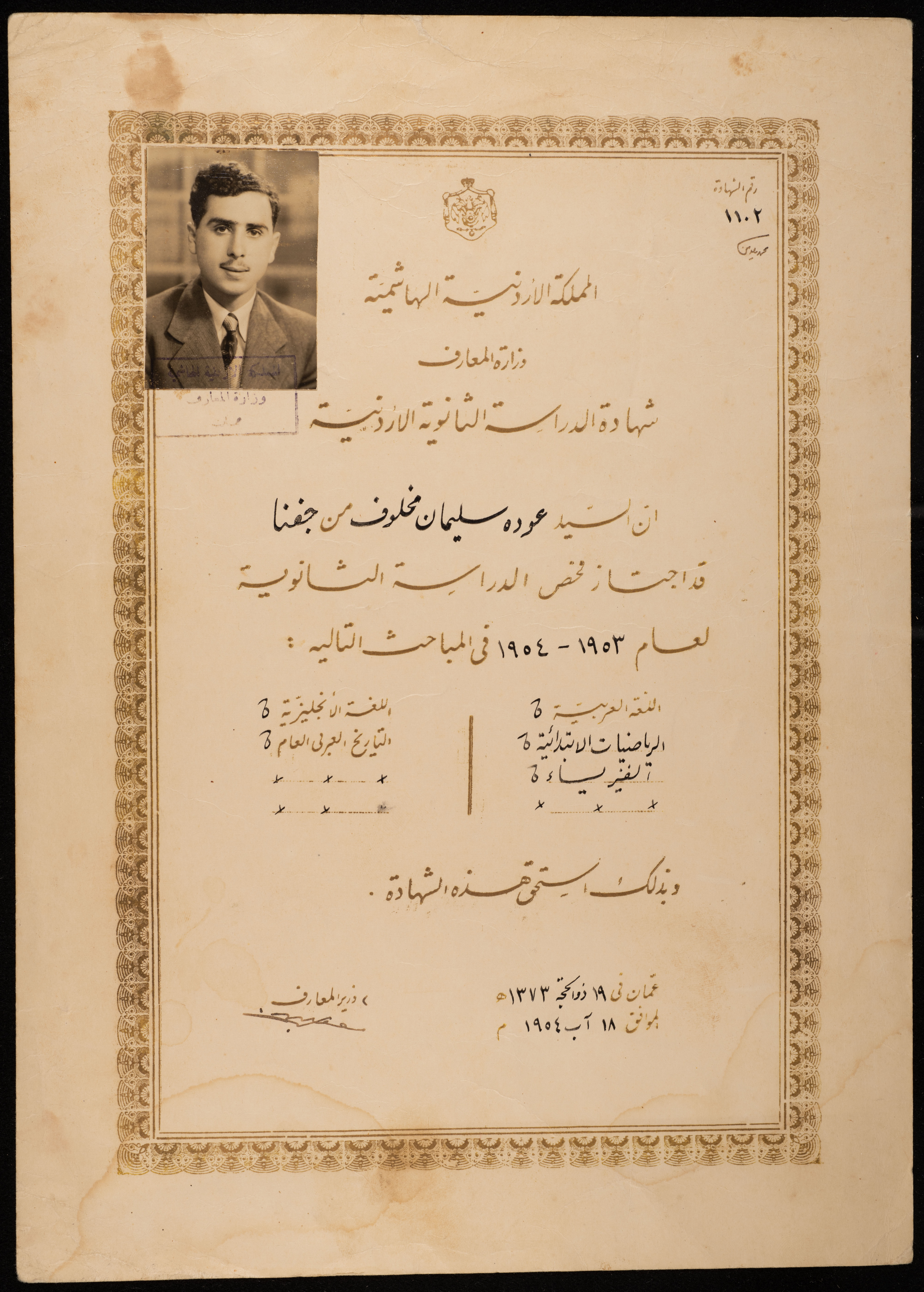 شهادة الدراسة الثانوية لعودة سليمان مخلوف من جفنا، صادرة عن المملكة الأردنية الهاشمية بتاريخ 18 آب 1954.