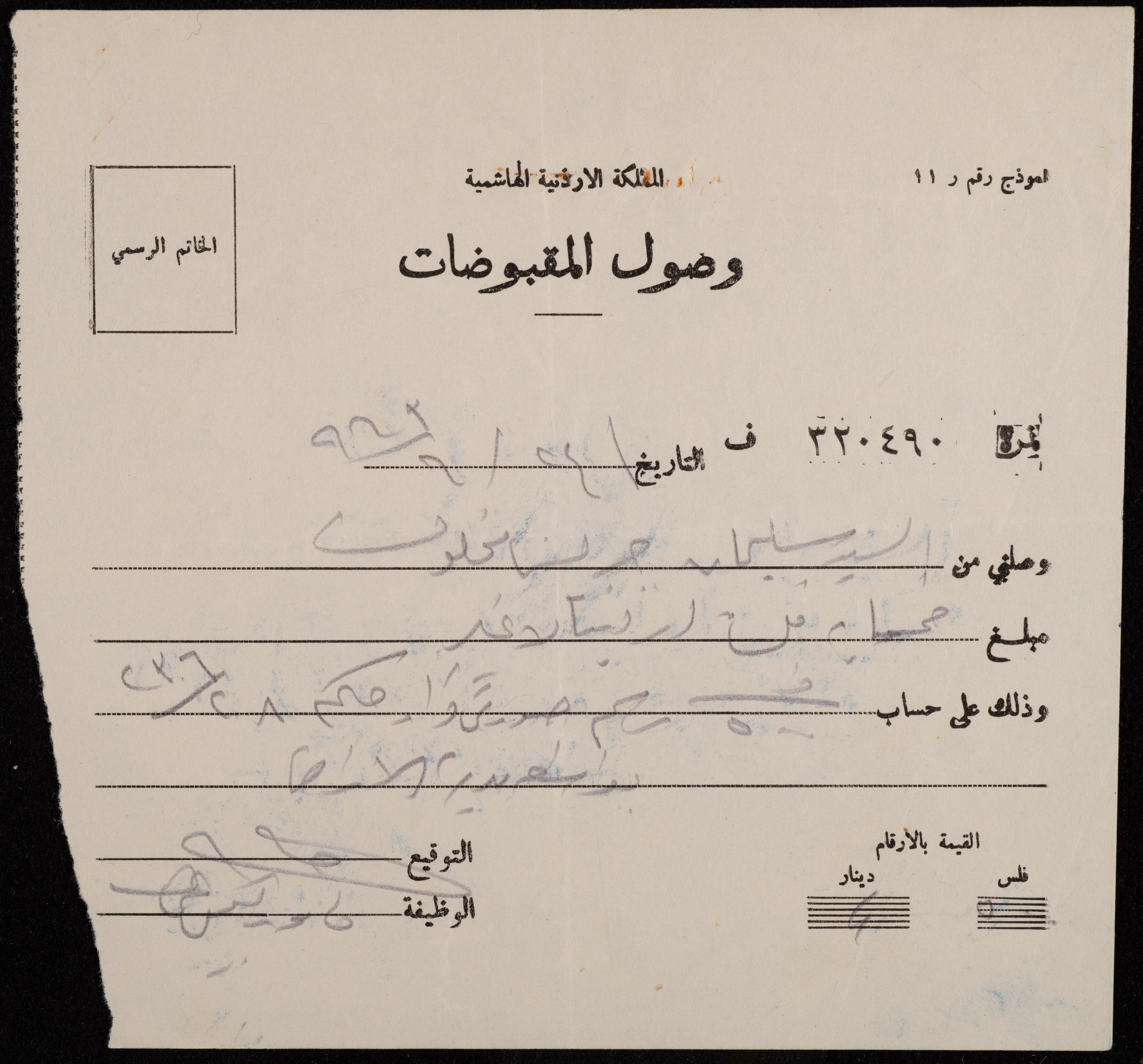 وصل قبض صادر عن المملكة الأردنية الهاشمية بتاريخ 24 حزيران 1963، دفع بموجبه سليمان جريس مخلوف مبلغًا ماليًا بقيمة 500 فلس.