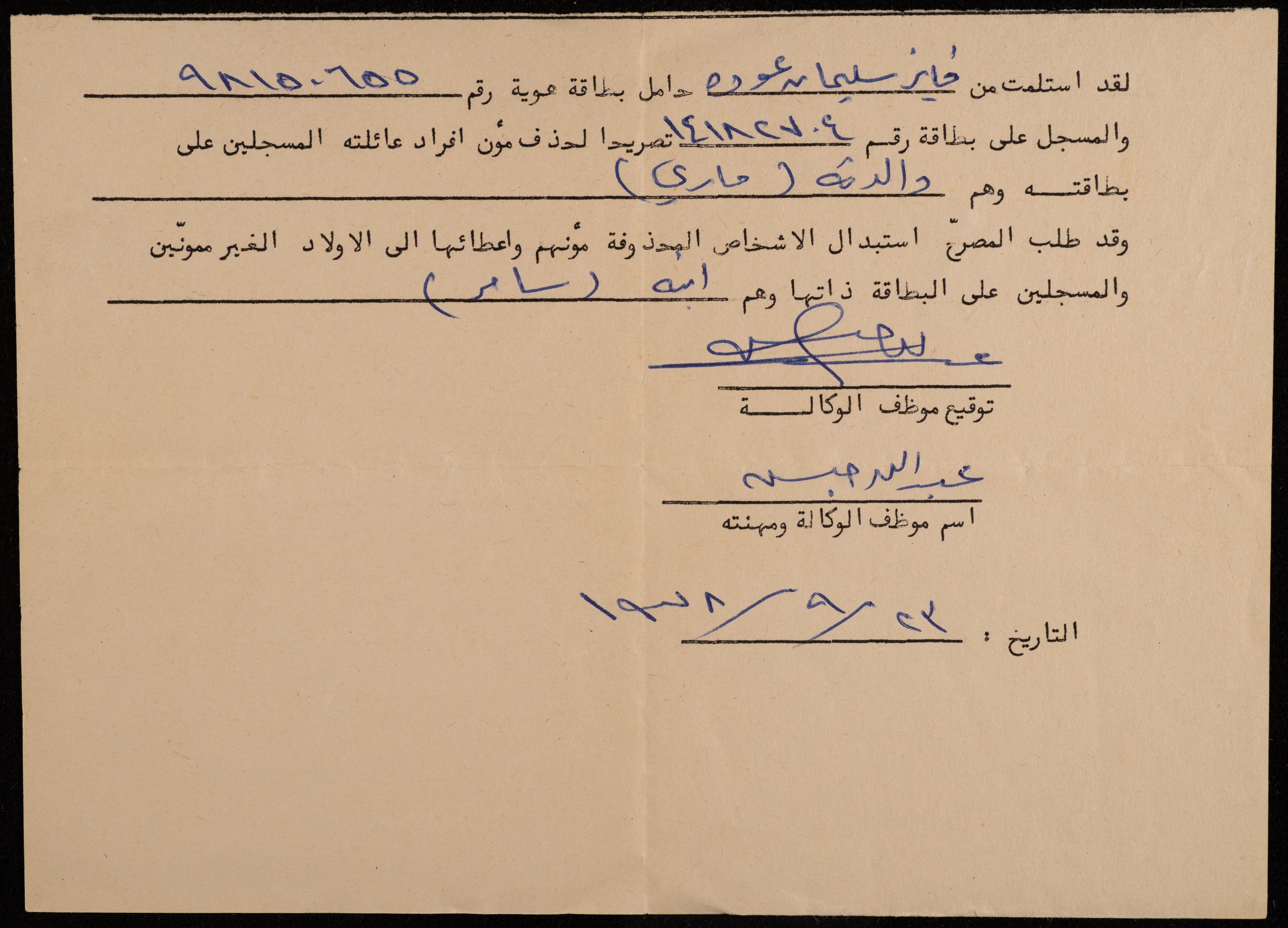 Dated 23 September 1978, this document shows a receipt deed, according to which Abdullah Hussein, an employee of the United Nations Relief and Works Agency for Palestine Refugees "UNRWA", received permission from Fayez Suleiman Odeh to stop the supplies intended for his mother and give them to his son, Samer.
