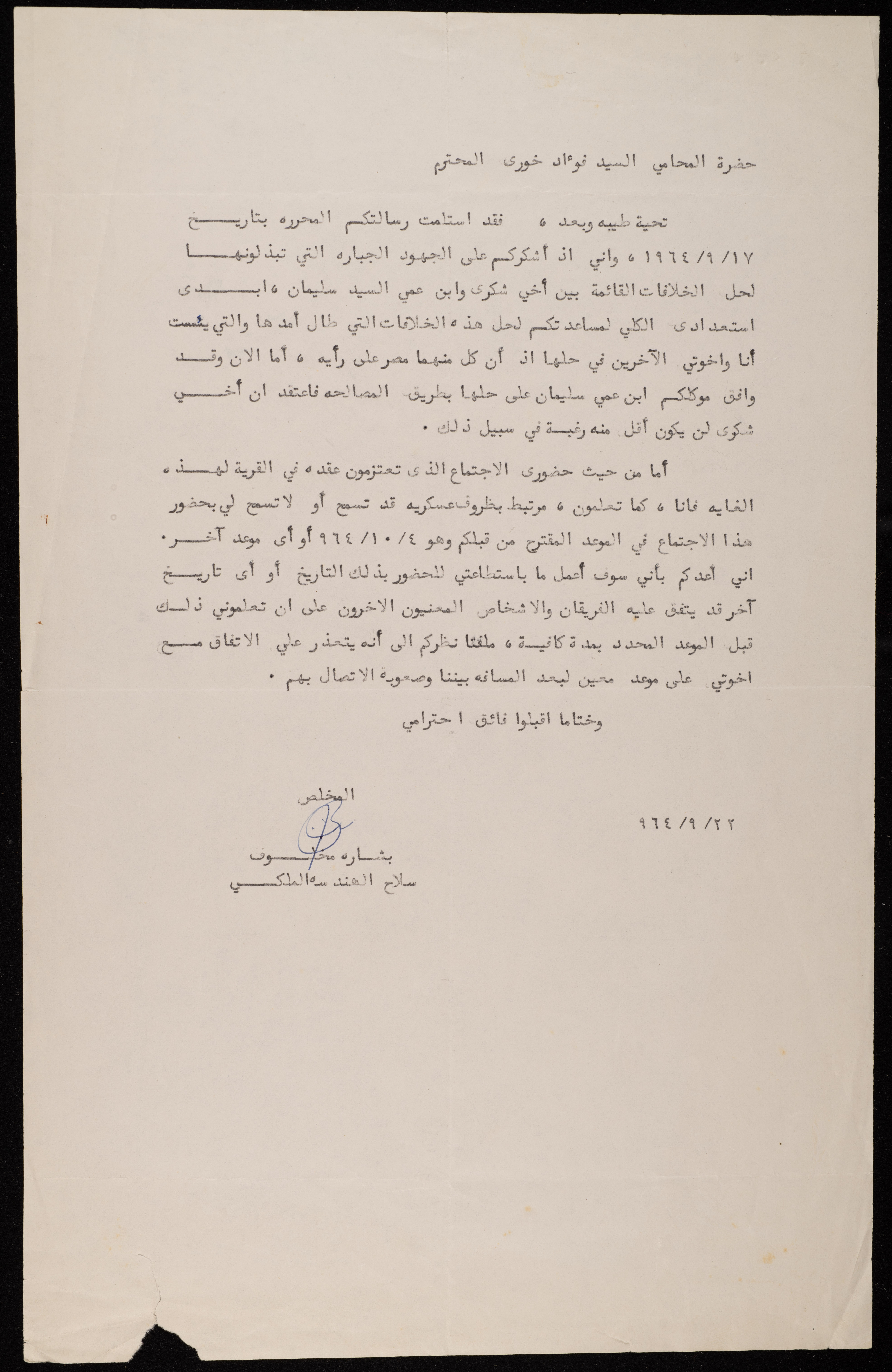 Sent on 22 September 1964, this document shows a letter from Bshara Makhlouf to lawyer Fouad Khoury, thanking him for the effort he made to resolve the dispute between his brother Shukri and his cousin Suleiman, and then discussed the issue of his attendance at the meeting scheduled to be held in the village of Jifna.