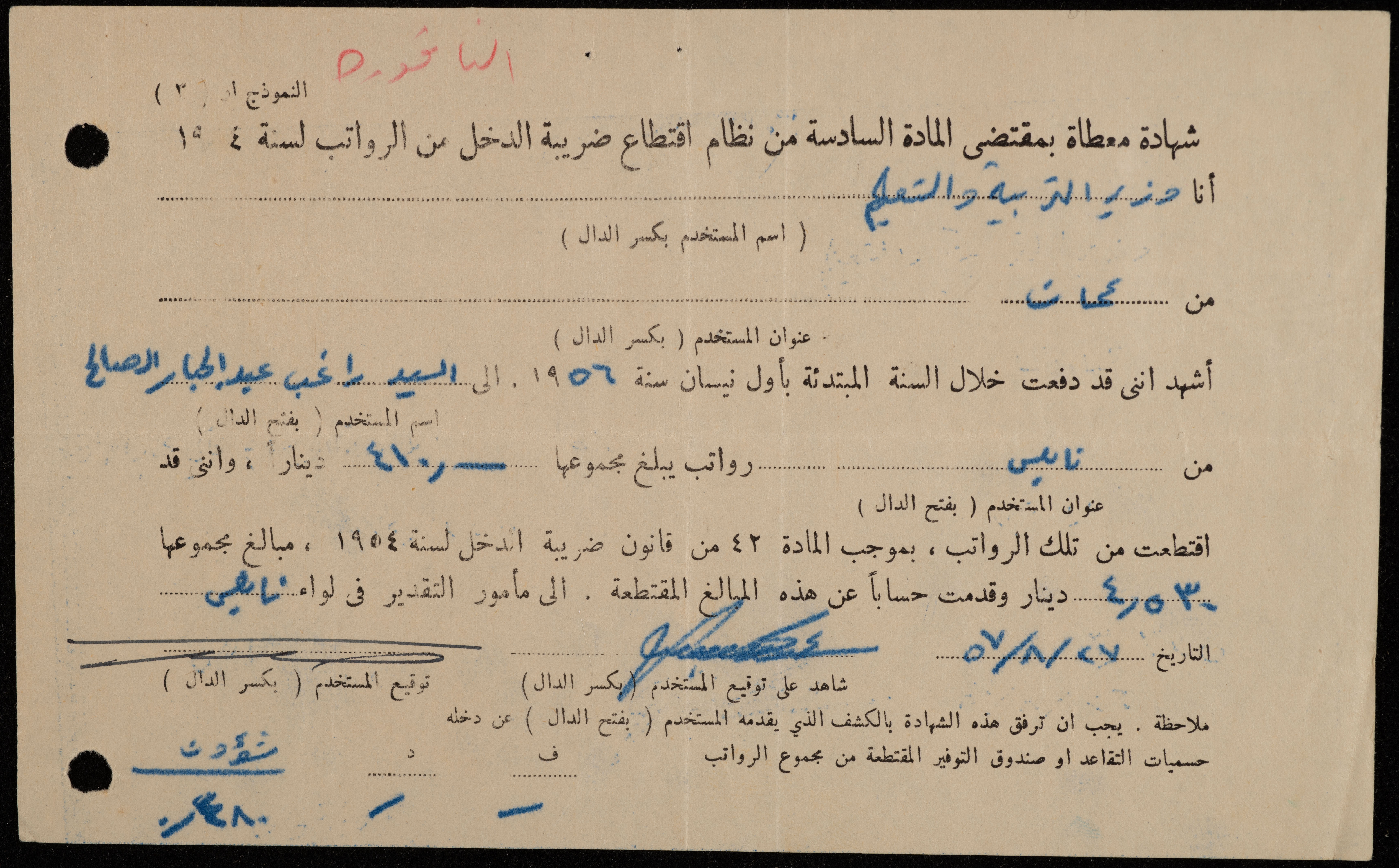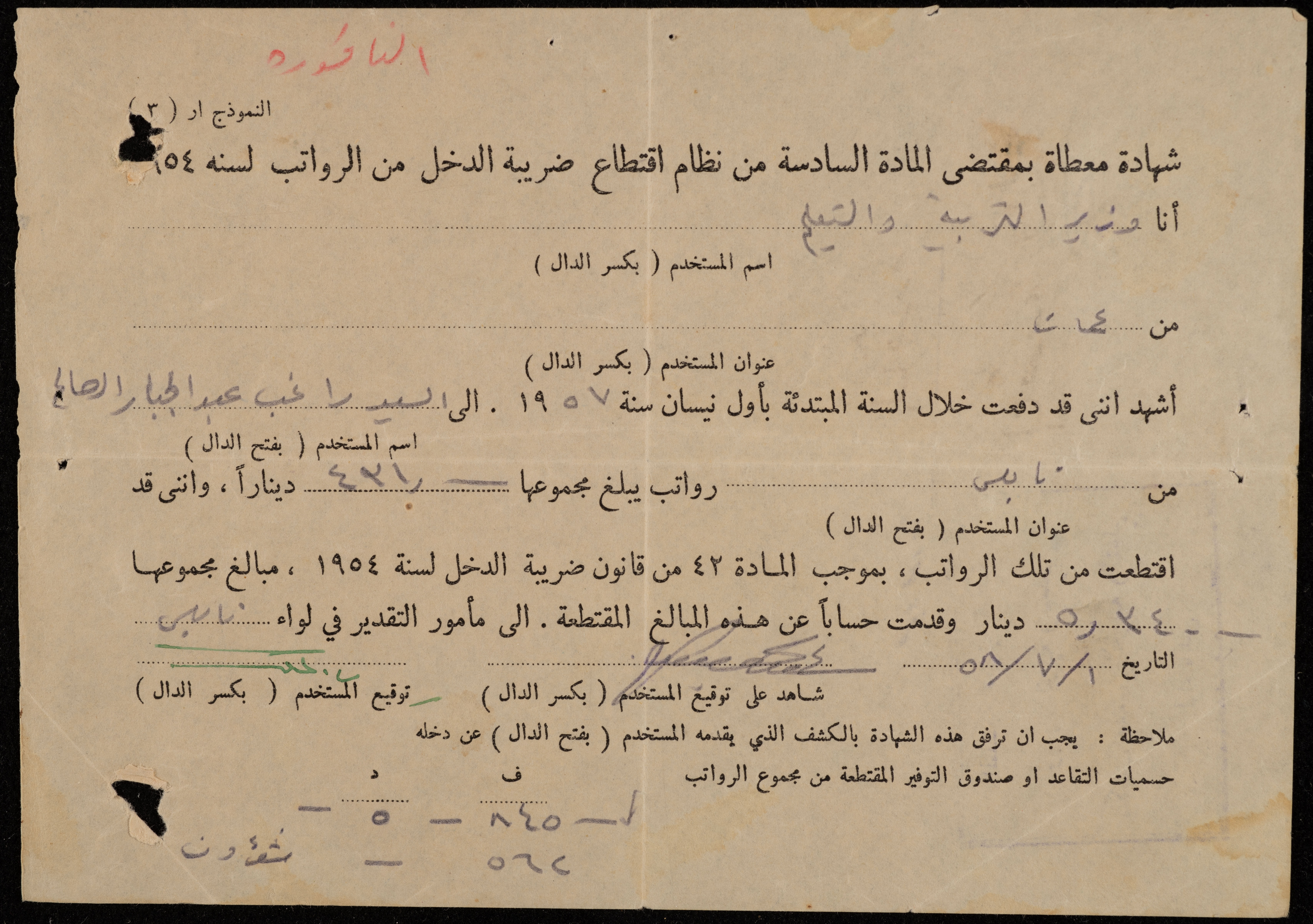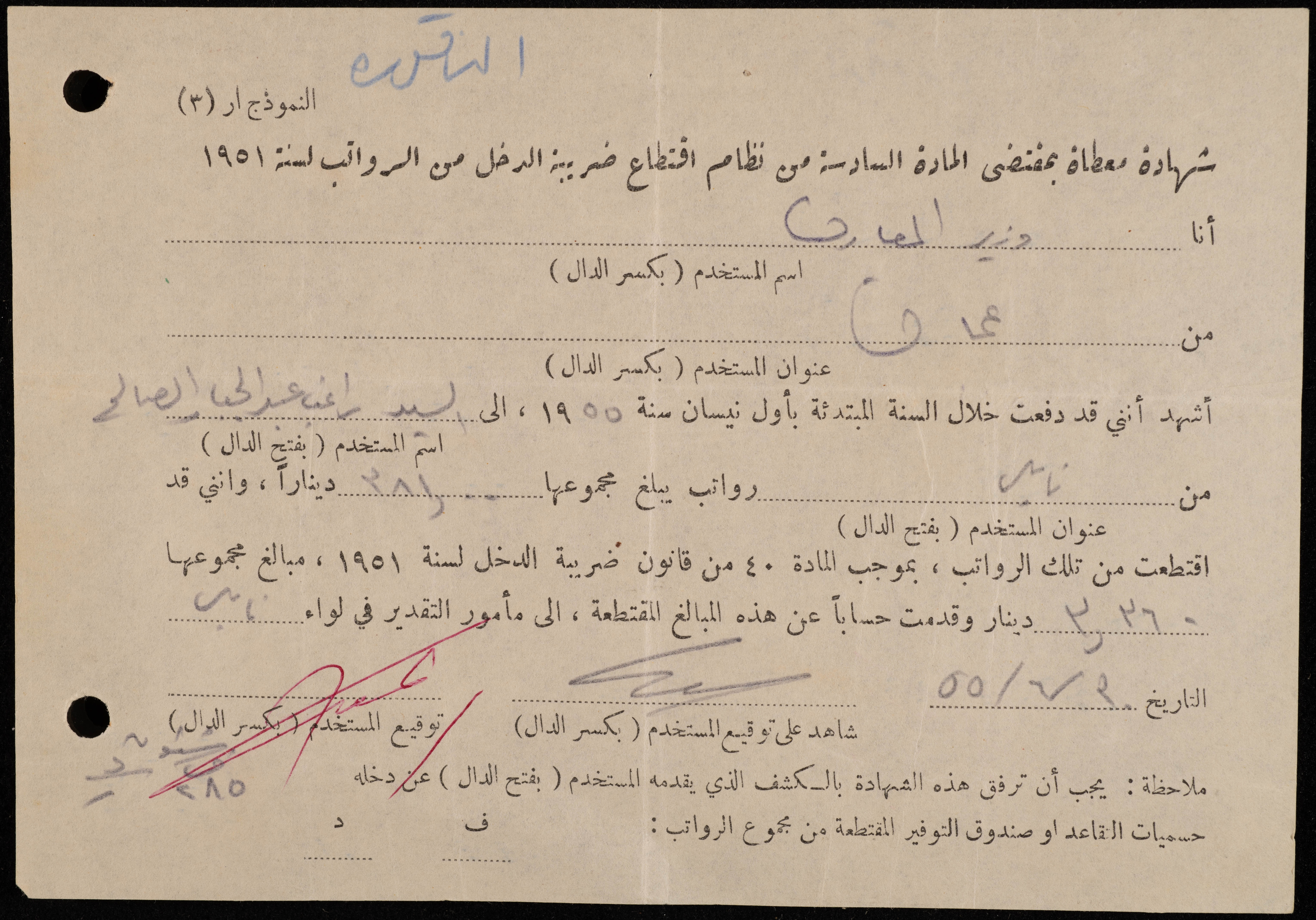 Tax Deduction Certificate, the Jordanian Ministry of Education, 30 June 1955
