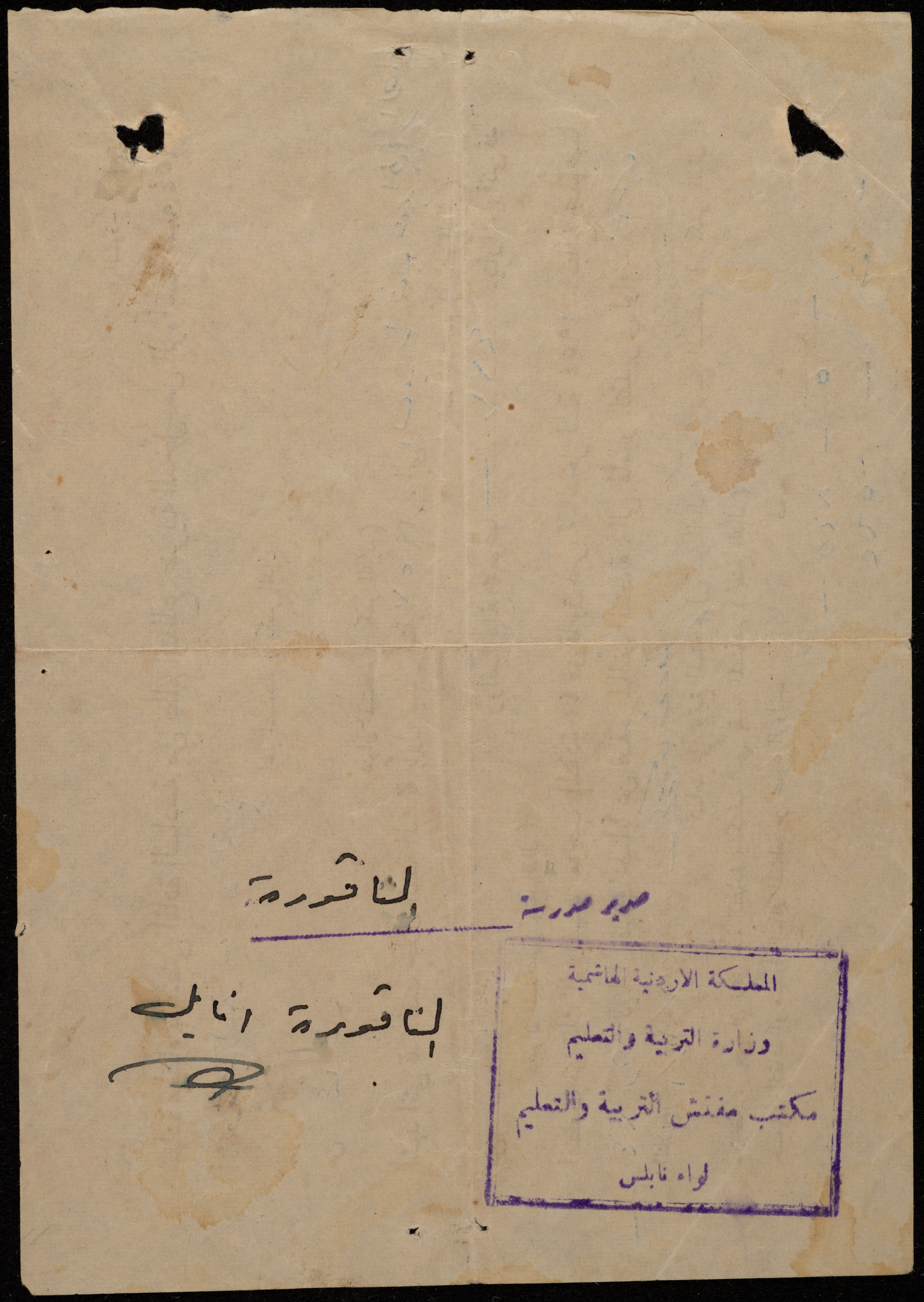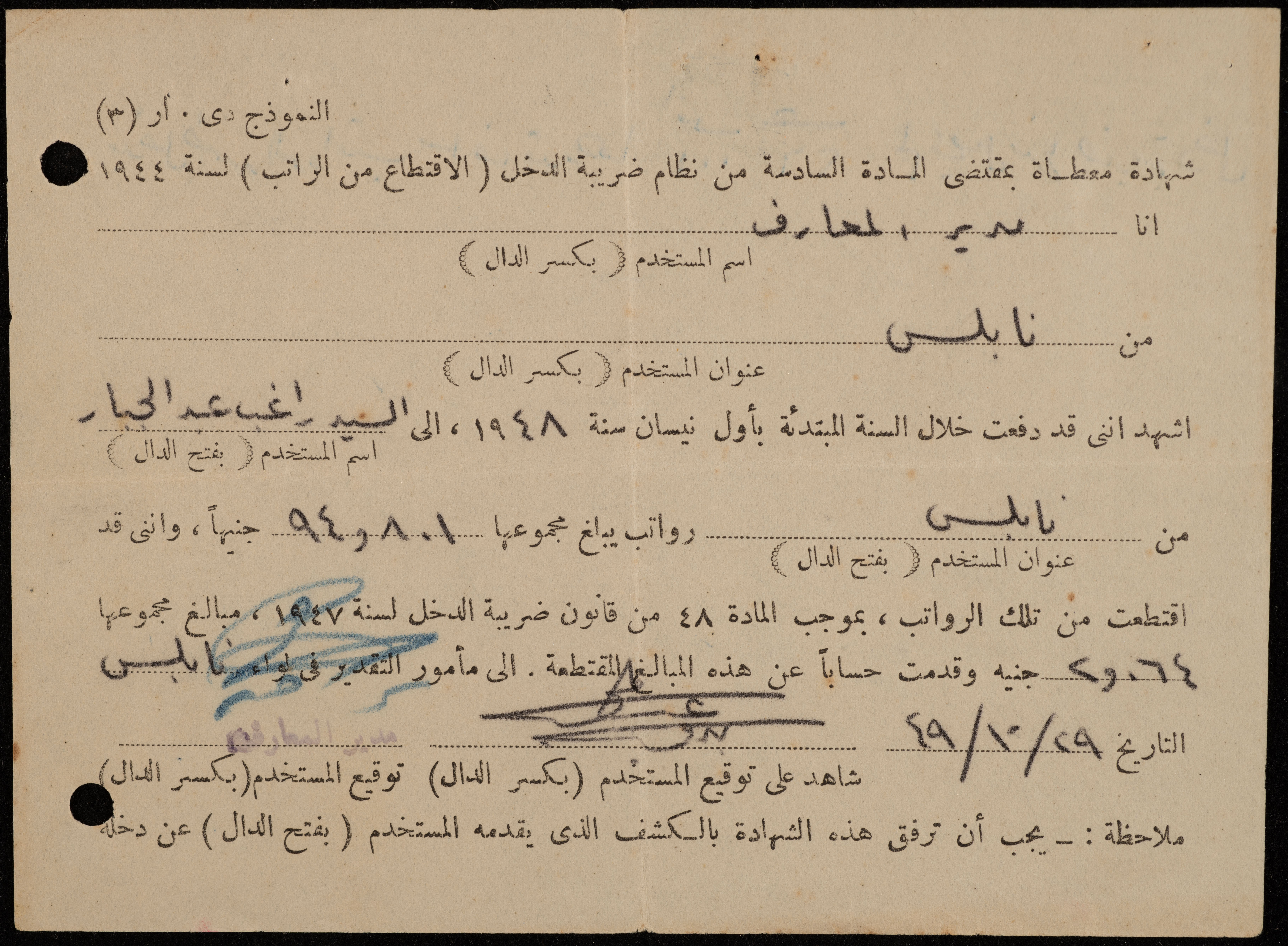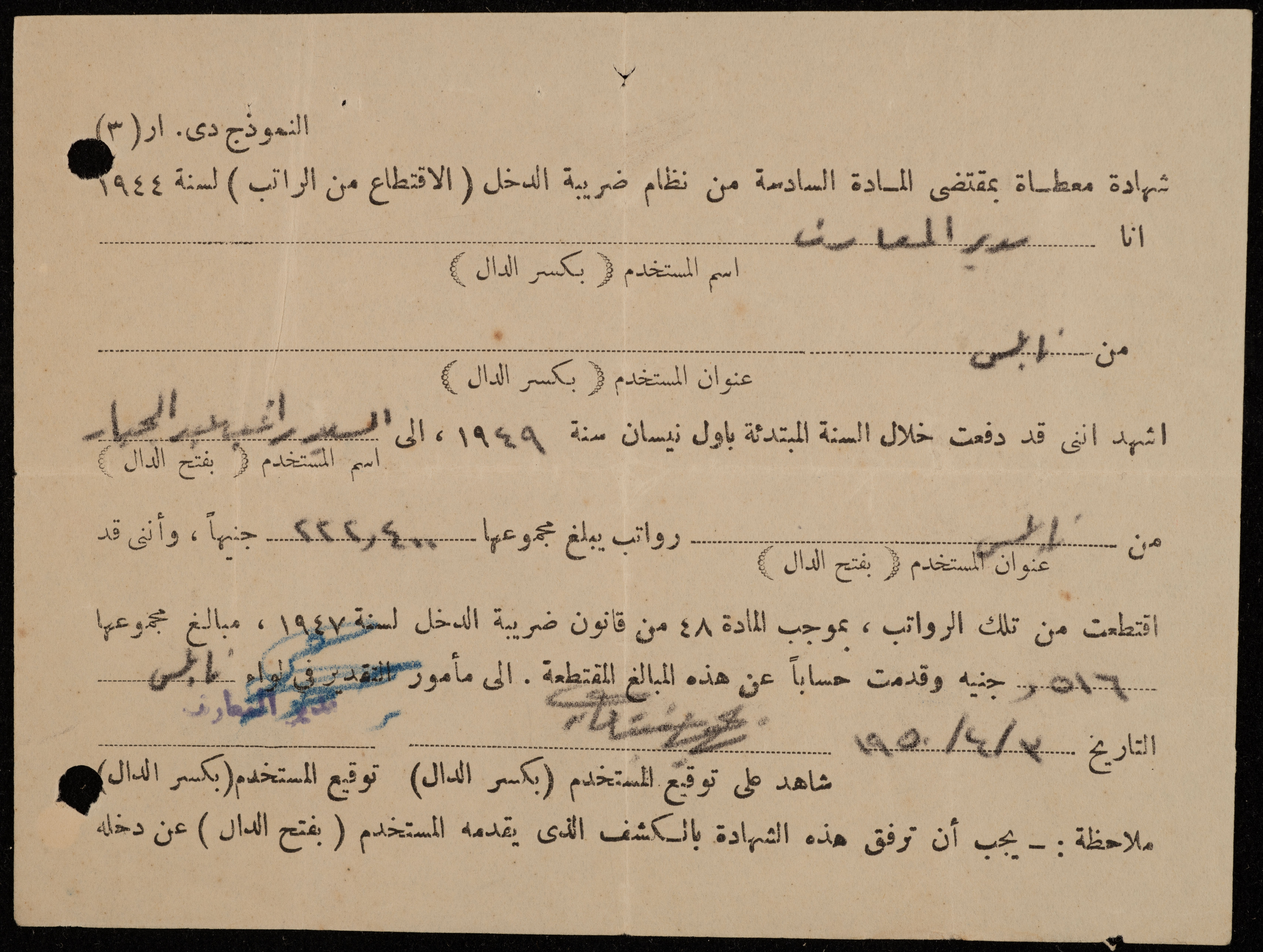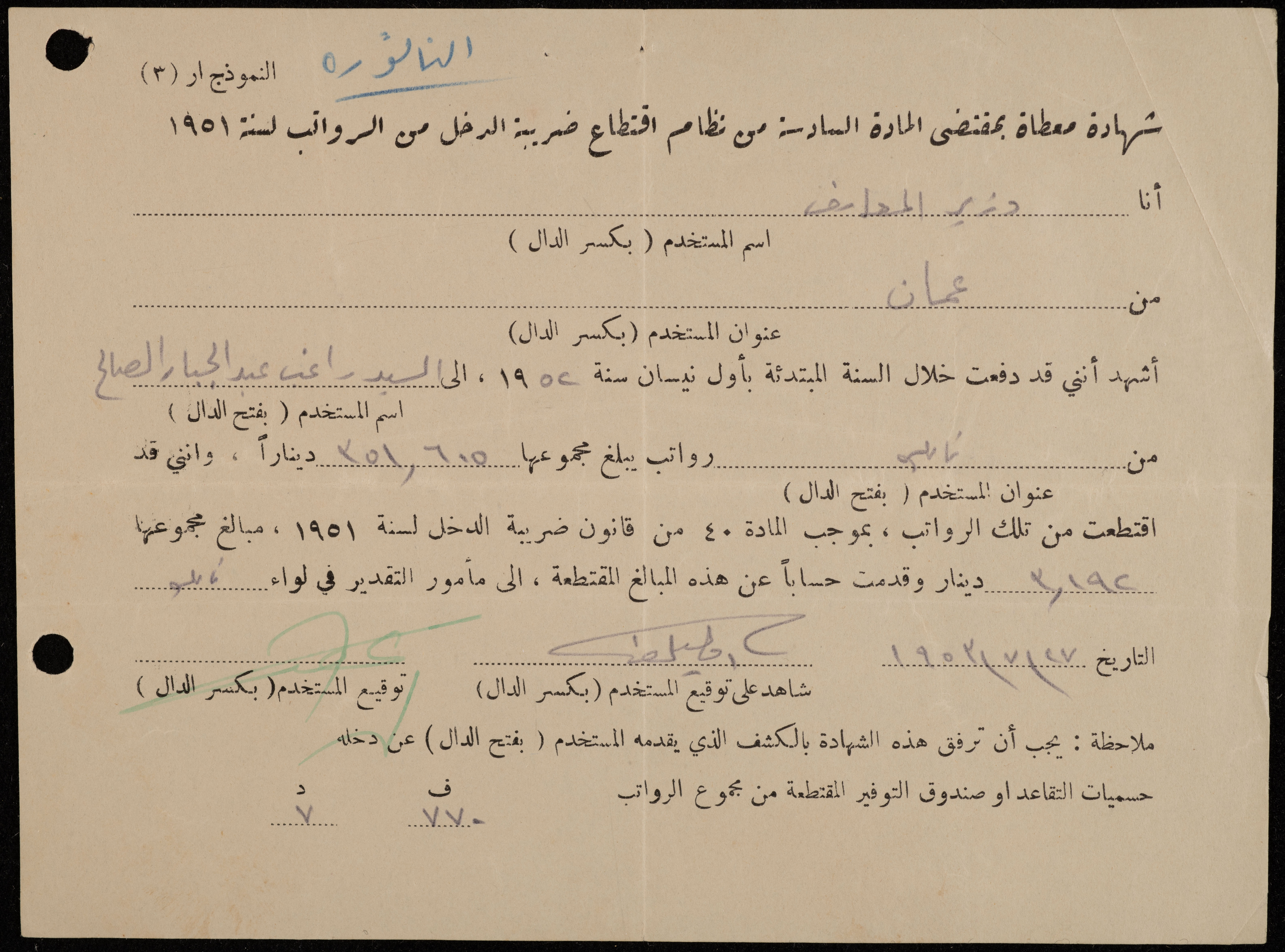 Tax Deduction Certificate, the Jordanian Ministry of Education, 30 June 1955
